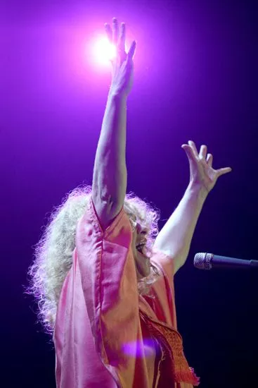 Fredag aften på Arena. Scenen lægger denne aften klokken 23.30 rammer til Goldfrapp, hvis bedårende frontfigur træder ind på scenen iført ikke meget mere end et stykke orange silke-lignende stof, der vitterligt ser ud som om, det lemfældigt er blevet hængt på hendes krop i en fart.