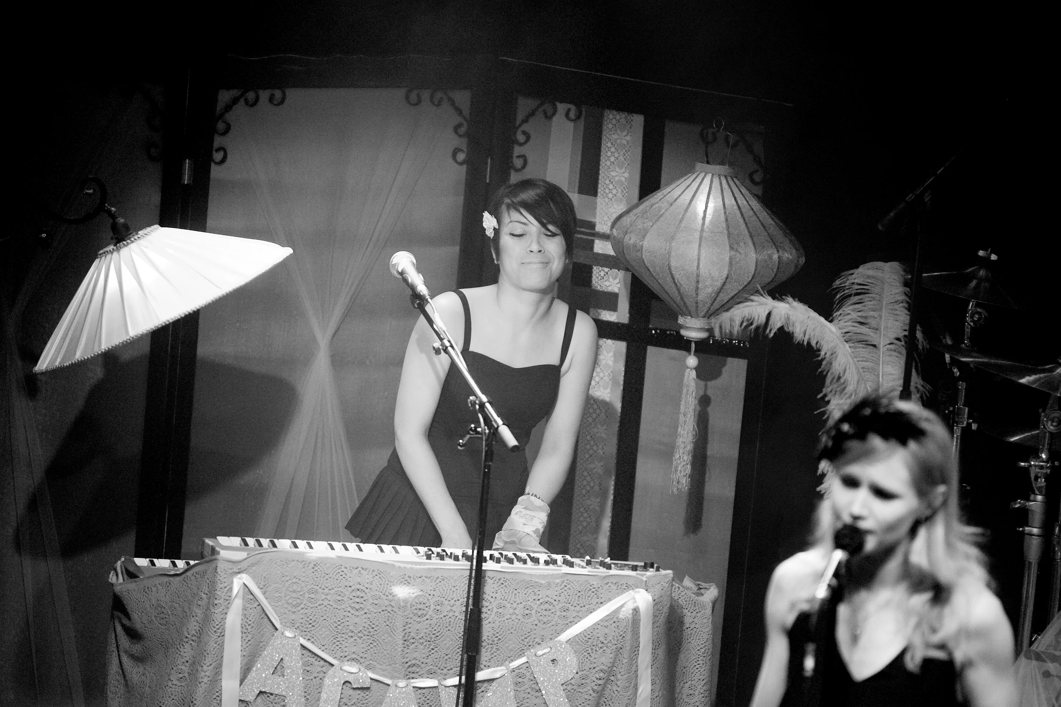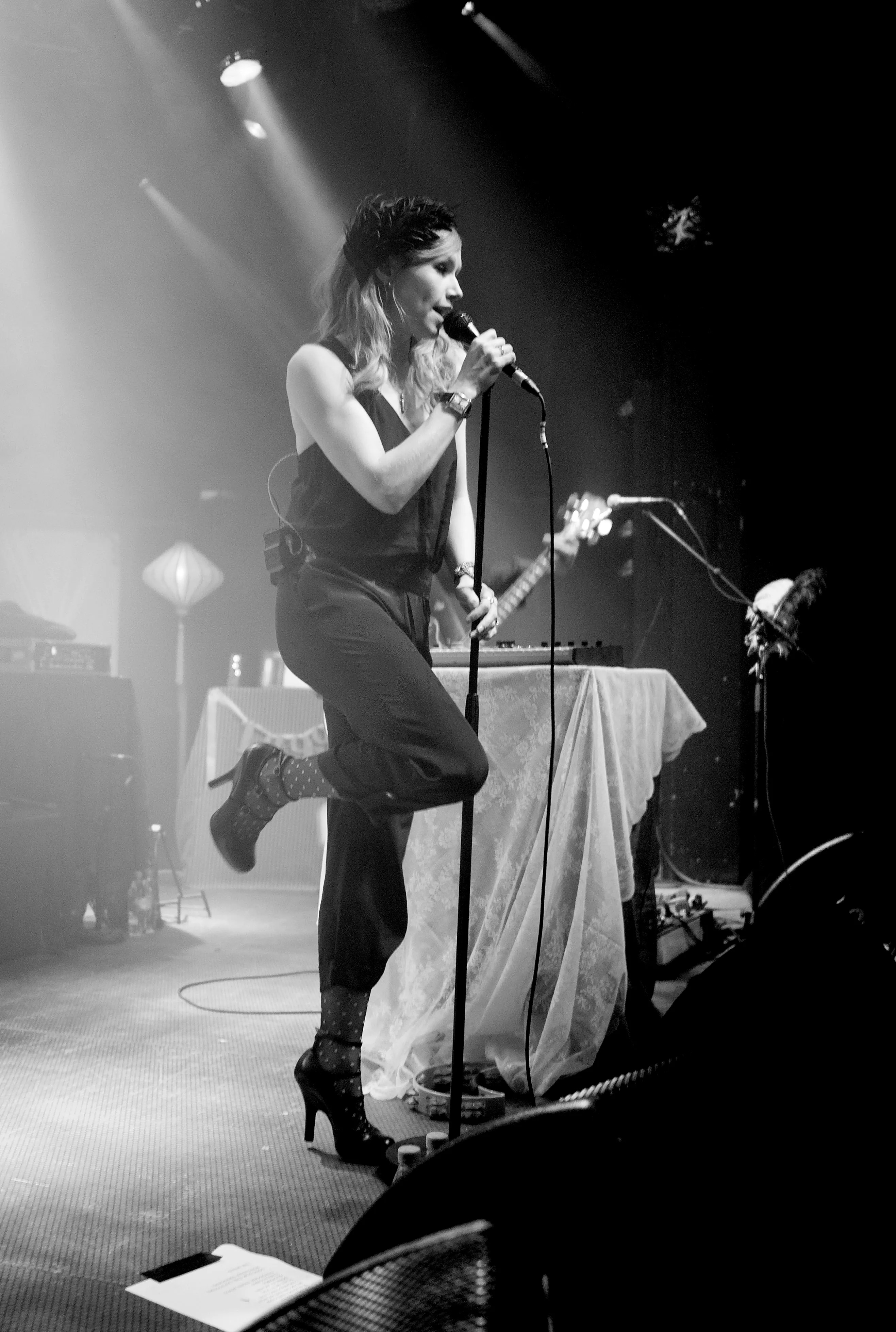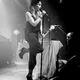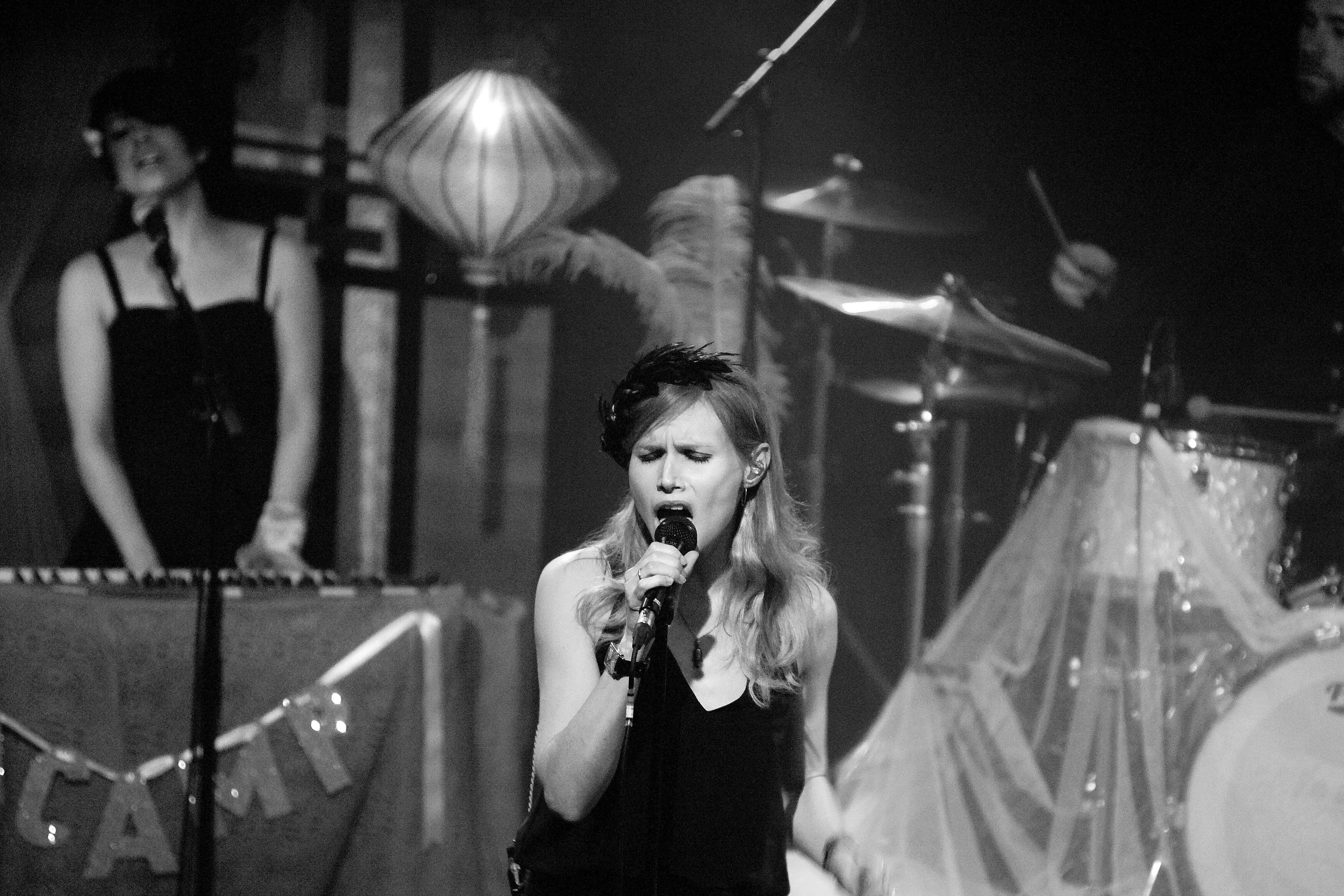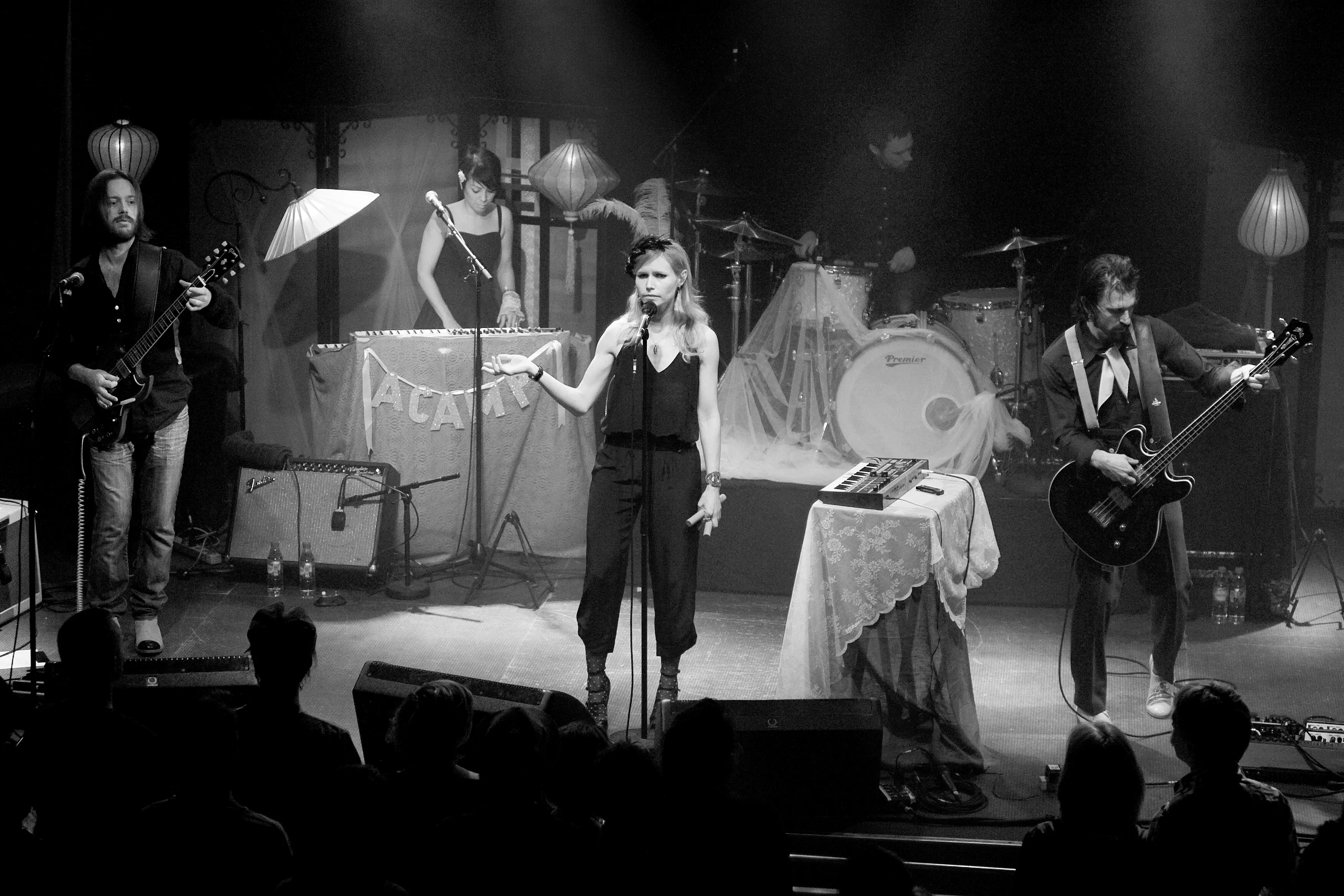Med svingende arme og knyttede næver åbnede sangerinde Nina Persson koncerten med A Camp på Train. Den spinkle, sortklædte skikkelse med det svenskerblonde hår og de charmerende, dybe smilehuller virkede helt hjemme i den hyggelige opsætning med farvede bord- og guldlamper, men trods det indledende