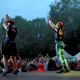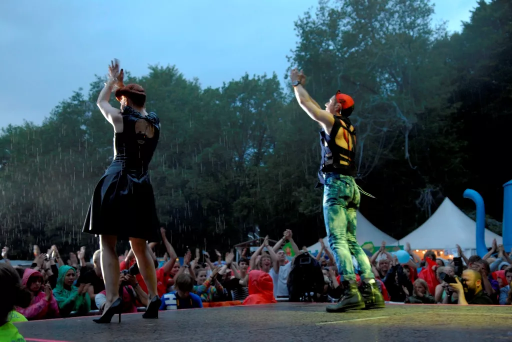 Vandet stod i store pytter på scenen, og forsanger Jake Shears var flere gange ved at falde midt i sin vilde dans. Men skoene blev smidt, og regnen og vandet blev en integreret del af showet.