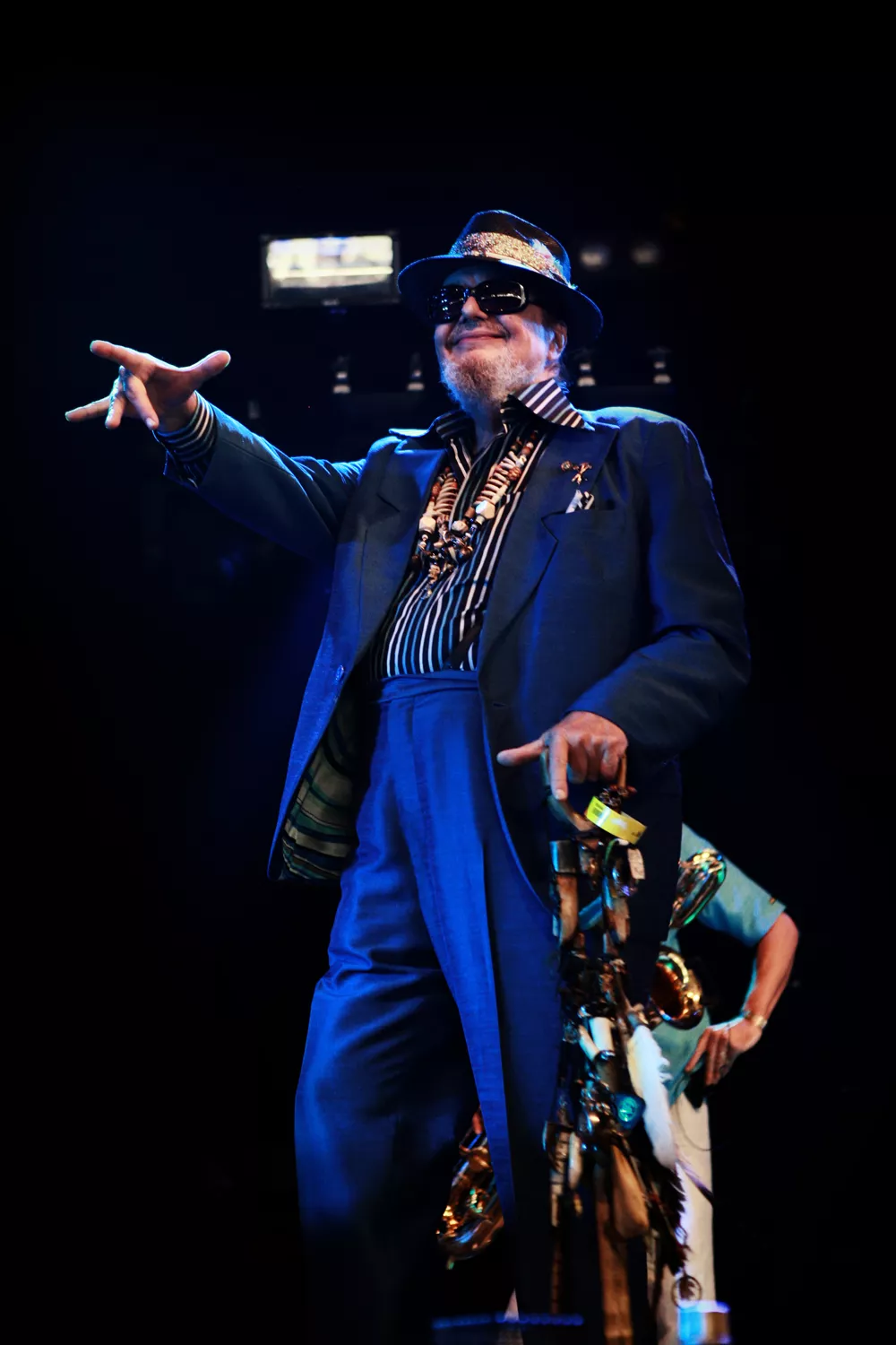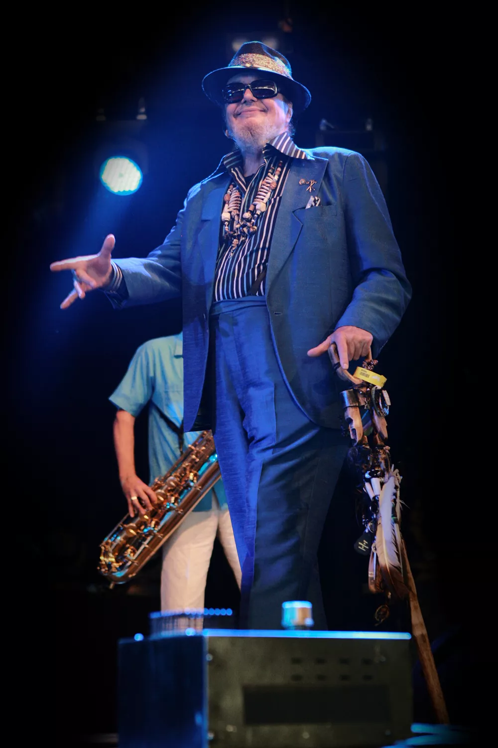 Han ser egentlig ikke ud af meget deroppe på scenen, Dr. John. Jo, udklædningen: Lyseblåt jakkesæt, hat med glinsende bånd, solbriller, forskelligt farvede hårelastikker på den lange grå hestehale, solbriller - og så kranier på både flygel og Farfisaorgel for lige som at voodooficere stemningen lidt