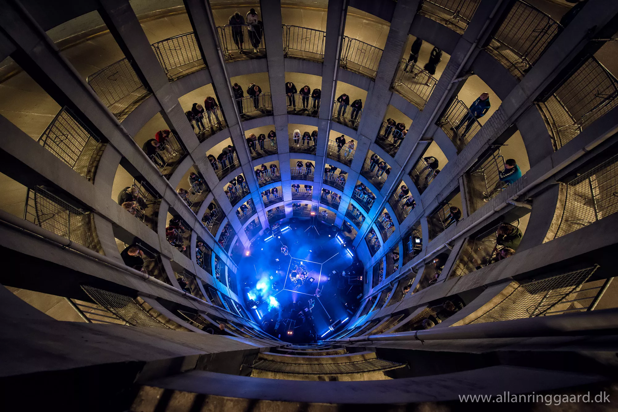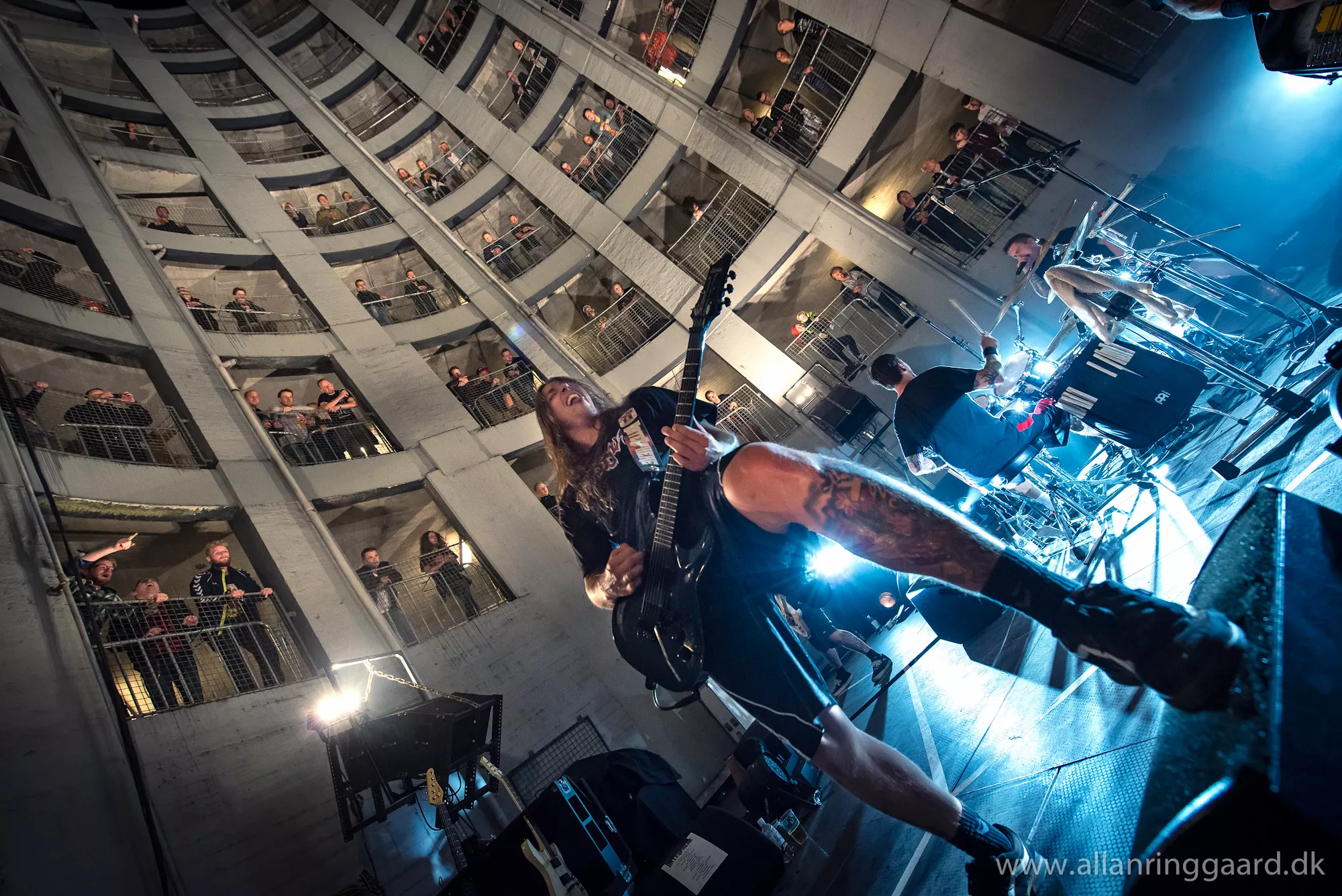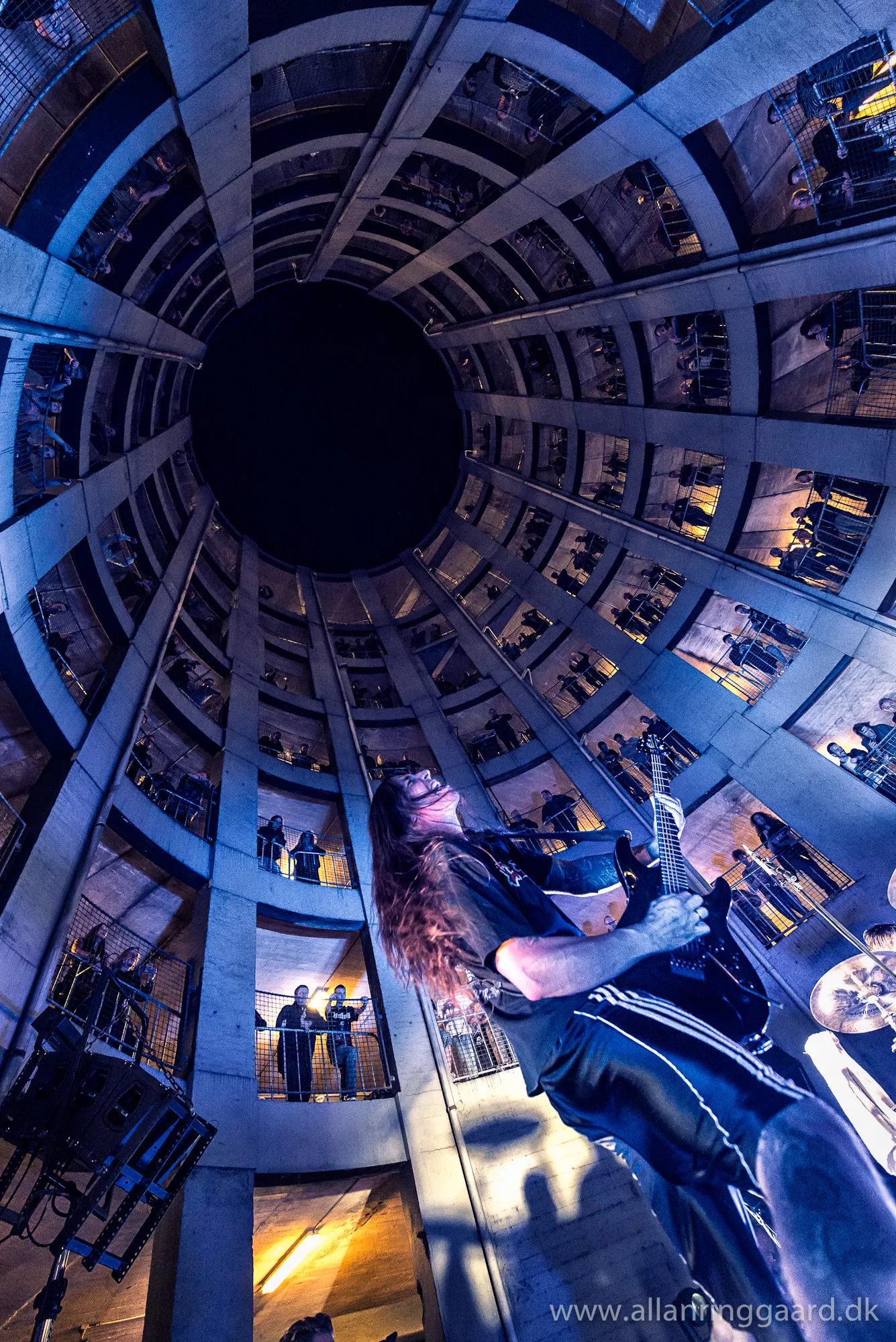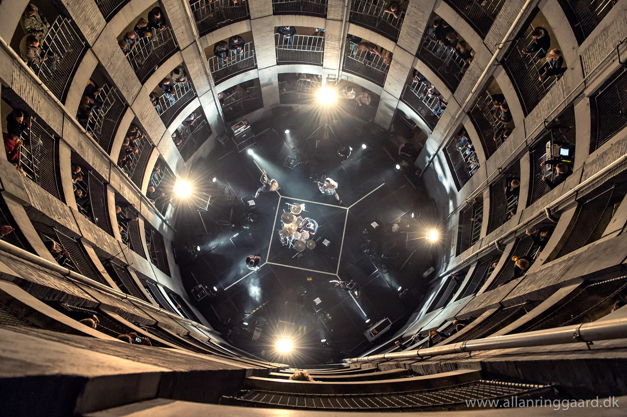 Publikum havde udsigt ned over Hatesphere, da de i aftes gav koncert i bunden af en syv-etagers betonrotunde i Sallings p-hus