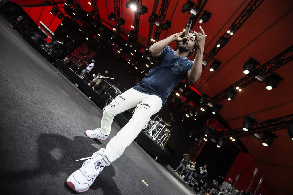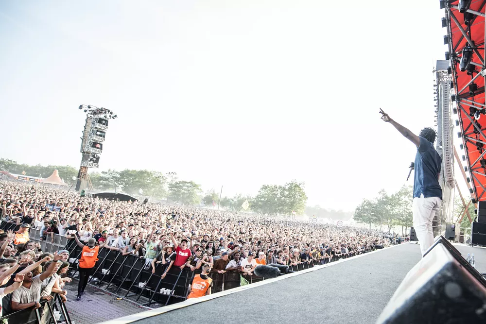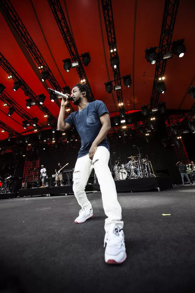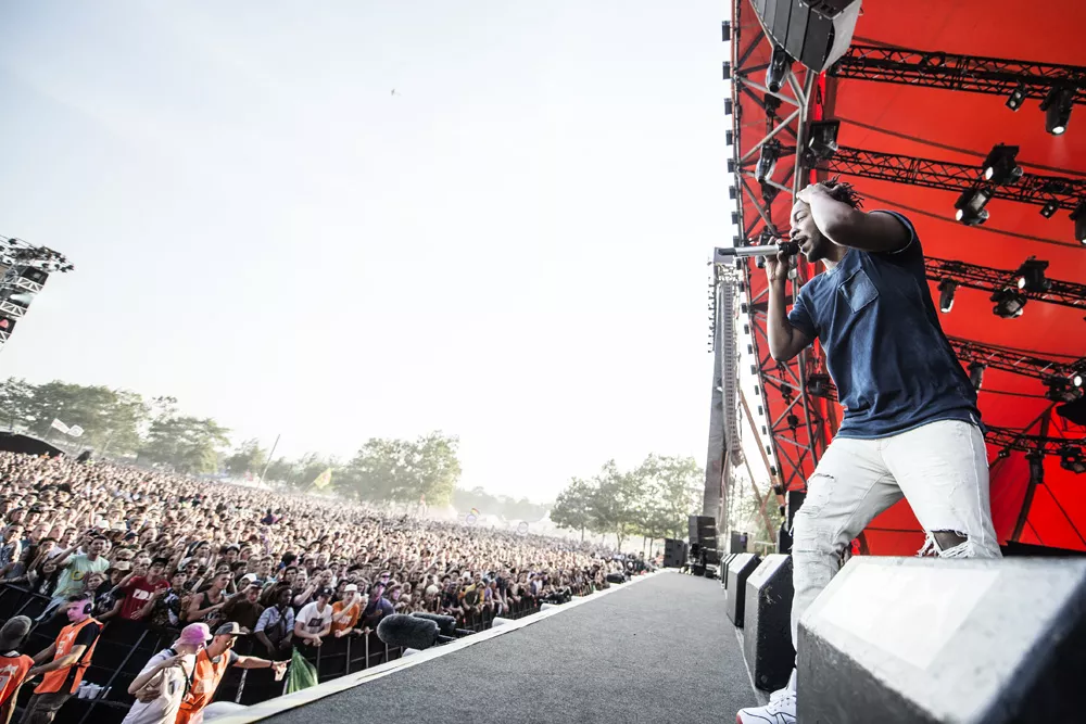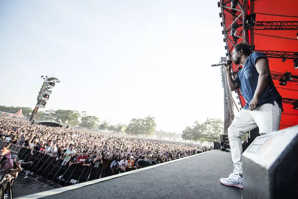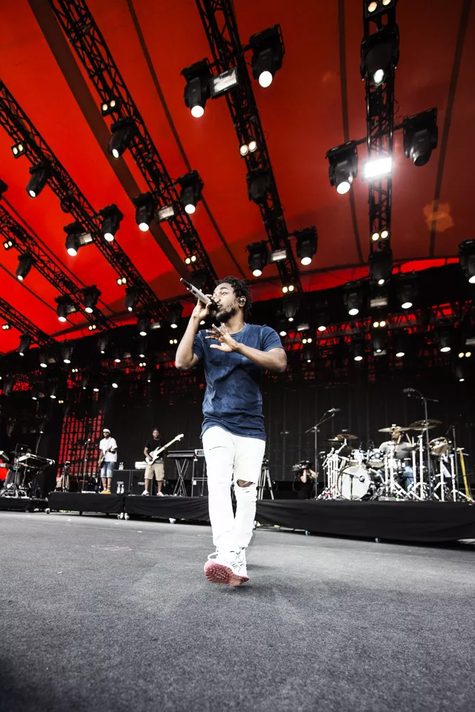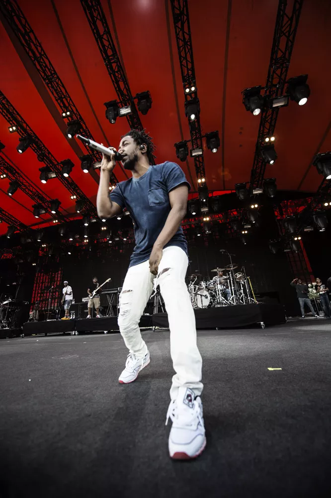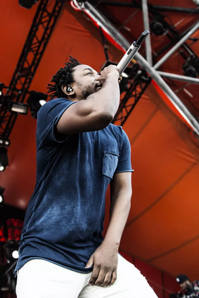 Konferencier Per Vers introducerede ikke ufortjent "den bedste rapper lige nu" 20 minutter, før Kendrick Lamar indtog Orange Scene, hvor et massivt og forventningsfuldt publikum med den efterhånden lavthængende sol og masser af støv i øjnene stod klar til at holde hiphopfest. Med "To Pimp A Butterfly"