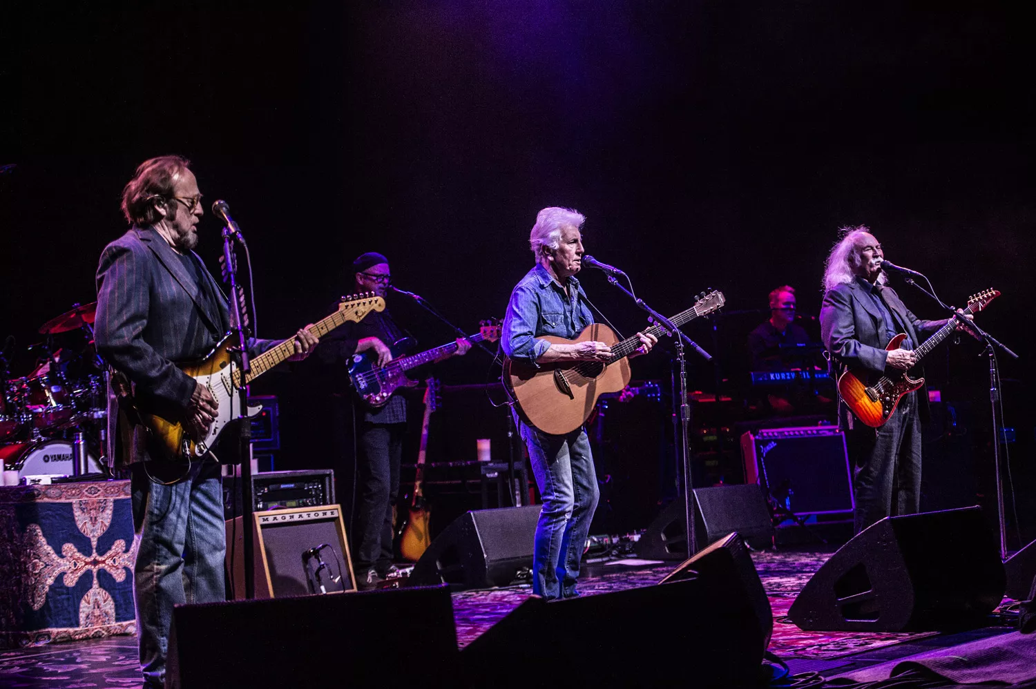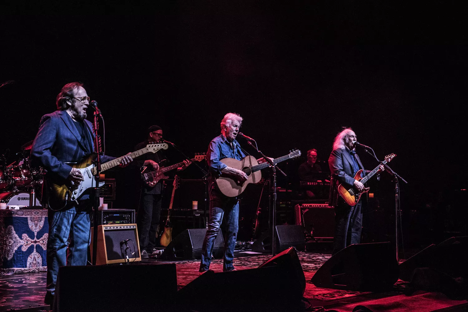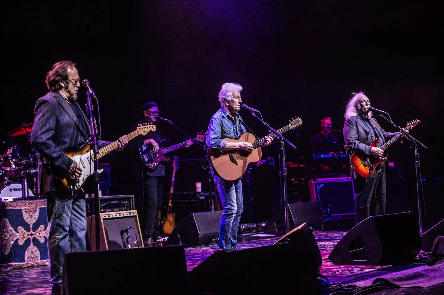 Der er lagt arabiske tæpper ud på scenegulvet, salen summer af forventning, og så kommer de ind. Tre gamle, musikalske makkere: Graham Nash i denimtøj og bare tæer, rocklegenden David Crosby i jakkesæt og Stephen Stills klar til at bekræfte, at han – som Nash siden proklamerer – stadig