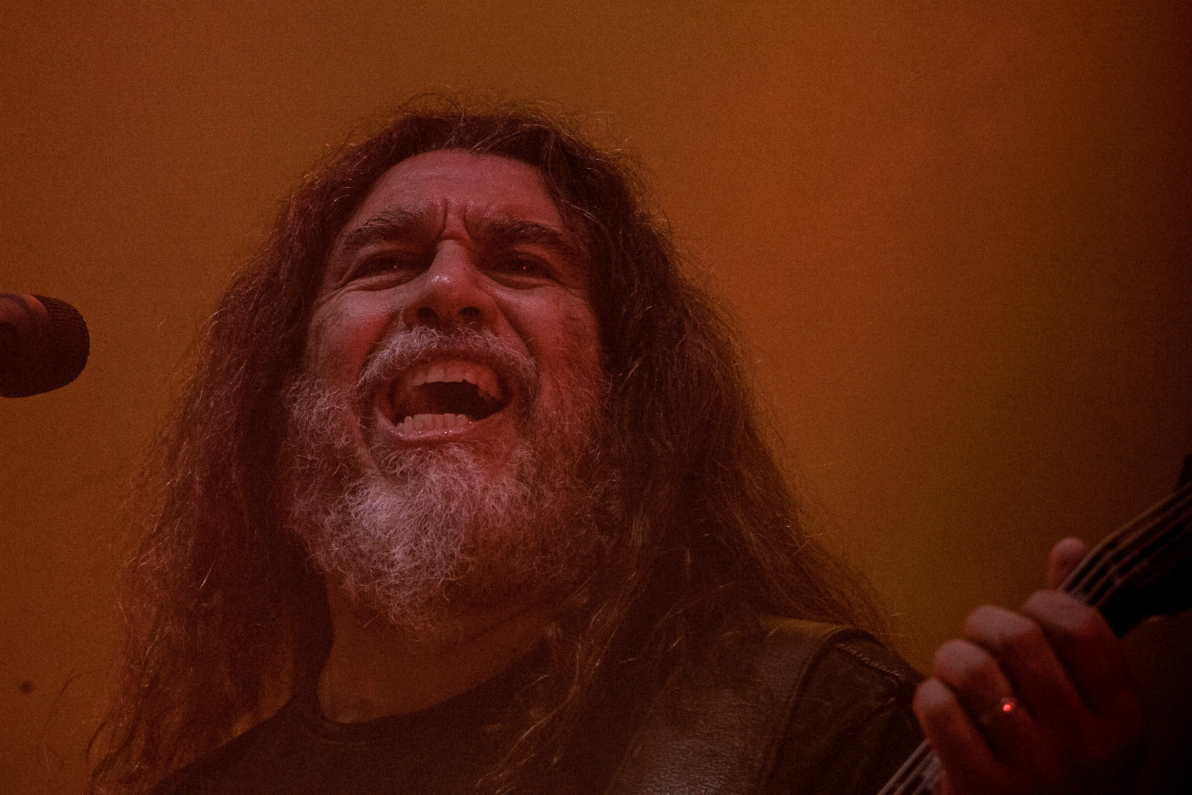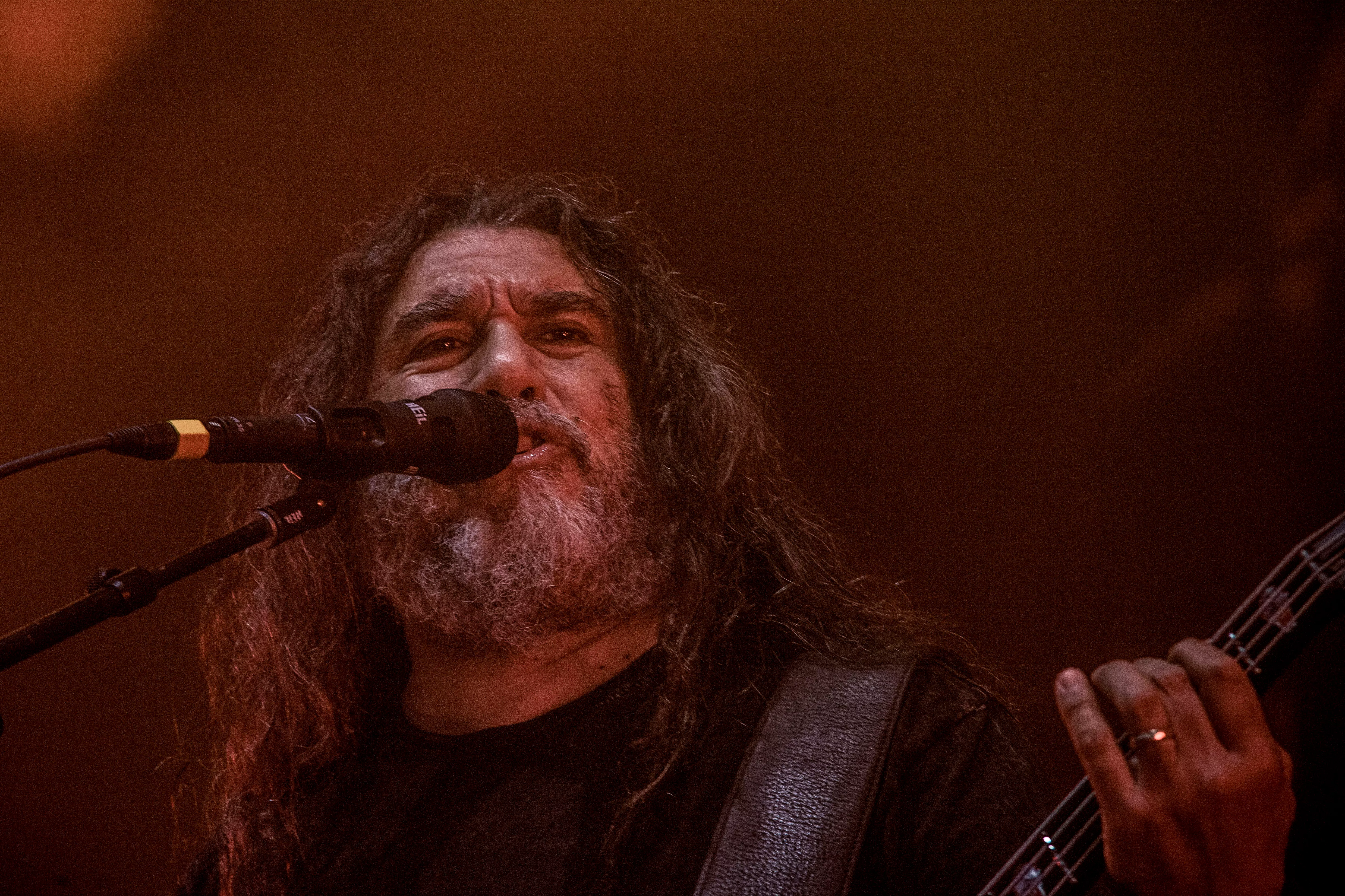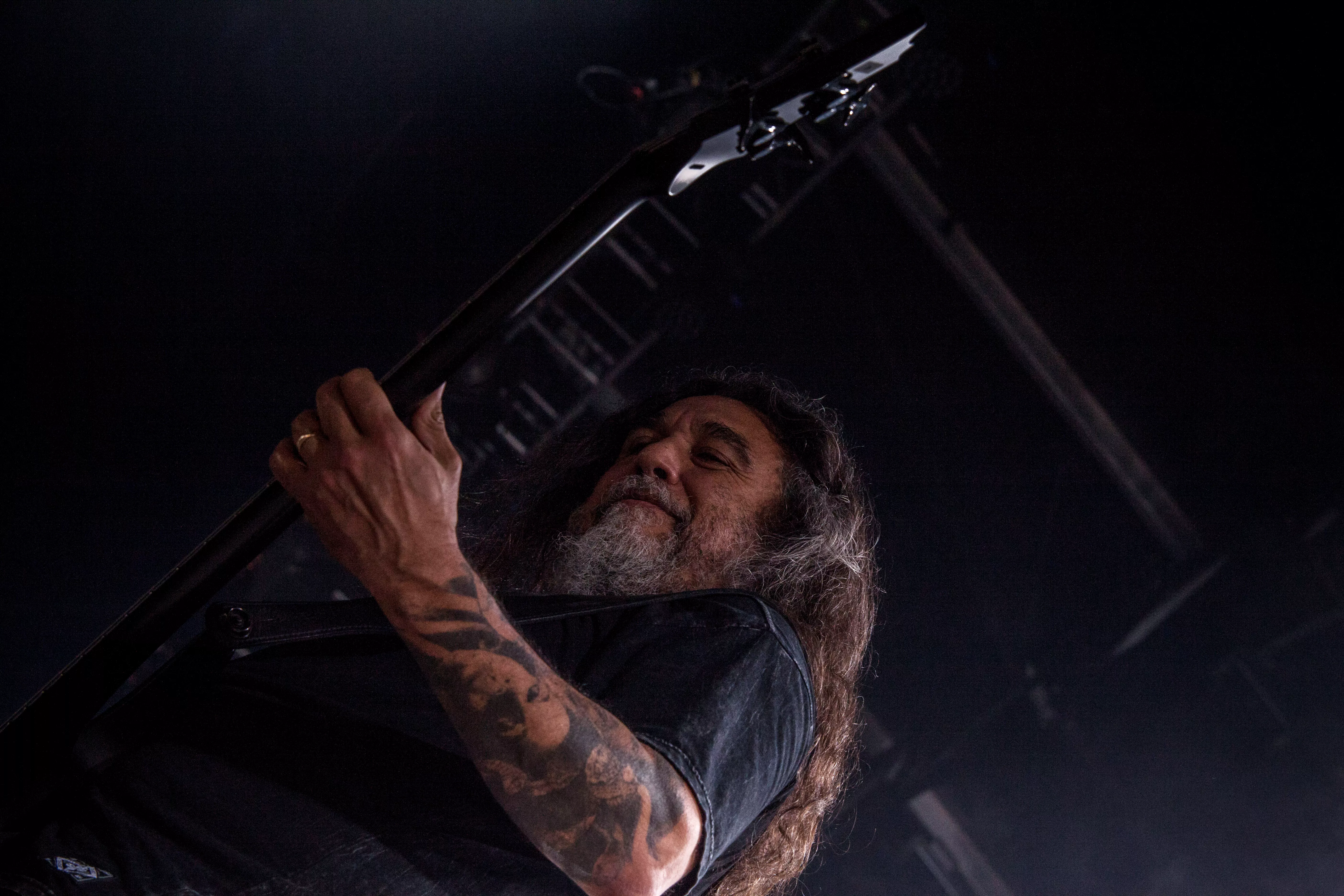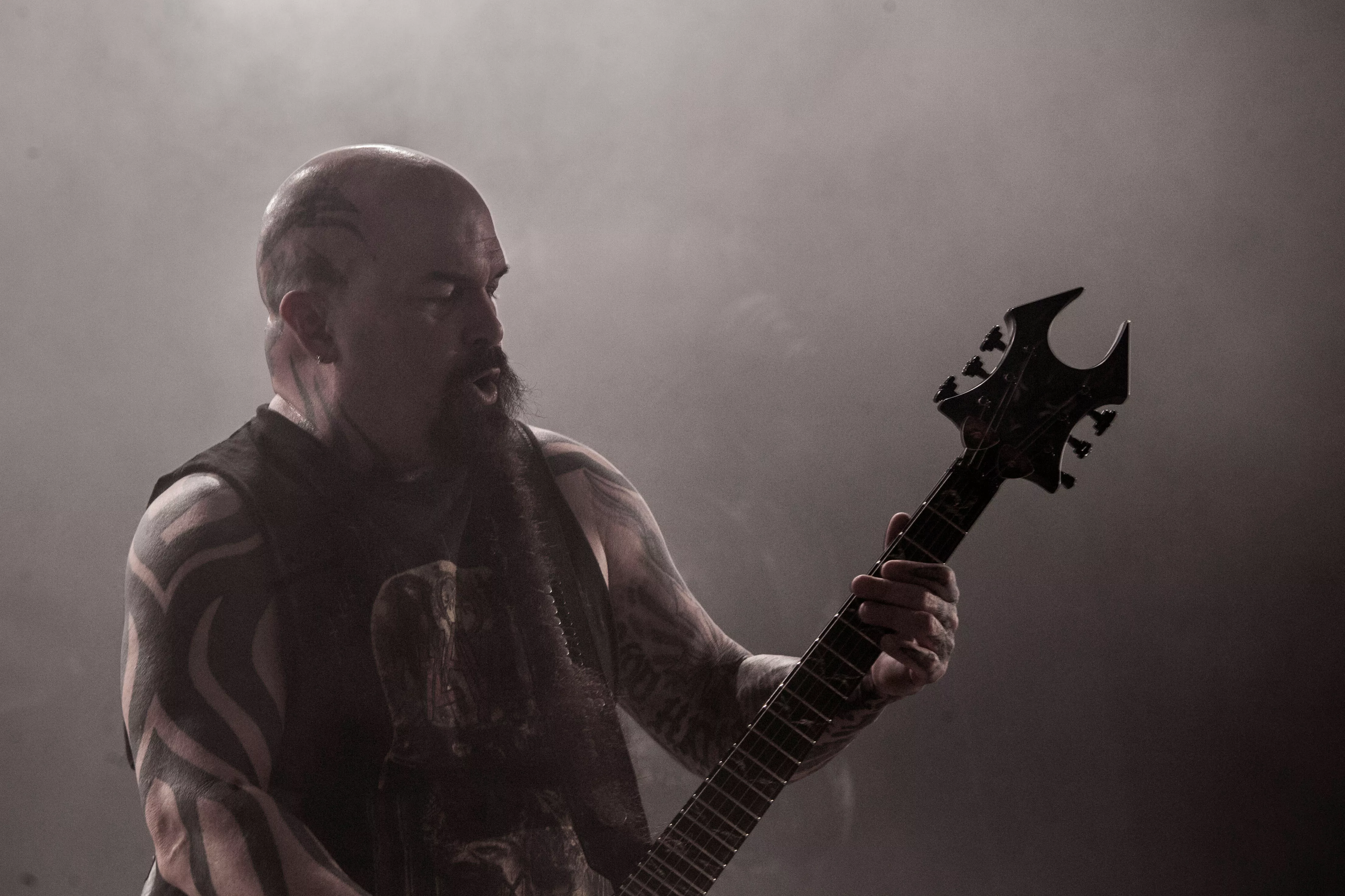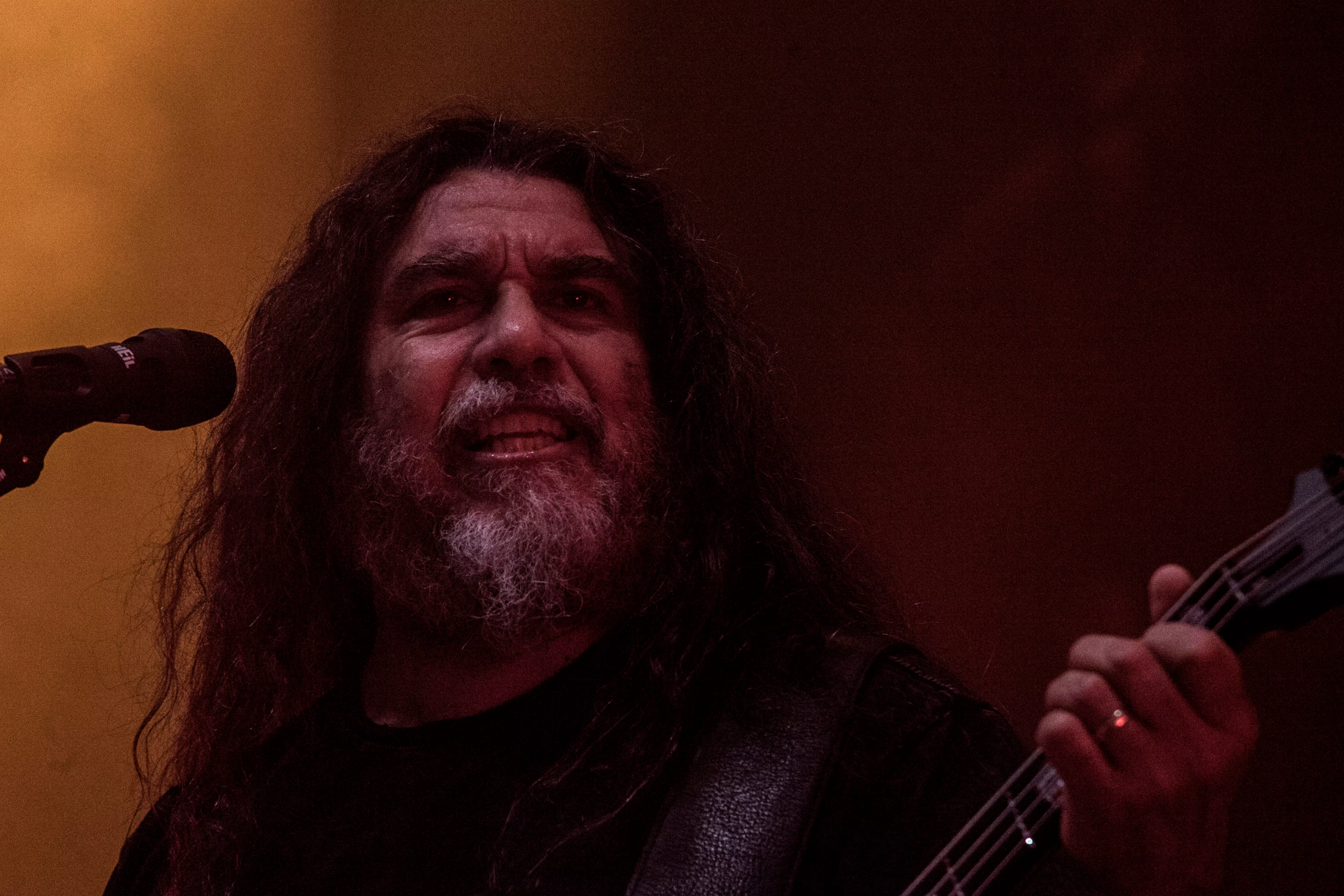 Og så lige pludselig – halvejs inde i sættet – fortæller en smilende, meget venlig forsanger/råber, Tom Araya, flankeret af sin tro væbner i årevis, guitaristen Kerry King, med et hav af tatoveringer og fra bæltet tunge kæder formentlig klunset