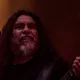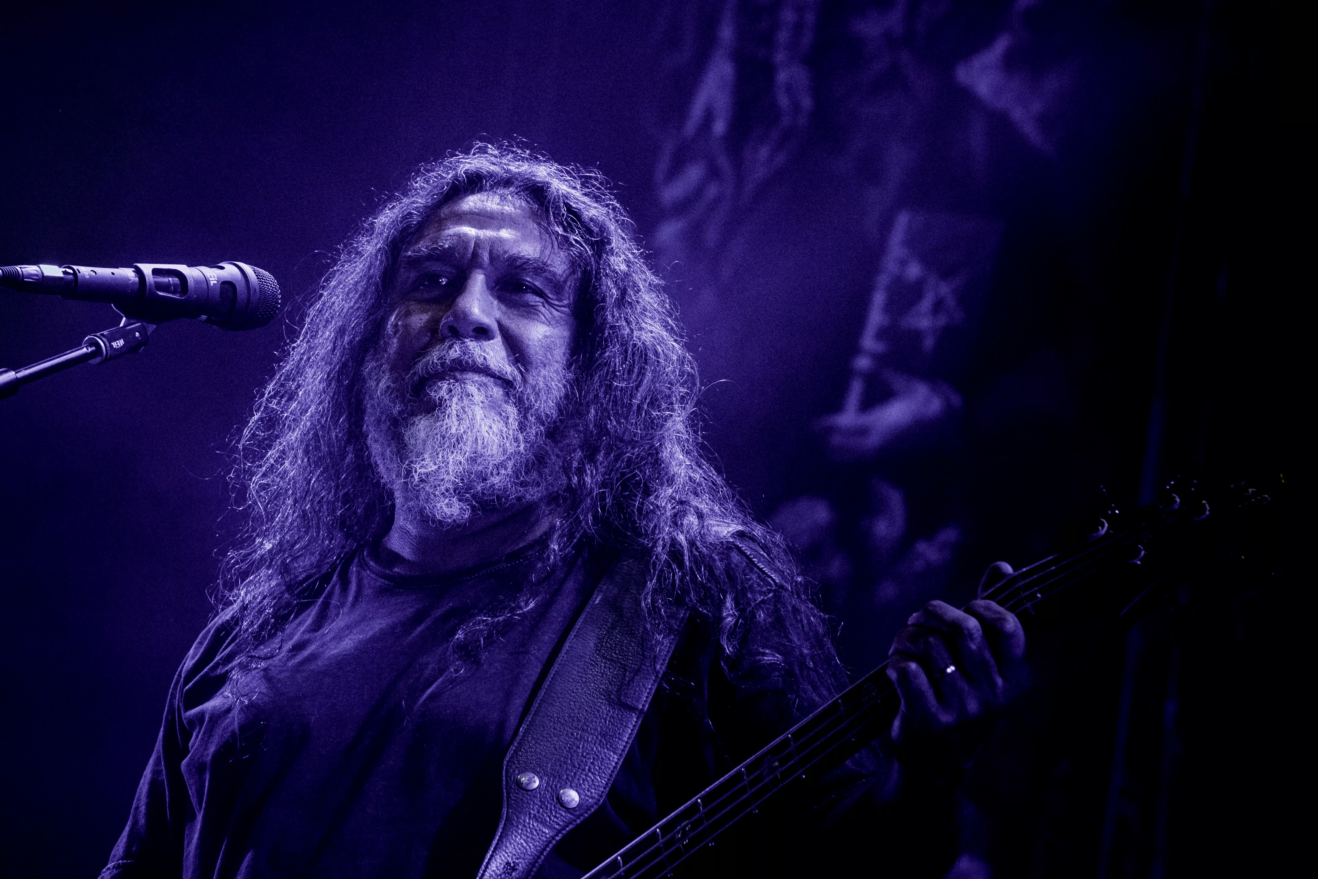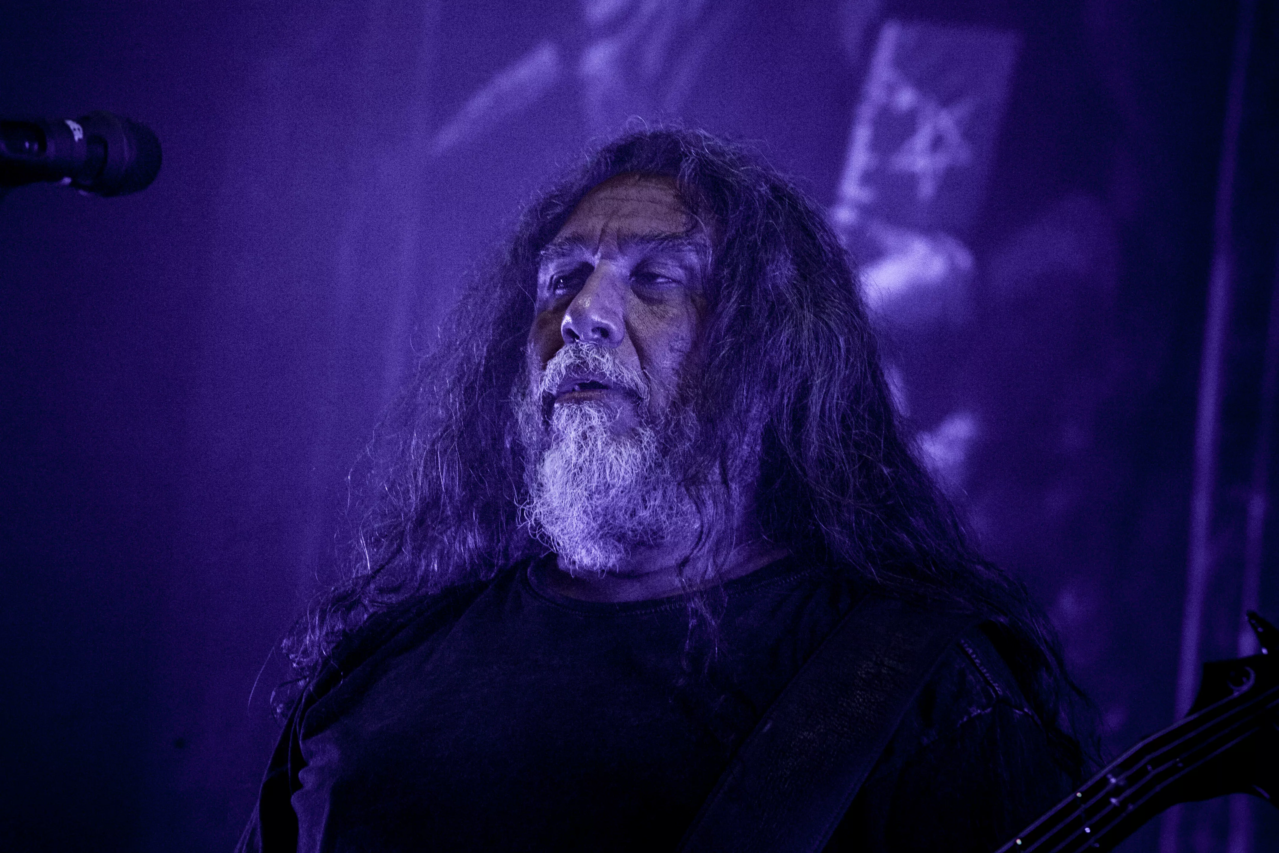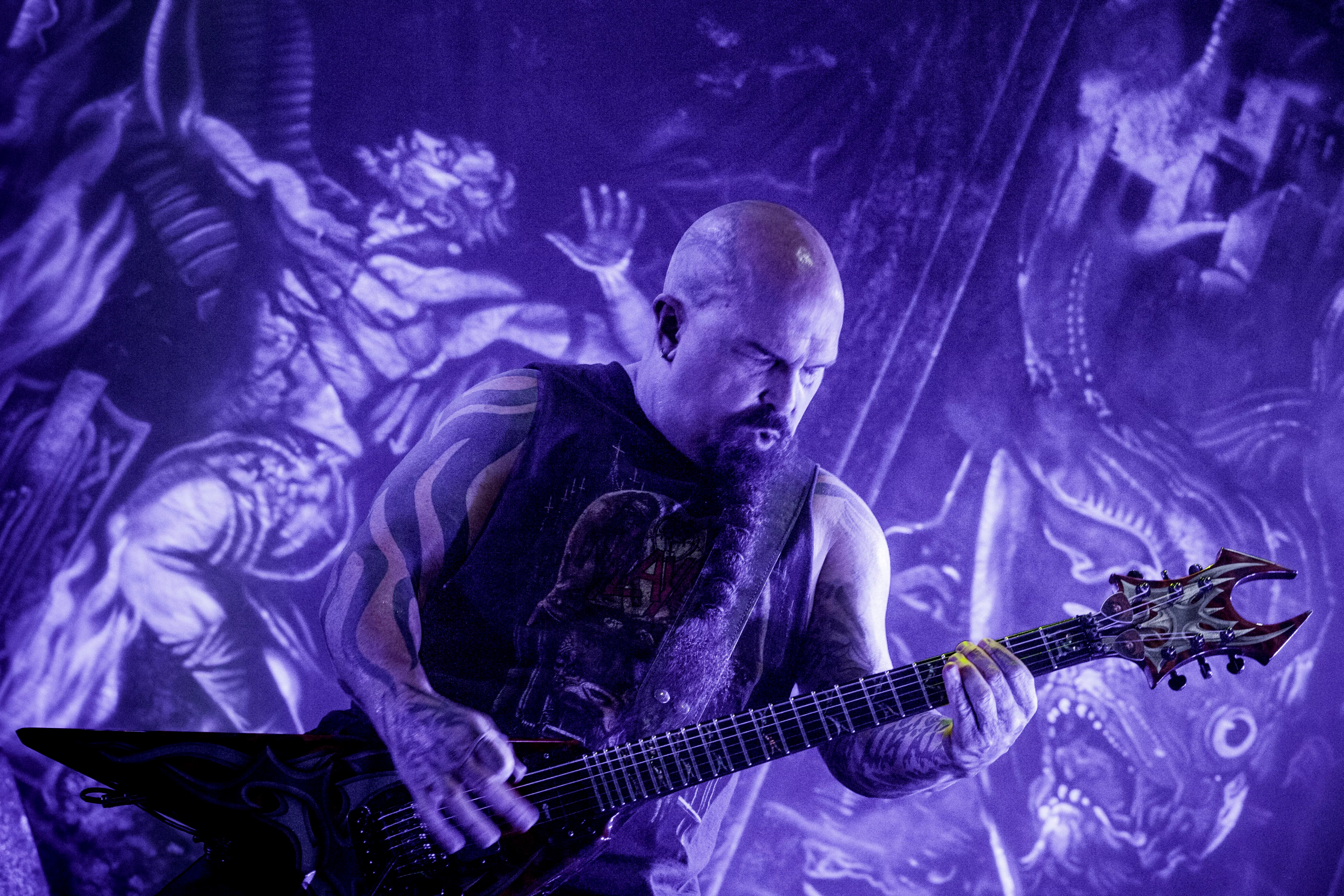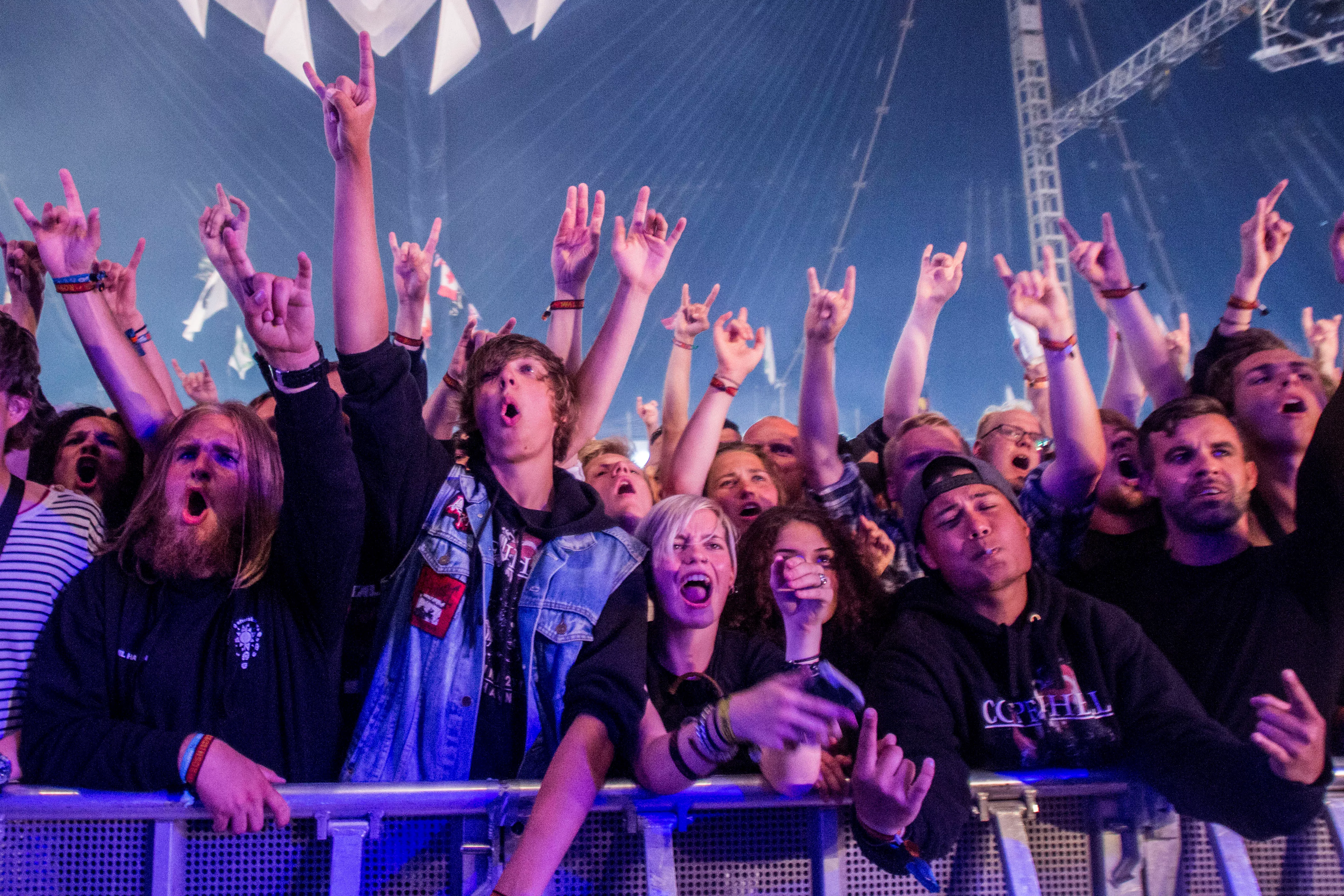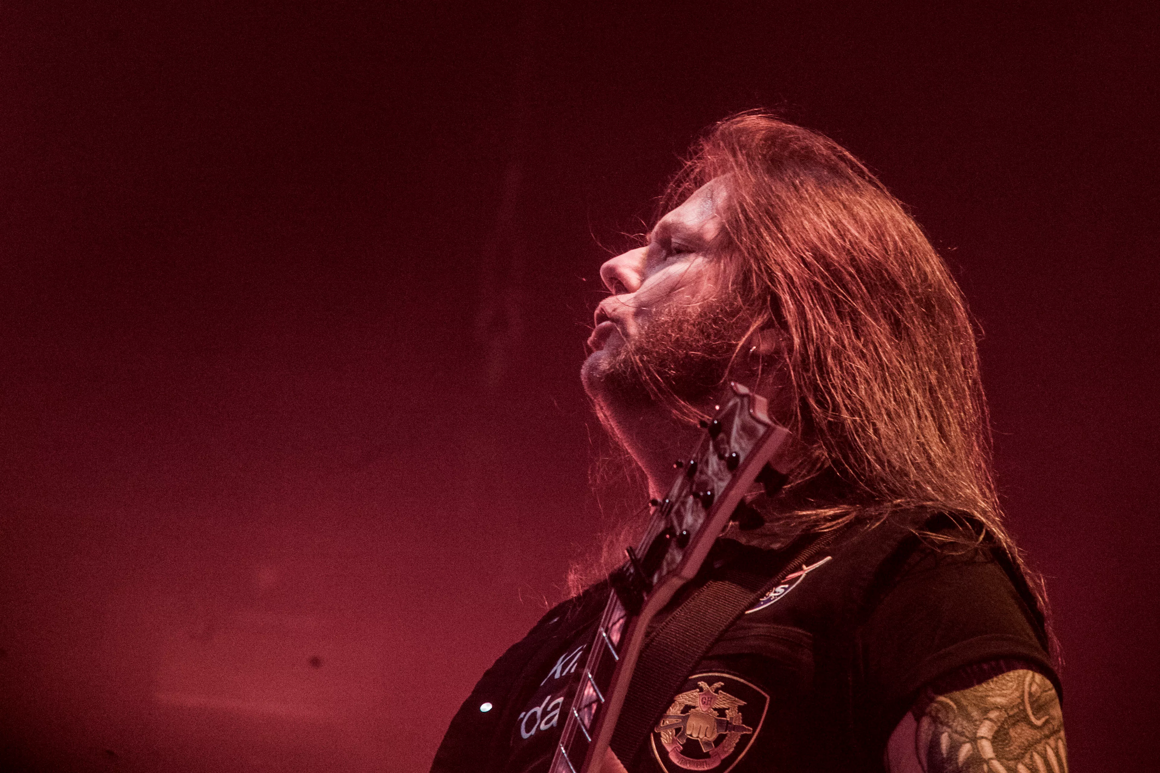 Og så lige pludselig – halvejs inde i sættet – fortæller en smilende, meget venlig forsanger/råber, Tom Araya, flankeret af sin tro væbner i årevis, guitaristen Kerry King, med et hav af tatoveringer og fra bæltet tunge kæder formentlig klunset