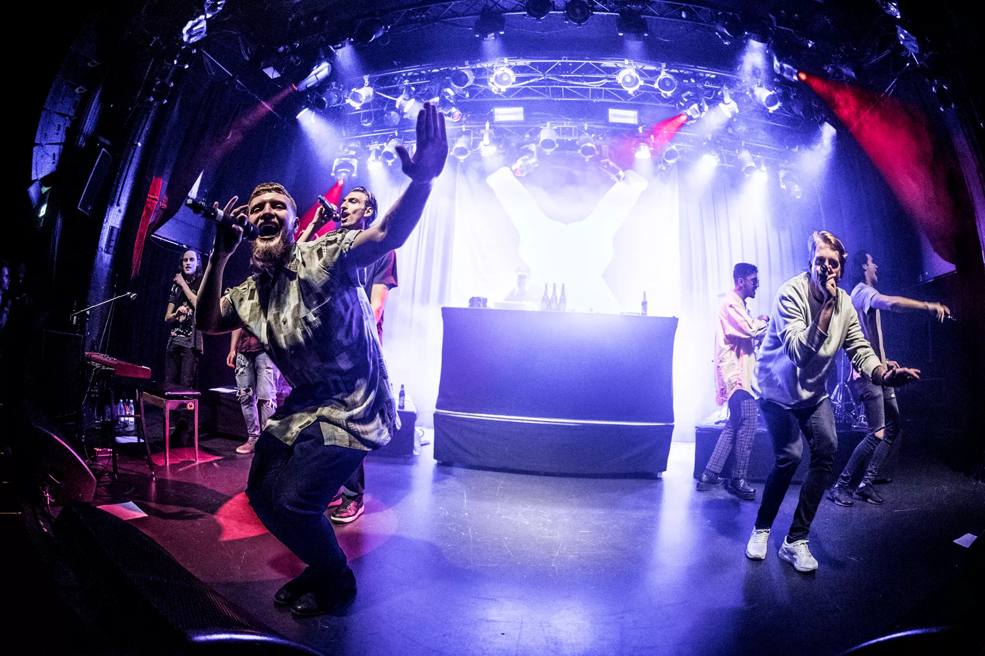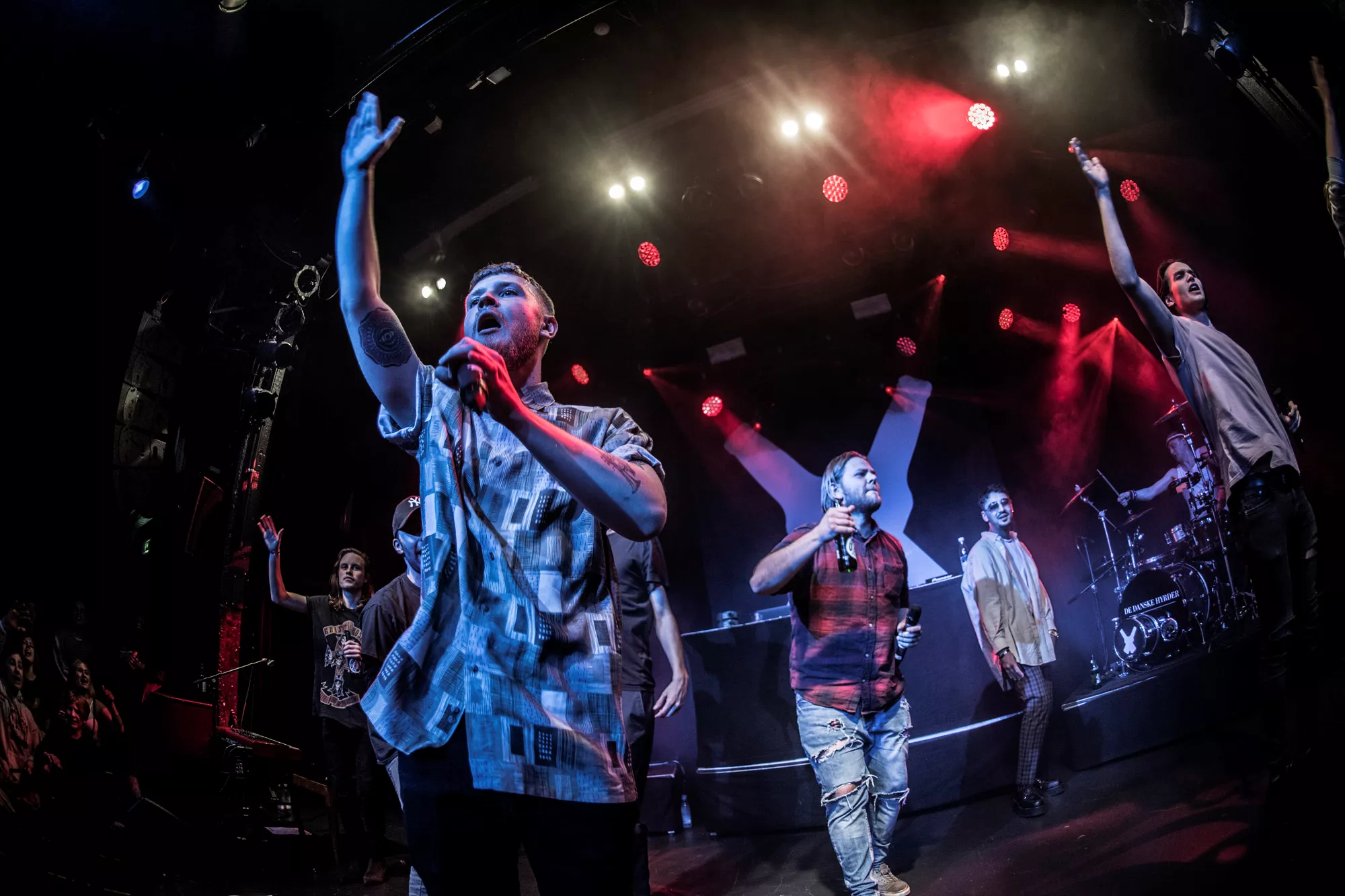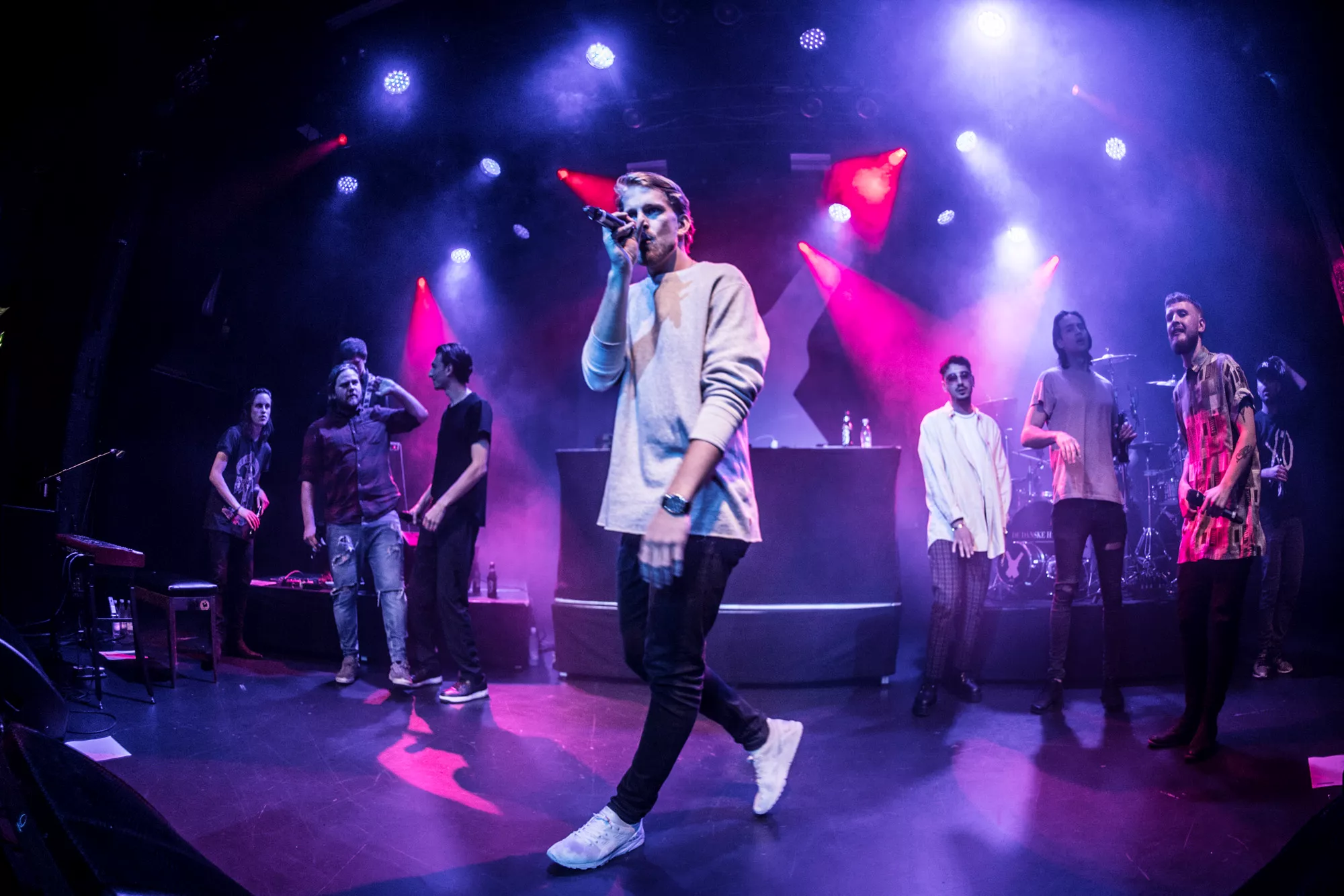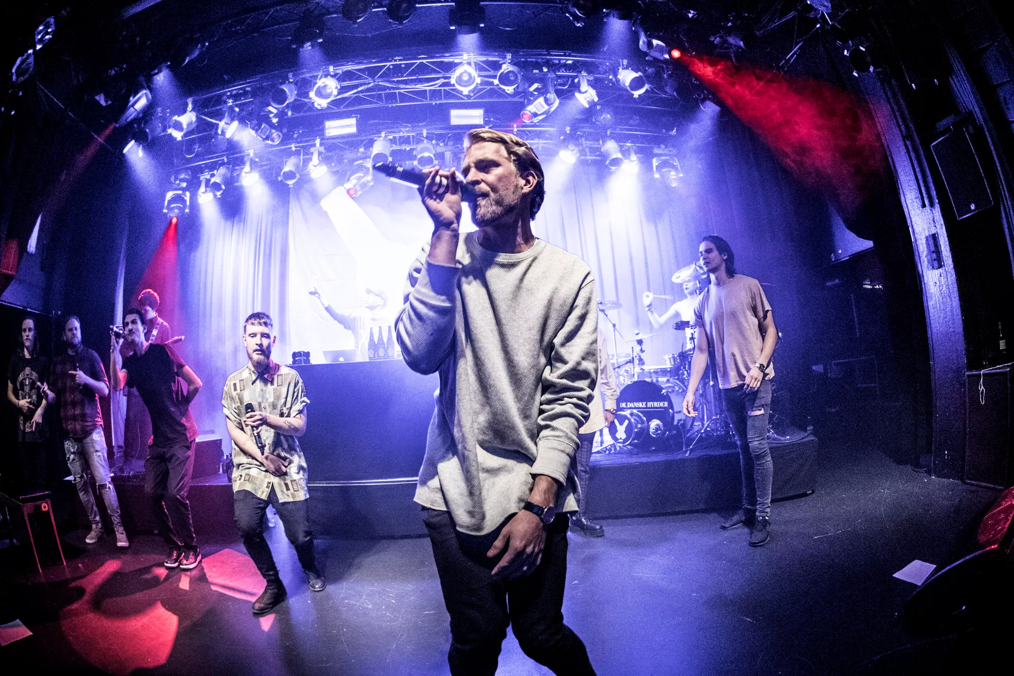 De seks år, det musikalske kollektiv har været samlet, har resulteret i tre studiealbum med dansksproget rap. I aften står de på scenen på Train i Aarhus, hvor de rapper og synger sig igennem tyve numre. Omkring en halv time før showtime fylder en stille og en