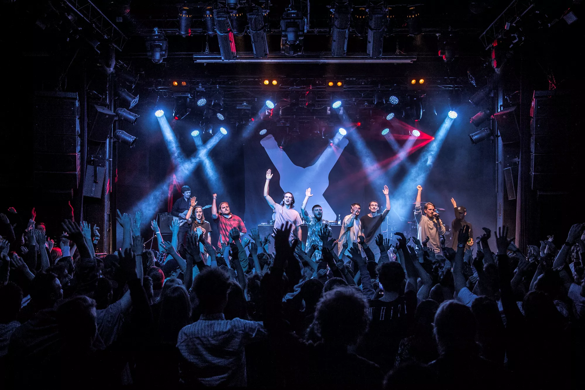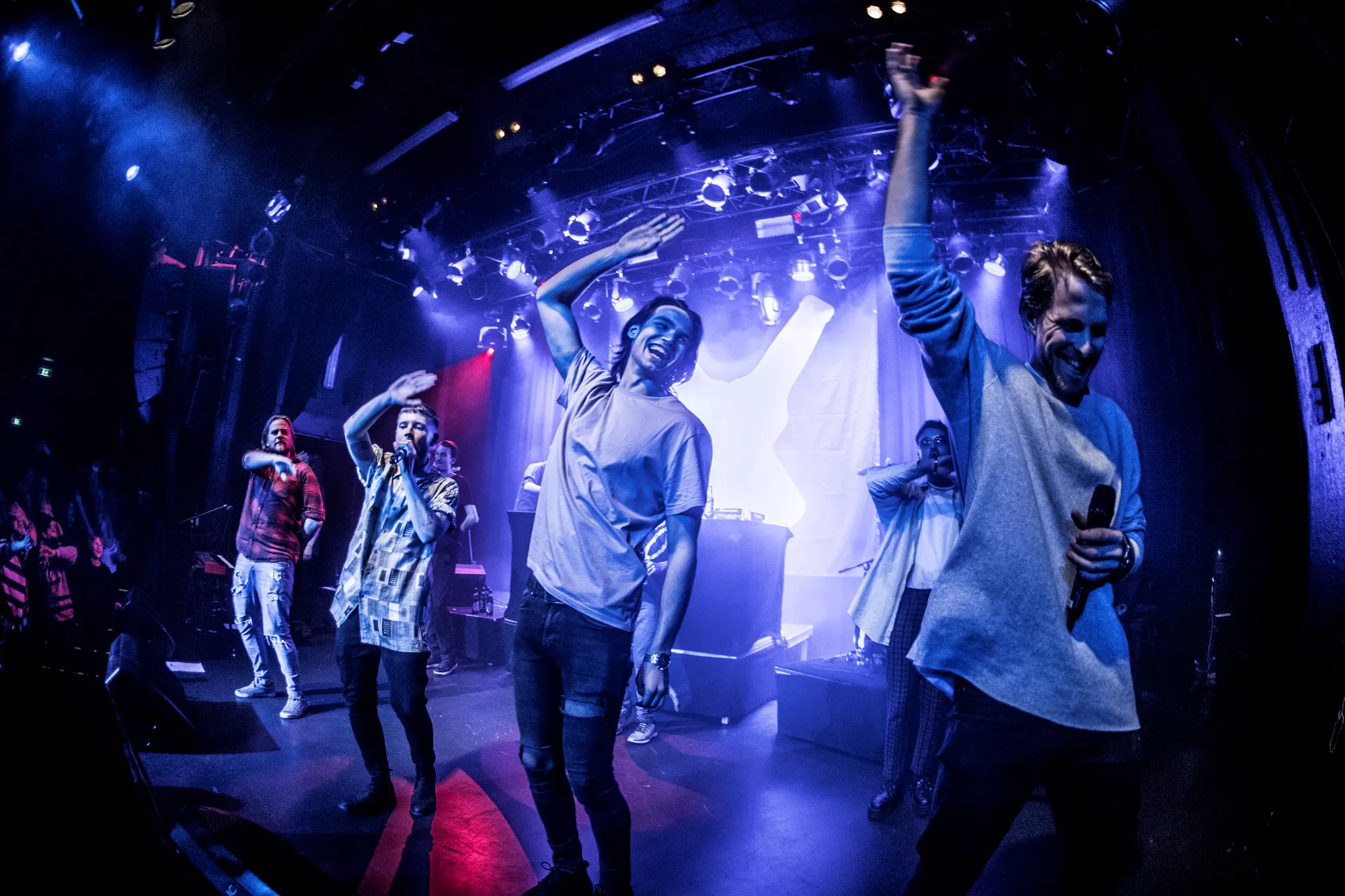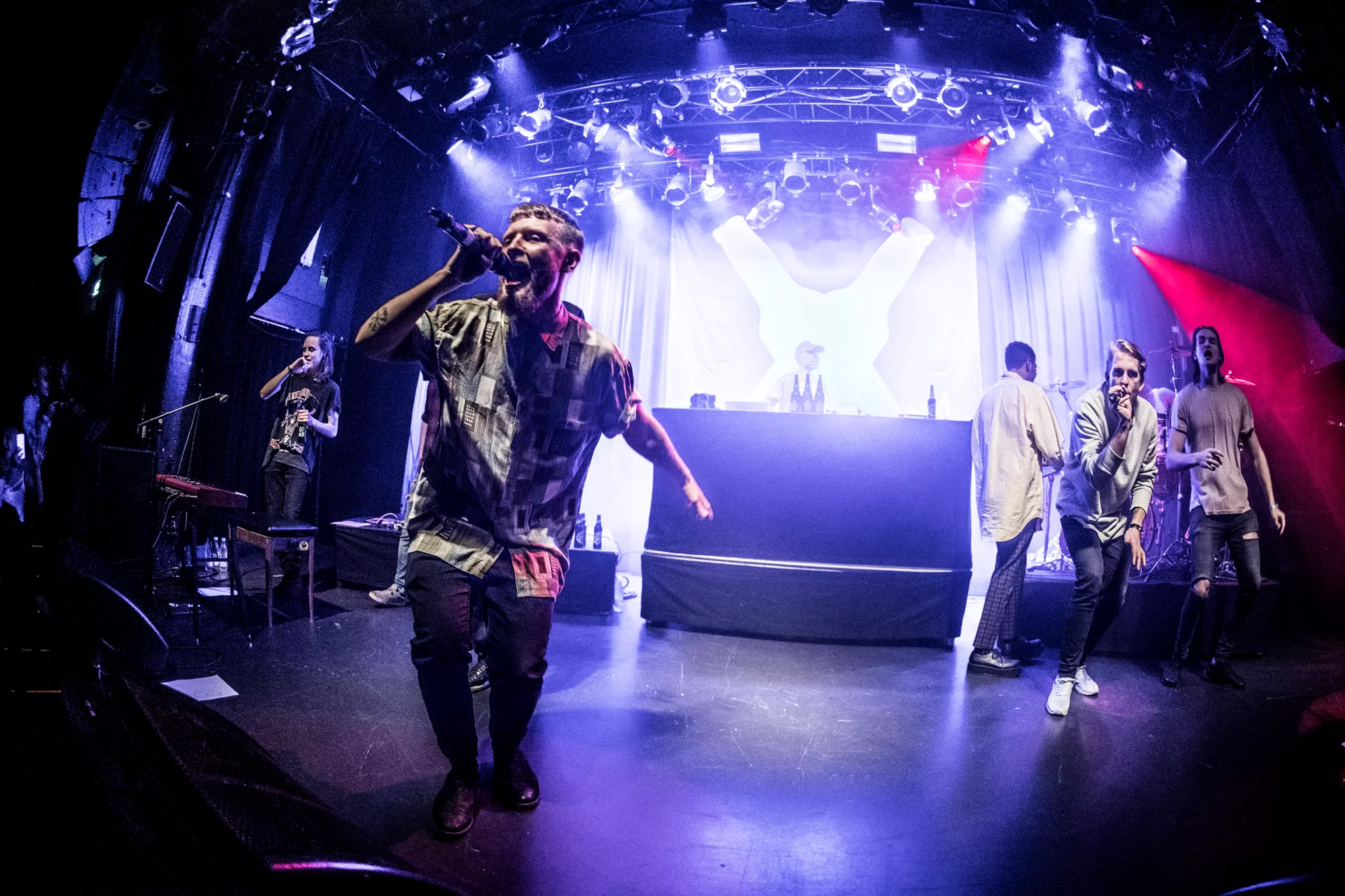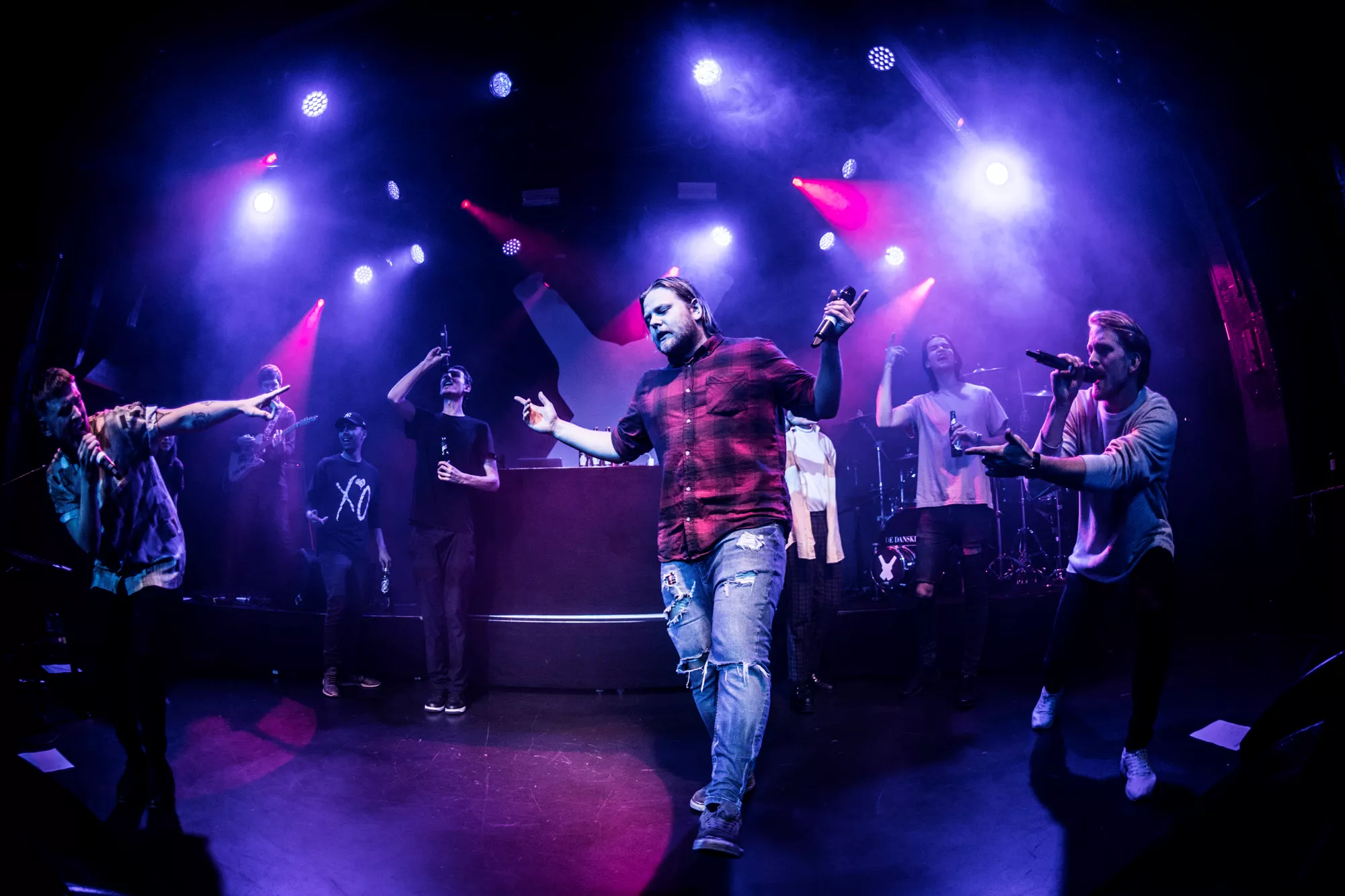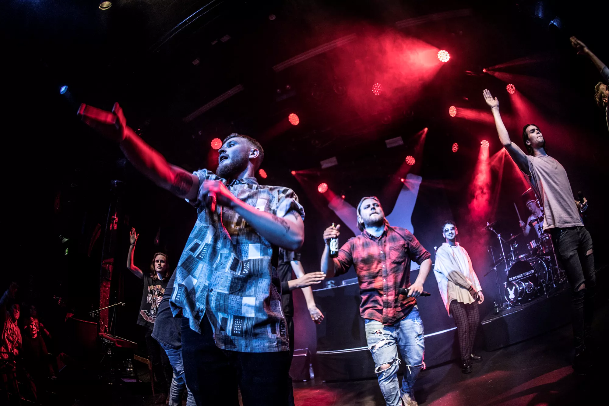 De seks år, det musikalske kollektiv har været samlet, har resulteret i tre studiealbum med dansksproget rap. I aften står de på scenen på Train i Aarhus, hvor de rapper og synger sig igennem tyve numre. Omkring en halv time før showtime fylder en stille og en