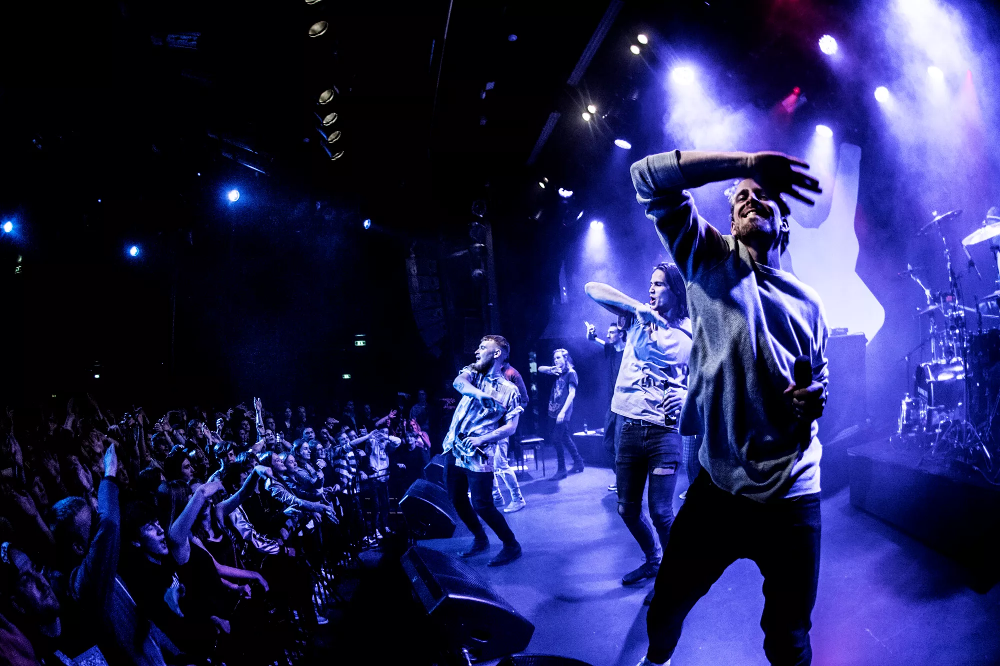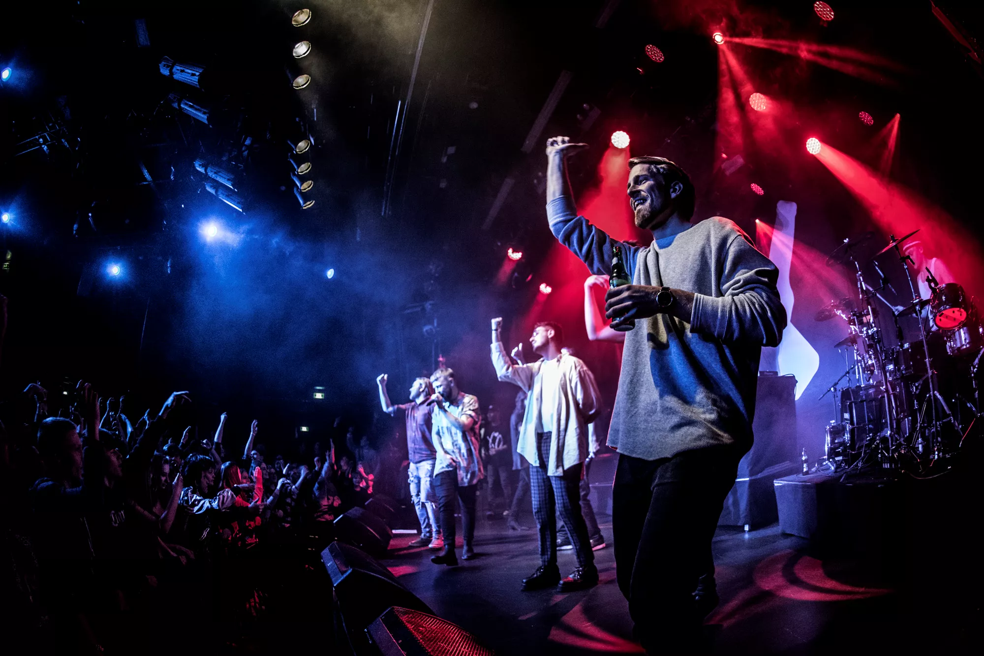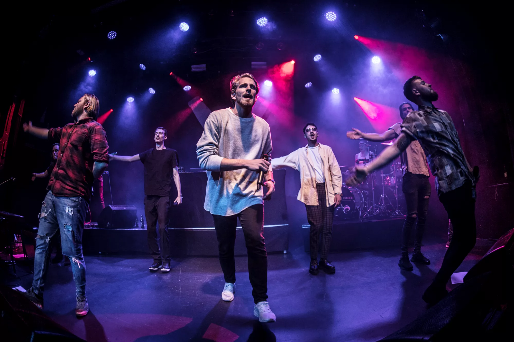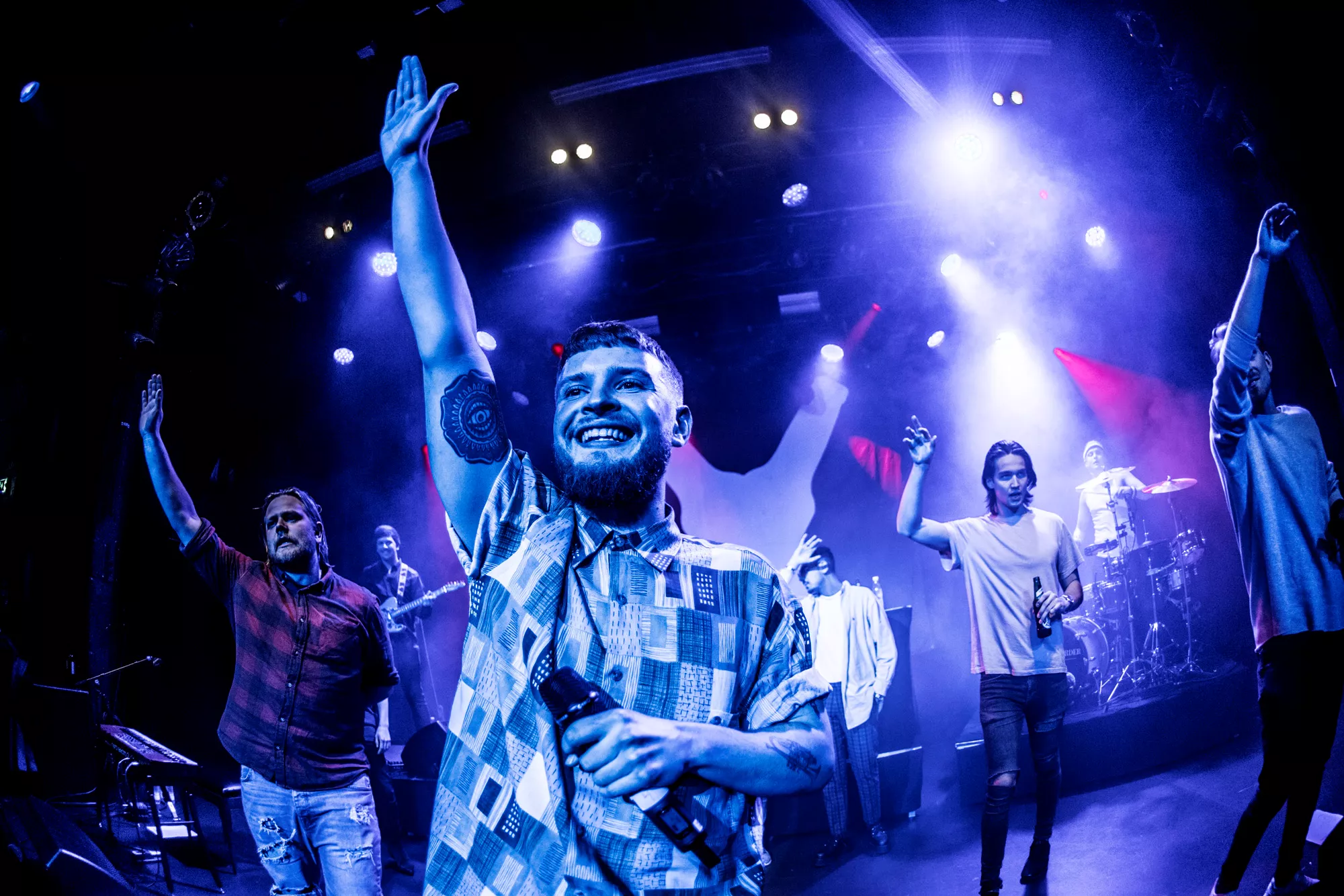 De seks år, det musikalske kollektiv har været samlet, har resulteret i tre studiealbum med dansksproget rap. I aften står de på scenen på Train i Aarhus, hvor de rapper og synger sig igennem tyve numre. Omkring en halv time før showtime fylder en stille og en