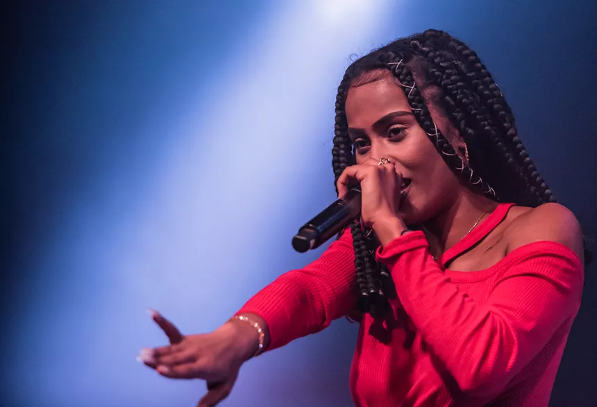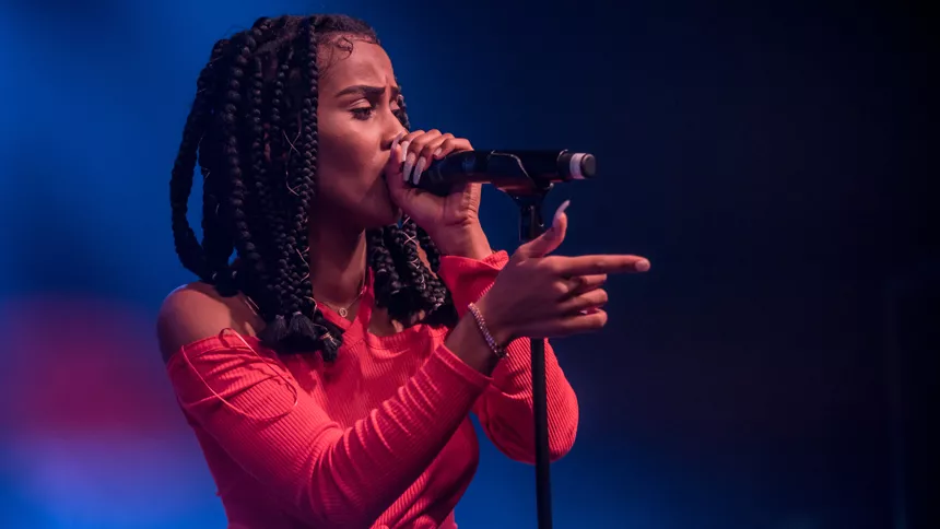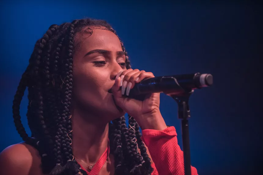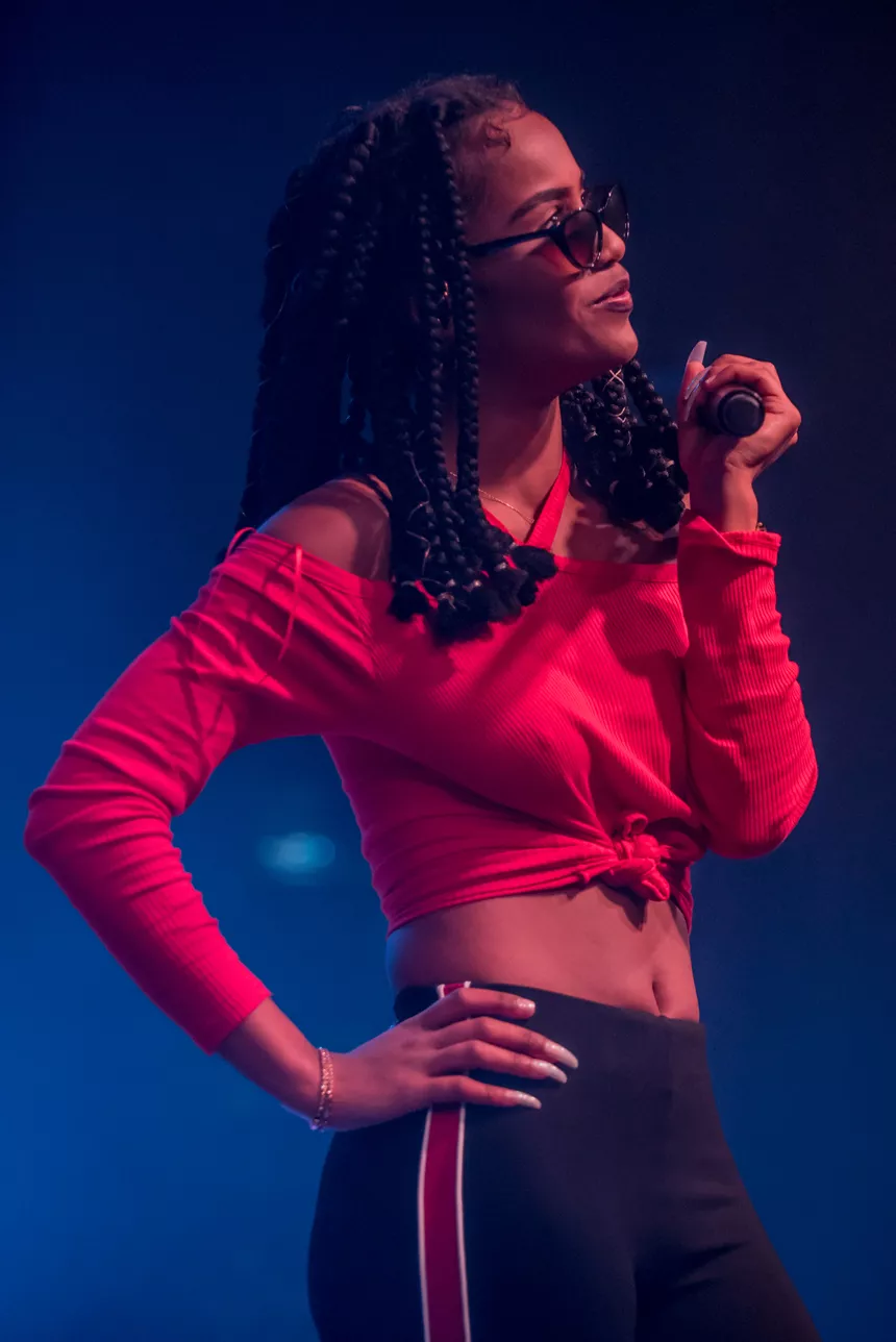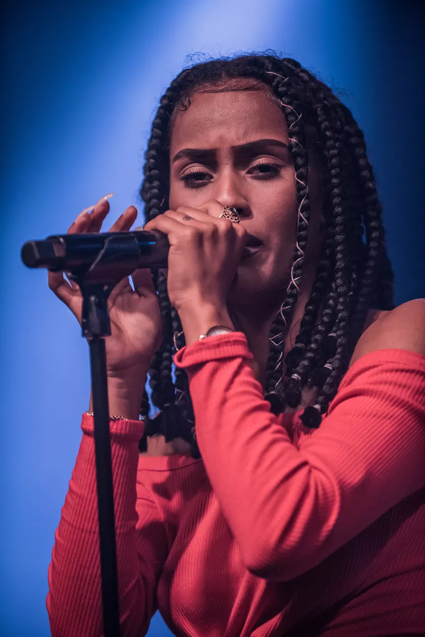 Det er en måske kommende verdensstjerne, der står på scenen denne sludprægede decemberaften på Atlas. Den 21-årige engelske soul/r&b/hiphop-sangerinde/rapper IAMDDB er i hvert fald spået et stort gennembrud af medier som BBC, Mixmag og Noisey, ligesom