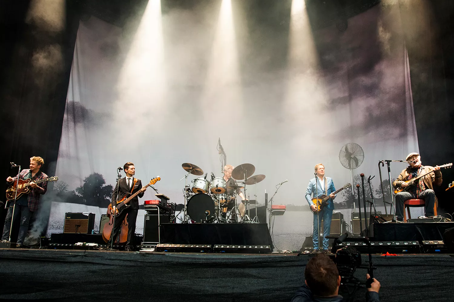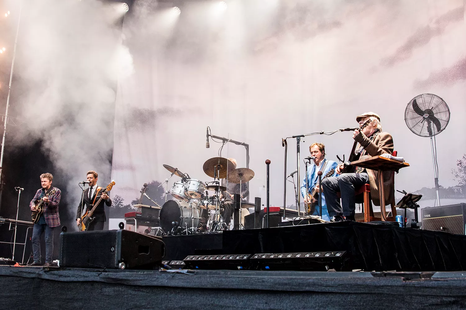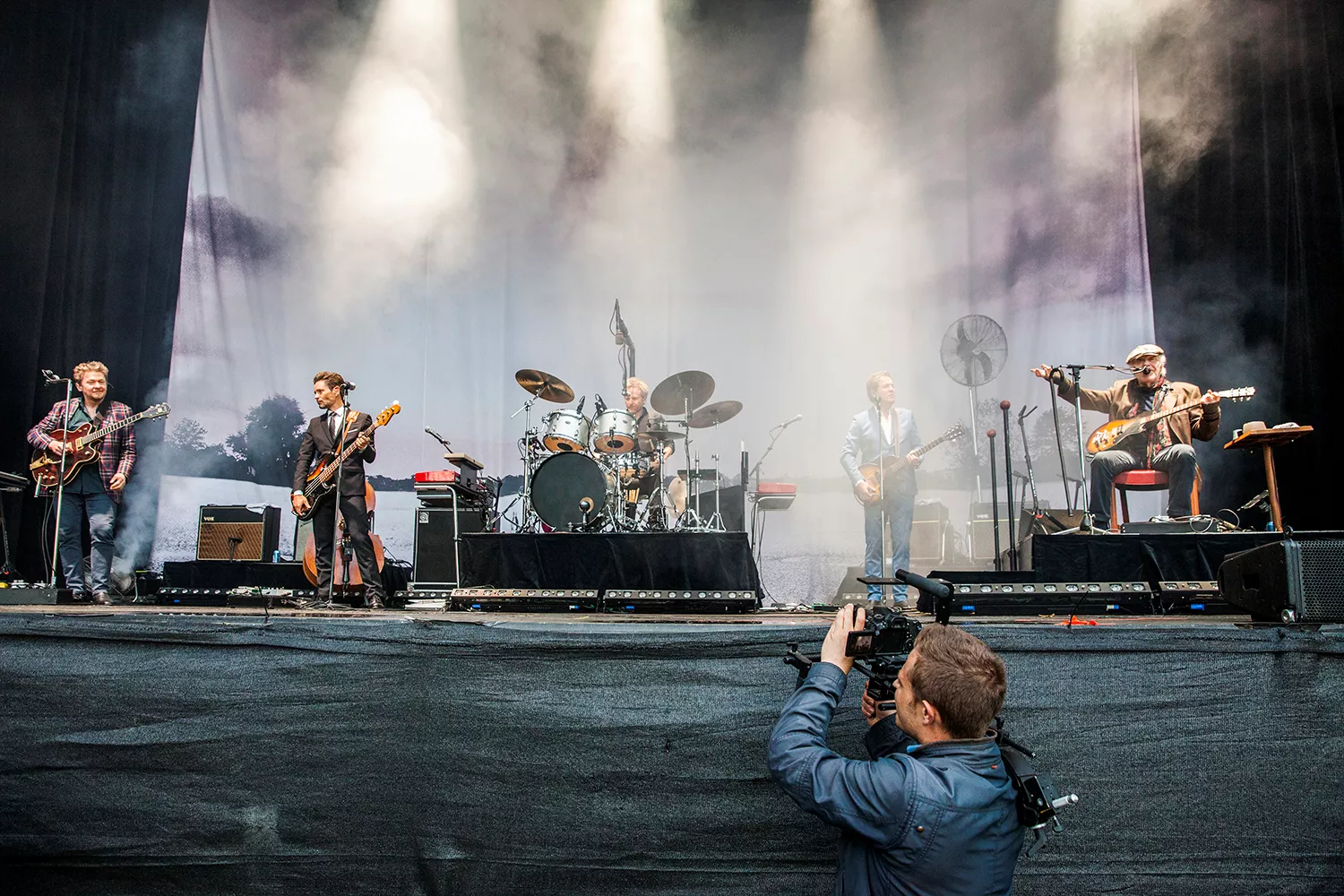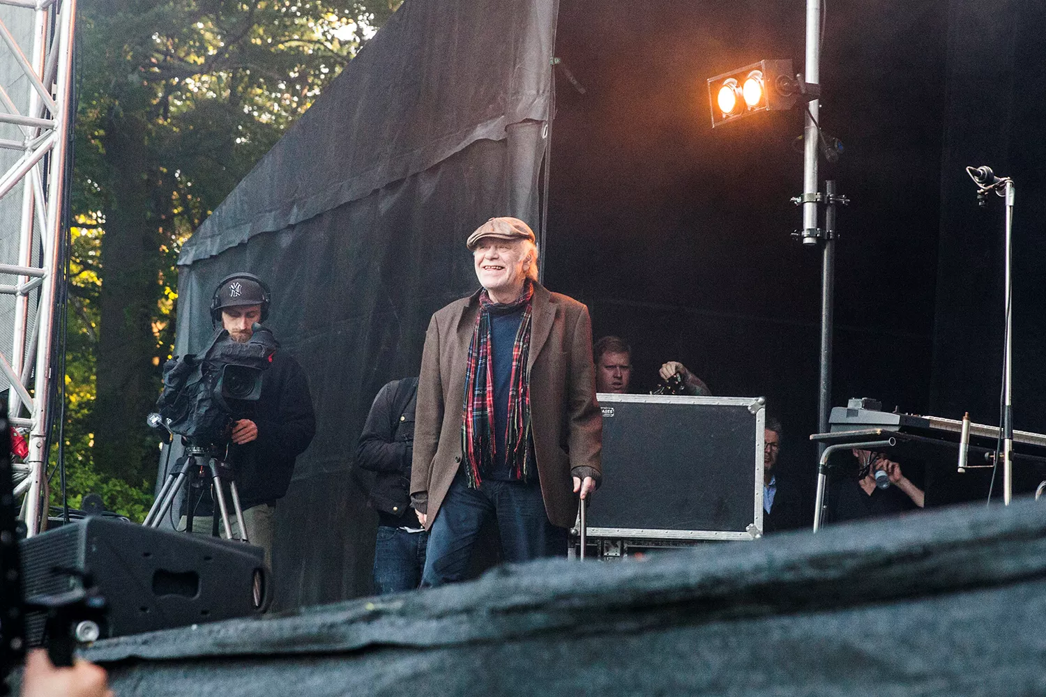 Med daggamle skægstubbe og et veloplagt grin slentrer Kim Larsen ind på scenen, og vi fornemmer, at humøret er højt.