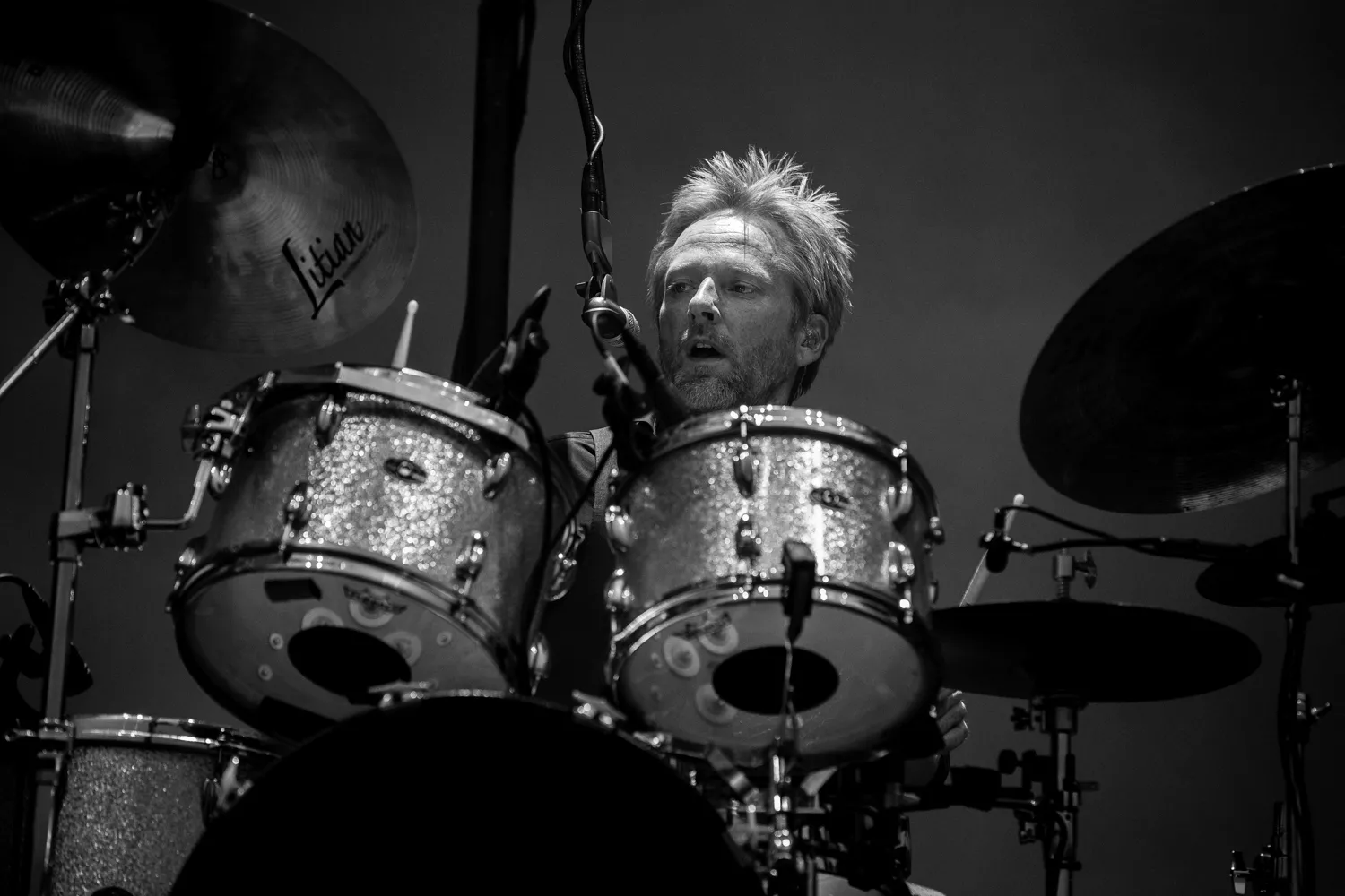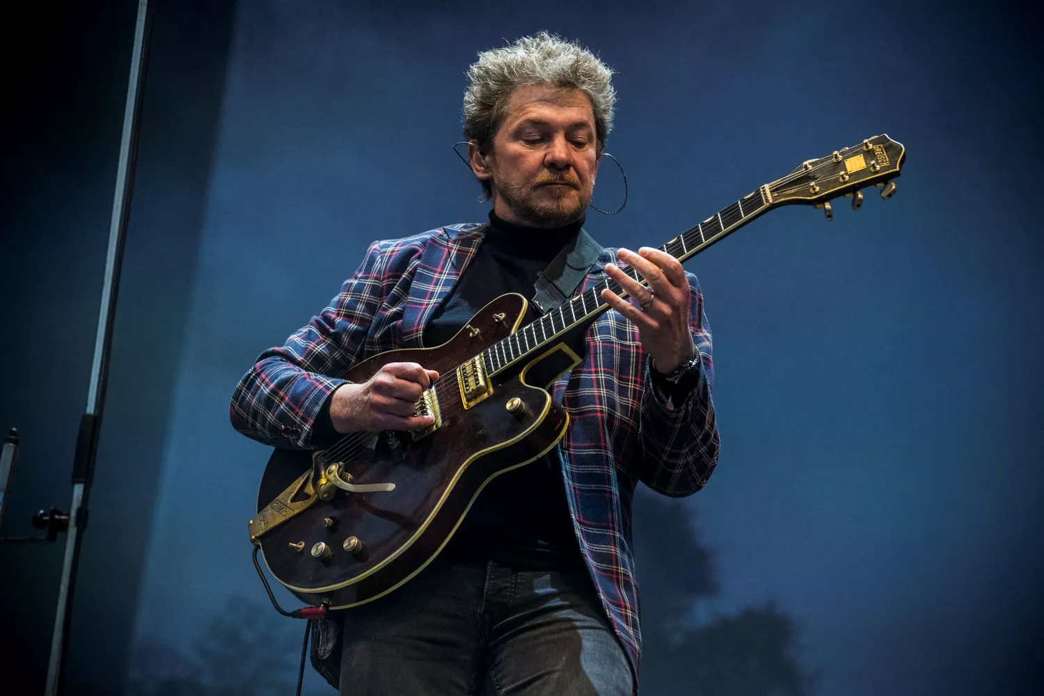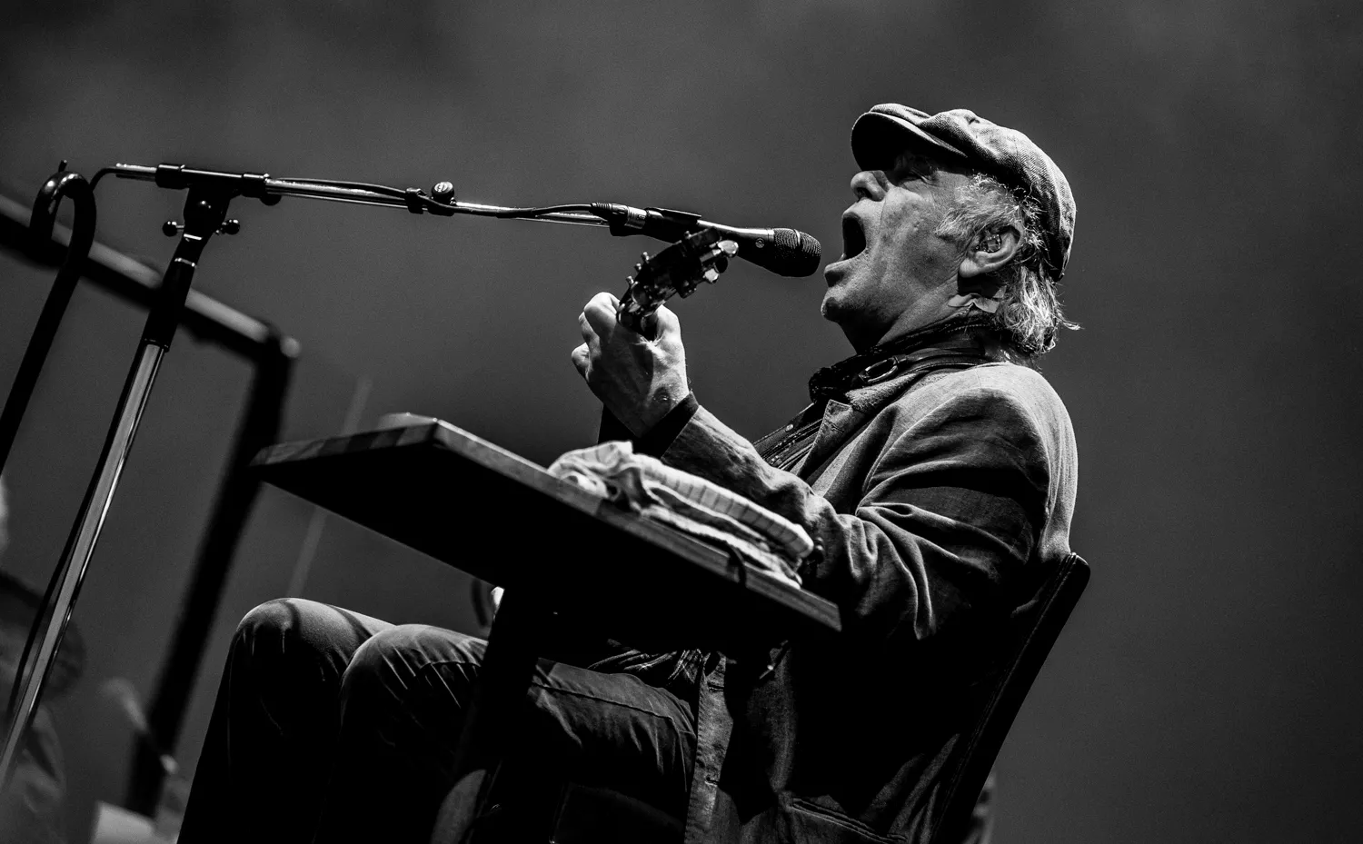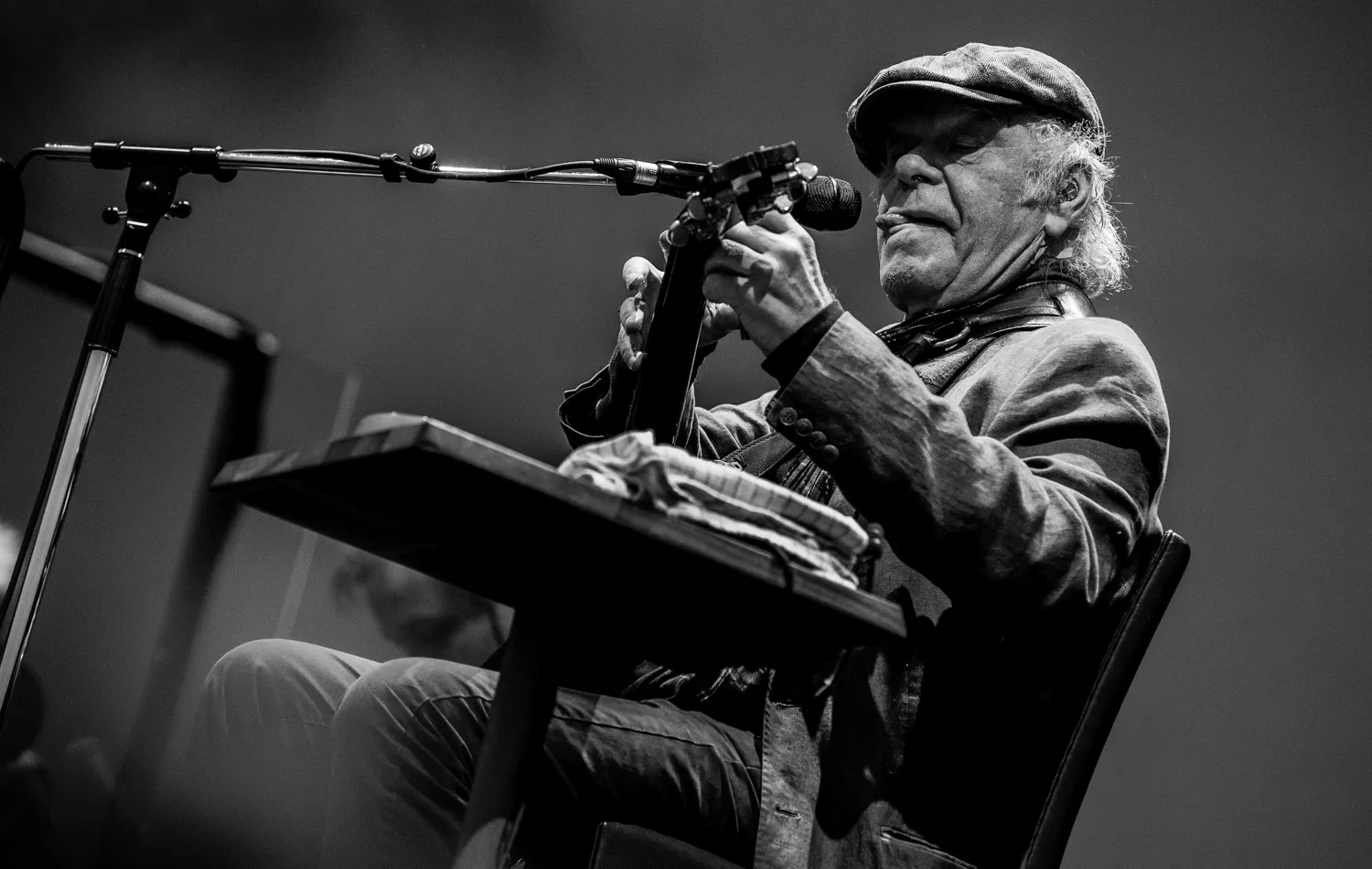 - Velsignet være den, som sætter sig ned, siger 71-årige Kim Larsen som det første, da han indtager den røde lænestol, som står og venter på scenen. Her bliver han siddende koncerten igennem.