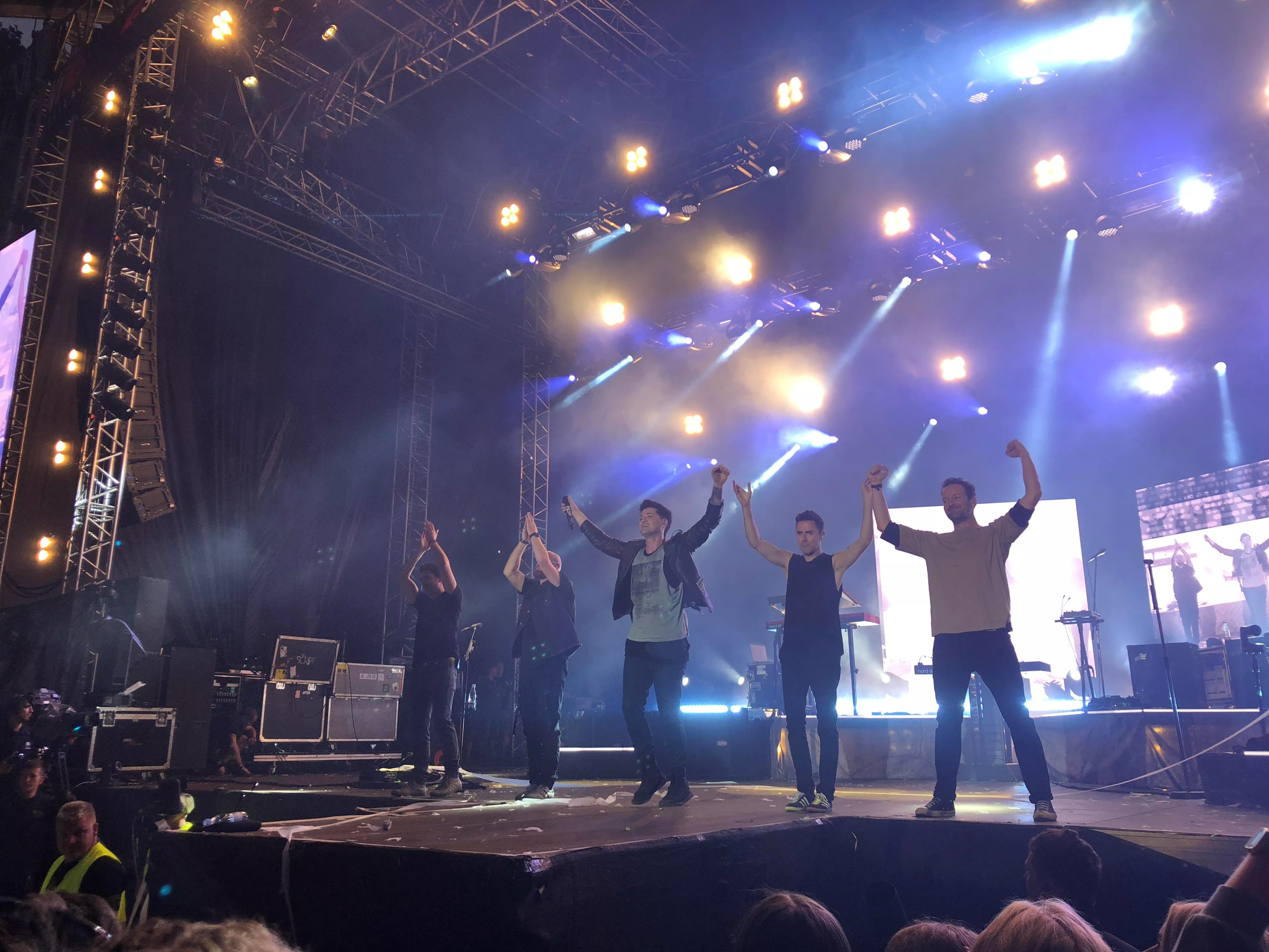Jeg skynder mig videre på min færd i de her back to back-koncerter, og da jeg når fra det Blå telt ned til The Scripts koncert på Store Scene, er der naturligvis tæt pakket allerede. Det irske poprockband lægger ud med det storladne nummer ”We Rock The