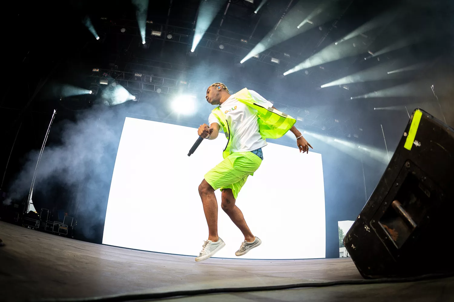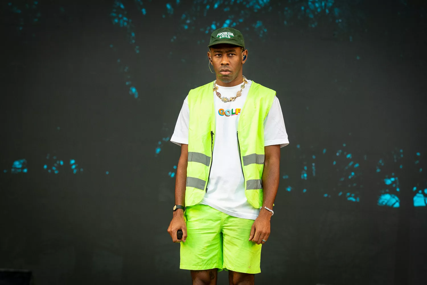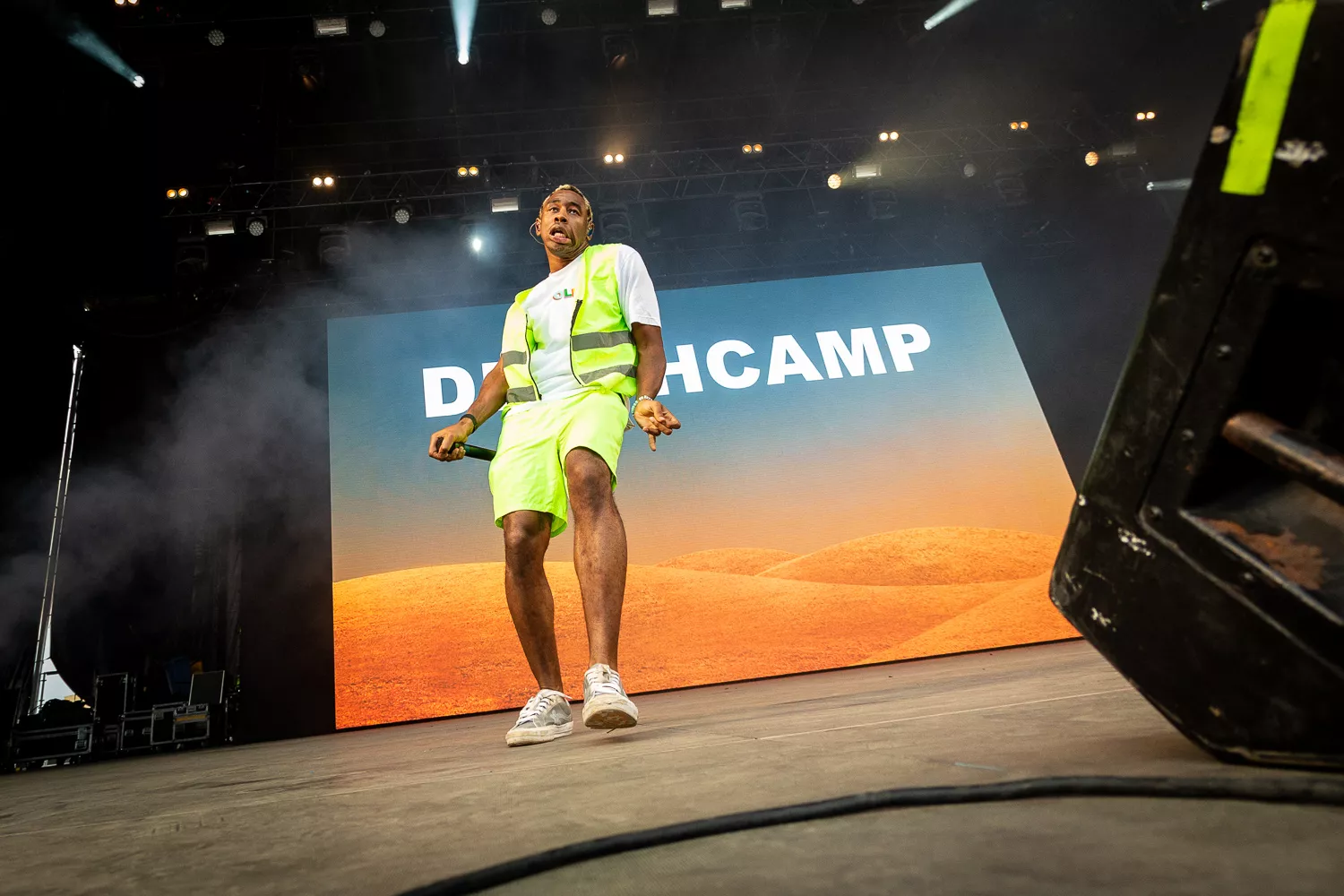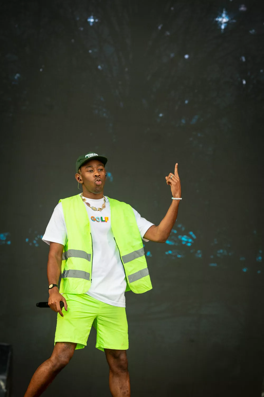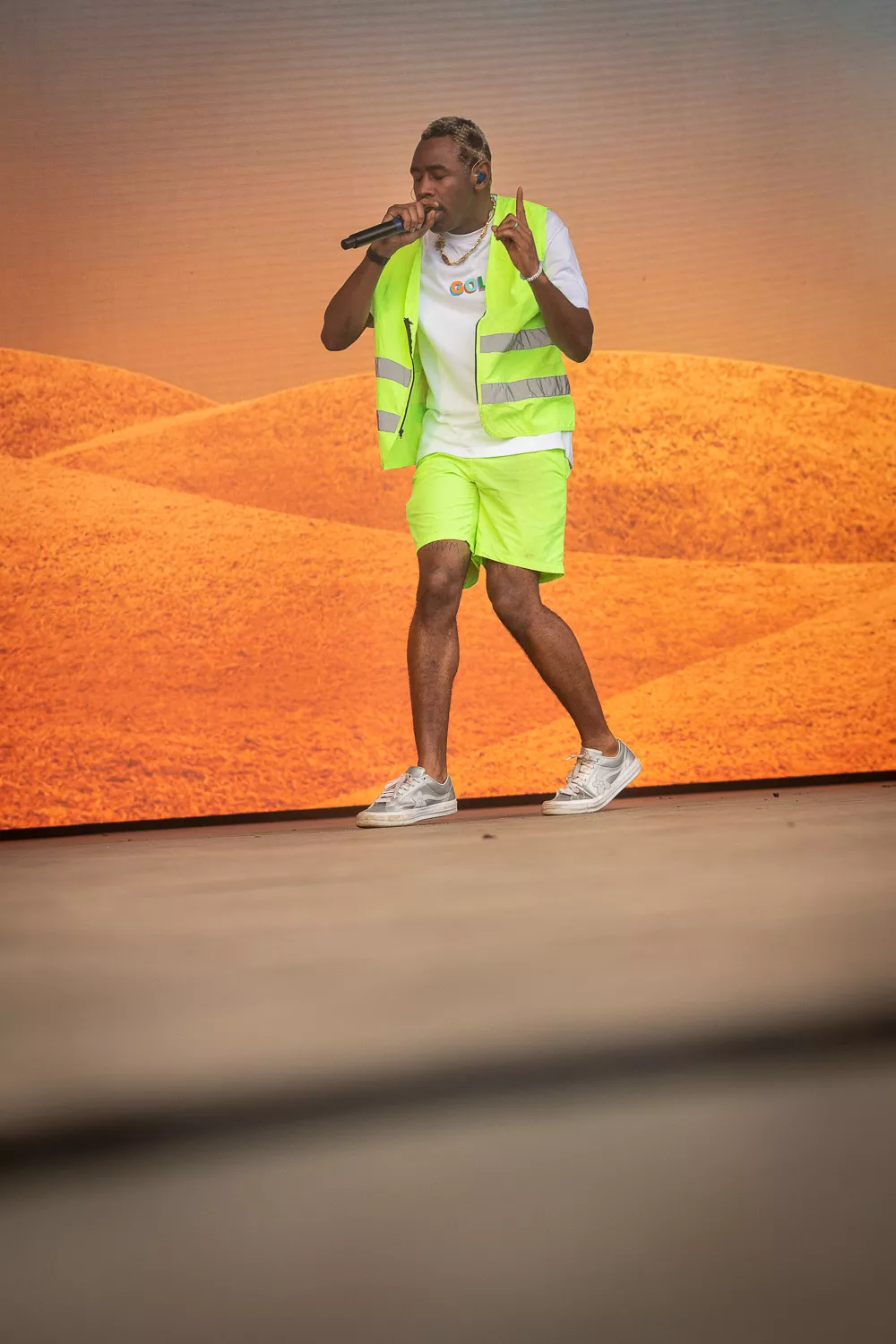 Til de blide toner fra ”Flower Boy” indtager Tyler Green Stage ene mand iført neongul sikkerhedsvest, lige så neongule shorts og en ”Golf”-T-shirt, og som en sulten ulv bevæger han sig frem og tilbage på scenen og bjæffer linjer som ”Flower