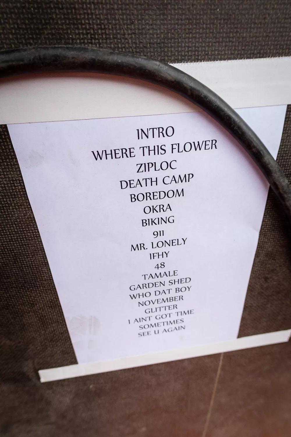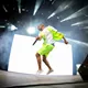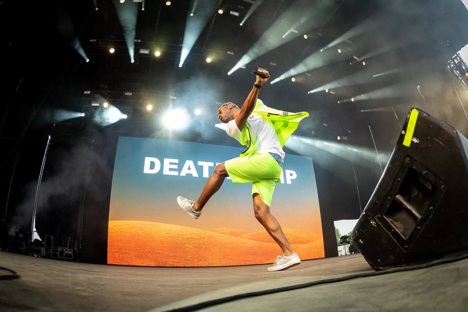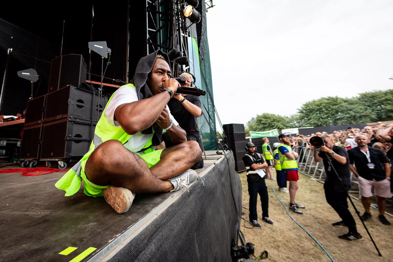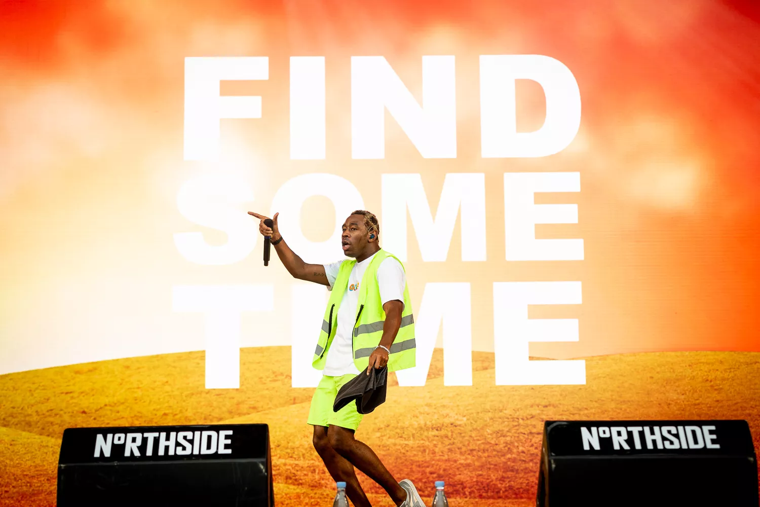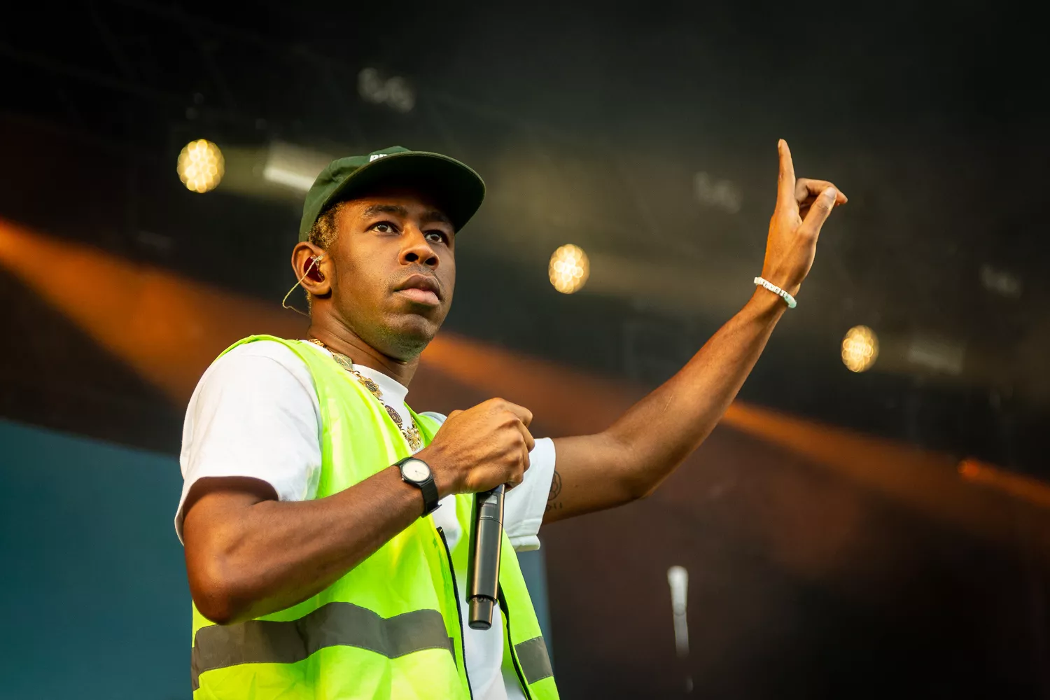 Til de blide toner fra ”Flower Boy” indtager Tyler Green Stage ene mand iført neongul sikkerhedsvest, lige så neongule shorts og en ”Golf”-T-shirt, og som en sulten ulv bevæger han sig frem og tilbage på scenen og bjæffer linjer som ”Flower