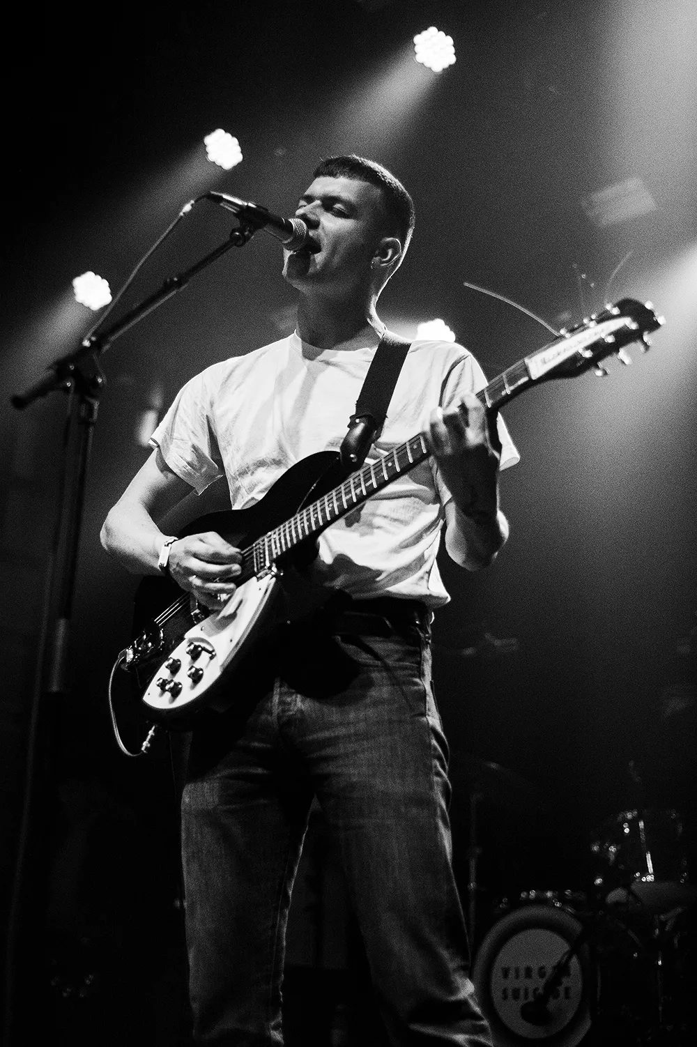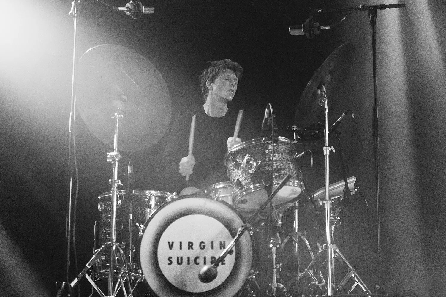 De vanish-hvide T-shirts oplyses af et blå-lilla lysstofrør og varsler indendørsfest, da Virgin Suicide indtager venstre scene i Scandinavian Congres Center fredag før midnat. Med nummeret “Forever Trouble", der deler titel med 2017-albummet, tiltrækker