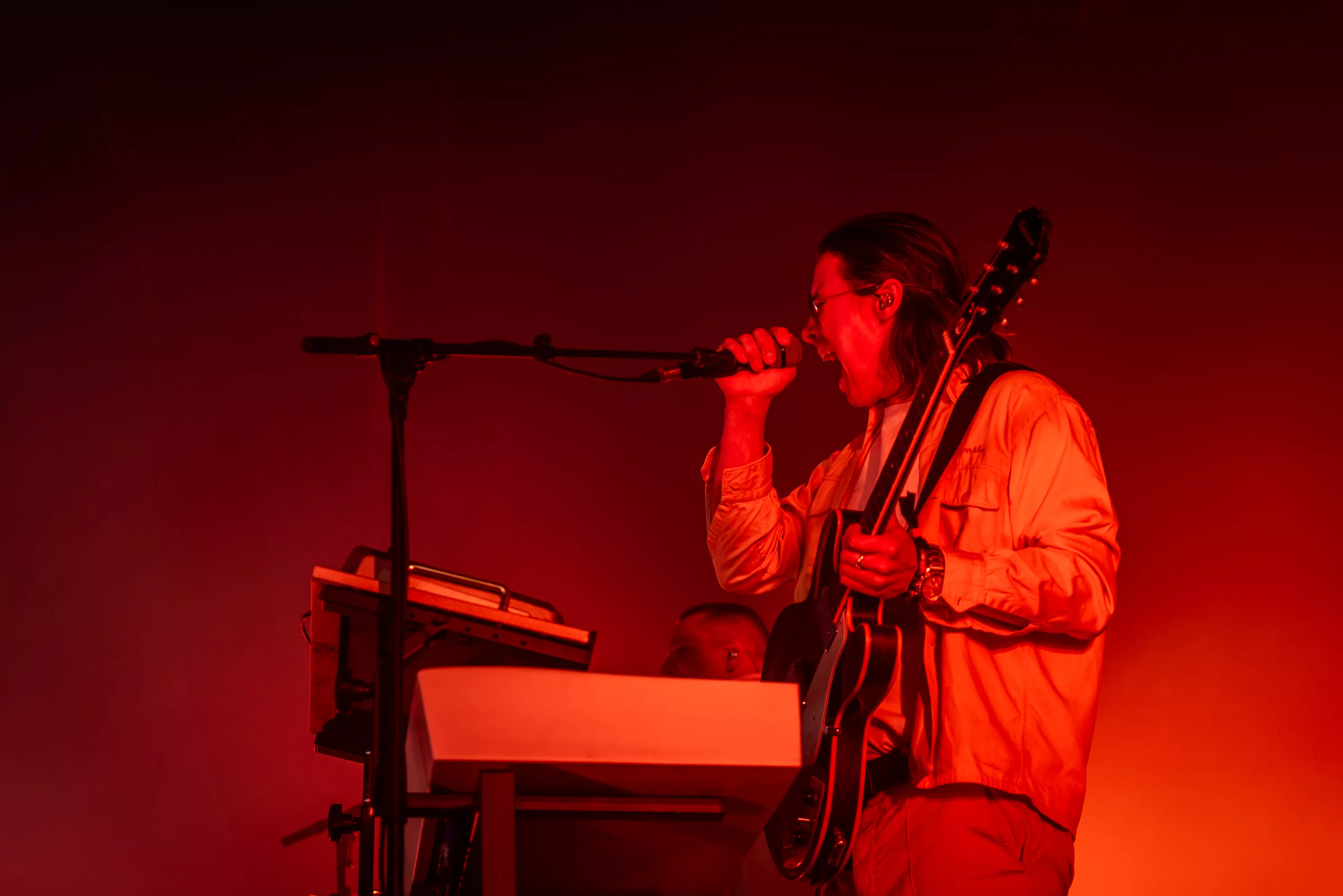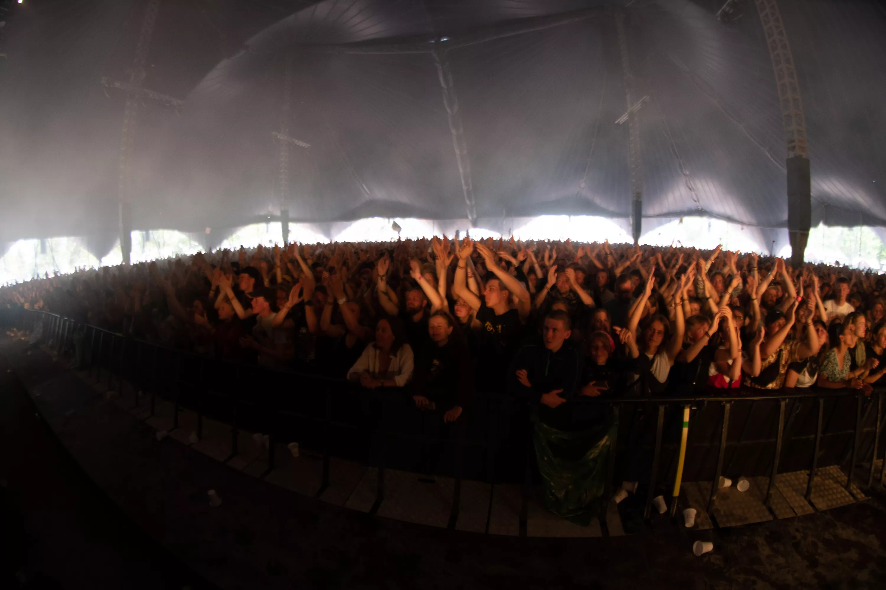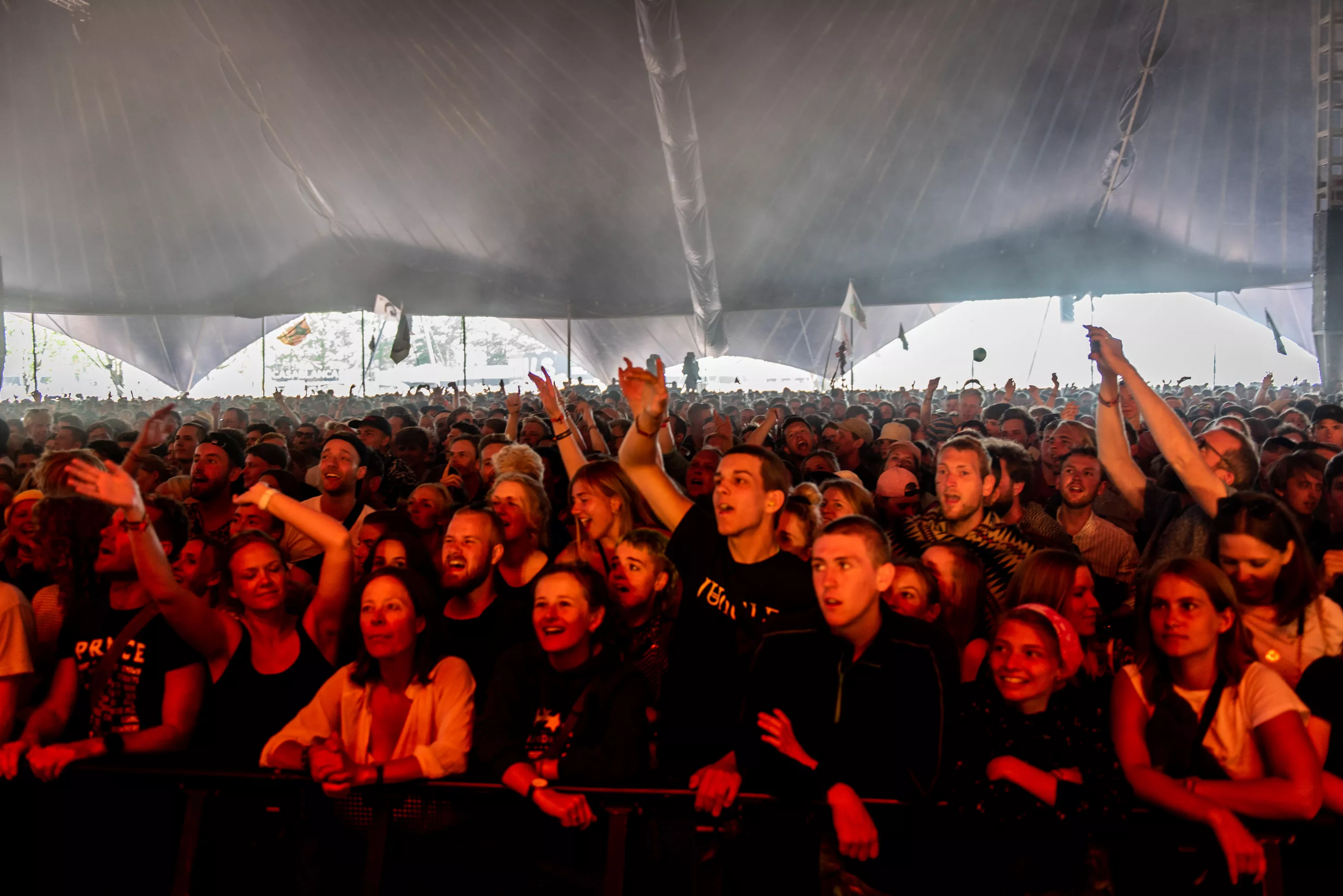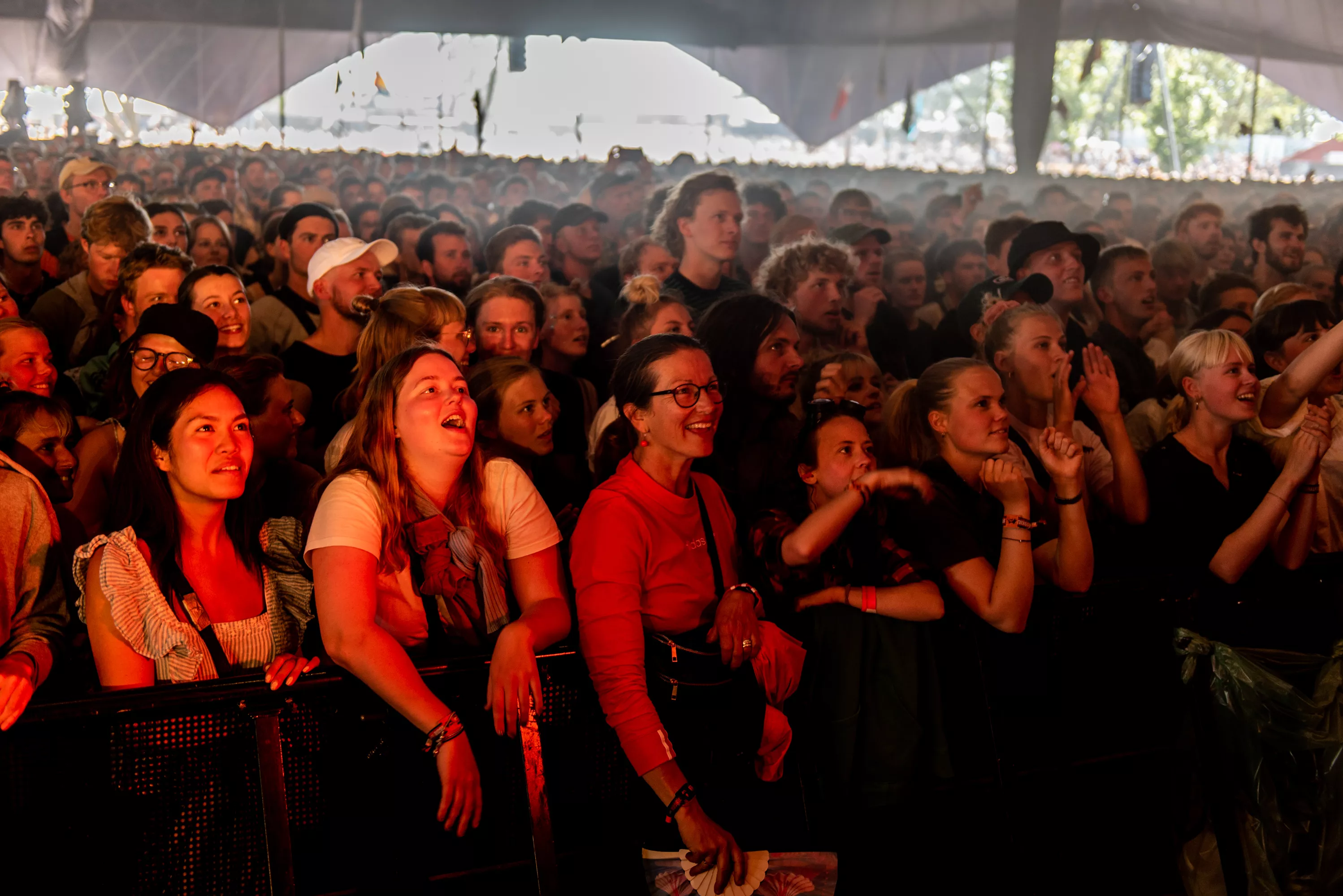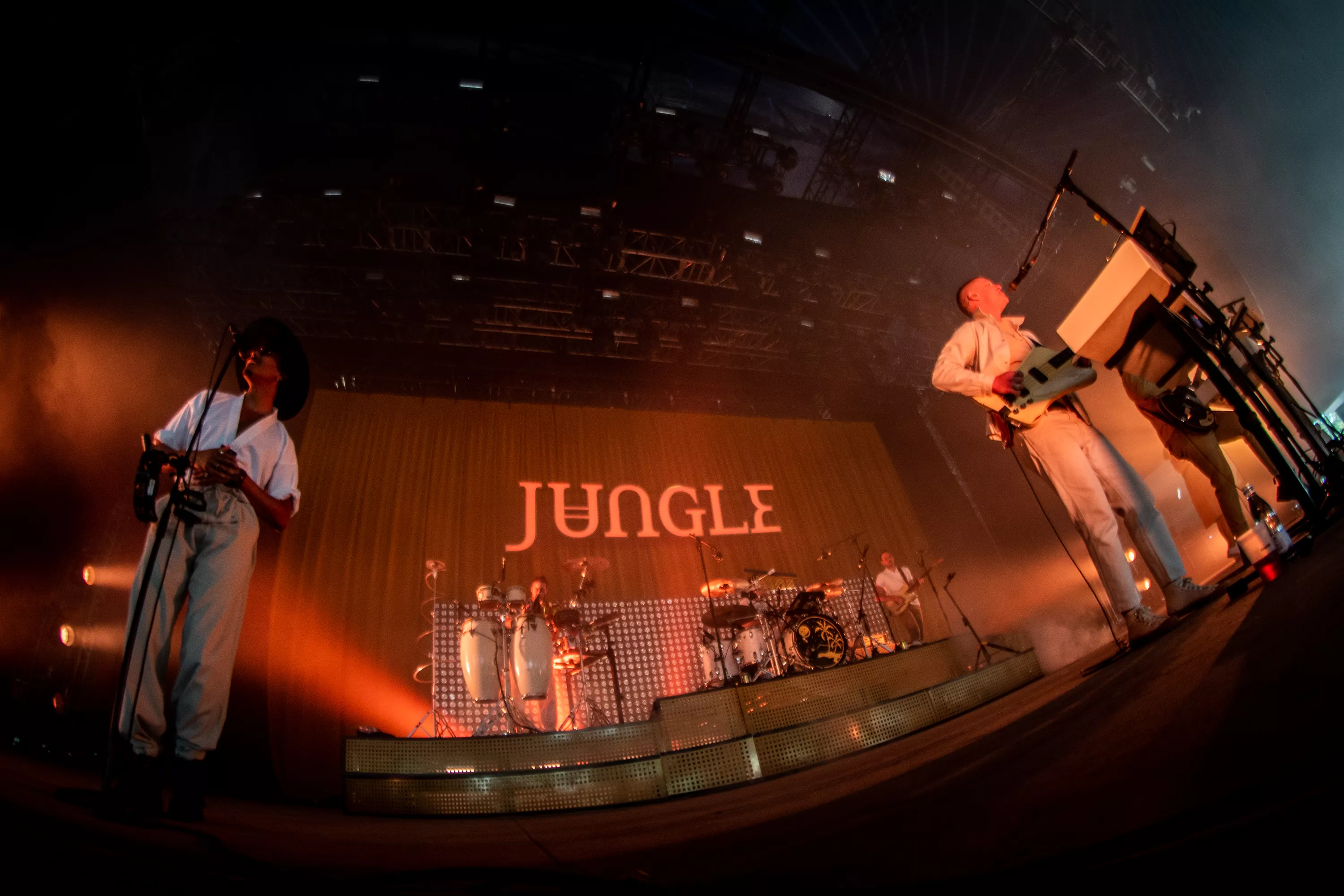 Det er blevet fredag, og solen skinner igen over Roskilde Festival. Det kunne i den grad mærkes på festivalpublikummet, som igen havde fundet shorts og korte ærmer frem, op til Jungles ventede koncert på Arena. Støven hvirvlede ubarmhjertigt