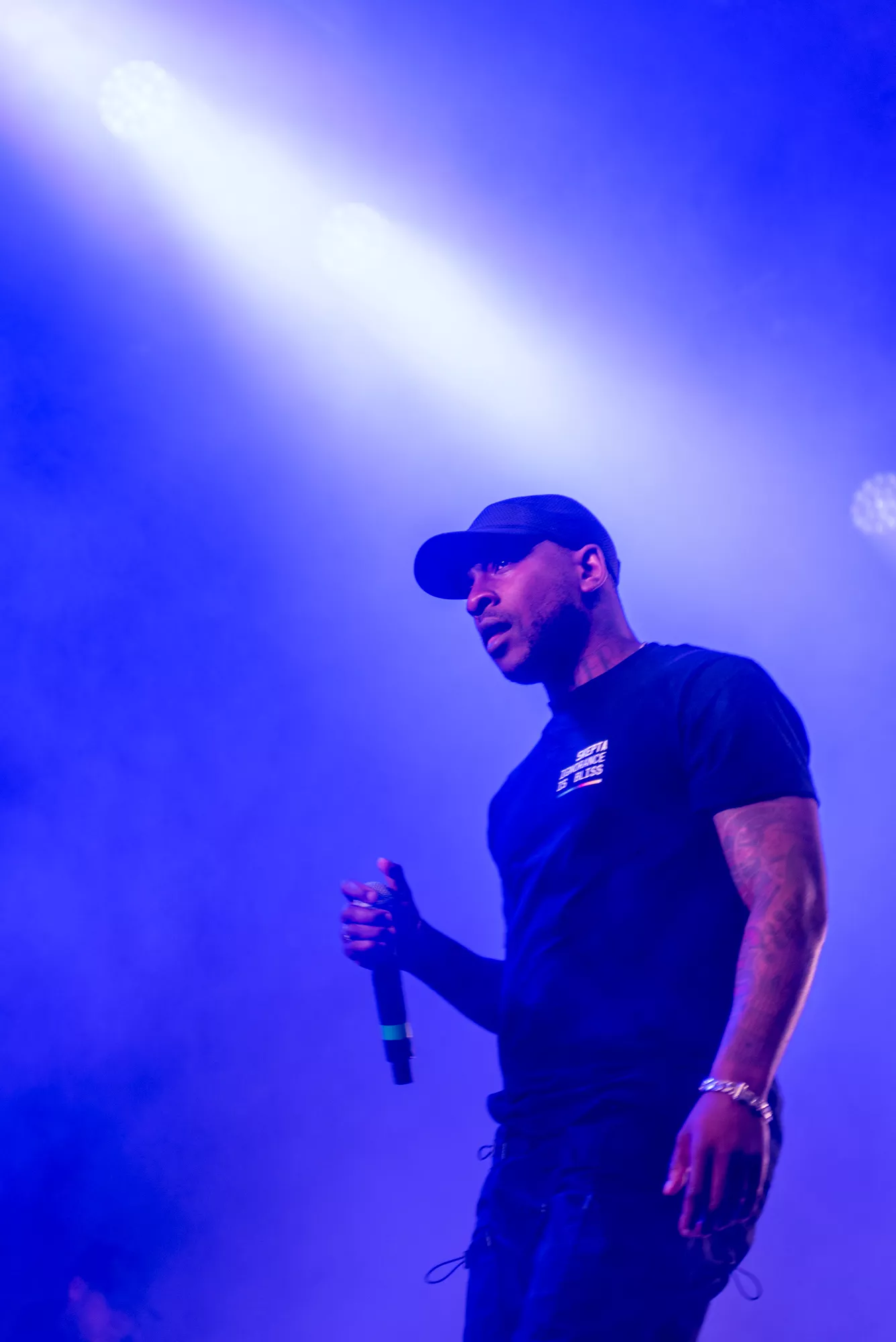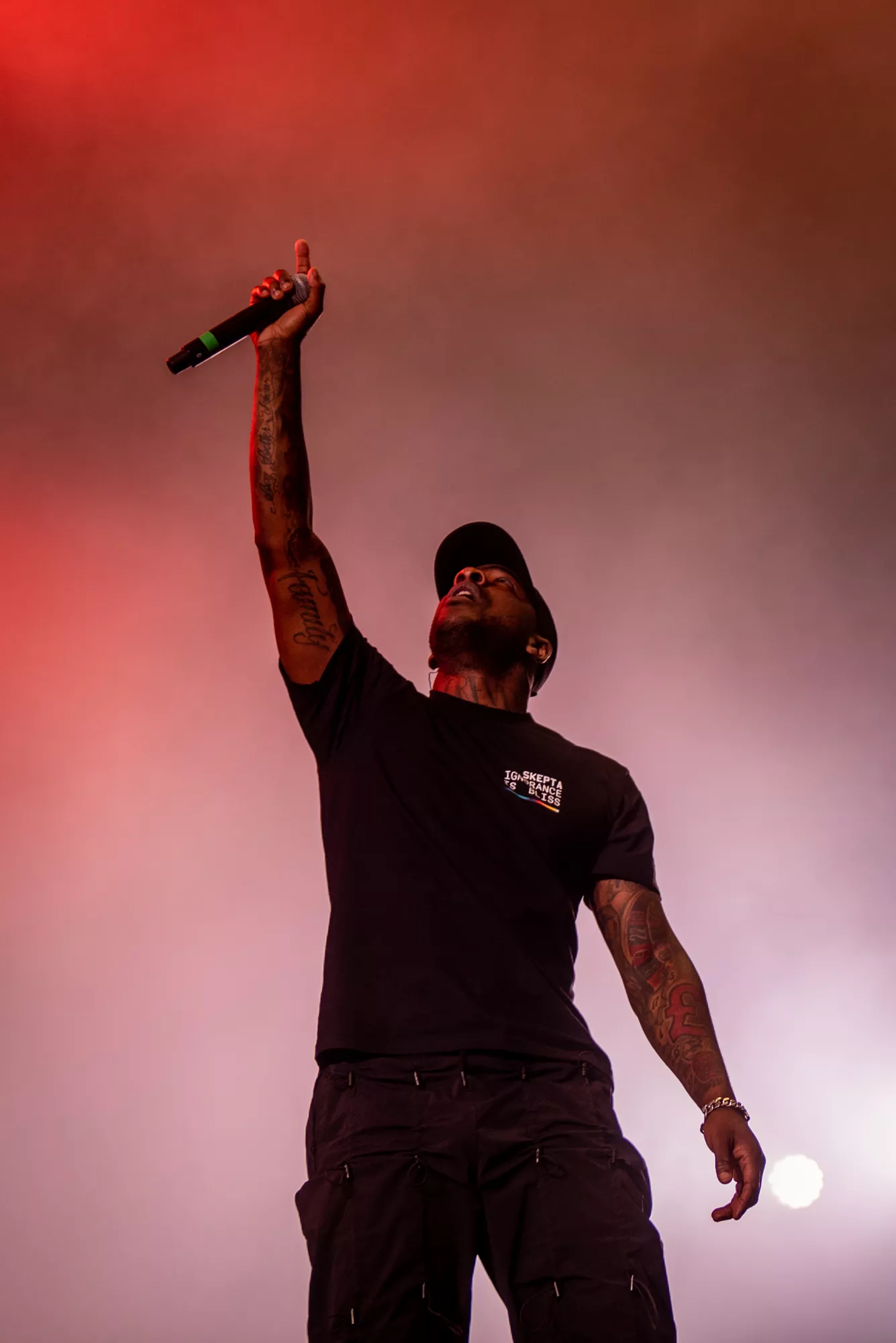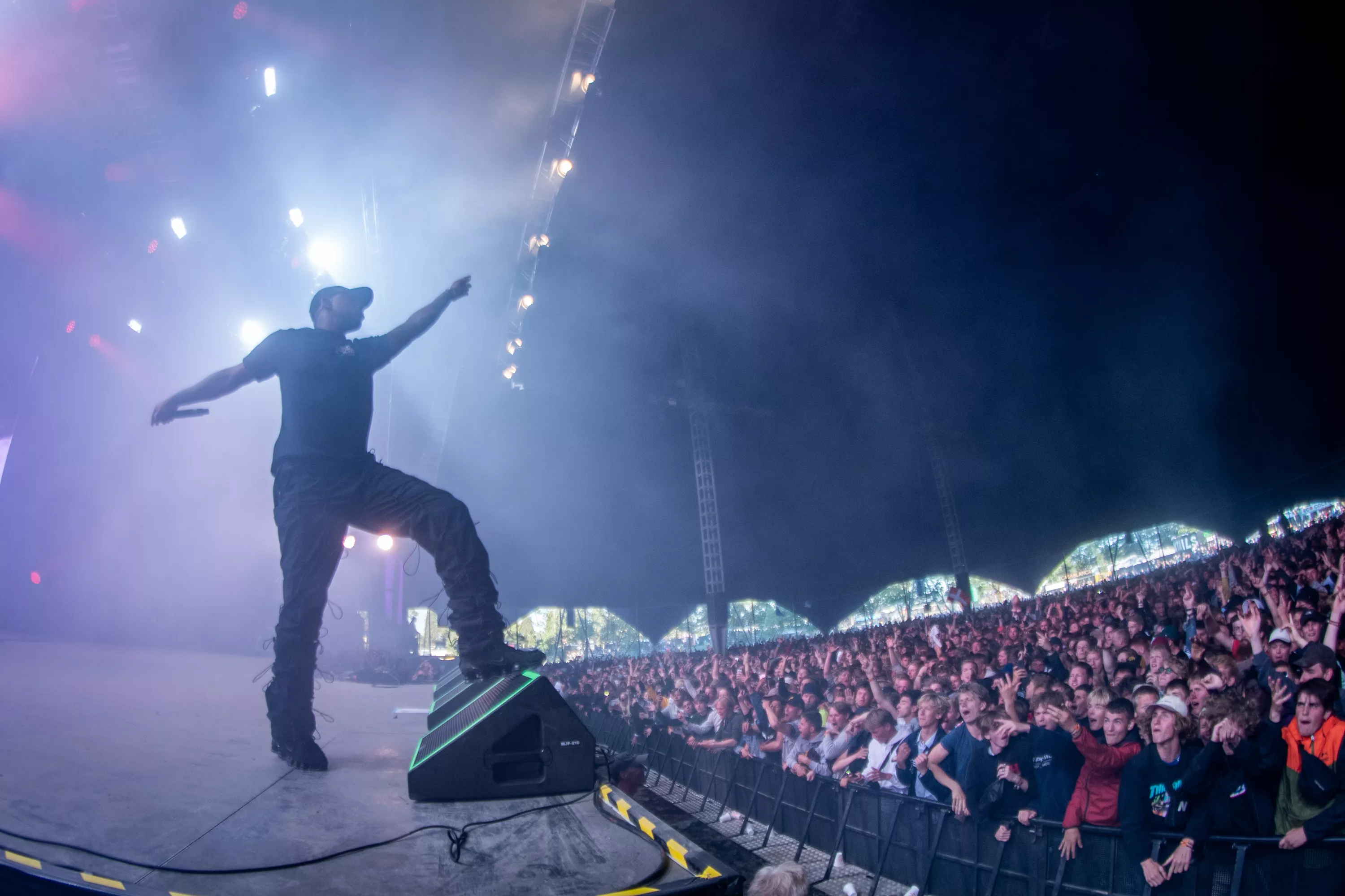 Til nummeret “That’s Not Me” gik britiske Skepta på scenen fem minutter tidligere end den programsatte tid, hvilket medførte, at undertegnede stadig var ilende fra presseområdet over til det blå kæmpetelt på festivalens