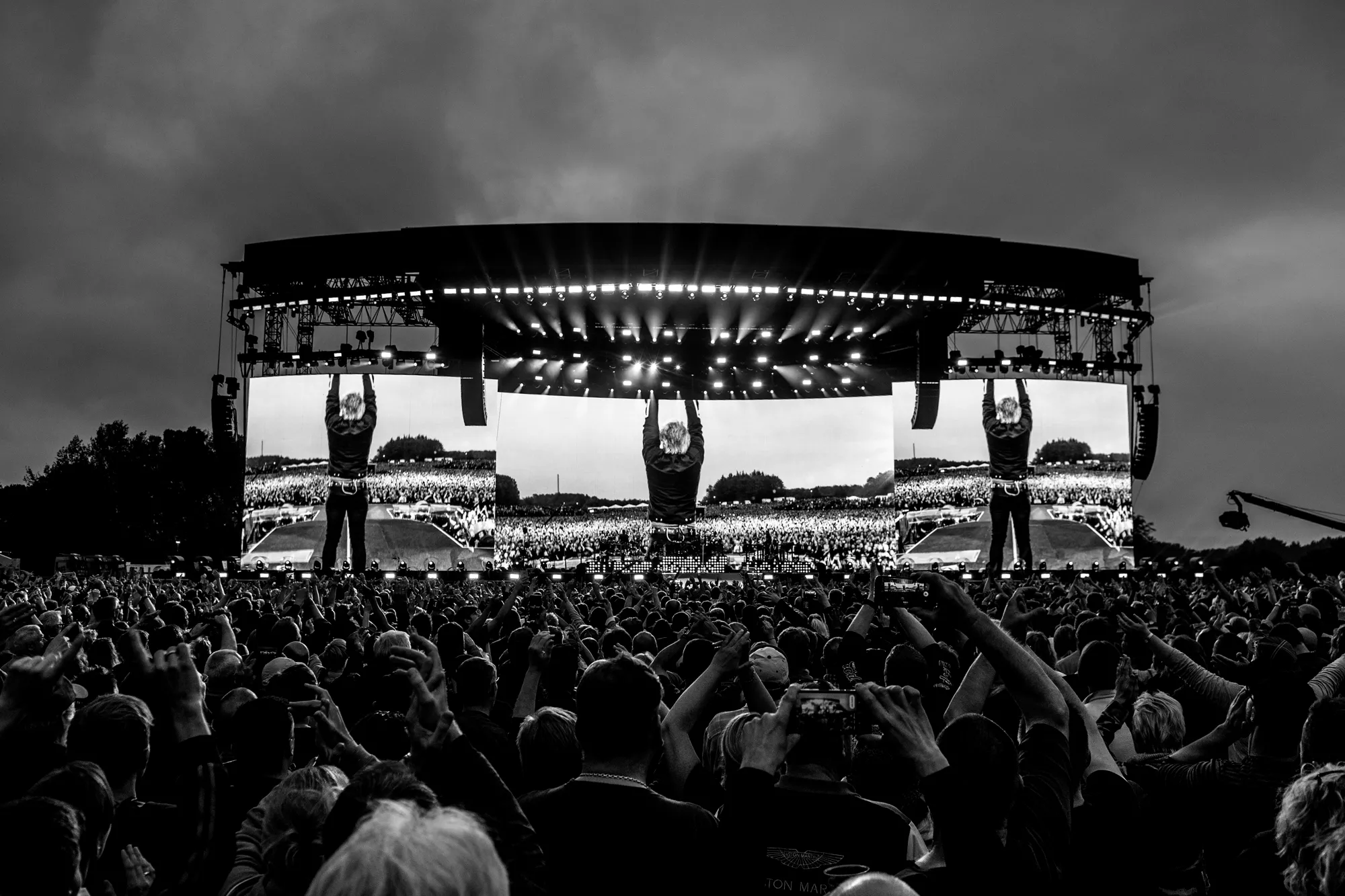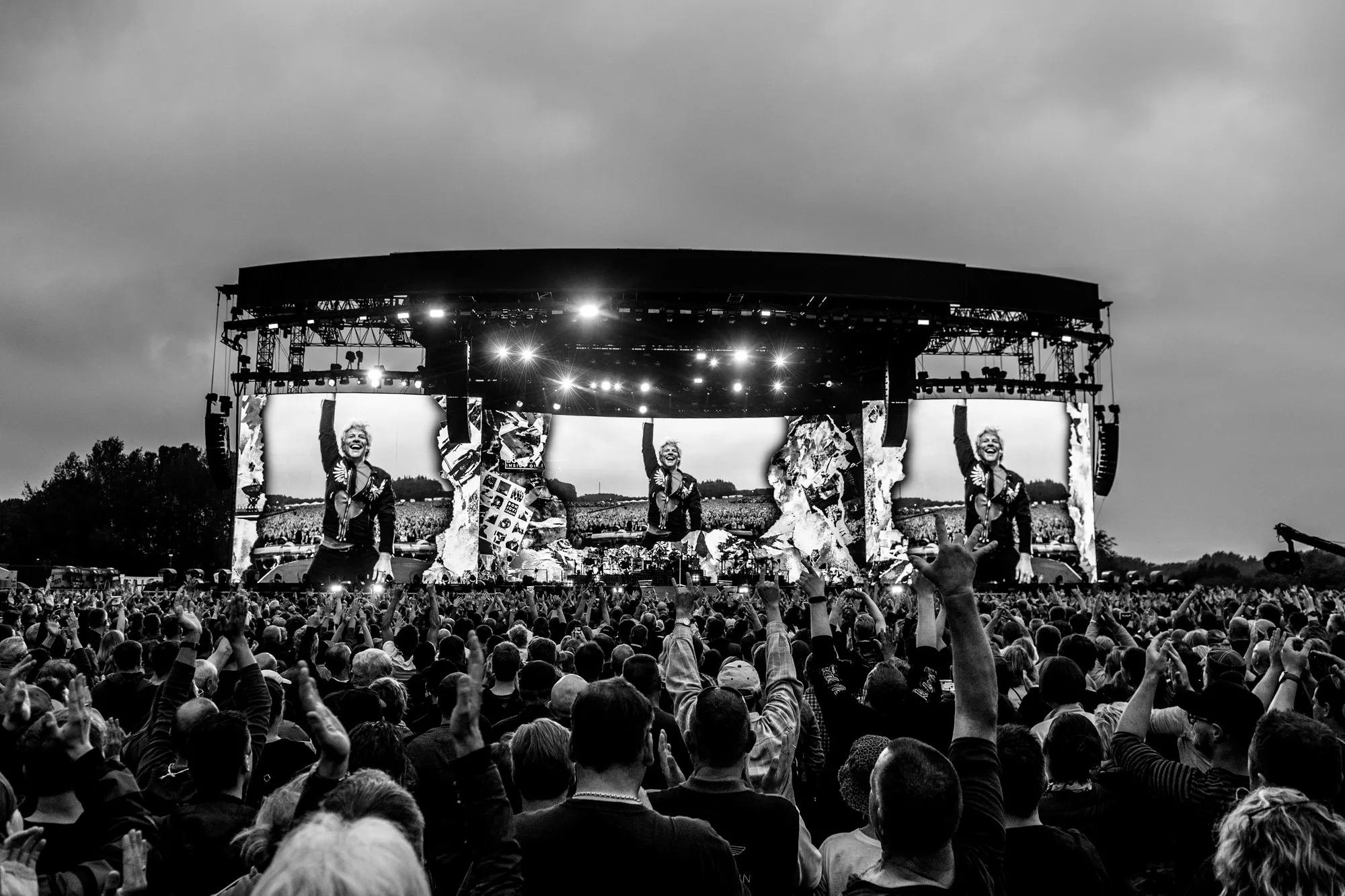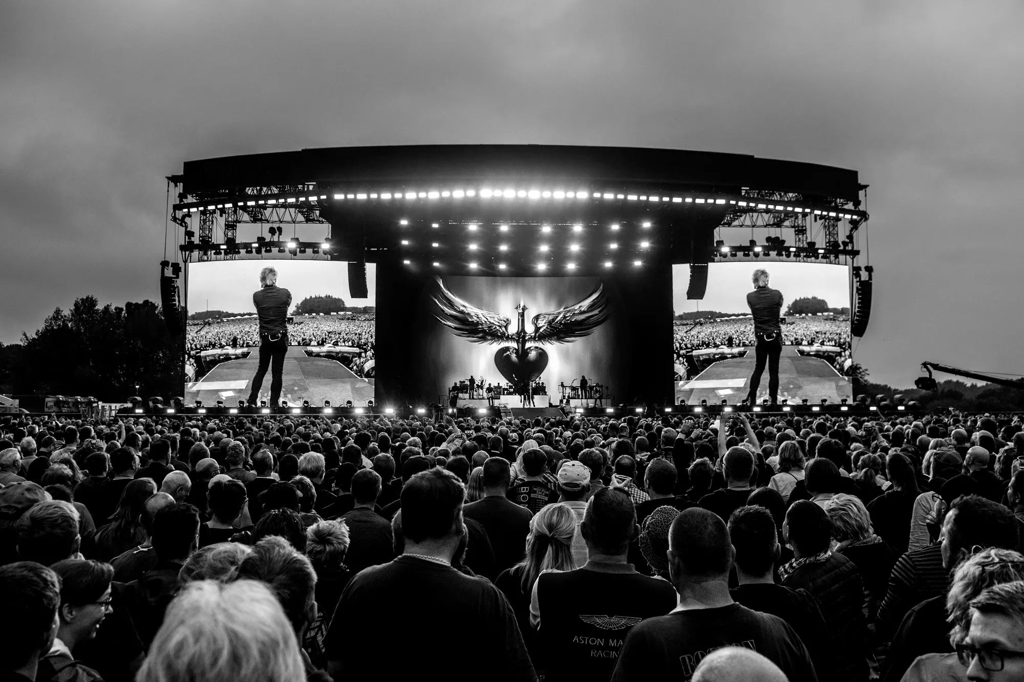 Feedbacken fra en elguitar sender det legendariske britiske rockband Def Leppard på scenen foran de 25.000 veloplagte publikummer, der i aften har fundet vej til Slagmarken i Als’ hovedstad, Sønderborg. Neongrafikken på skærmen bag bandet danner det visuelle bagtæppe,