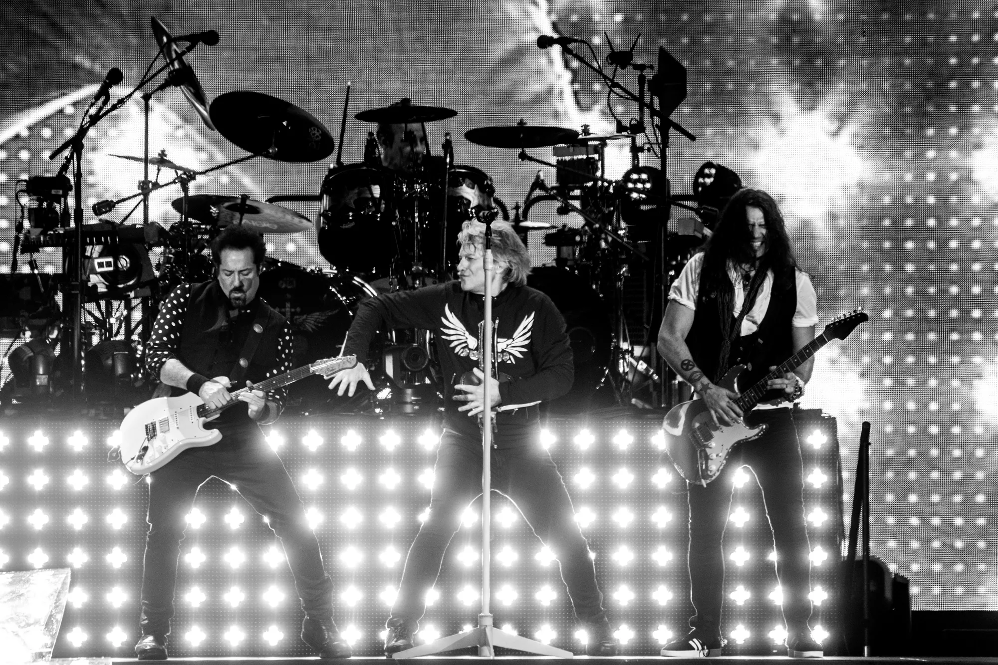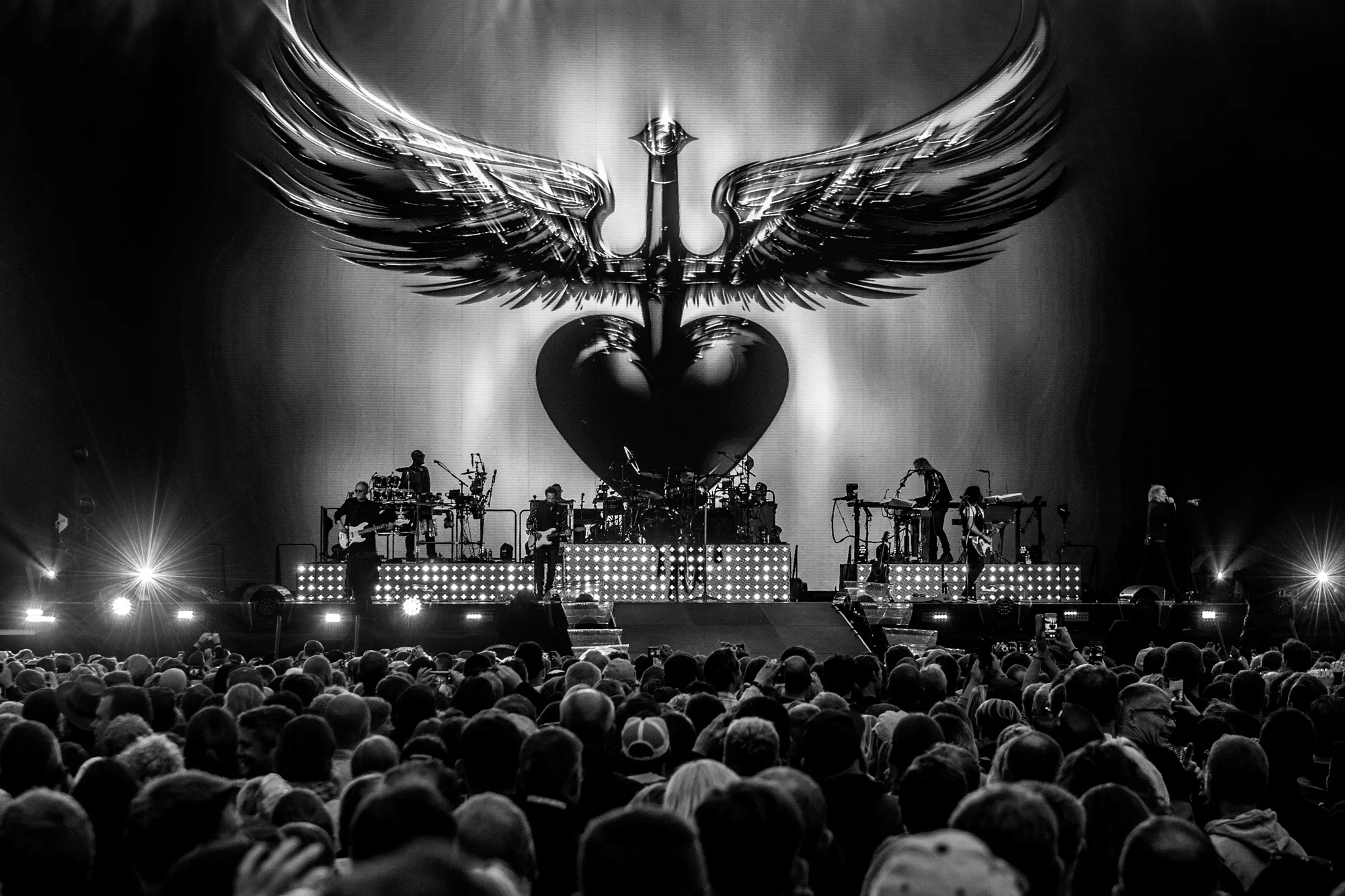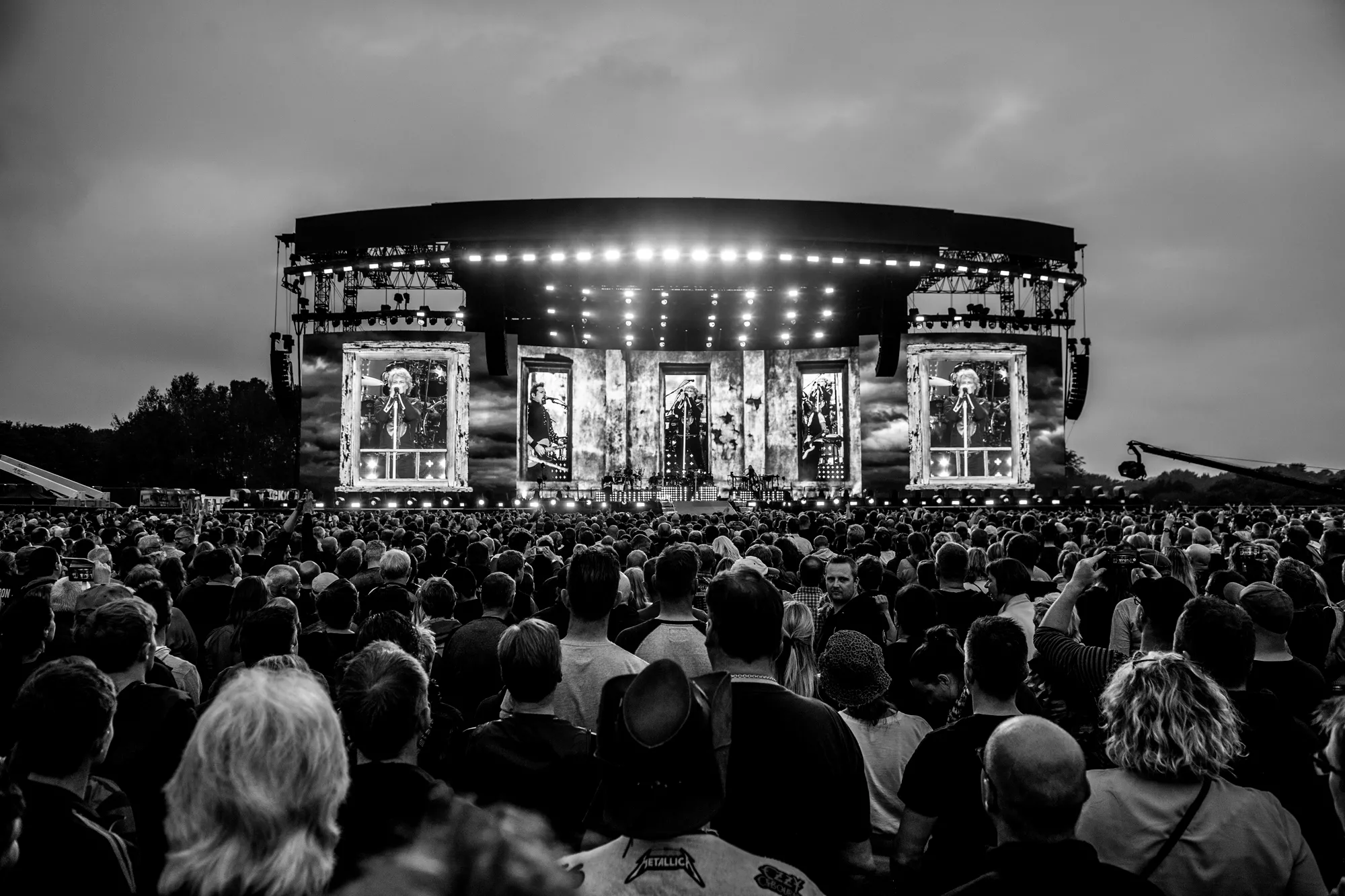 Feedbacken fra en elguitar sender det legendariske britiske rockband Def Leppard på scenen foran de 25.000 veloplagte publikummer, der i aften har fundet vej til Slagmarken i Als’ hovedstad, Sønderborg. Neongrafikken på skærmen bag bandet danner det visuelle bagtæppe,