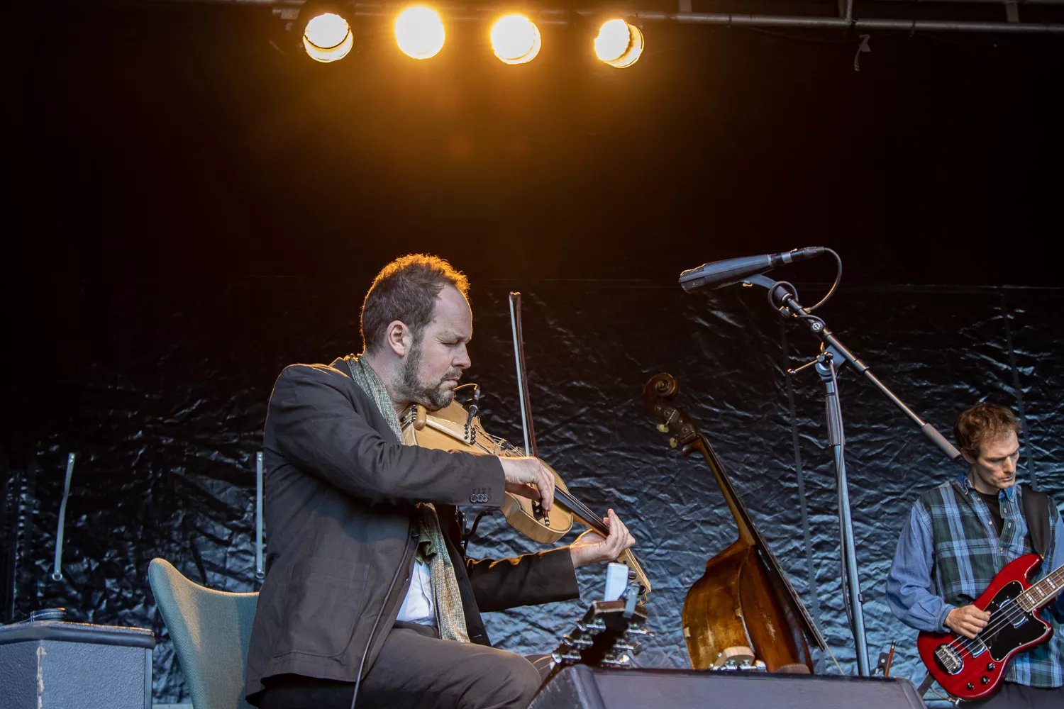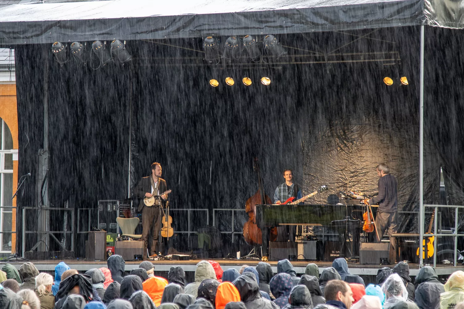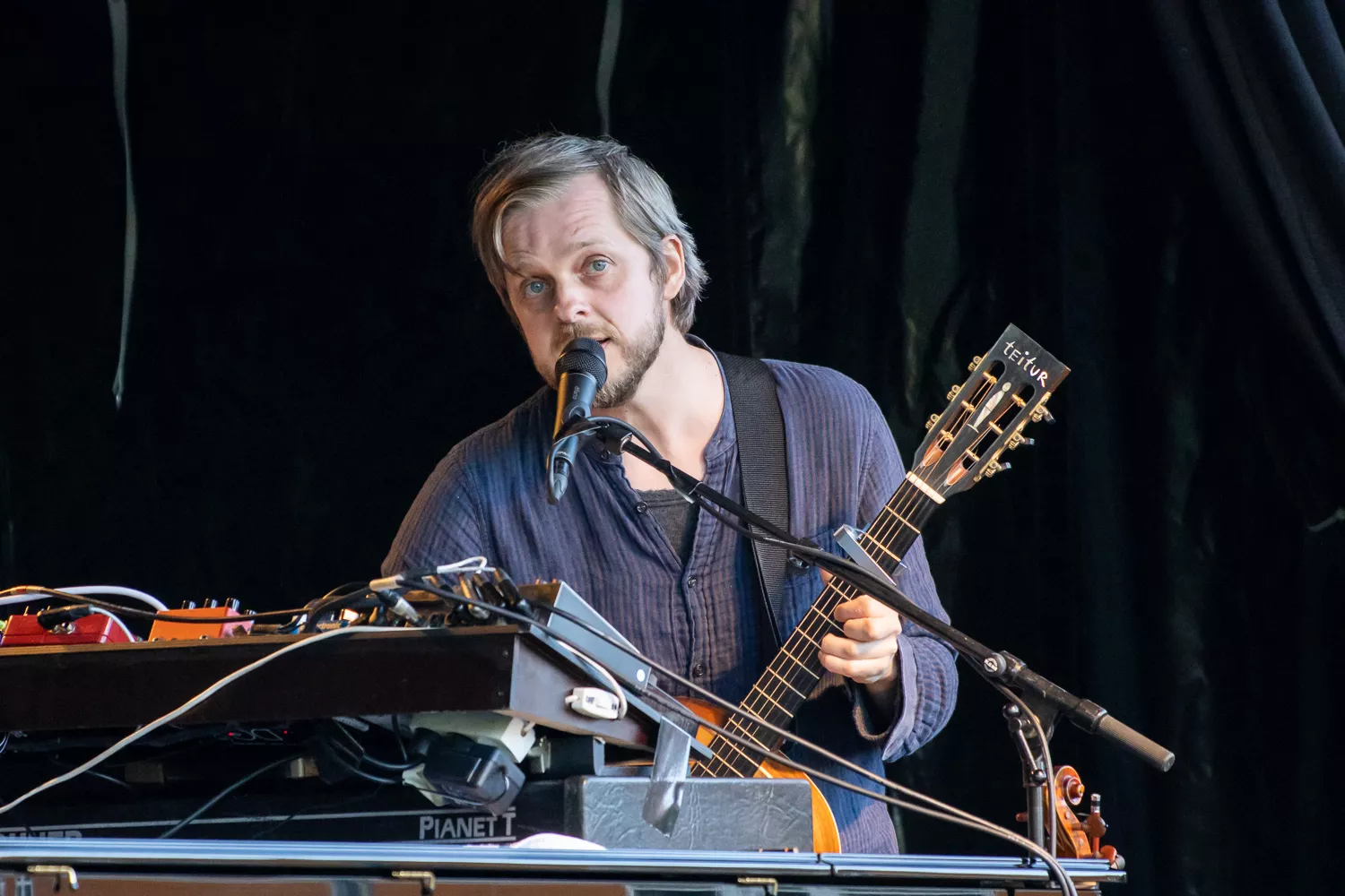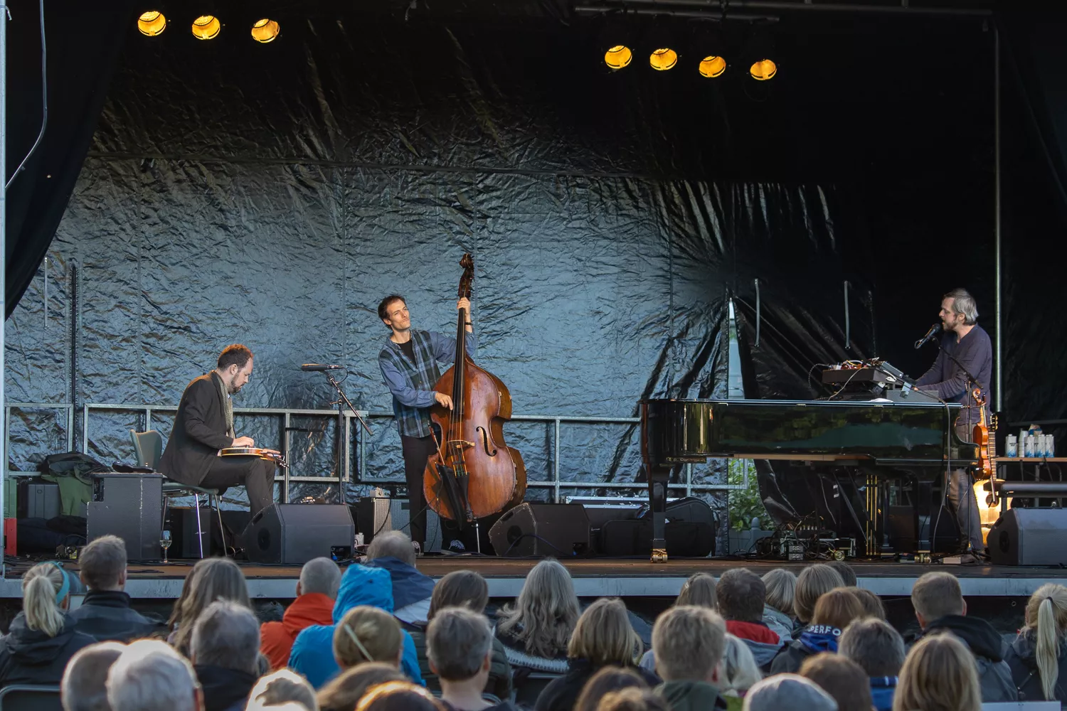 Troubadouren med de færøske rødder indtog scenen flankeret af Jeppe Skovbakke på bas og Gustaf Ljunggren på diverse blæseinstrumenter, guitar, slideguitar, violin m.m. og det netop, som solen afløste regnen. Publikum var ellers fornuftigt klædt på,