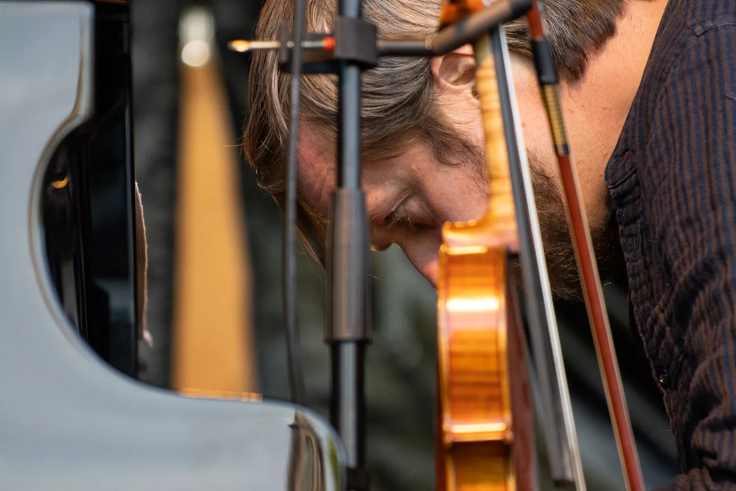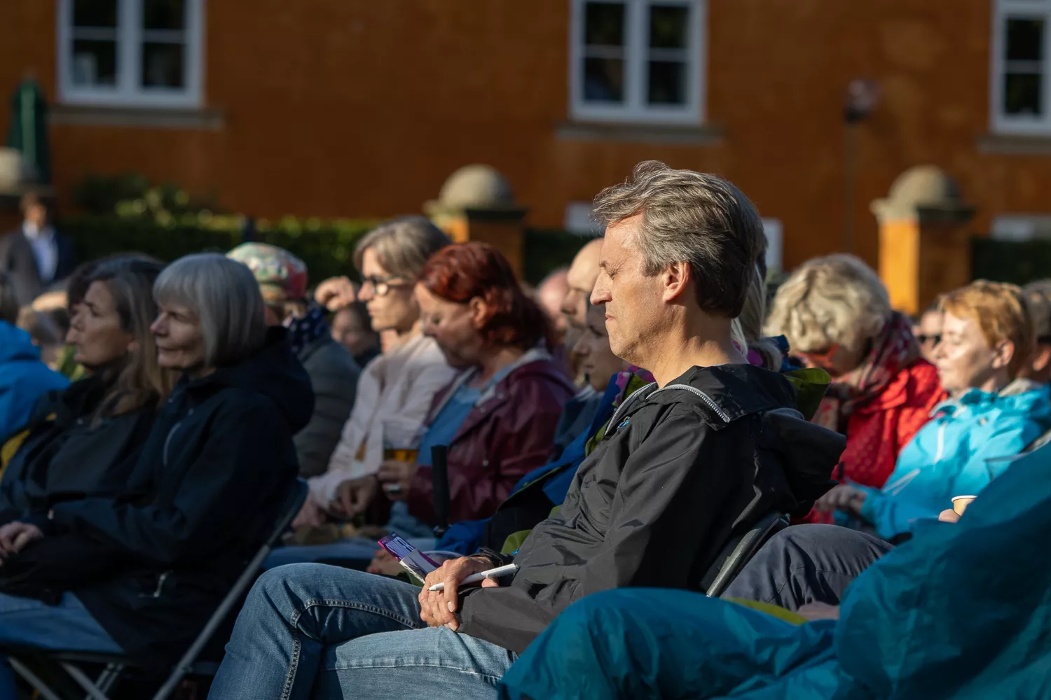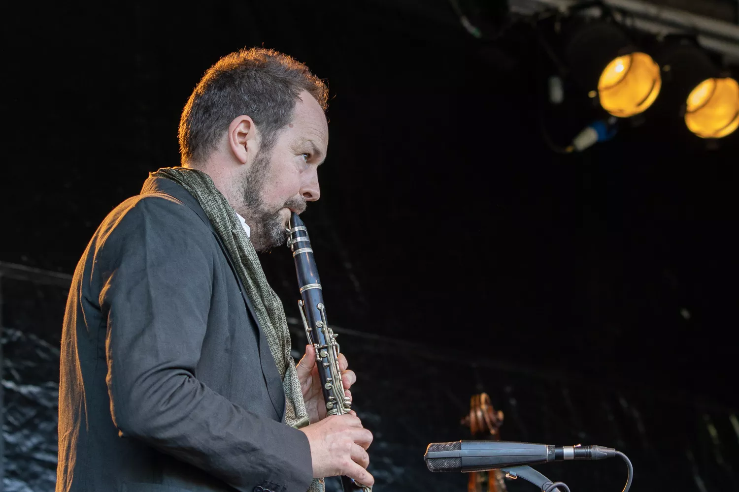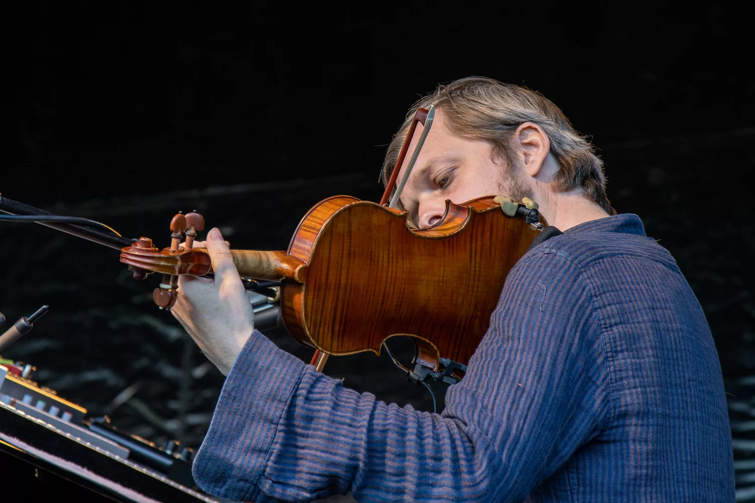 Troubadouren med de færøske rødder indtog scenen flankeret af Jeppe Skovbakke på bas og Gustaf Ljunggren på diverse blæseinstrumenter, guitar, slideguitar, violin m.m. og det netop, som solen afløste regnen. Publikum var ellers fornuftigt klædt på,