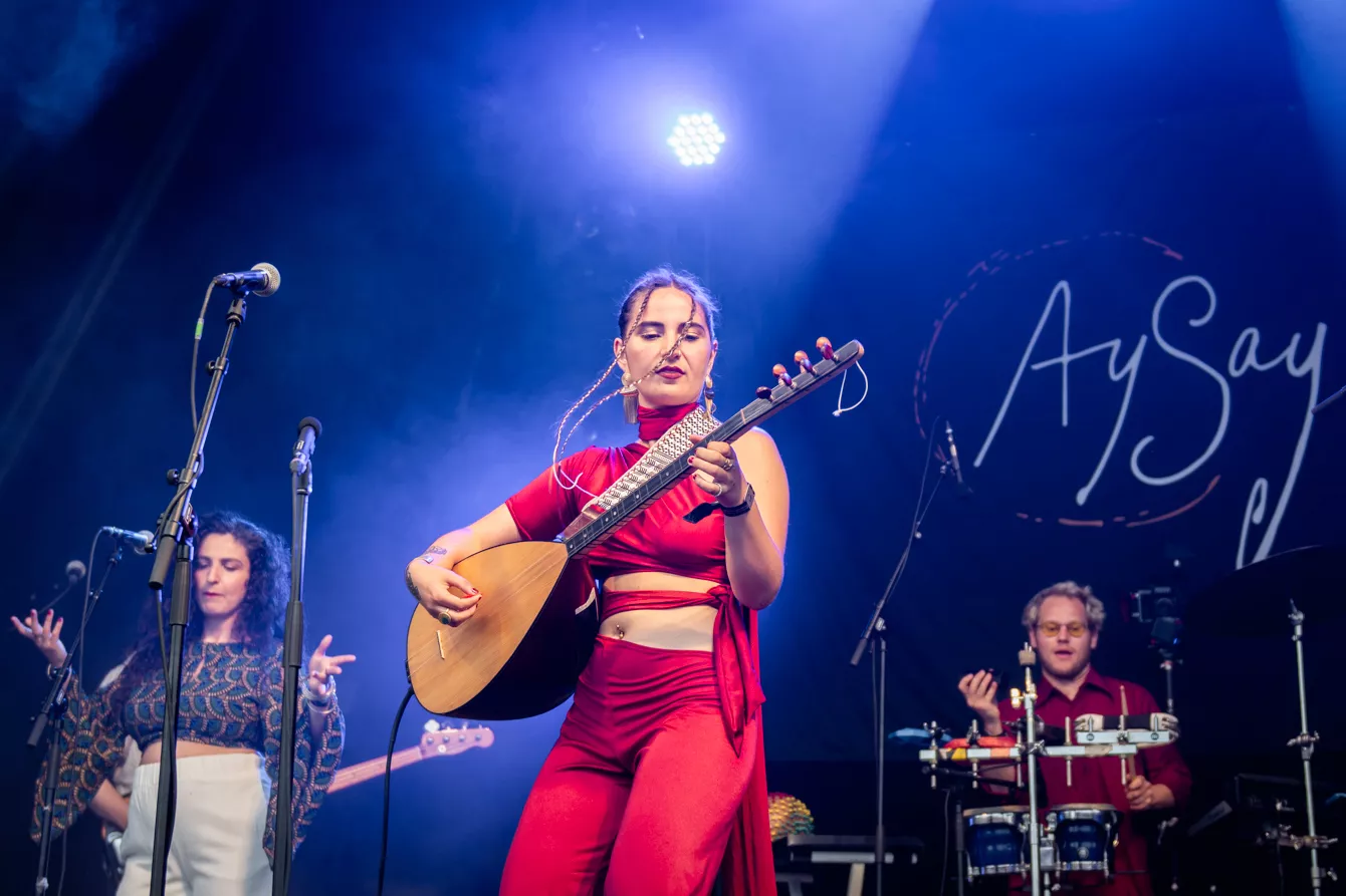 AySay entrerer i seks-personers formation med dobbelt forstærkning bag trommer - både de analoge og de digitale, der kræver ekstra lydforstærkning. Frontfigur Luna Ersahin lader strengene fra det traditionelle saz-instrument klinge.
