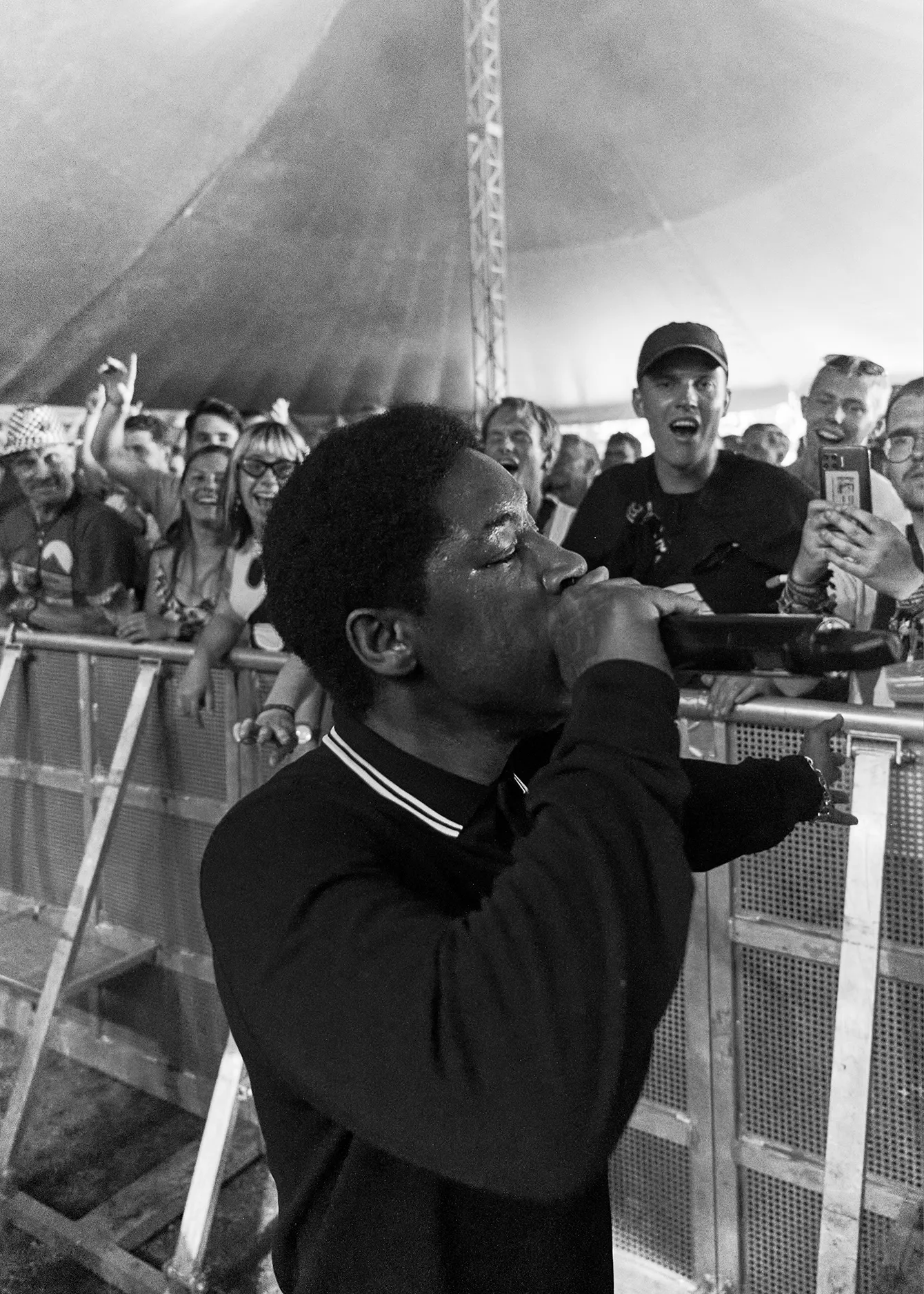 Der var umanerlig god stemning blandt de relativt unge mænd og kvinder, som havde søgt væk fra eftermiddagssolen og ind under teltscenens beroligende skygger. En af festivalens få egentlige rockkoncerter var gjort klar med helt enkle remedier, og fadøl skvulpede rundt omkring hos ivrigt hydrerende