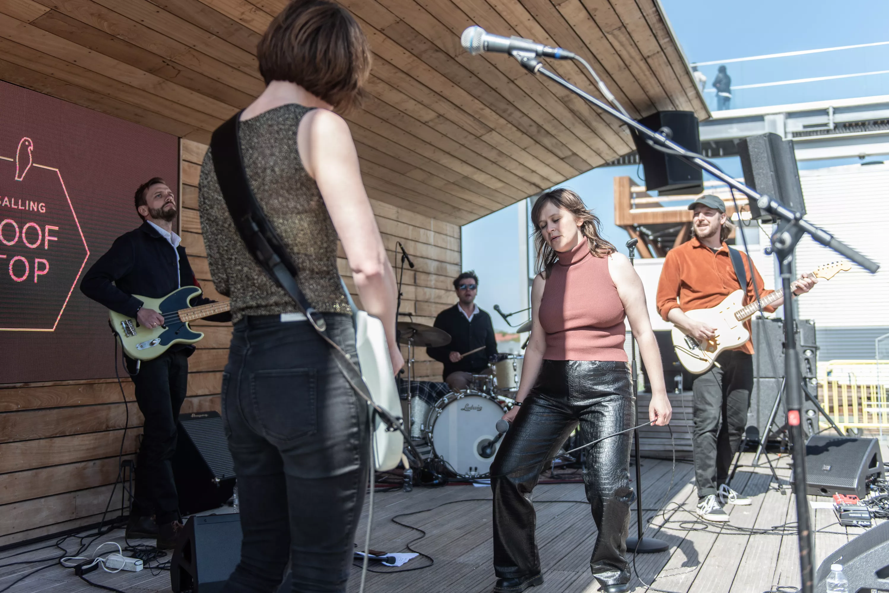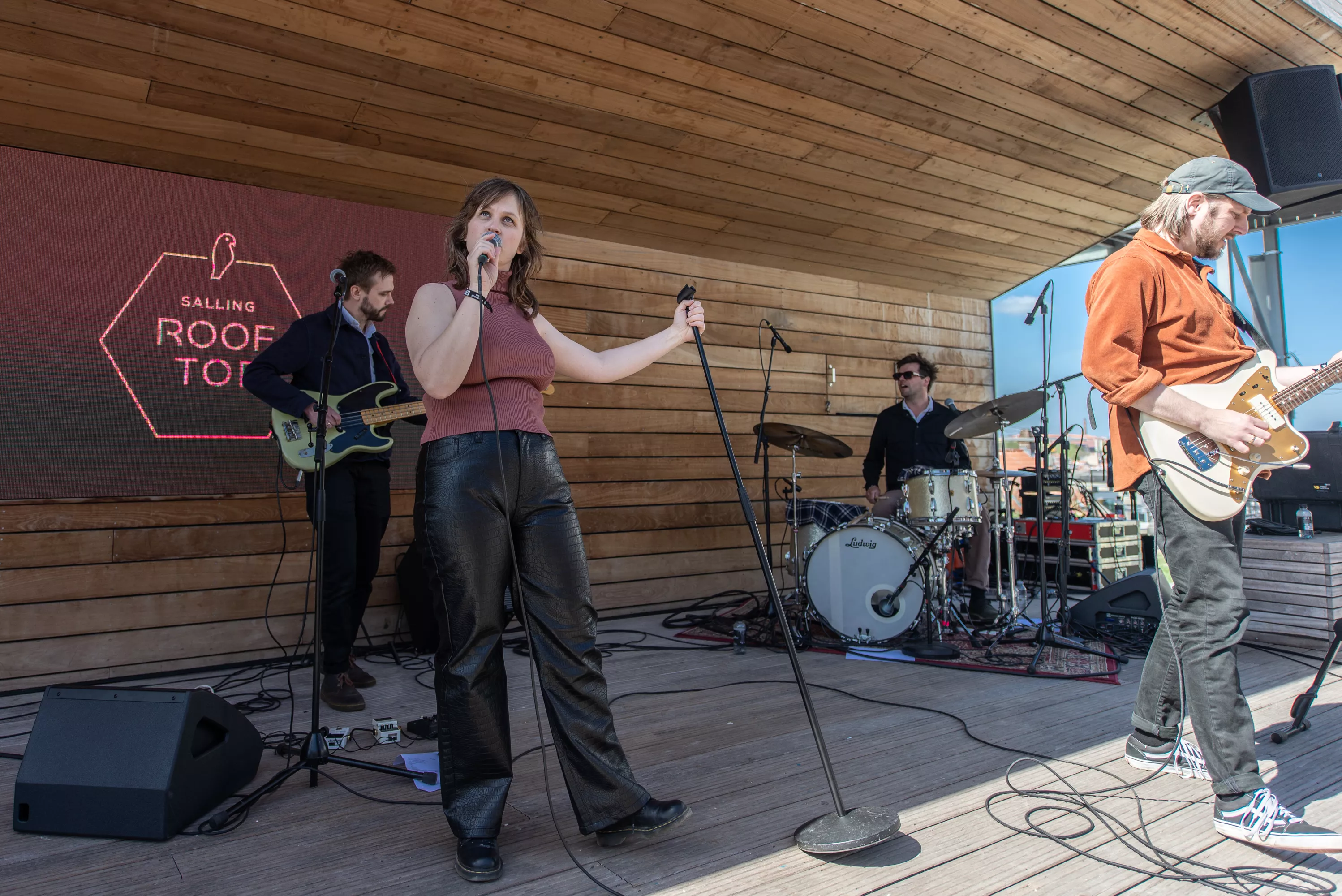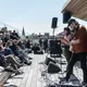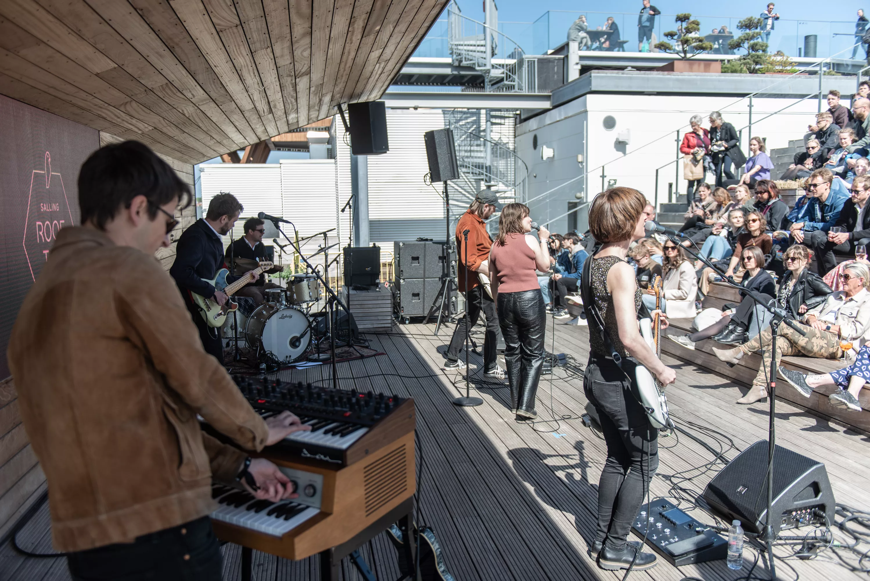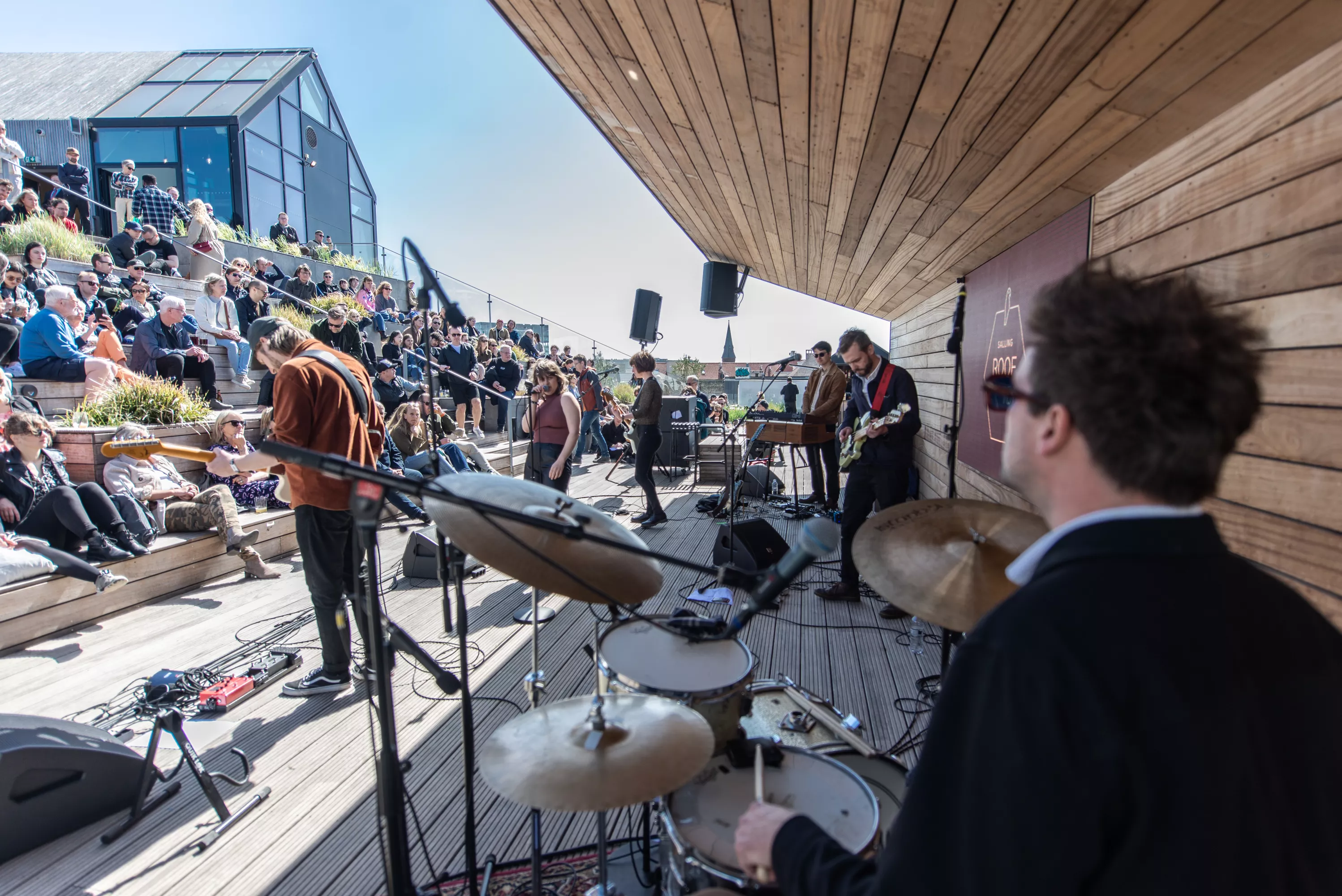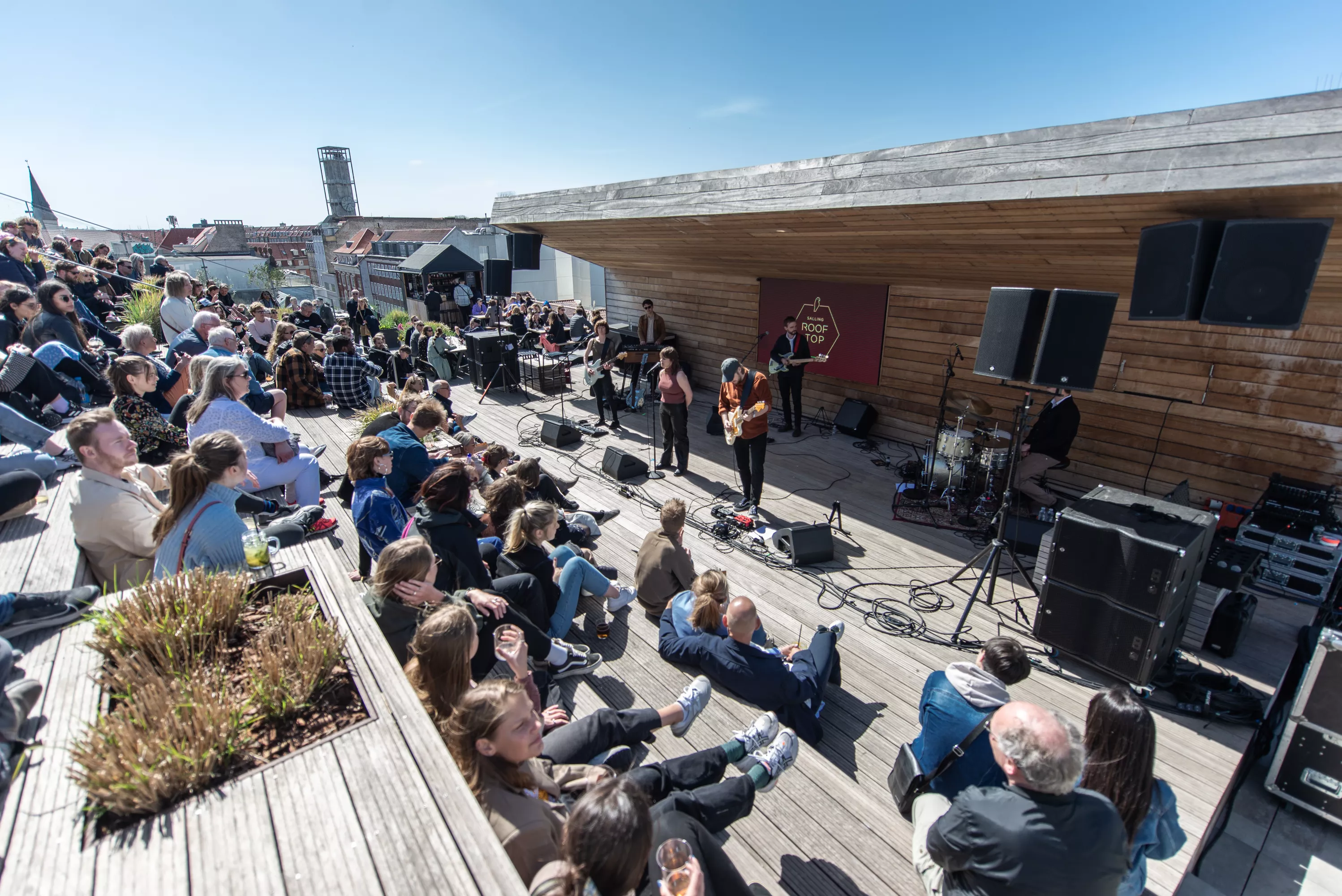 Blandt de mange scener på Spot Festival er Salling Rooftop i sjette etages højde den absolut højst beliggende, under åben himmel og med smuk udsigt ud over Aarhus Midtby. Da vejrguderne heldigvis er med festivalen i år, og der i øvrigt også er adgang på taget uden billet, er der ganske velbesøgt allerede