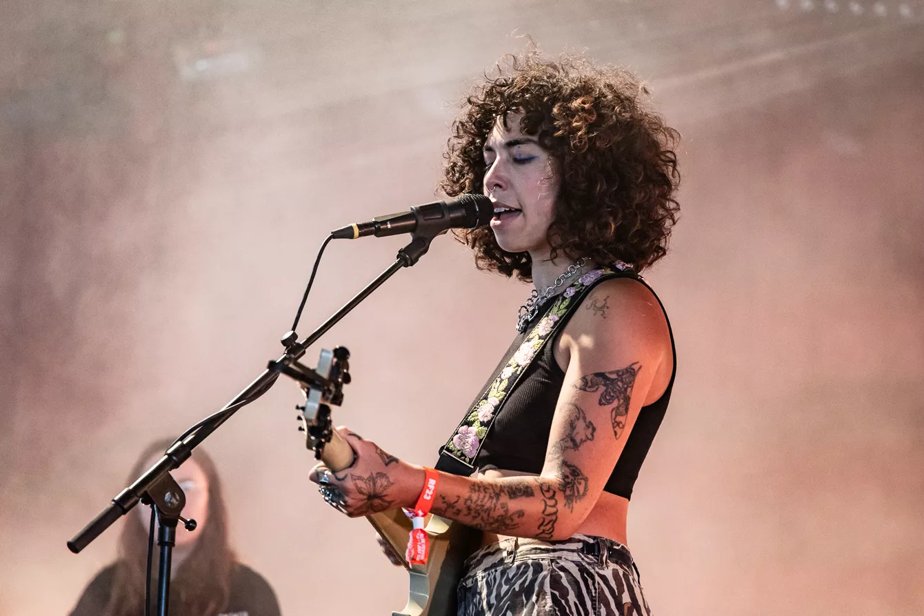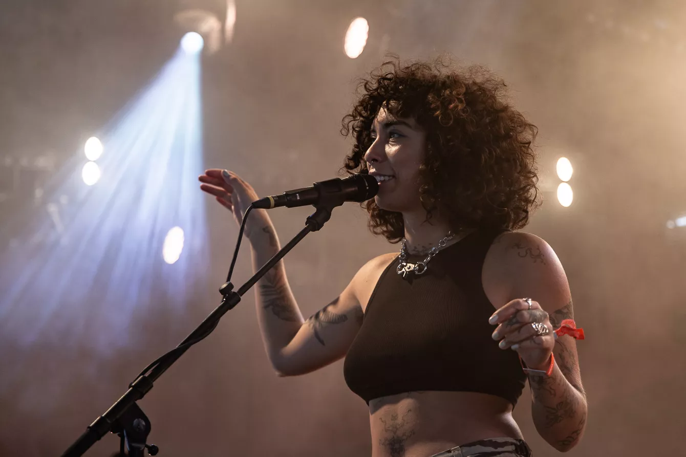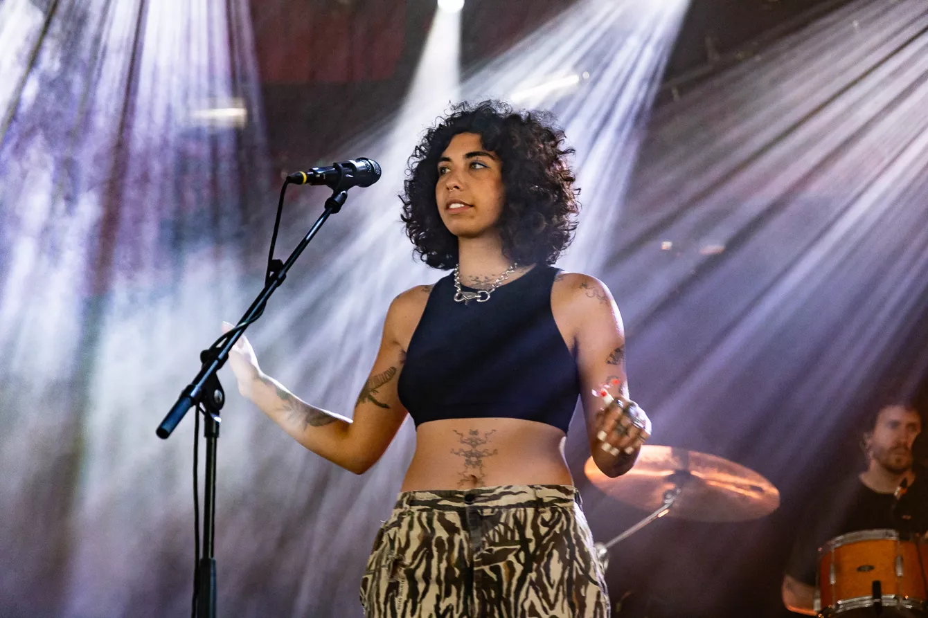 Pladsen foran Roskilde Festivals nye scene Gaia er knap halvt fyldt, da den amerikansk-brasilianske indierock-artist Indigo de Souza skal debutere på dansk jord. Indigo de Souza skabte røre i musik-andedammen, da hun i 2021 udgav albummet Any Shape You Take, som fik positive anmeldelser fra