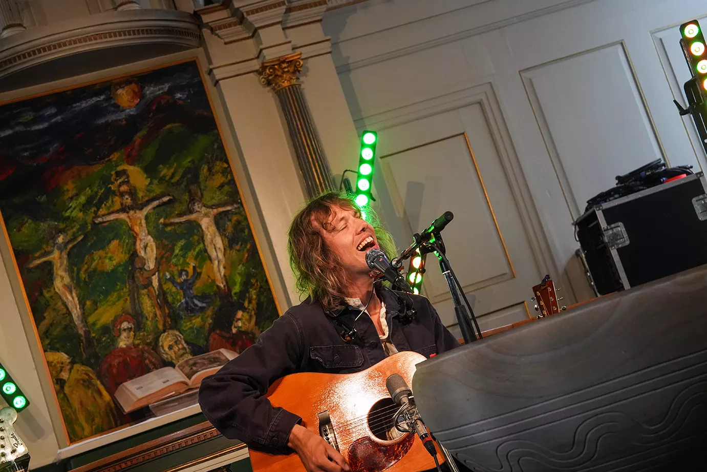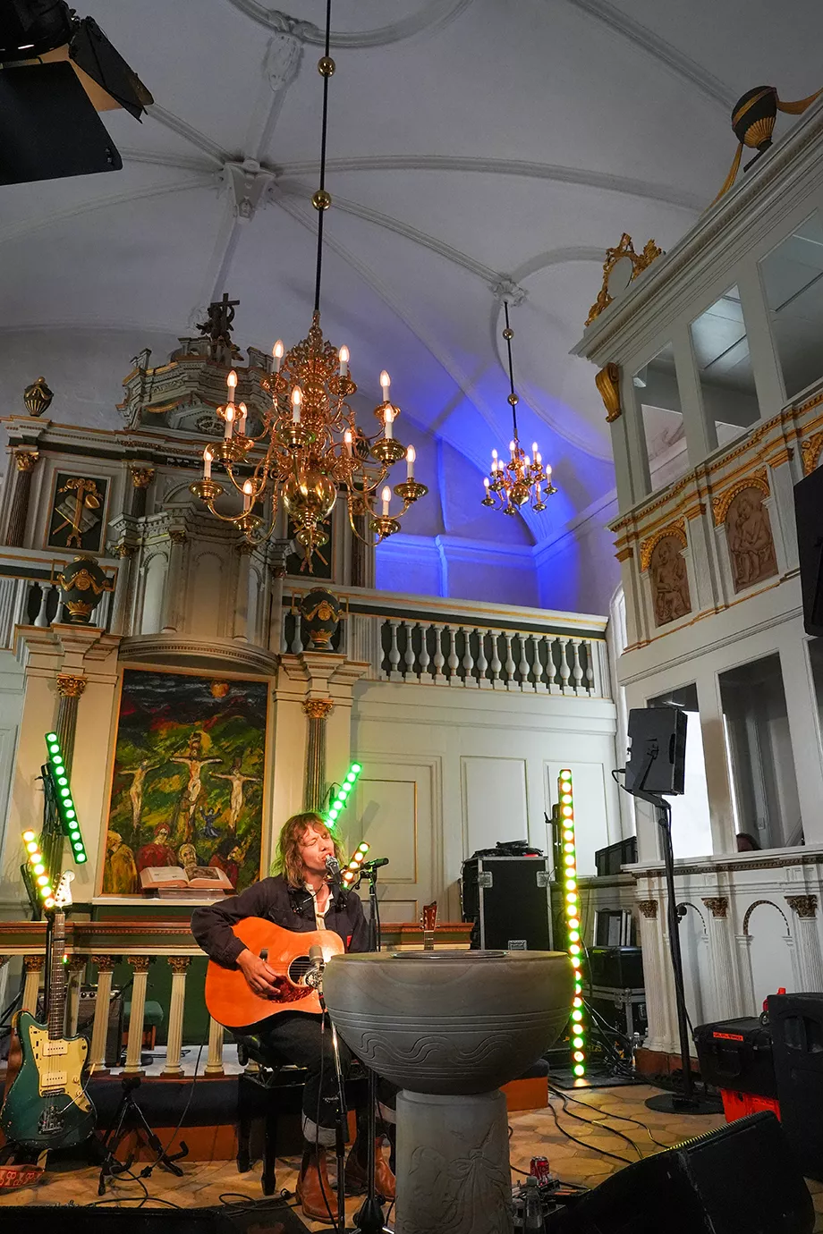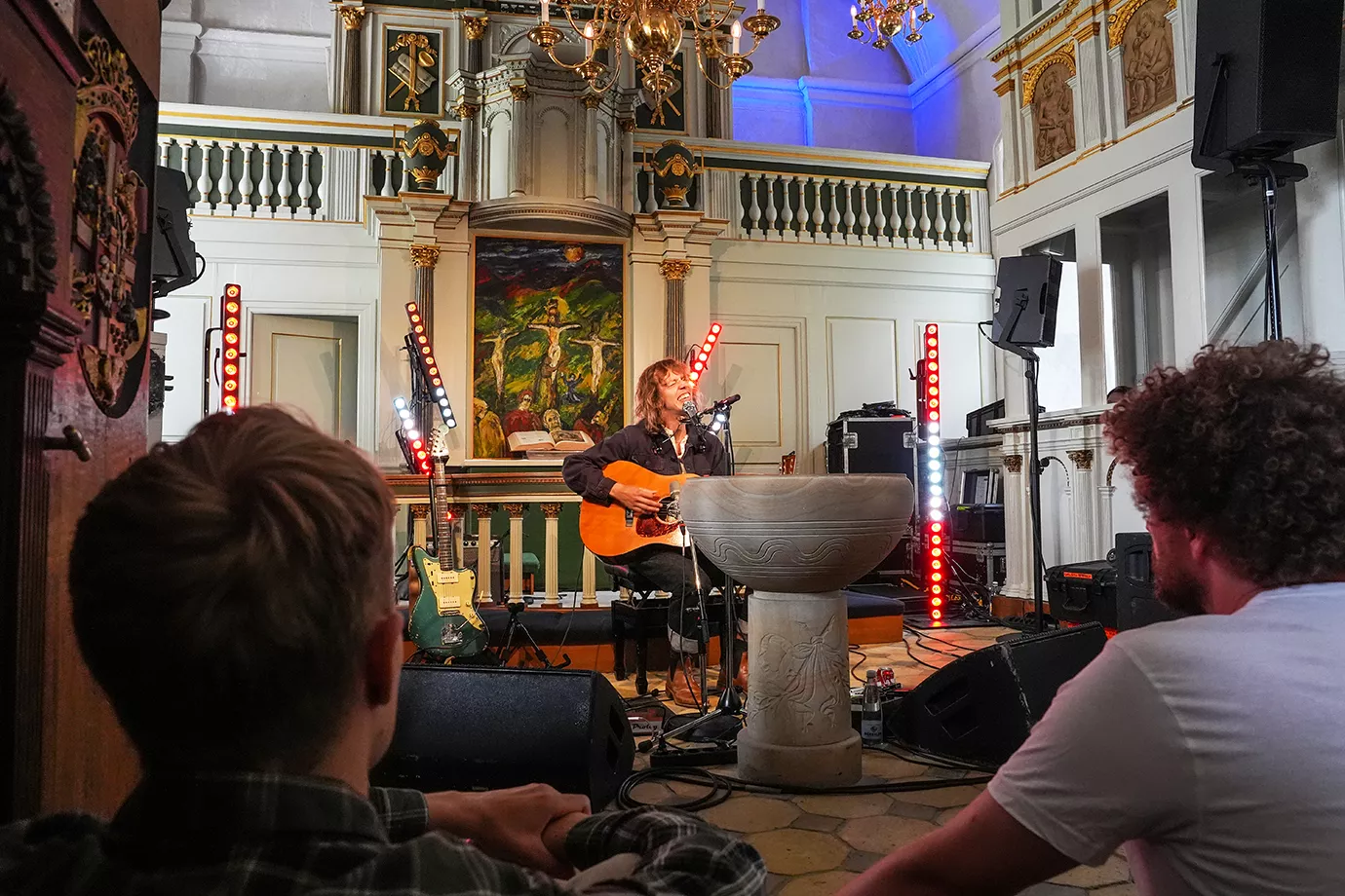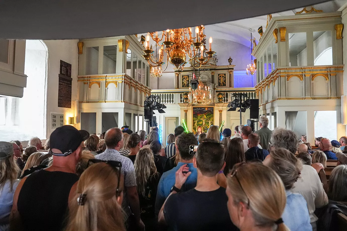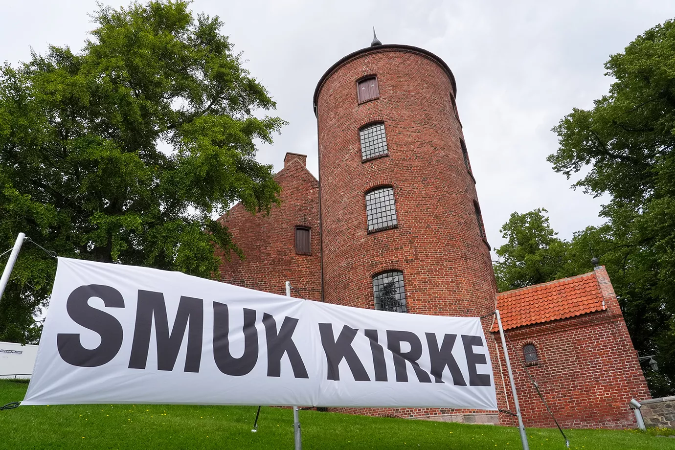 500 meter fra indgangen til Smukfest, forbi de kæmpestore sølvbjørnedyr, ligger Slotskirken. Det er ikke en almindelig gudstjeneste, den inviterer til først på eftermiddagen torsdag i Smuk-ugen. Jeg kan heller ikke forestille mig, at der står langt over de 200 mennesker, der er plads til i kirken,