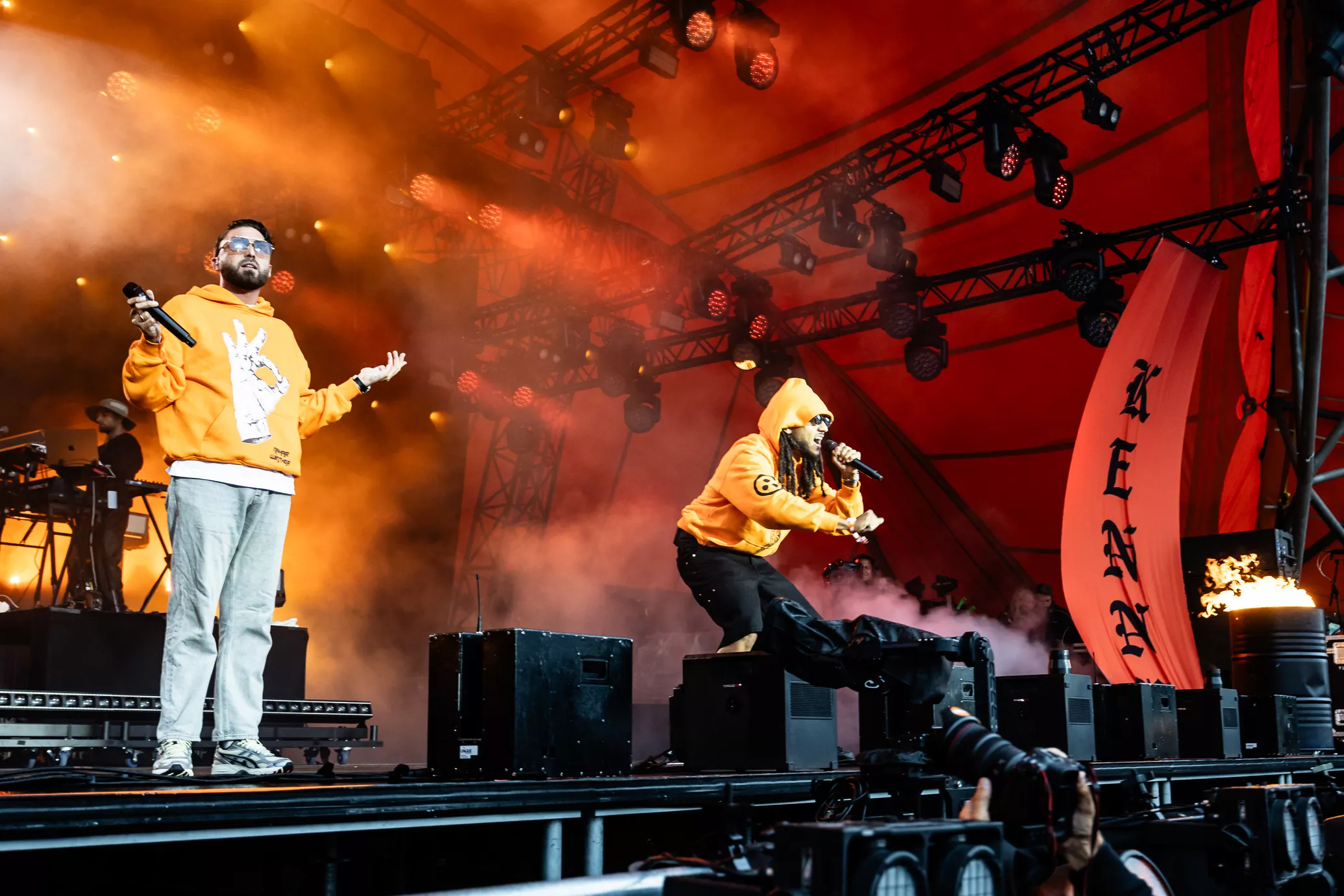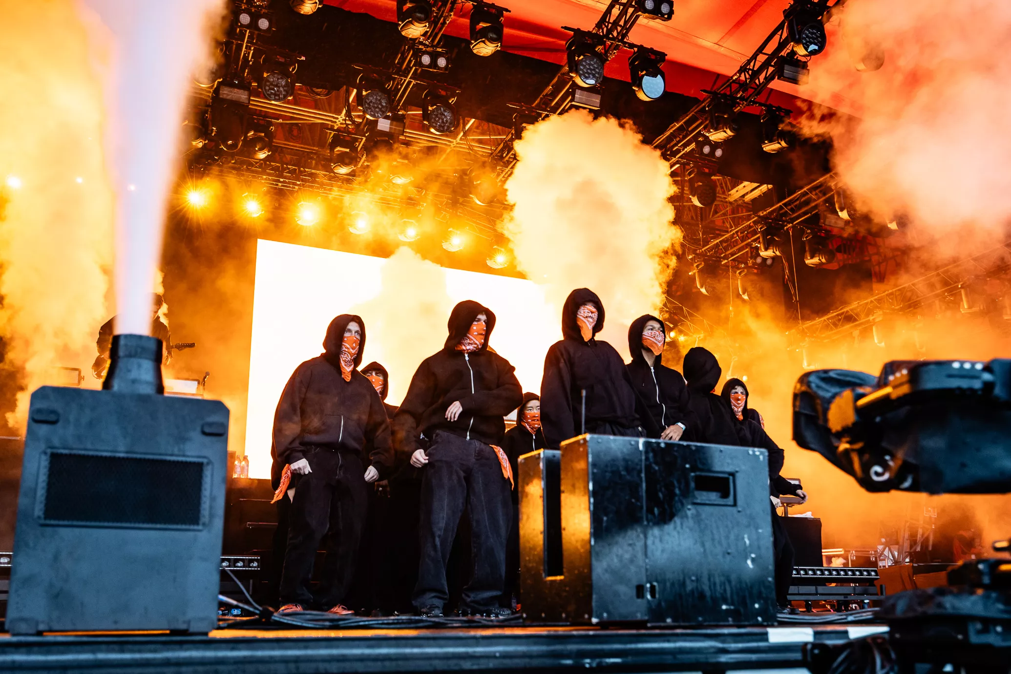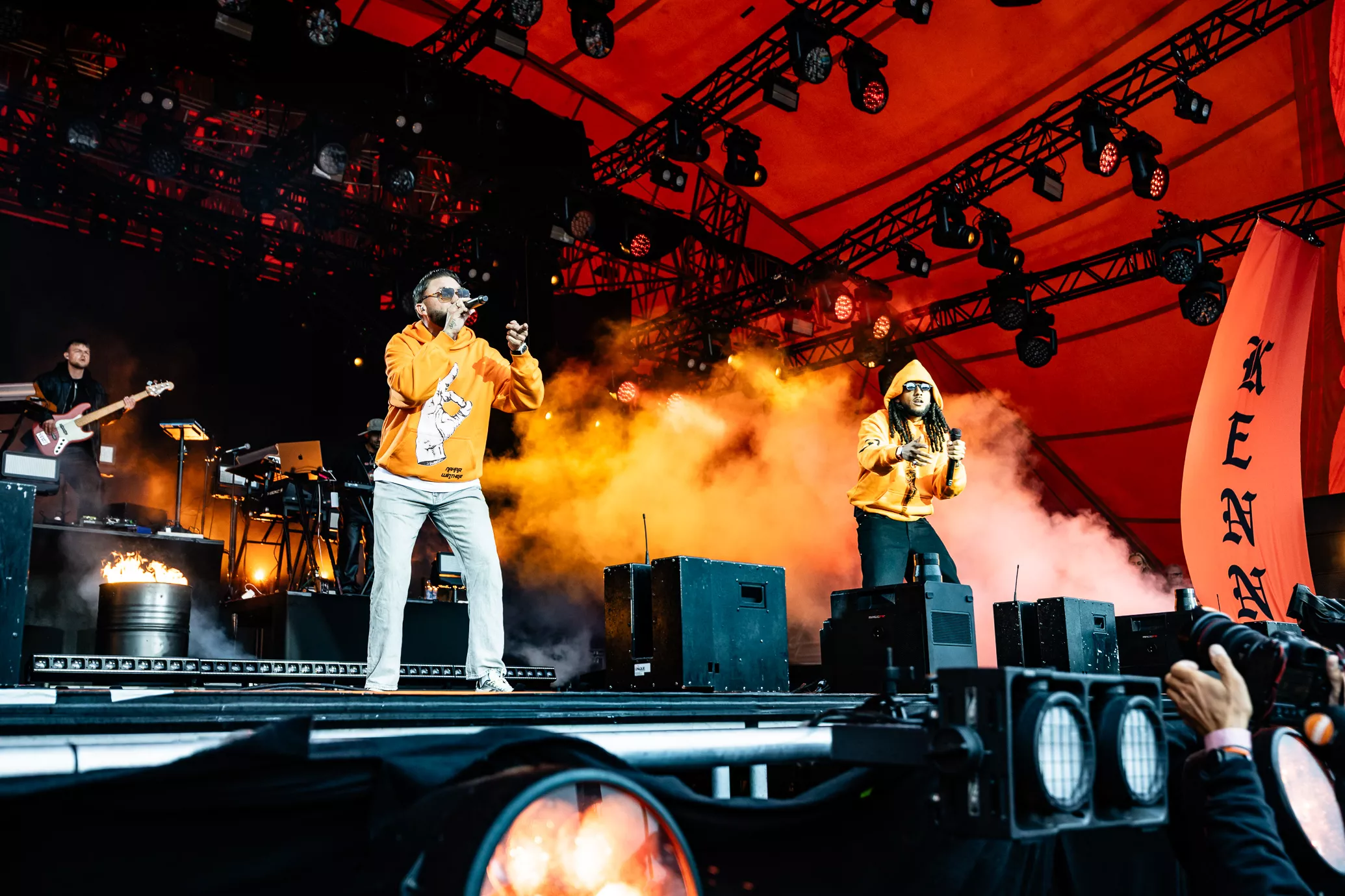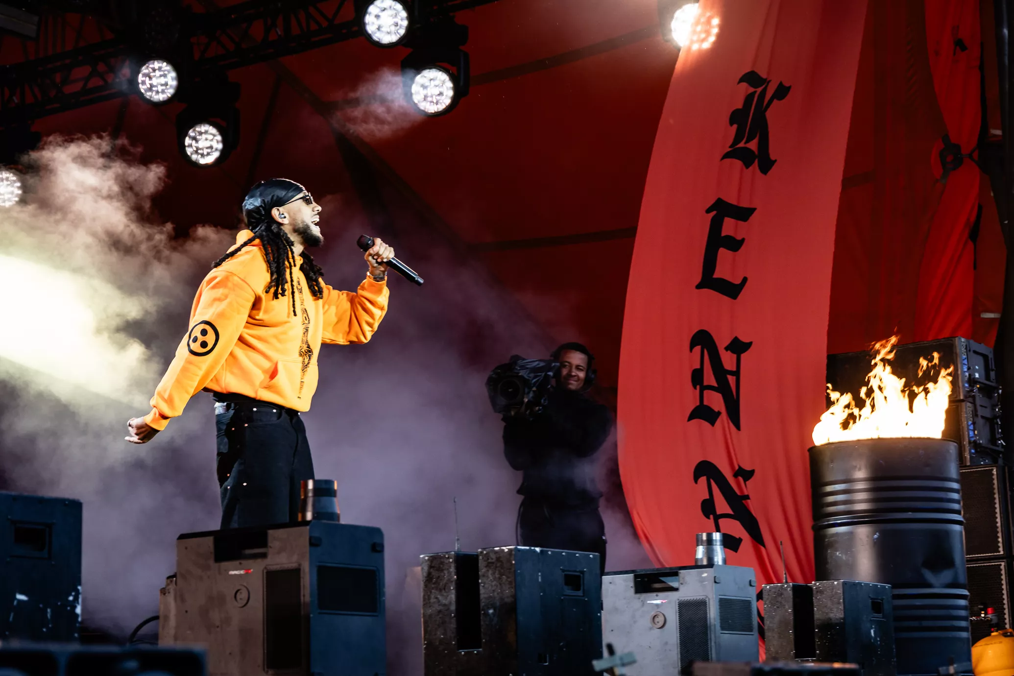 De rustne olietønder på scenen testes af med ild, da jeg træder ind i pitten i selskab med et hav af tændte unge mennesker. To aflange orange og sorte bannere med "Kenny" skrevet horisontalt på dem blæser i vinden i hver sin side af scenen. Jeg falder i snak med et par gutter foran mig, som fortæller,