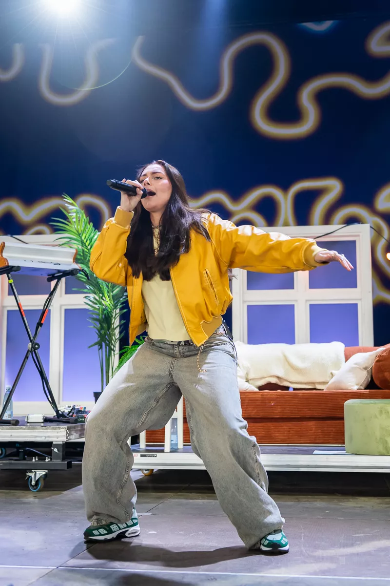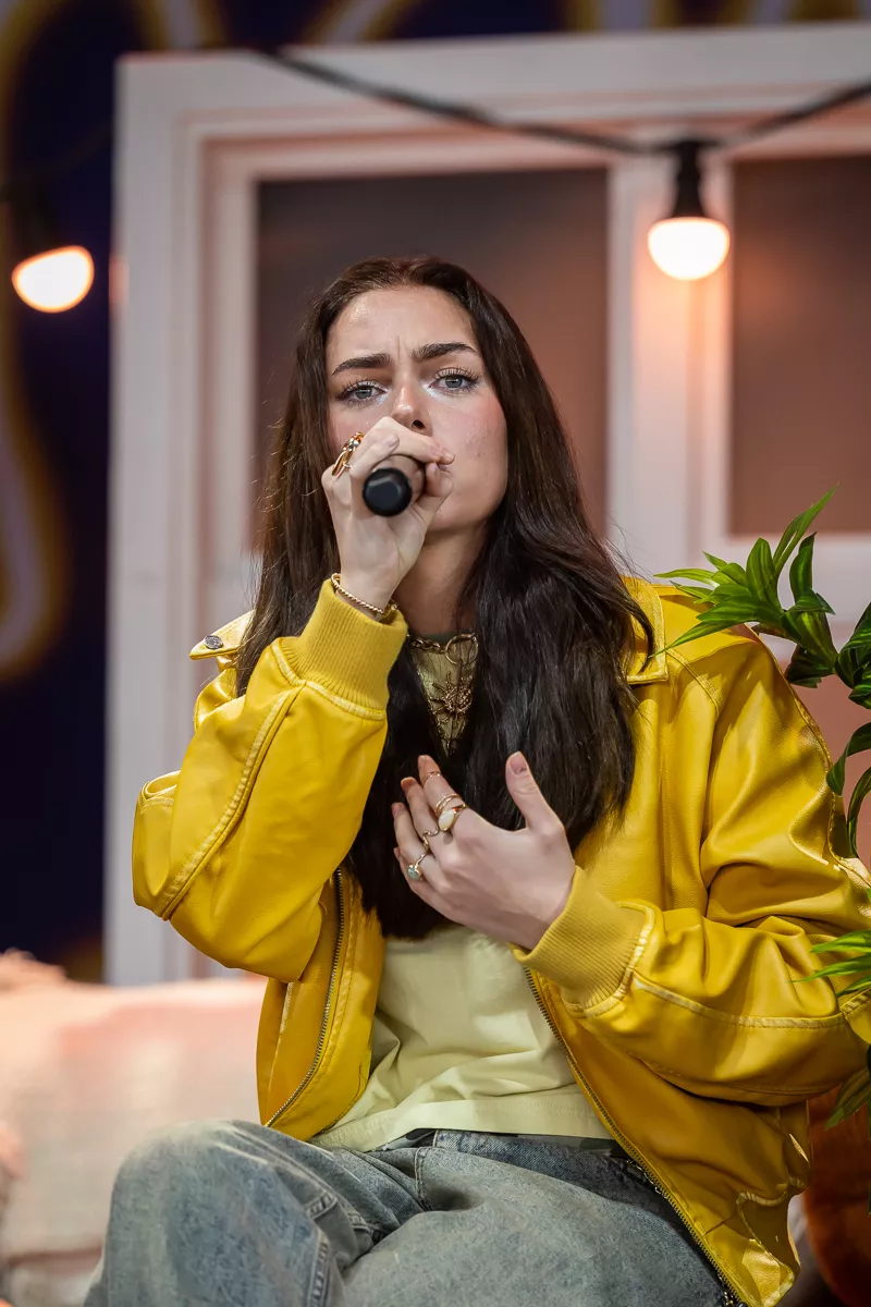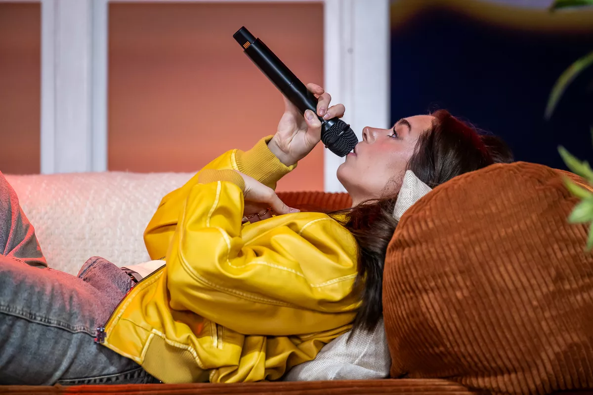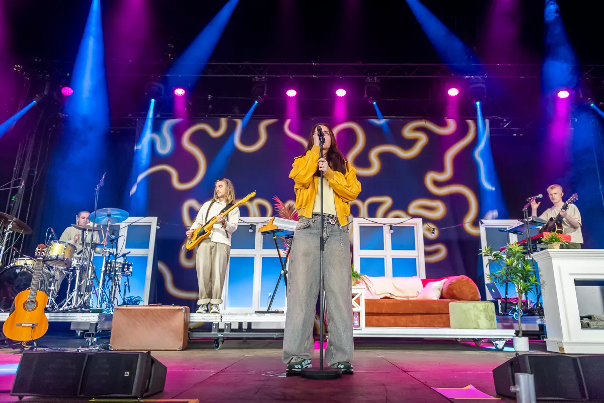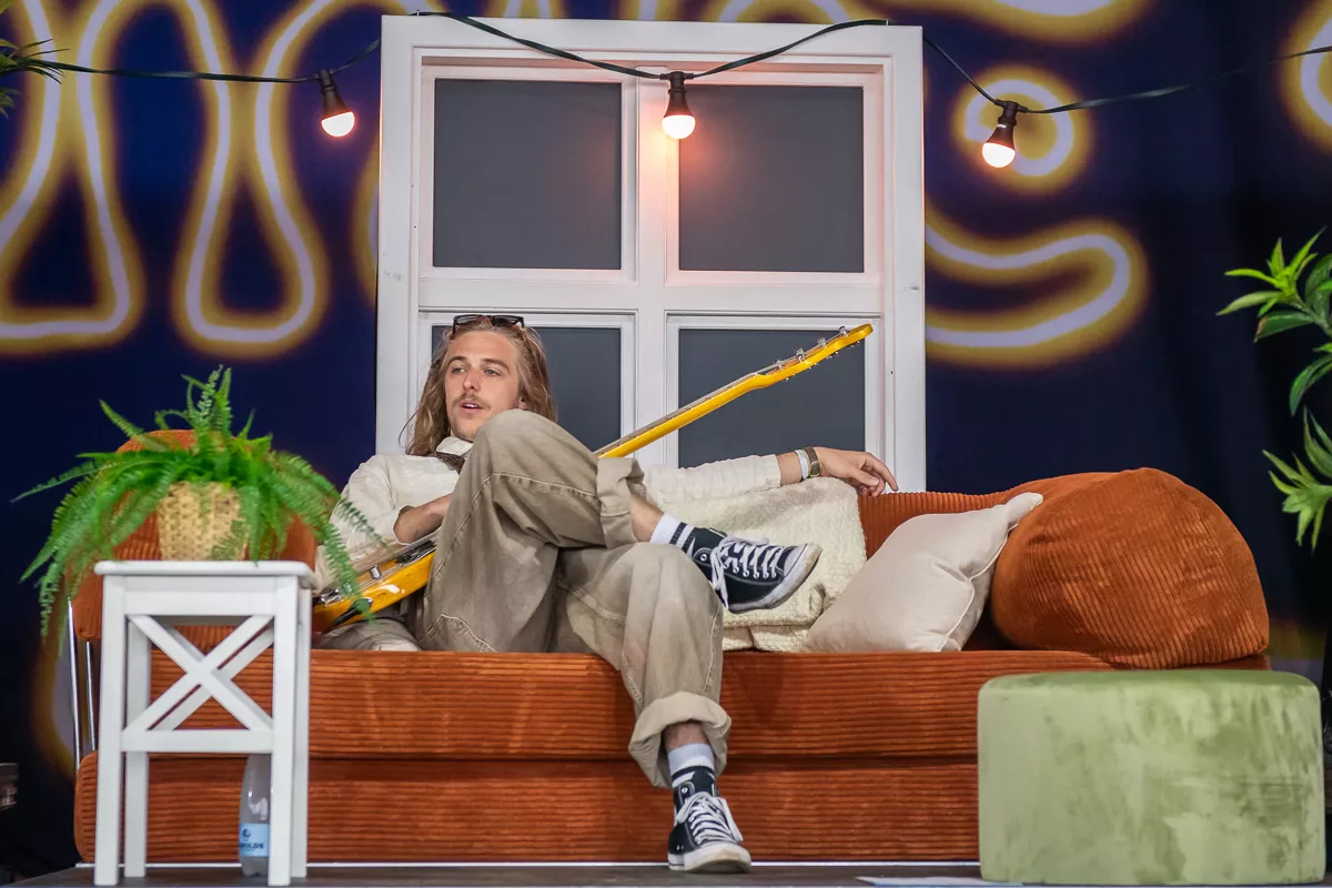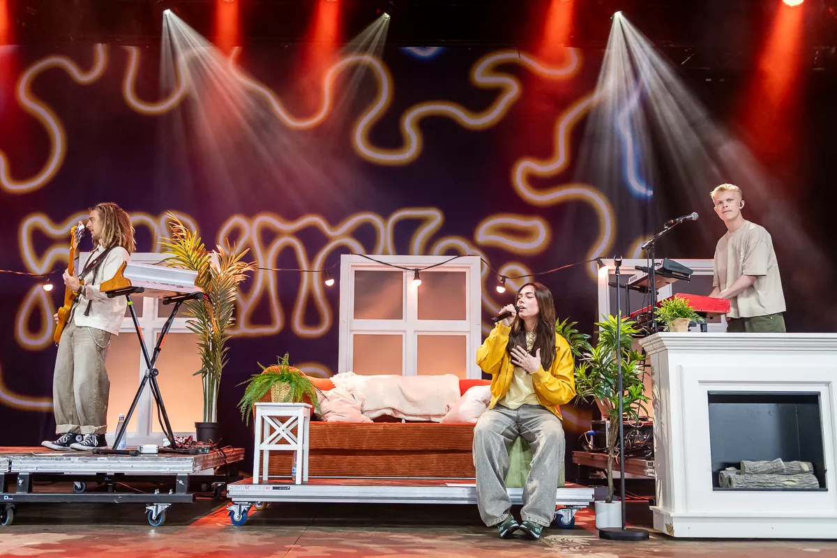 Det var på alle måder indbydende at trække ind under teltscenen, hvor scenen var klædt i noget, der ligner en kulisse fra den lokale teaterforenings seneste lystspil. Sofie Linde dukkede frem som konferencier og havde på det givne tidspunkt indøvet publikum i en hyggelig besværgelse om hensynsfuld