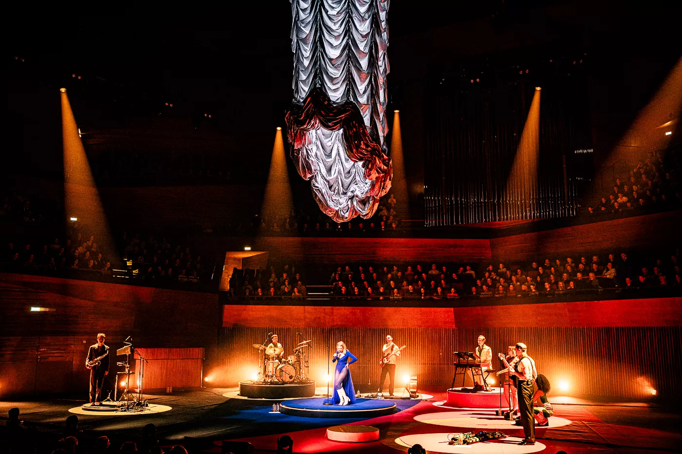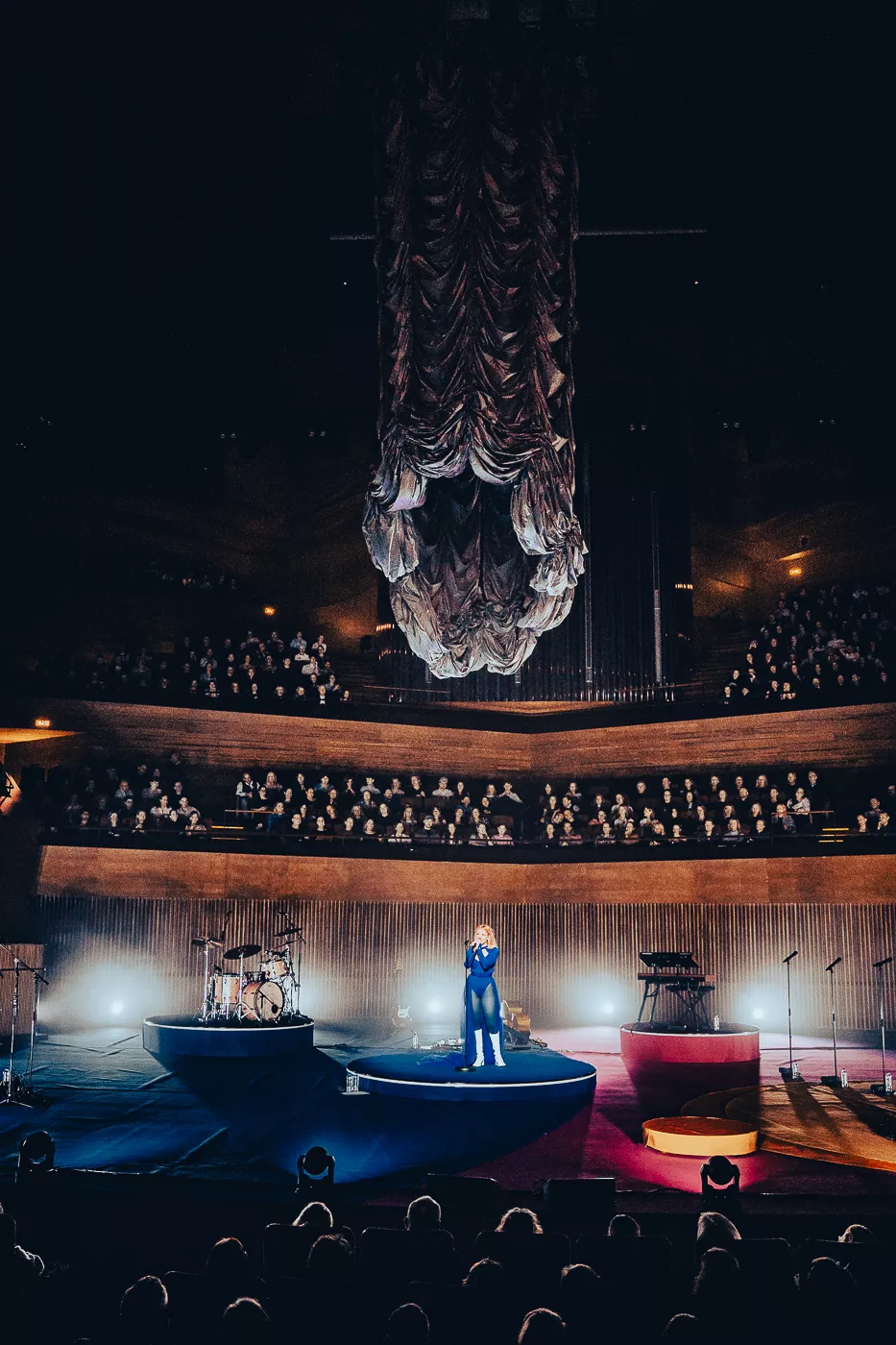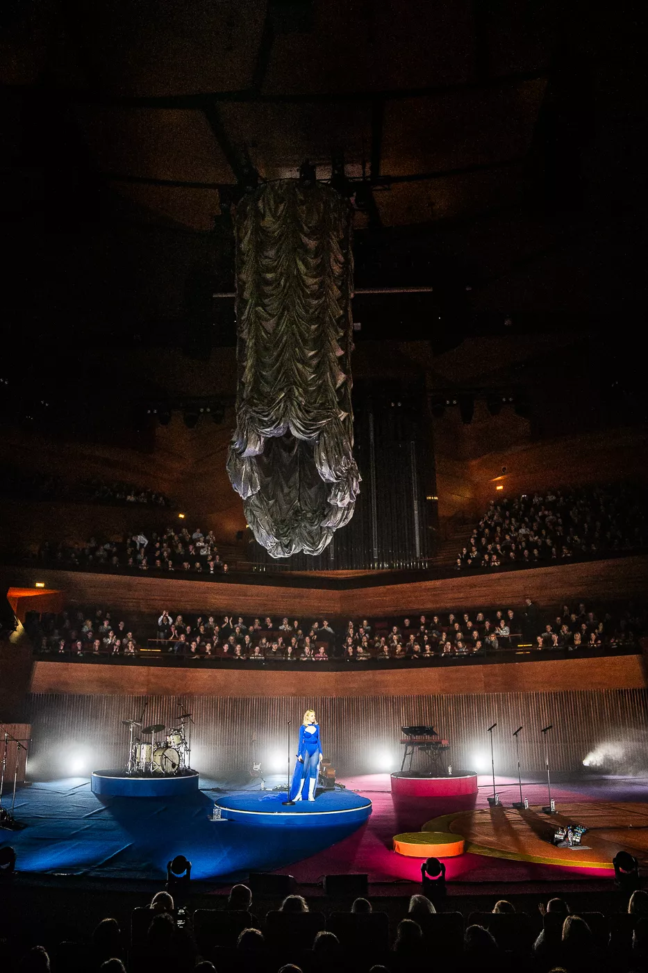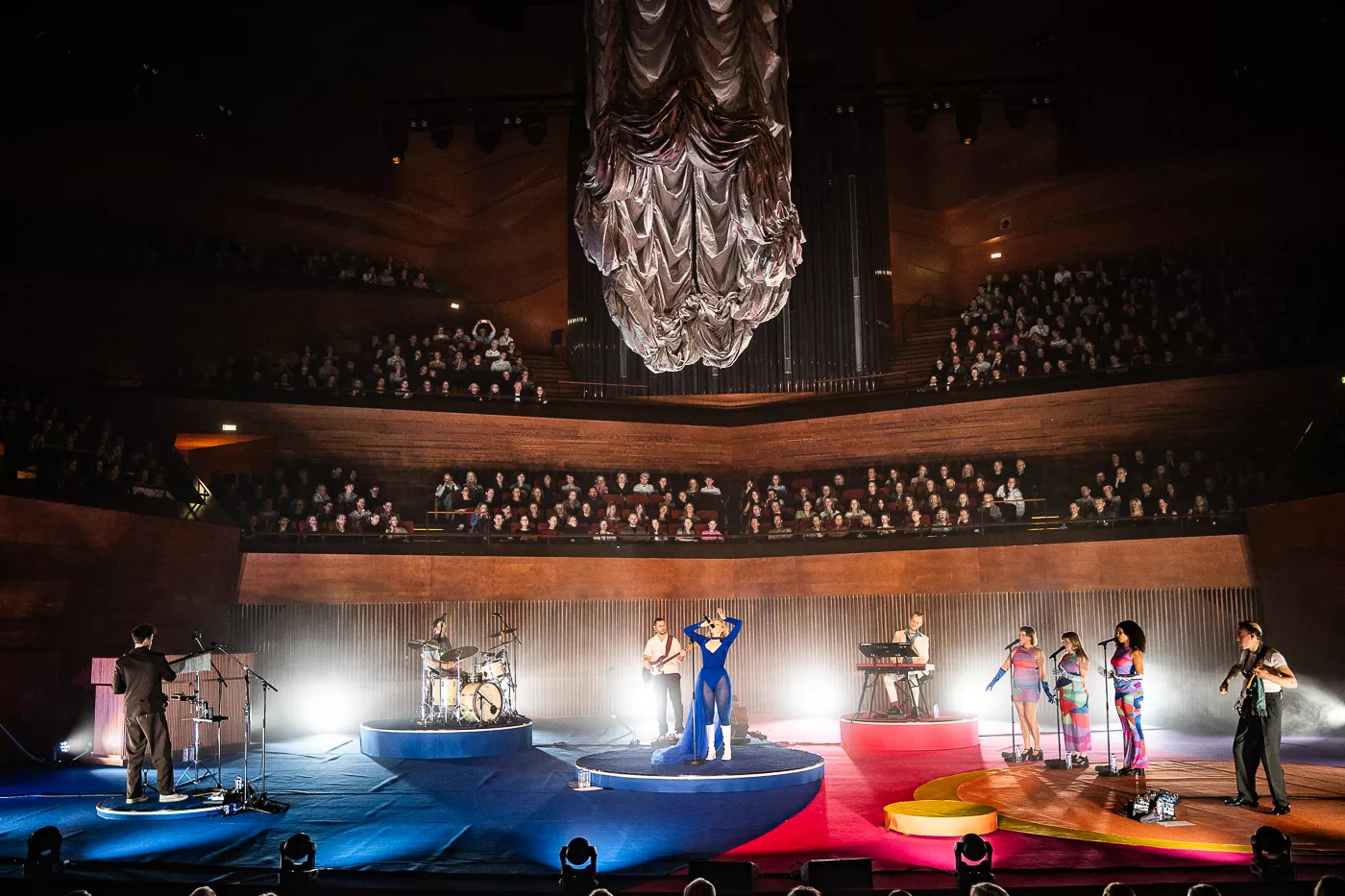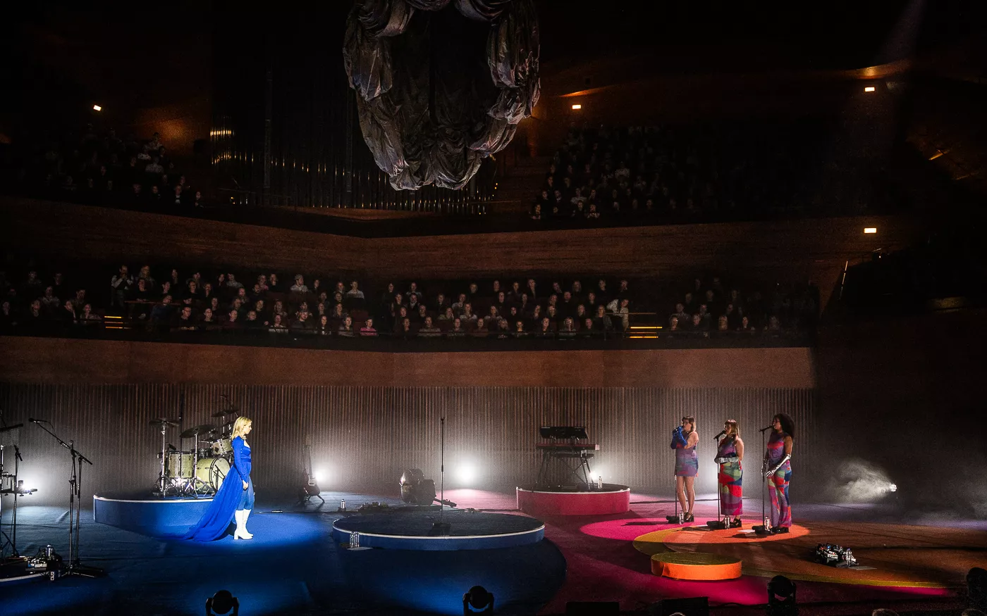 Denne aften er helt særlig, og publikummet består primært af kvinder i alle aldre med et glas hvidvin i hånden. Jeg kommer ind til en scene i skrigpink, varm lilla og med kongeblåt filtgulv, med store cirkelformede tæpper i gul og orange. Fra loftet hænger en lang gardin-arm i grå, som