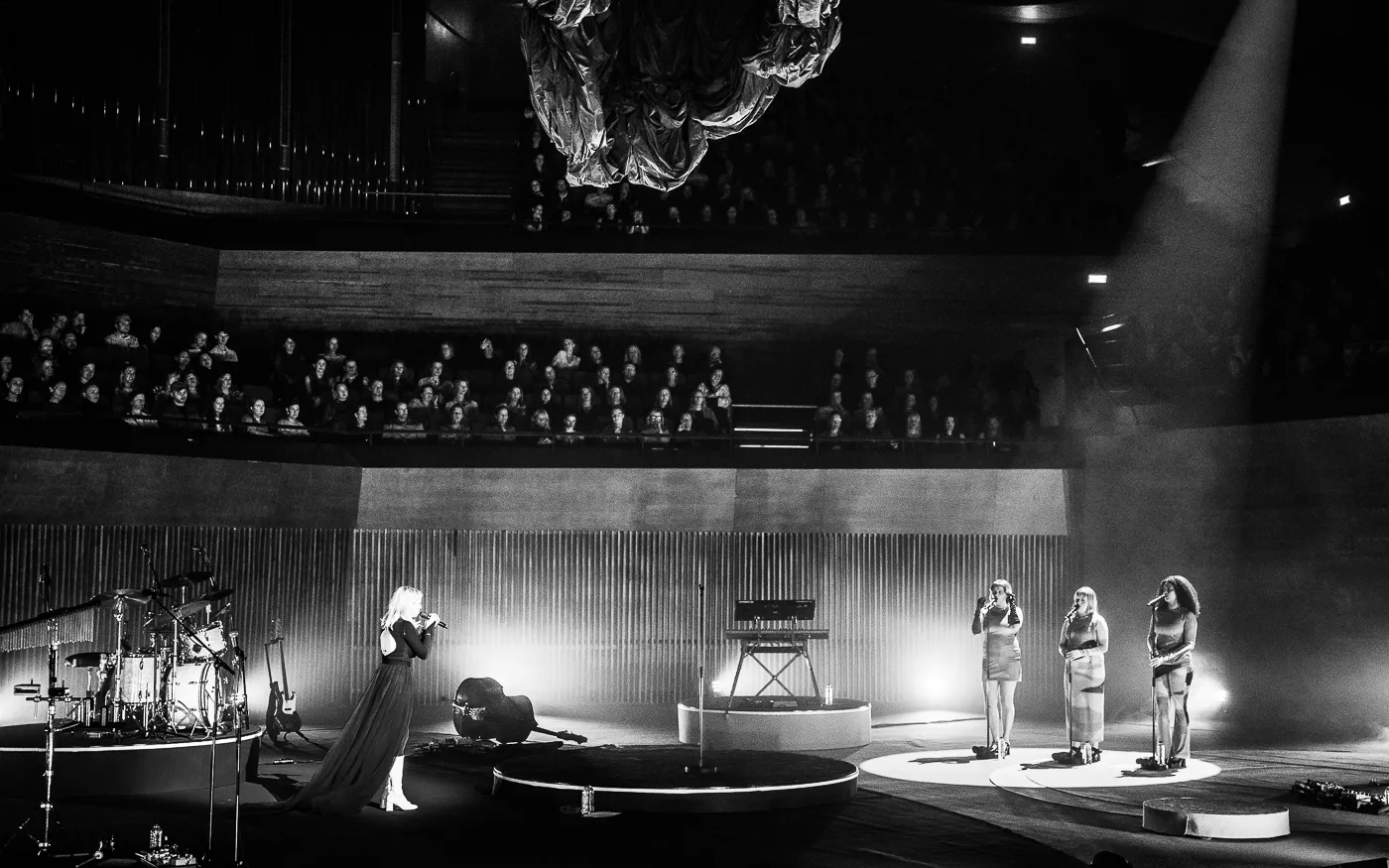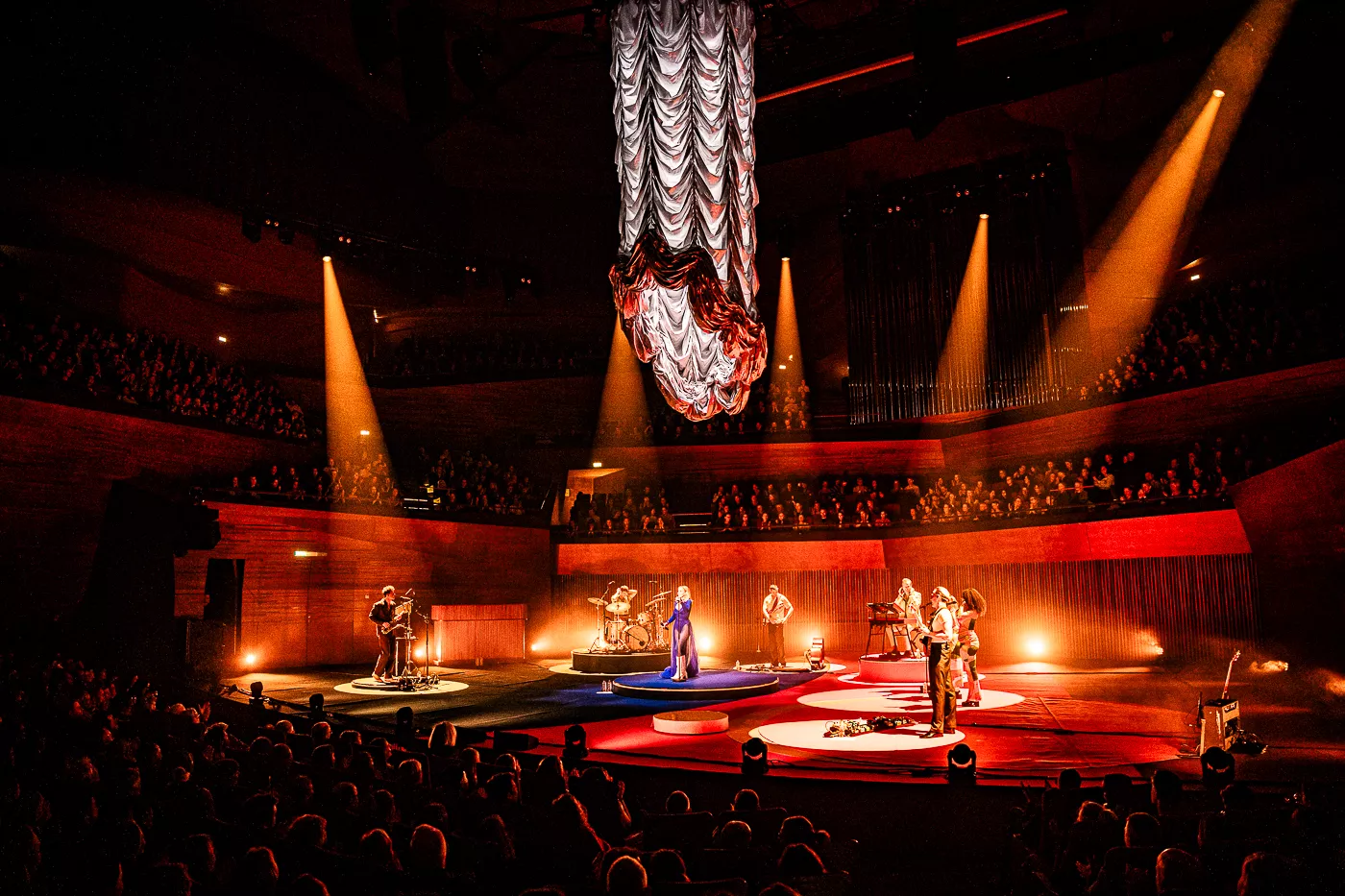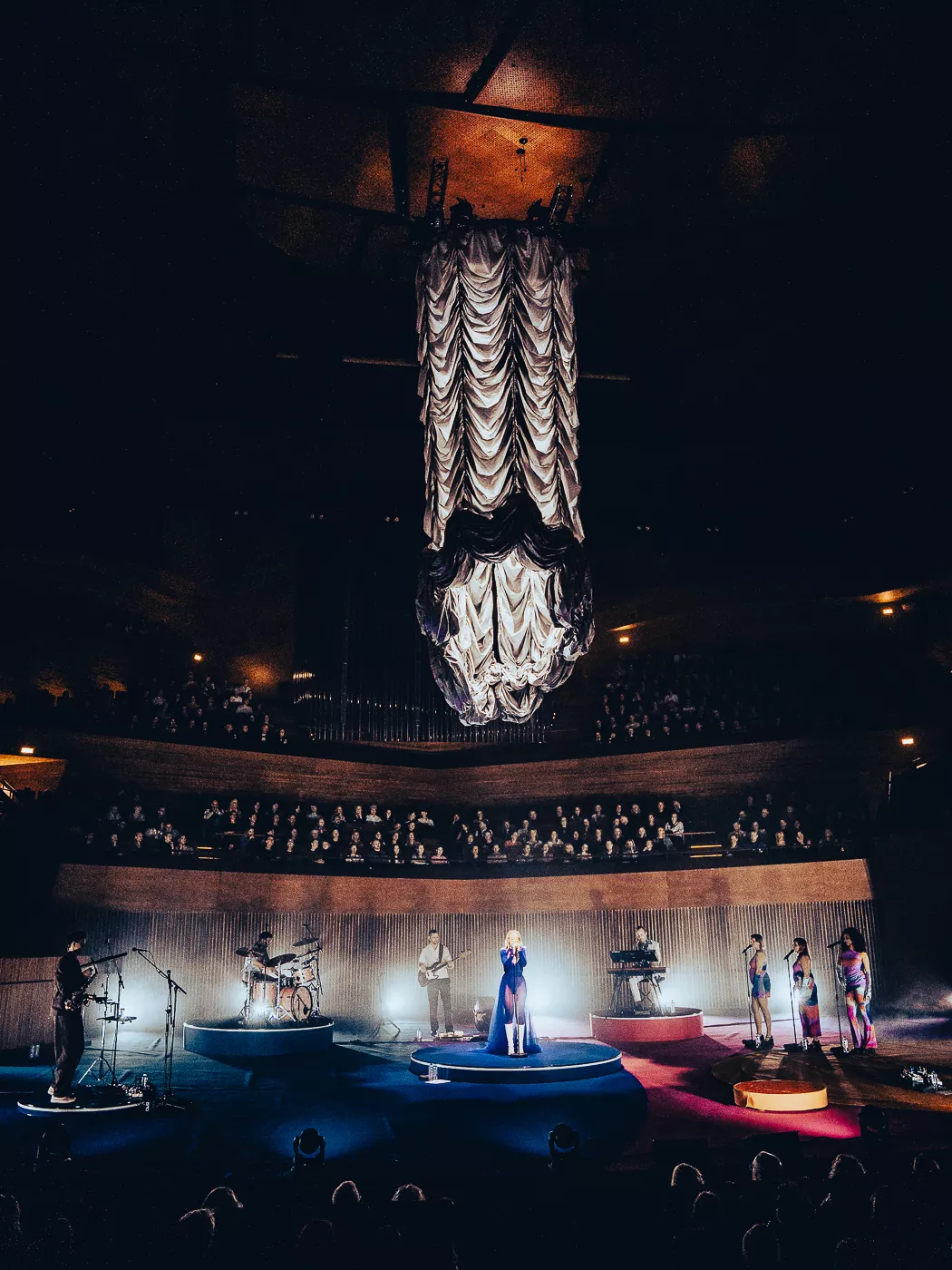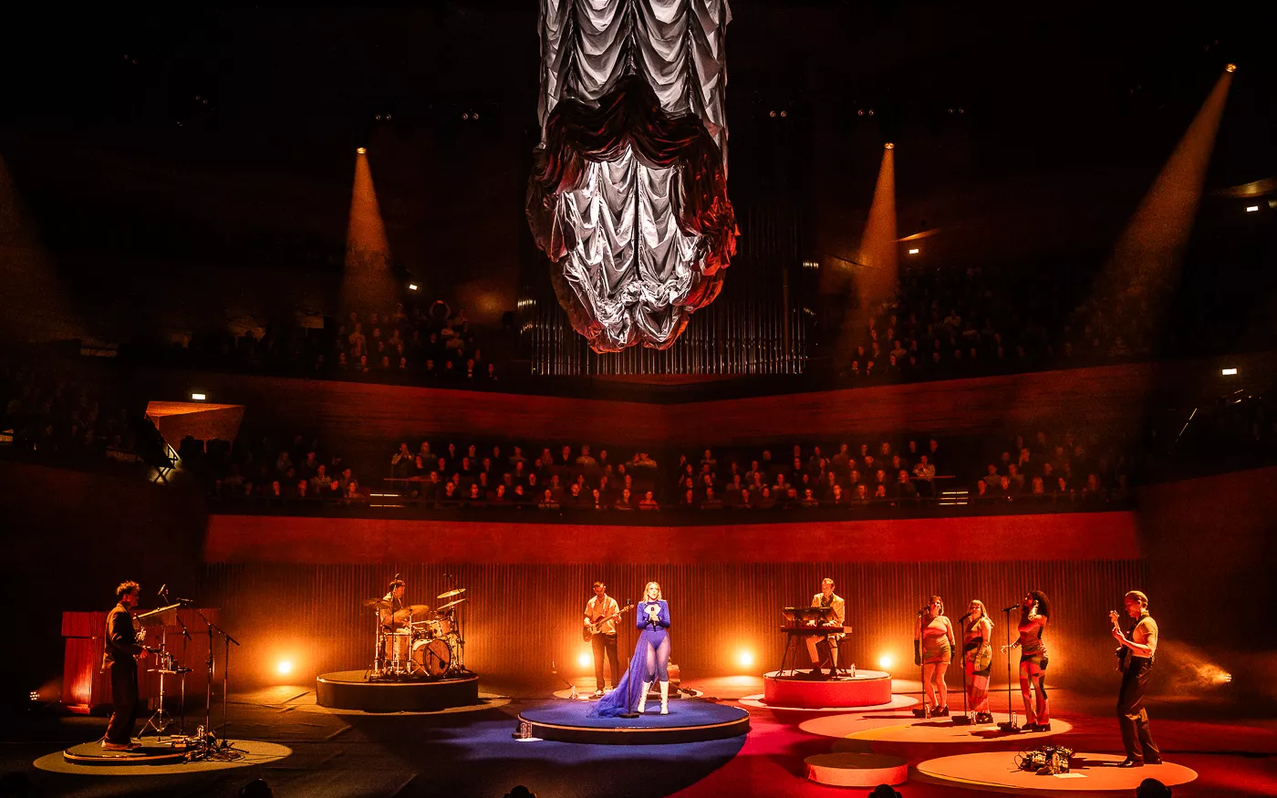Denne aften er helt særlig, og publikummet består primært af kvinder i alle aldre med et glas hvidvin i hånden. Jeg kommer ind til en scene i skrigpink, varm lilla og med kongeblåt filtgulv, med store cirkelformede tæpper i gul og orange. Fra loftet hænger en lang gardin-arm i grå, som