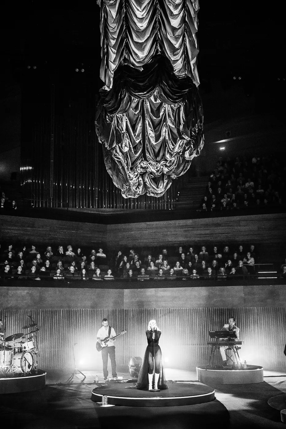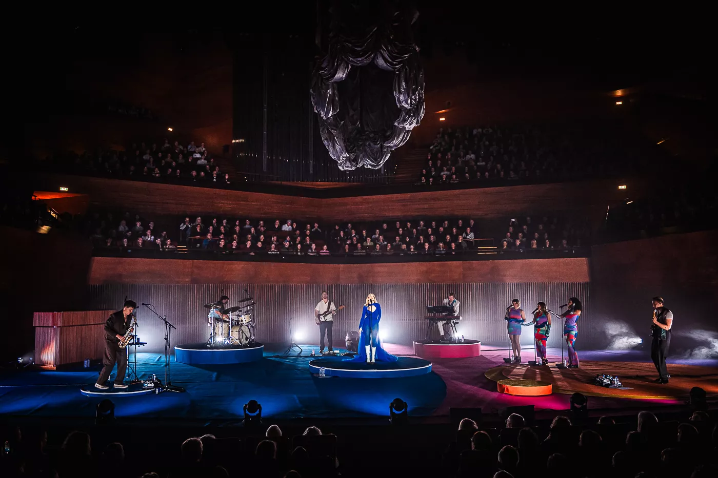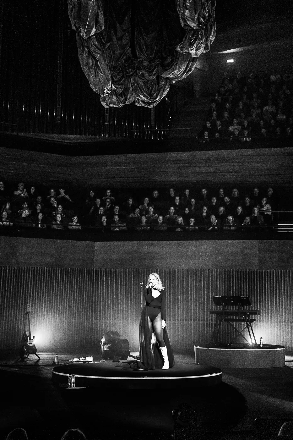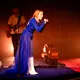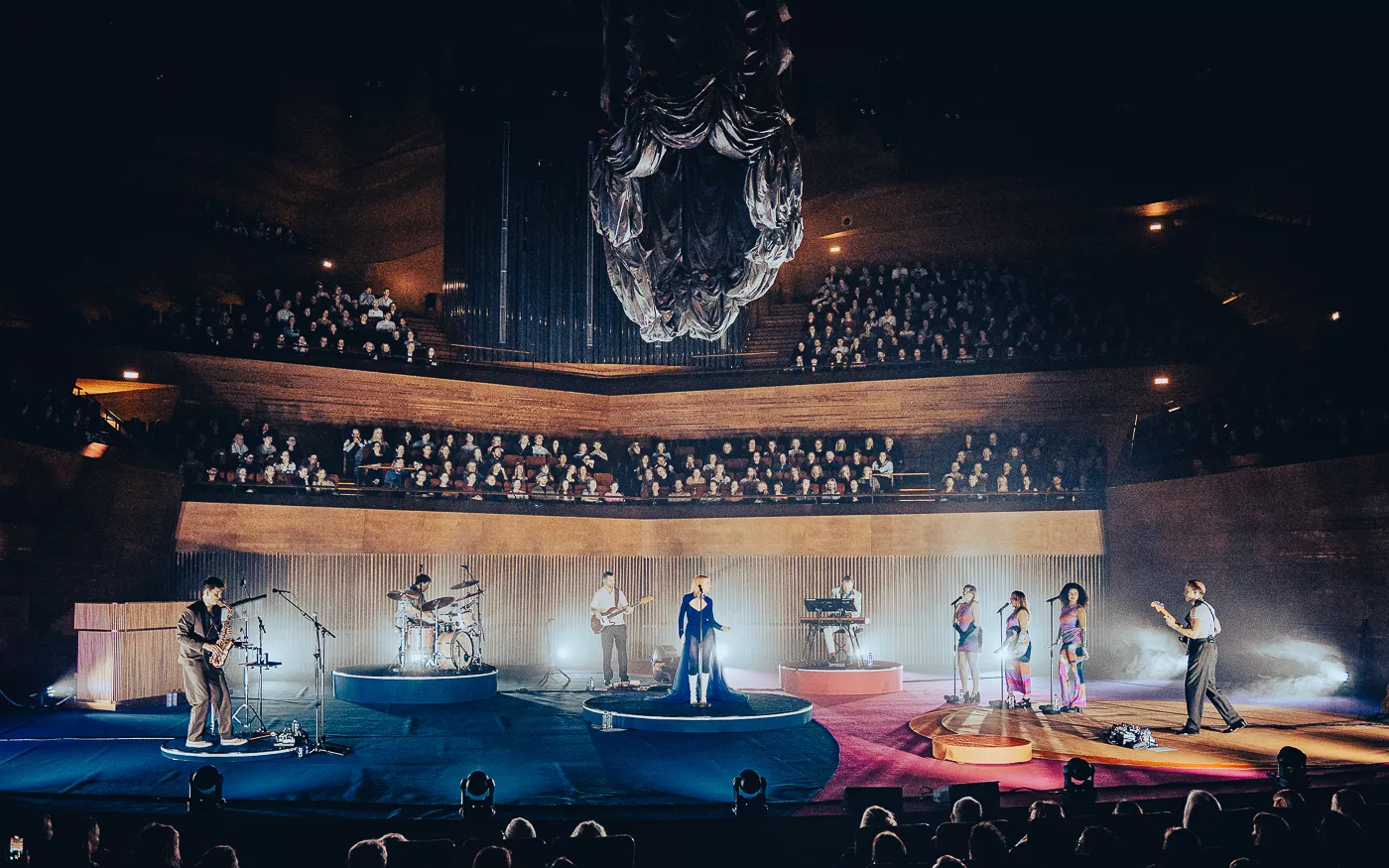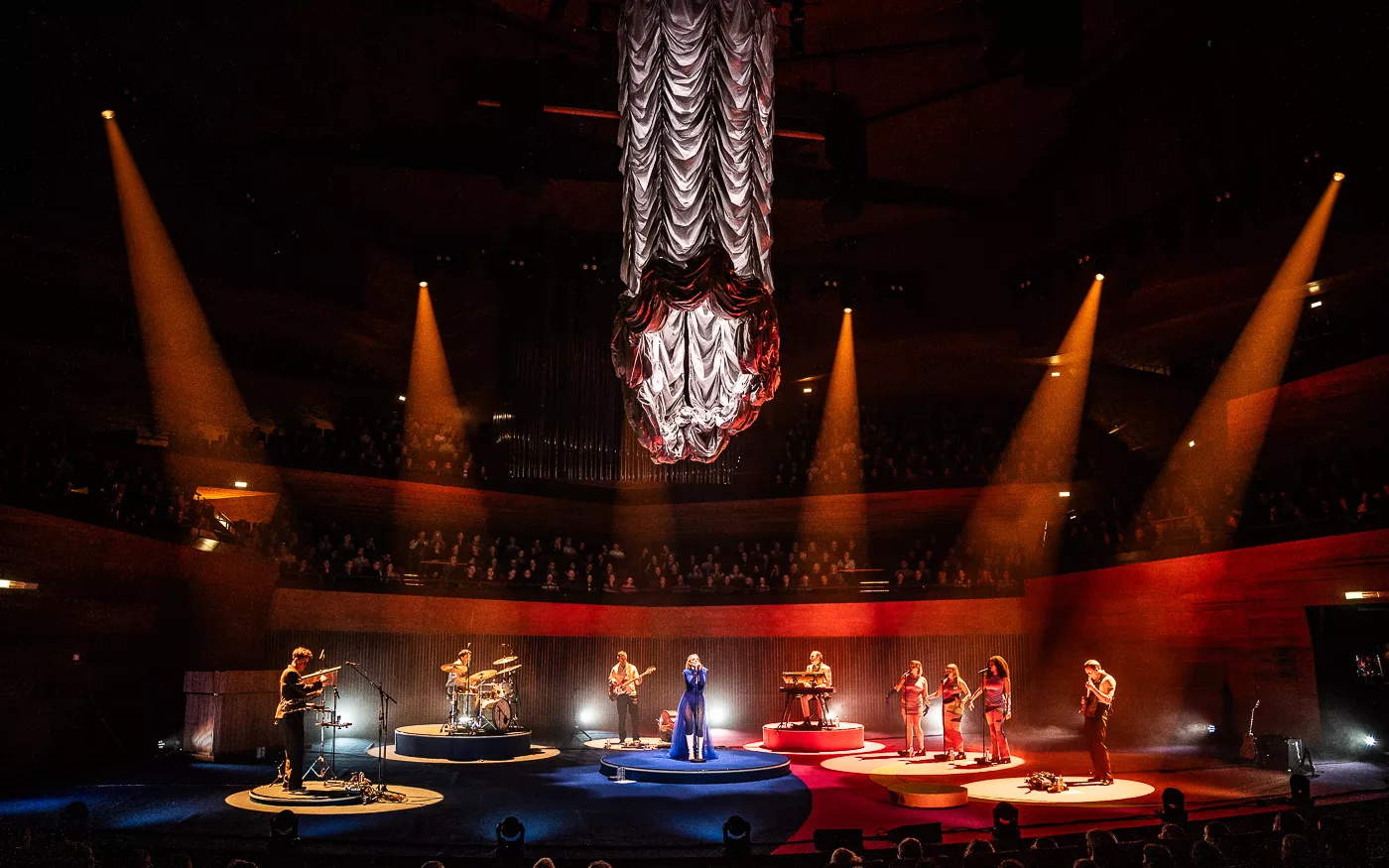 Denne aften er helt særlig, og publikummet består primært af kvinder i alle aldre med et glas hvidvin i hånden. Jeg kommer ind til en scene i skrigpink, varm lilla og med kongeblåt filtgulv, med store cirkelformede tæpper i gul og orange. Fra loftet hænger en lang gardin-arm i grå, som