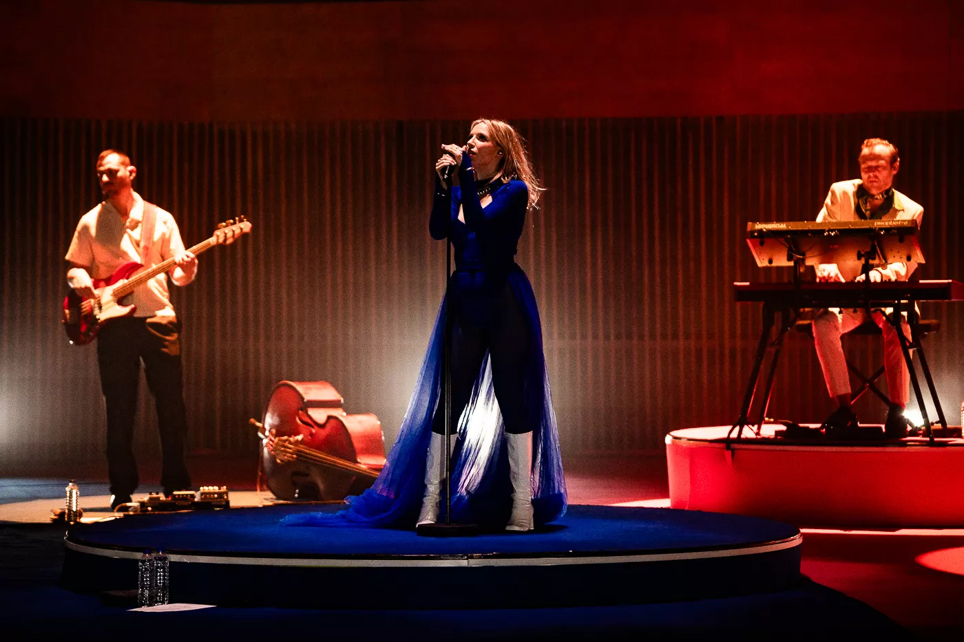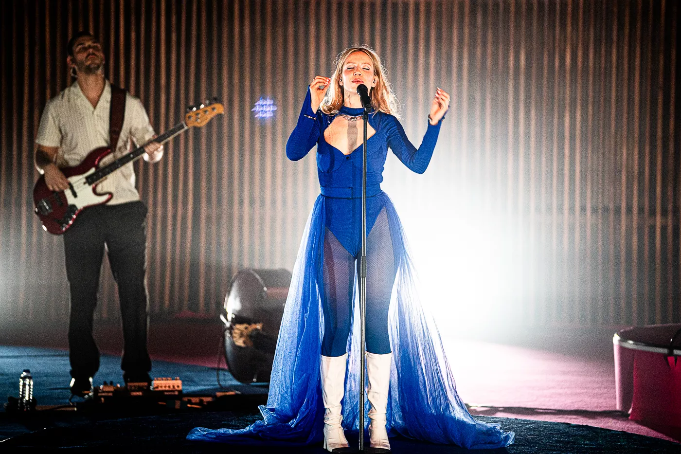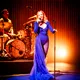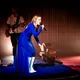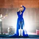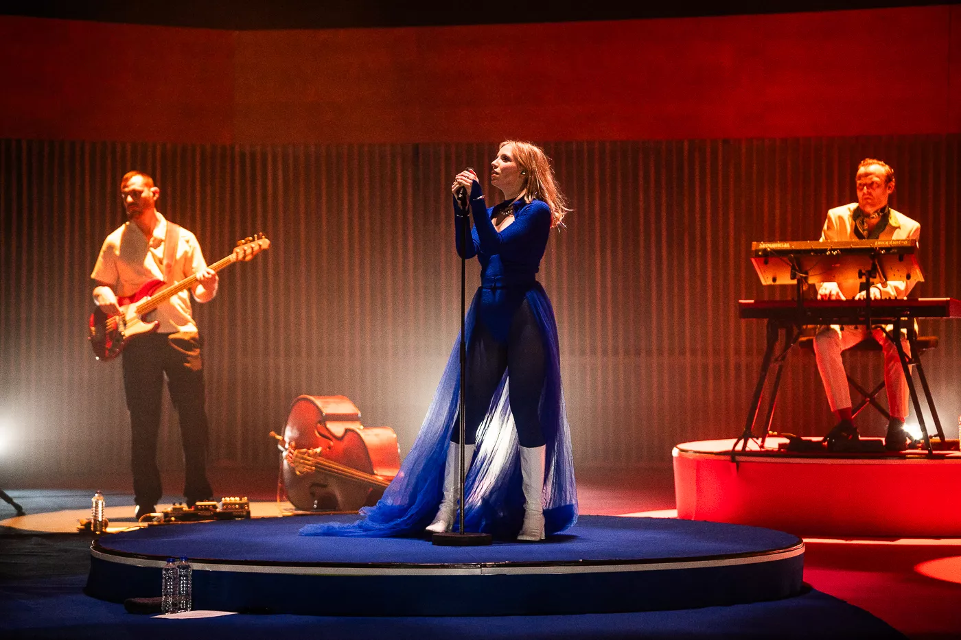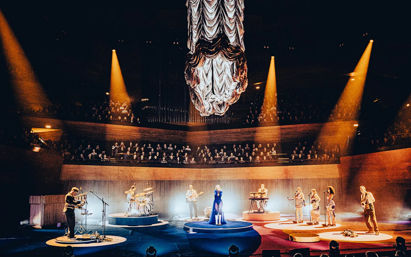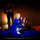 Denne aften er helt særlig, og publikummet består primært af kvinder i alle aldre med et glas hvidvin i hånden. Jeg kommer ind til en scene i skrigpink, varm lilla og med kongeblåt filtgulv, med store cirkelformede tæpper i gul og orange. Fra loftet hænger en lang gardin-arm i grå, som