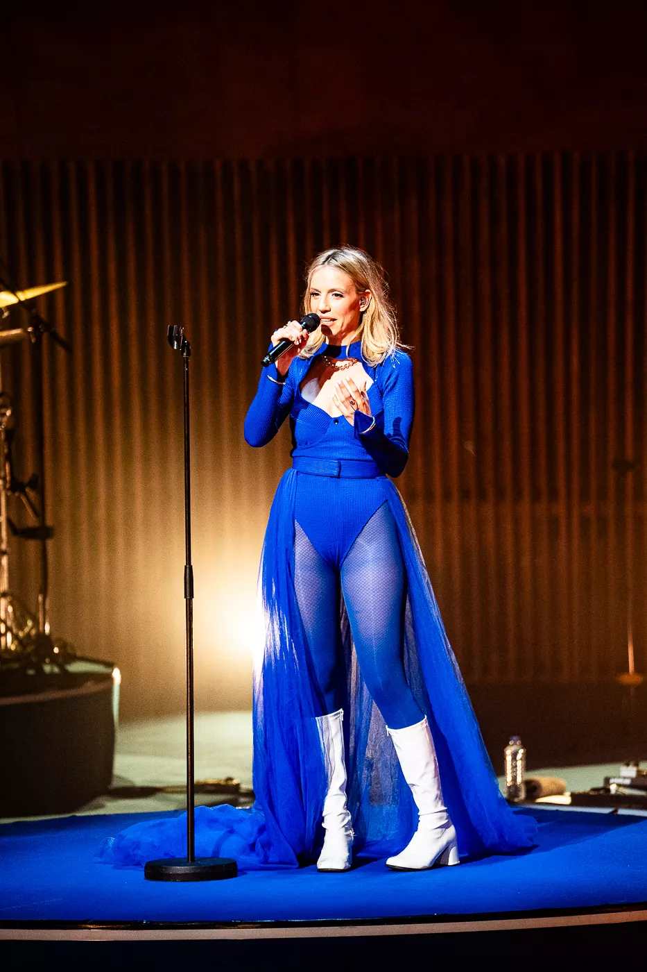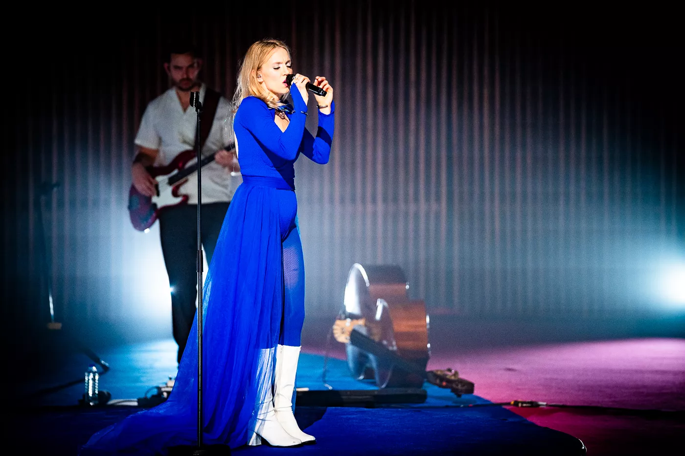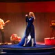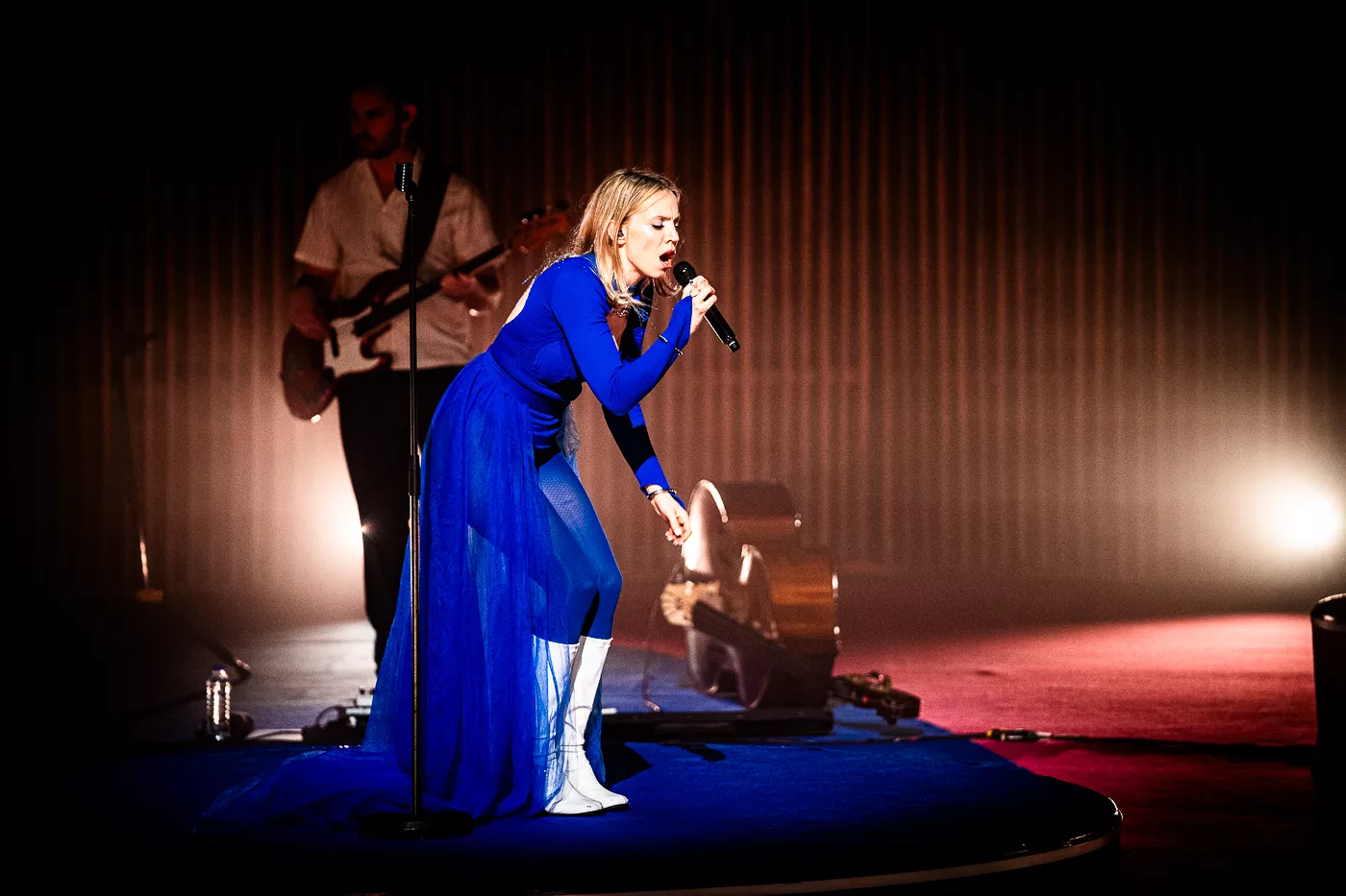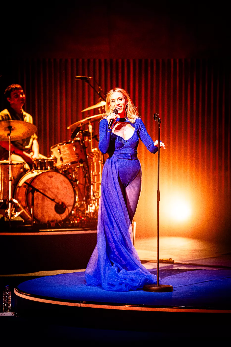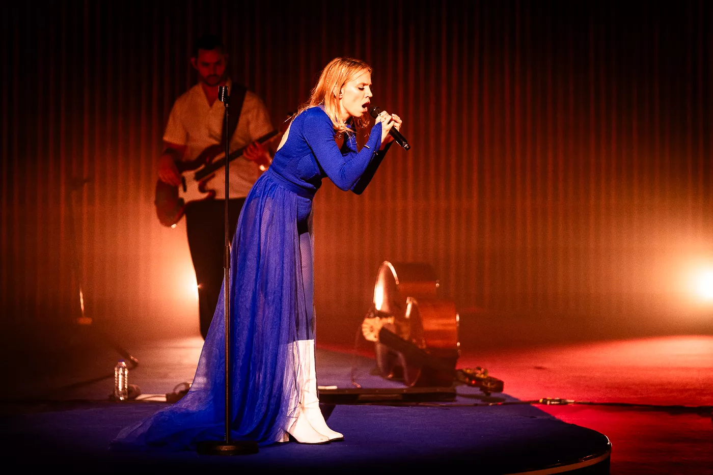 Denne aften er helt særlig, og publikummet består primært af kvinder i alle aldre med et glas hvidvin i hånden. Jeg kommer ind til en scene i skrigpink, varm lilla og med kongeblåt filtgulv, med store cirkelformede tæpper i gul og orange. Fra loftet hænger en lang gardin-arm i grå, som