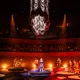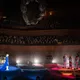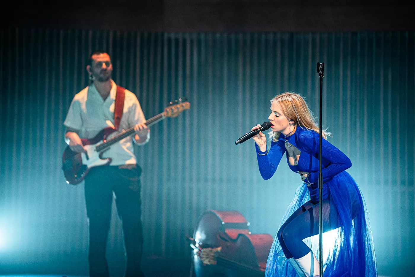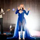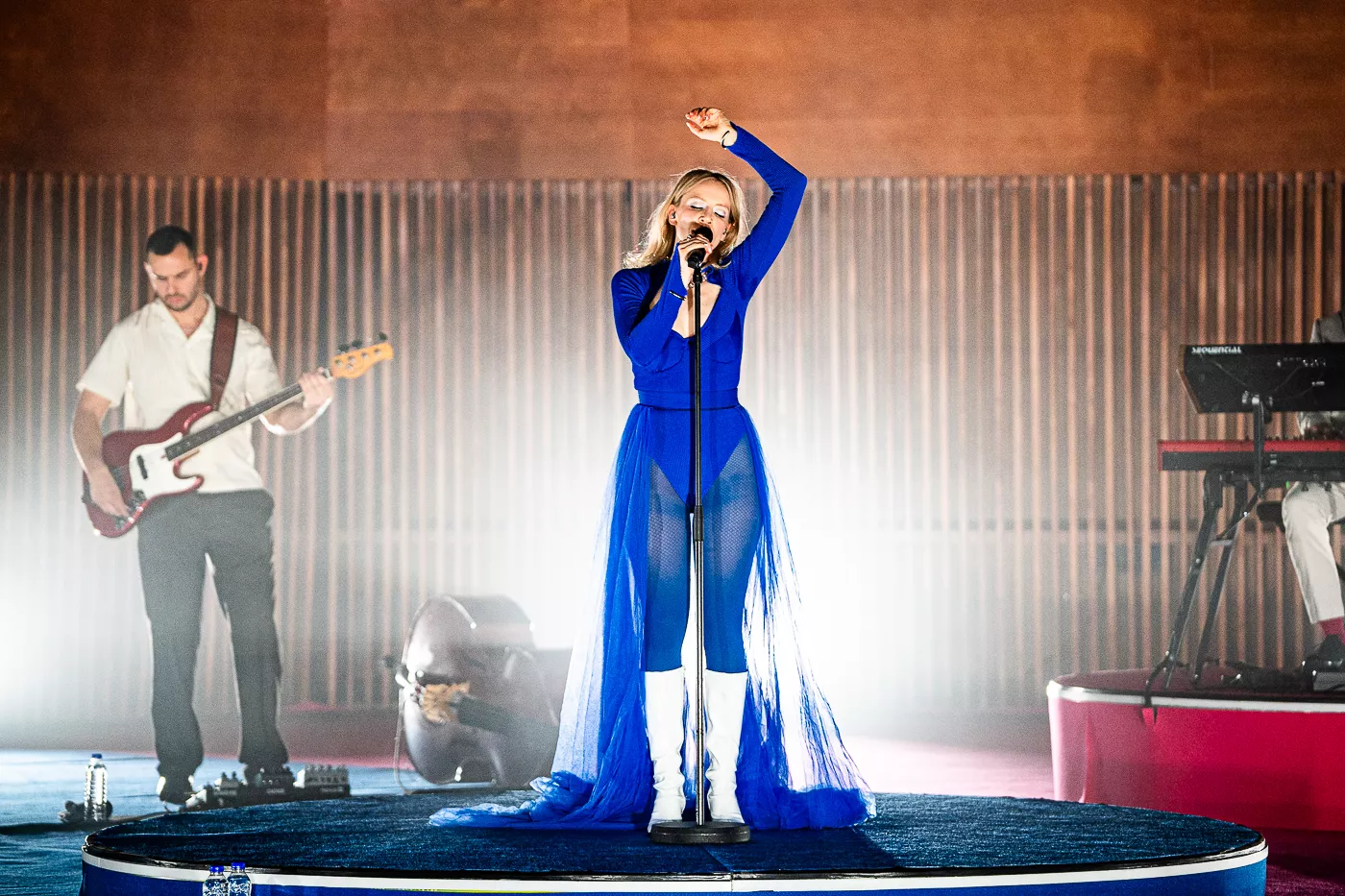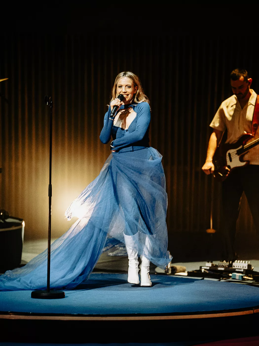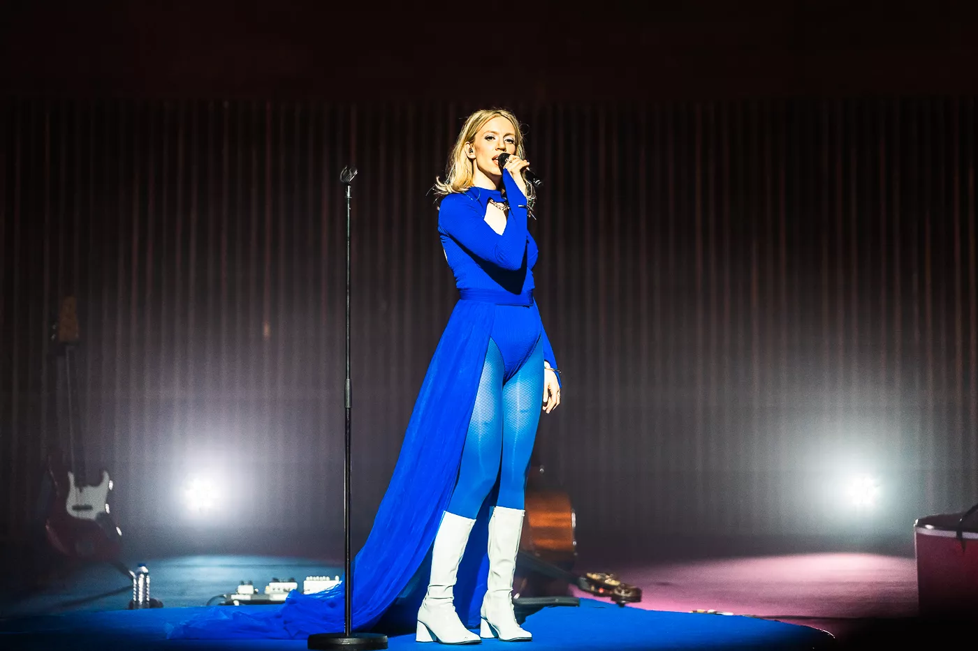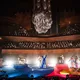 Denne aften er helt særlig, og publikummet består primært af kvinder i alle aldre med et glas hvidvin i hånden. Jeg kommer ind til en scene i skrigpink, varm lilla og med kongeblåt filtgulv, med store cirkelformede tæpper i gul og orange. Fra loftet hænger en lang gardin-arm i grå, som