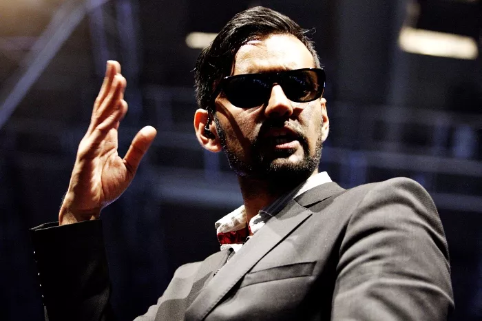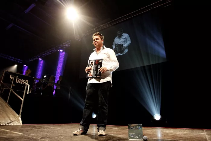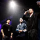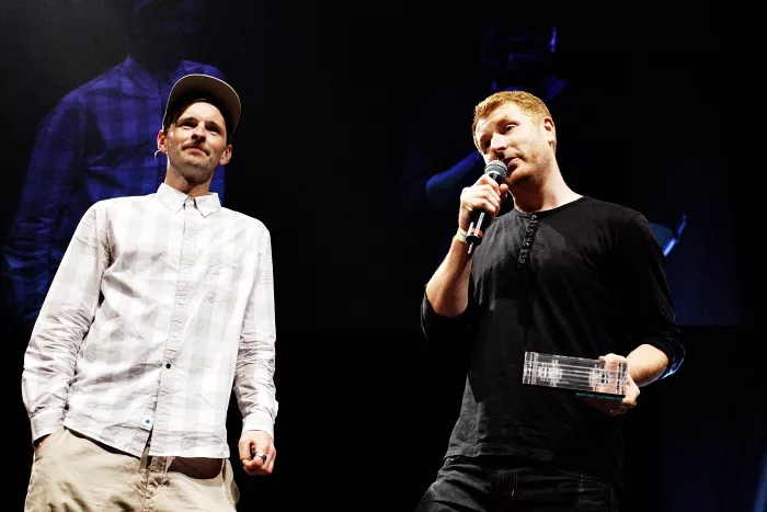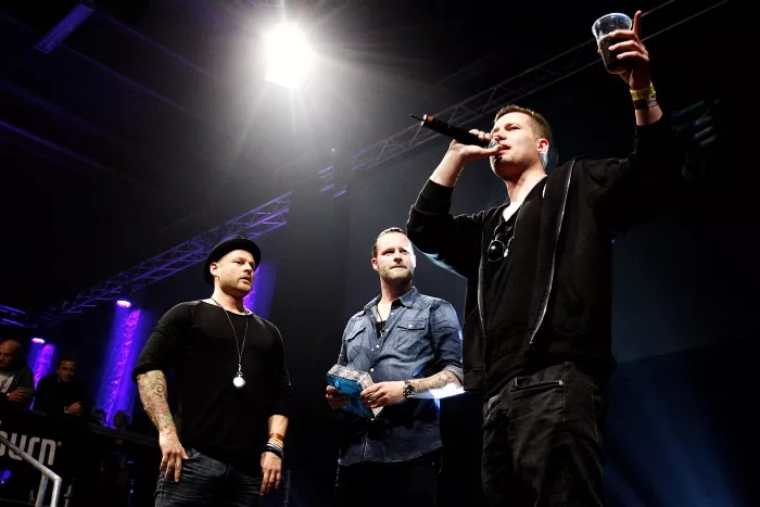 Kasper Winding ankommer høj og cool i mørkt jakkesæt og fuldskæg. Basim følger lige bagefter med hat og solbriller. Dernæst Sidney Lee i brunt og lædervest og så Dan Rachlin. Alle tre venter pænt på, at journalisterne har talt med Kasper Winding, så de også kan blive filmet og noteret.