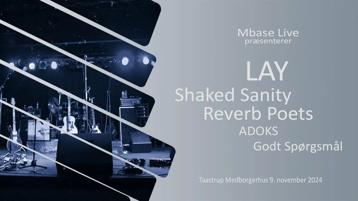 MusicBase er en frivillig og aktiv øvelokaleforening i Taastrup med netværk i Hovedstaden og Sjjælland. Vi præsenterer med aftenens program flere af foreningens artister, hvor også mange af de frivillige bidrager til at binde det hele sammen. Derfor en stor tak og credit til alle frivillige, såvel blandt artisterne som øvrige for at få dette projekt gennemført. Som publikum medvirker I til at støtte foreningens arbejde for øvelokaler, da alle indtægter på billetsalget (ekskl. gebyr) og overskud på salg i baren går til foreningens aktiviteter og drift. Programmet består af forskellige stilarter og genrer, som på den måde repræsenterer musikkens mangfoldige udtryk, og som naturligt er til stede i en øvelokaleforening. Døre åbner: kl. 18. Koncert slut: kl. 22:30. LAY LAY - rapperen uden for mønstret. Sidste år udgav han nummeret Run Away (Prod. Kewan & Malthe Nørgaard) som har vakt opmærksomhed, både på radio (P3) og på streaming. Siden er han gået independent på delvist eget Label - Problem Barn / NWO, og i april udgav han nummeret Purple Rain (Prod. Vill3ds & Kewan). Hans tekster og emner kulminerer mellem angst og kærlighed samt historier fra hans opvækst hvor miljøet og omgivelserne kommer til udtryk i musikkens hårde og melankolske undertoner. I Februar spillede han sin første delvist headliner koncert i et udsolgt Huset (København), med hans band. Fremtiden for LAY byder på et album i 2024, og løbende singler. Shaked Sanity Shaked Sanity er et fem-medlems folk-rock band baseret i Aarhus, Danmark, med både lokale og internationale medlemmer. Bandet ledes af vokalisten Shaked Mofaz og skaber en unik lyd, der blander folk, country rock og mellemøstlige melodier. Deres musik tilbyder en rig følelsesmæssig oplevelse takket være deres dybe tekster som gør deres sange følelsesrige og relaterbare. GODT SPØRGSMÅL Vi er fem friske musikere der hygger os med at spille sange, som du sikkert kender fra kunstnere som: Stevie Wonder, Simply Red, Danseorkestret, Robyn, Gloria Gaynor, Chic og mange flere. Hannah synger smukt, Philip spiller lækre riffs på guitar, Jesper fyrer op for den fede bass, Mathias spiller svedige keys og Casper slår på tønderne. Hvad er vores navn? “Godt spørgsmål”. ADOKS Adoks bringer en eksplosiv blanding af hård rock, heavy rock og klassisk metal til scenen! Med dybe rødder i både de klassiske og moderne rockikoner leverer vi en musikalsk oplevelse fyldt med tunge riffs, rå energi og uforglemmelige melodier. Vores lyd bevæger sig fra 70'ernes ikoniske rockrødder, over 90’ernes grunge, til nutidens tunge og kraftfulde rocklyde. Kom og mærk energien, når vi hylder rockens største legender og skaber en aften fyldt med nerve, intensitet og ægte rock’n’roll!