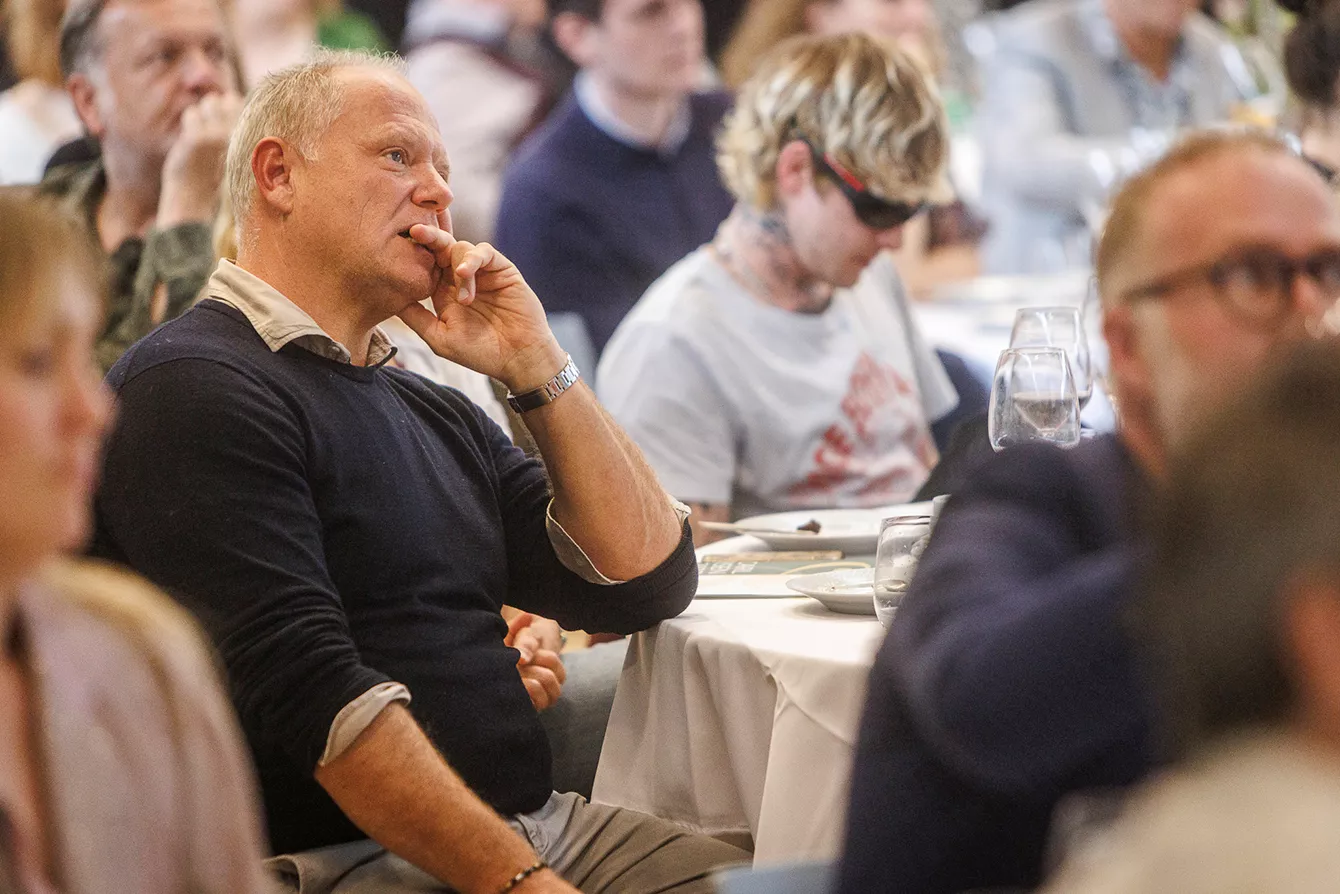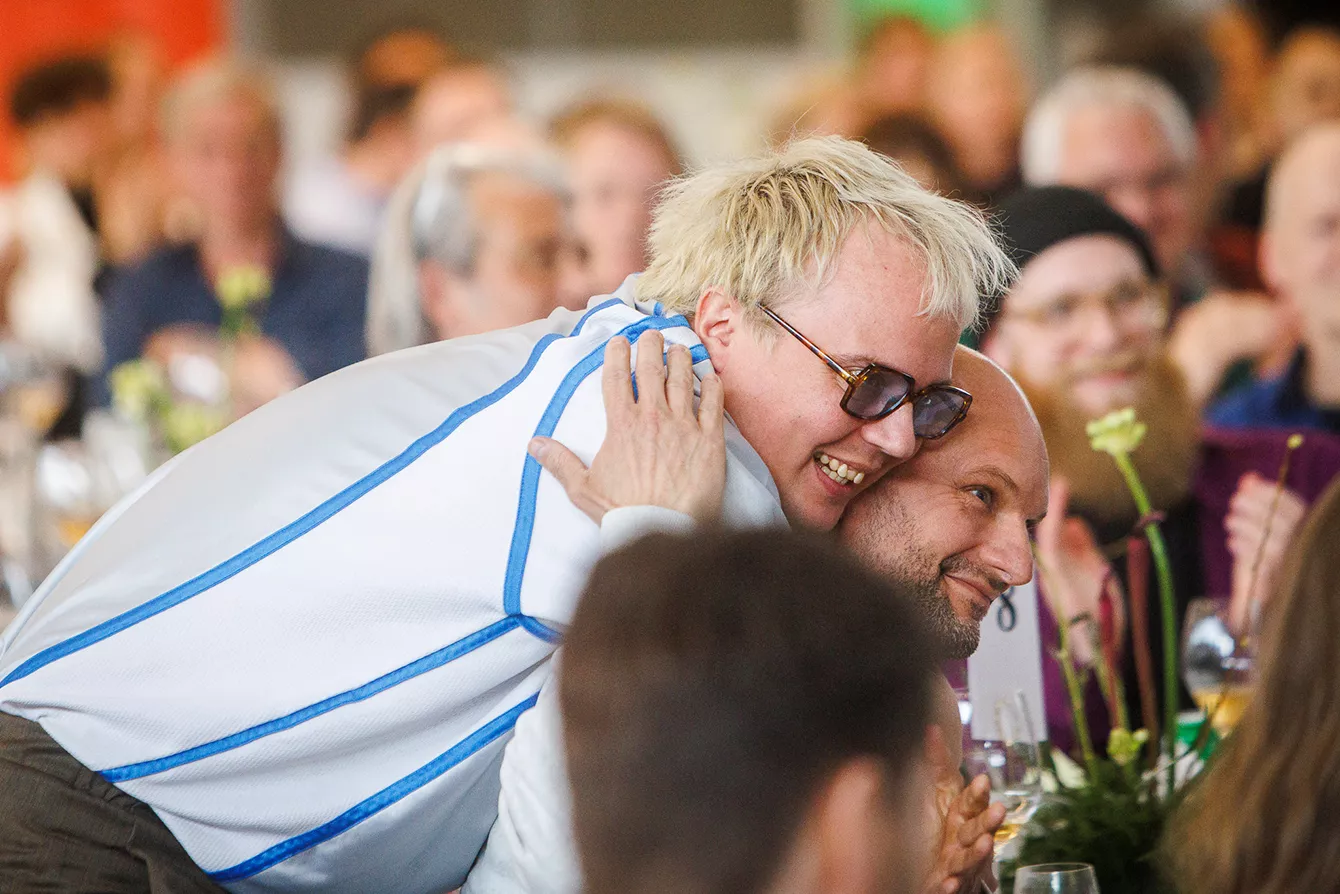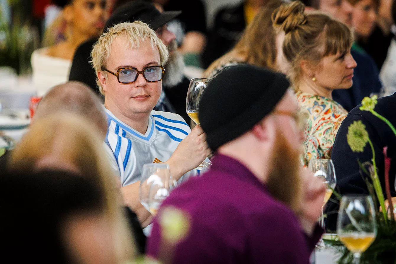 I salen bemærkede man i øvrigt specielt bordet, hvor en Drew Sycamore med skrigende pink hår, som ville få Barbara Cartland til at sukke af fryd i sin himmel, var flankeret af Nordsø-tvillingerne Fridolin og Frederik, som med nærmest stensikker plads i toppen af KODA- og Gramex-lister i snart en årrække har den afgørende hånd med i en lang række af de største ørehængere. Samt længere fremme en veloplagt Andreas Odbjerg, som efter at være blevet introduceret af forhenværende kulturminister Brian Mikkelsen tillod sig et befriende politisk slag i bolledejen med en bemærkning om dennes mangelfulde indsats.
