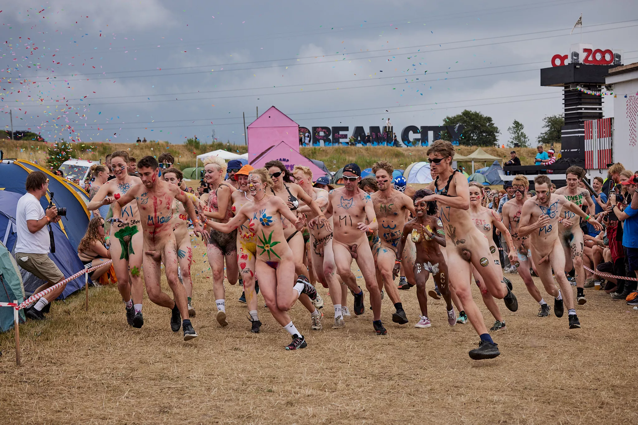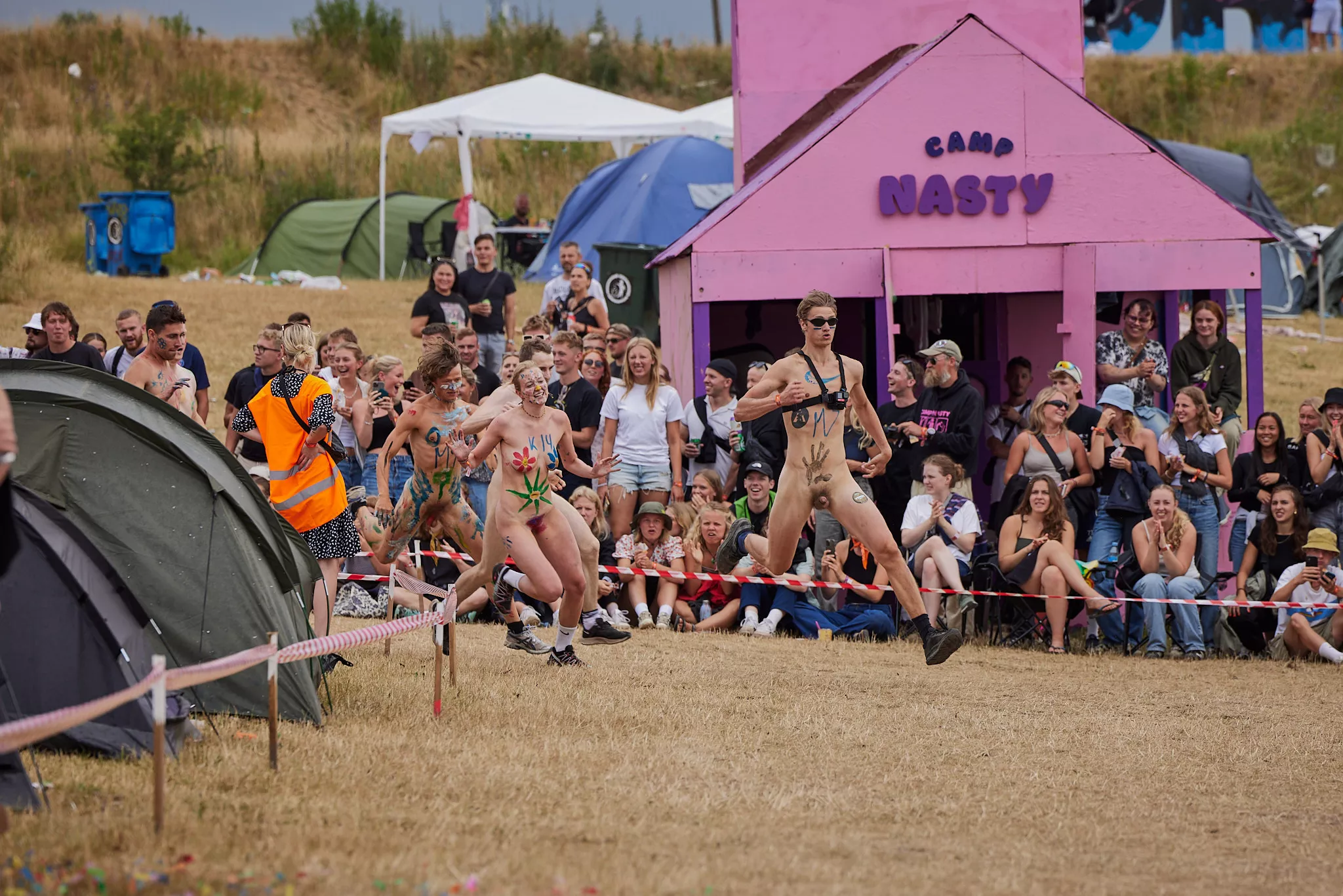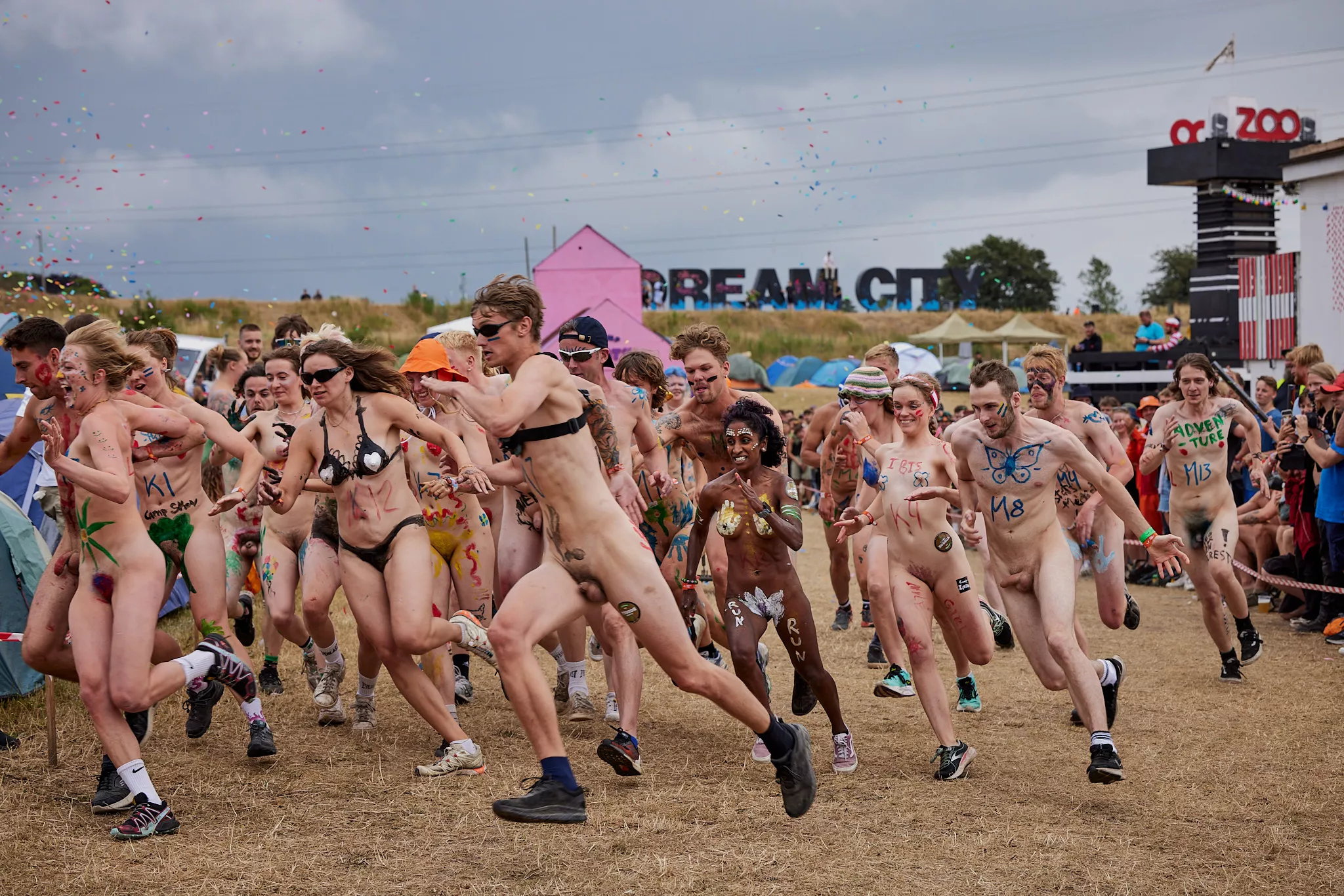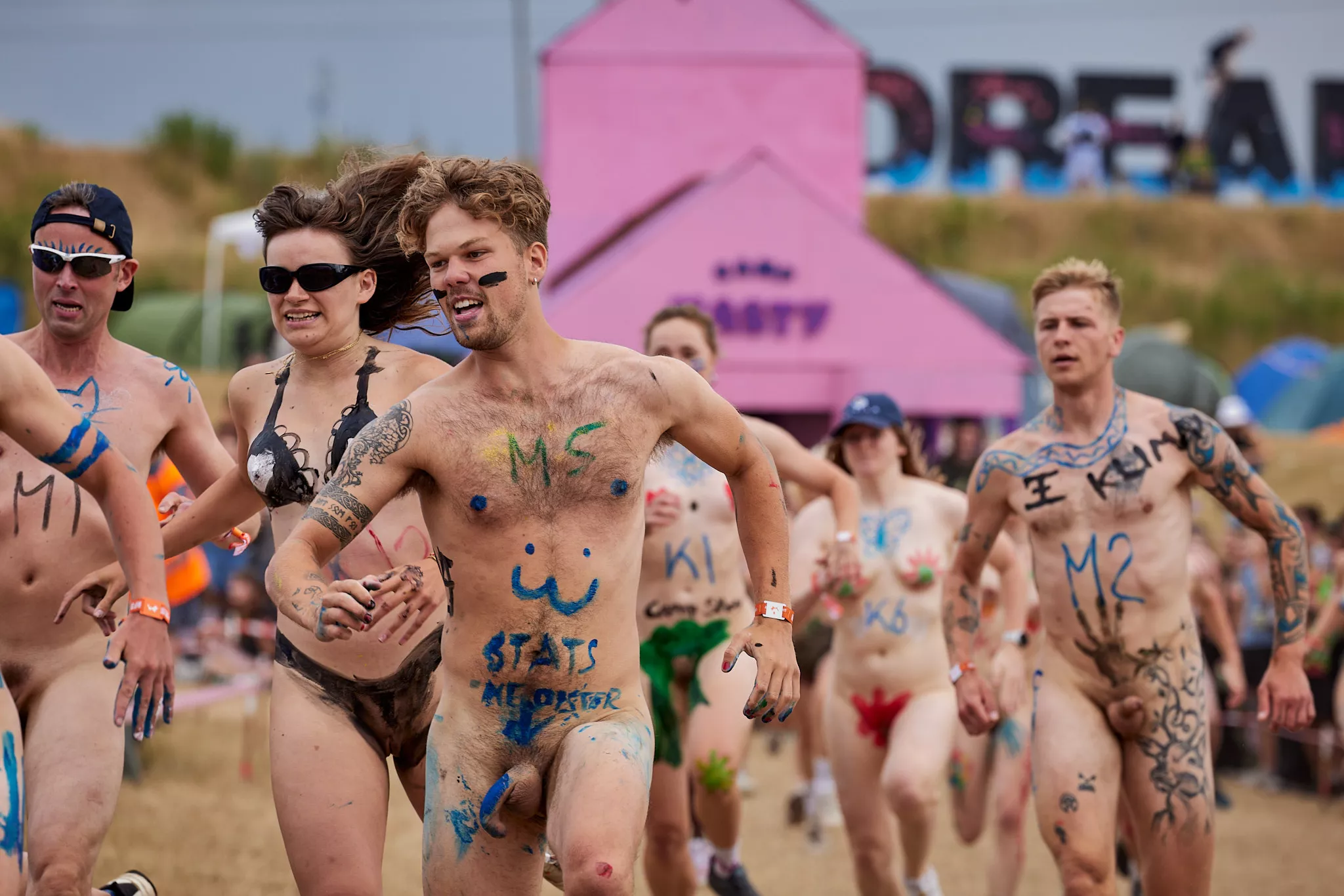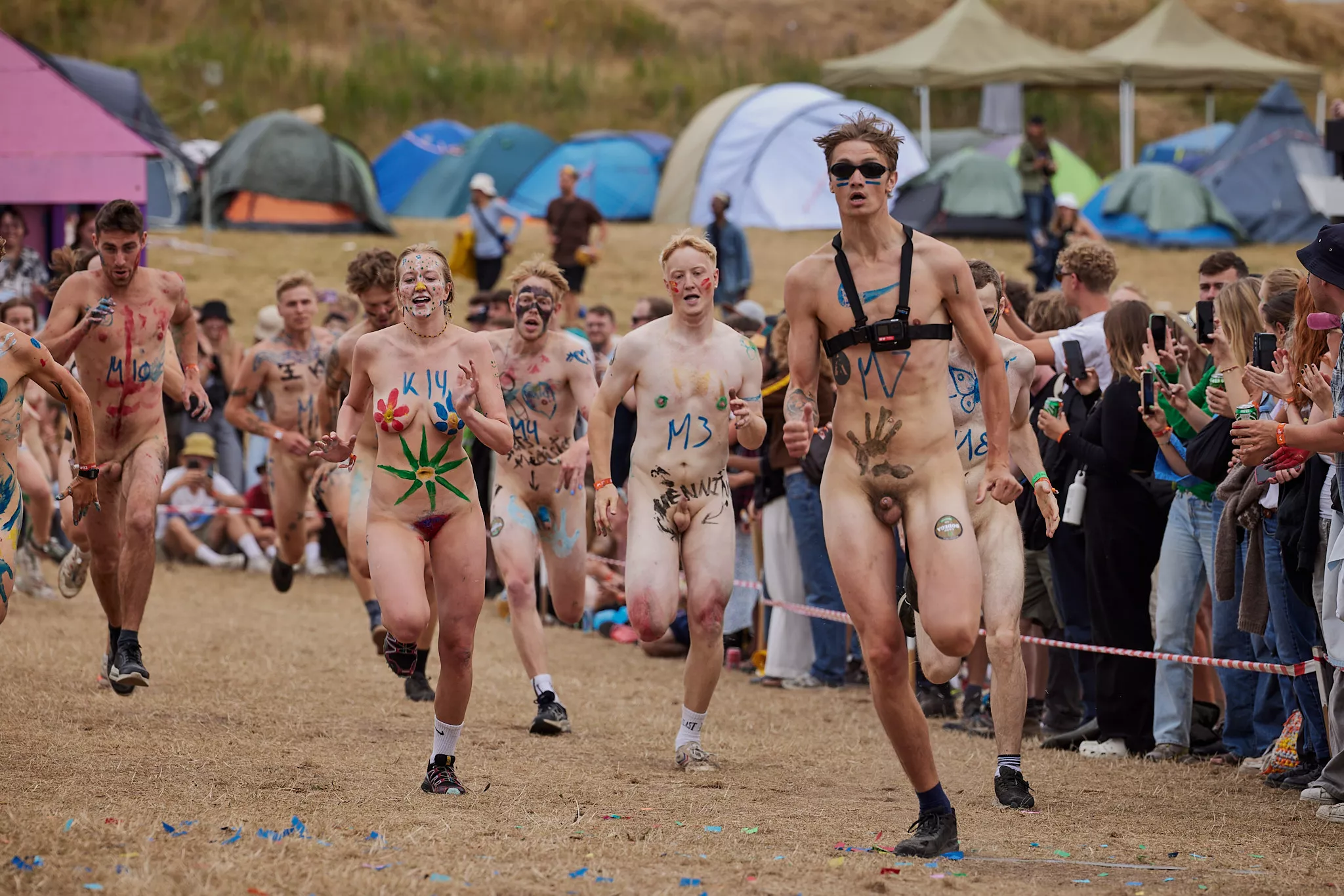 Af uvisse årsager begynder løbet et kvarter før annonceret koncertstart 14.00. Der hujes, mens de nøgne kroppe løber omkring, mange iført diskrete mængder bodypaint. ”Some things exit her, some things enter here”, står der eksempelvis på ryggen af en ung mand med en pil ned til anus.