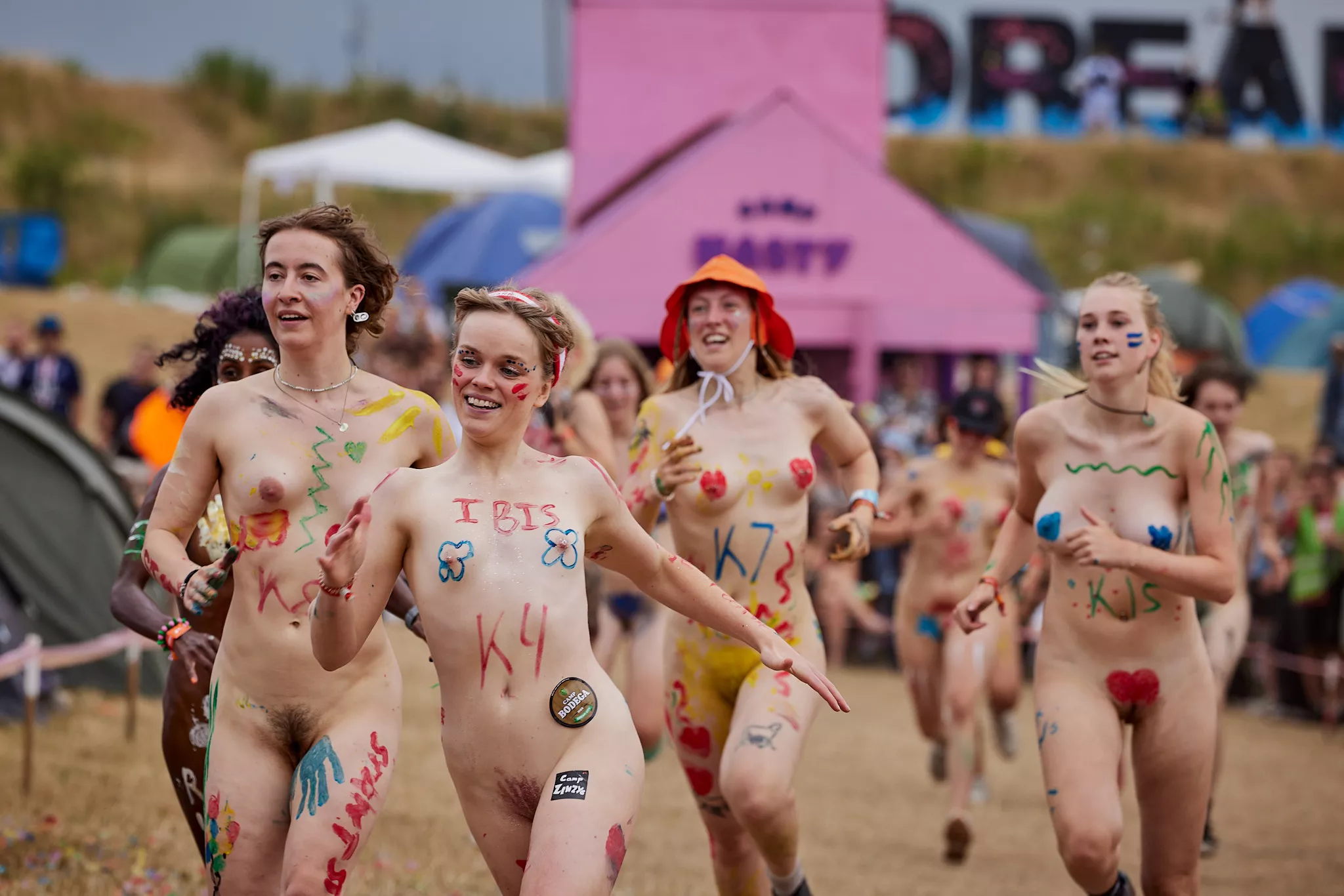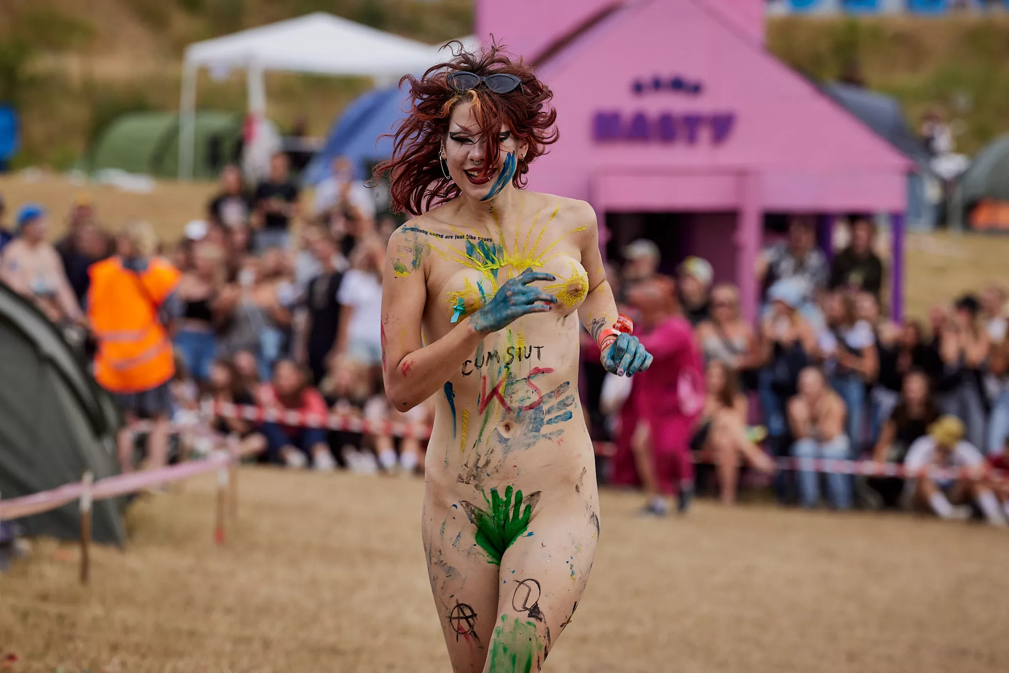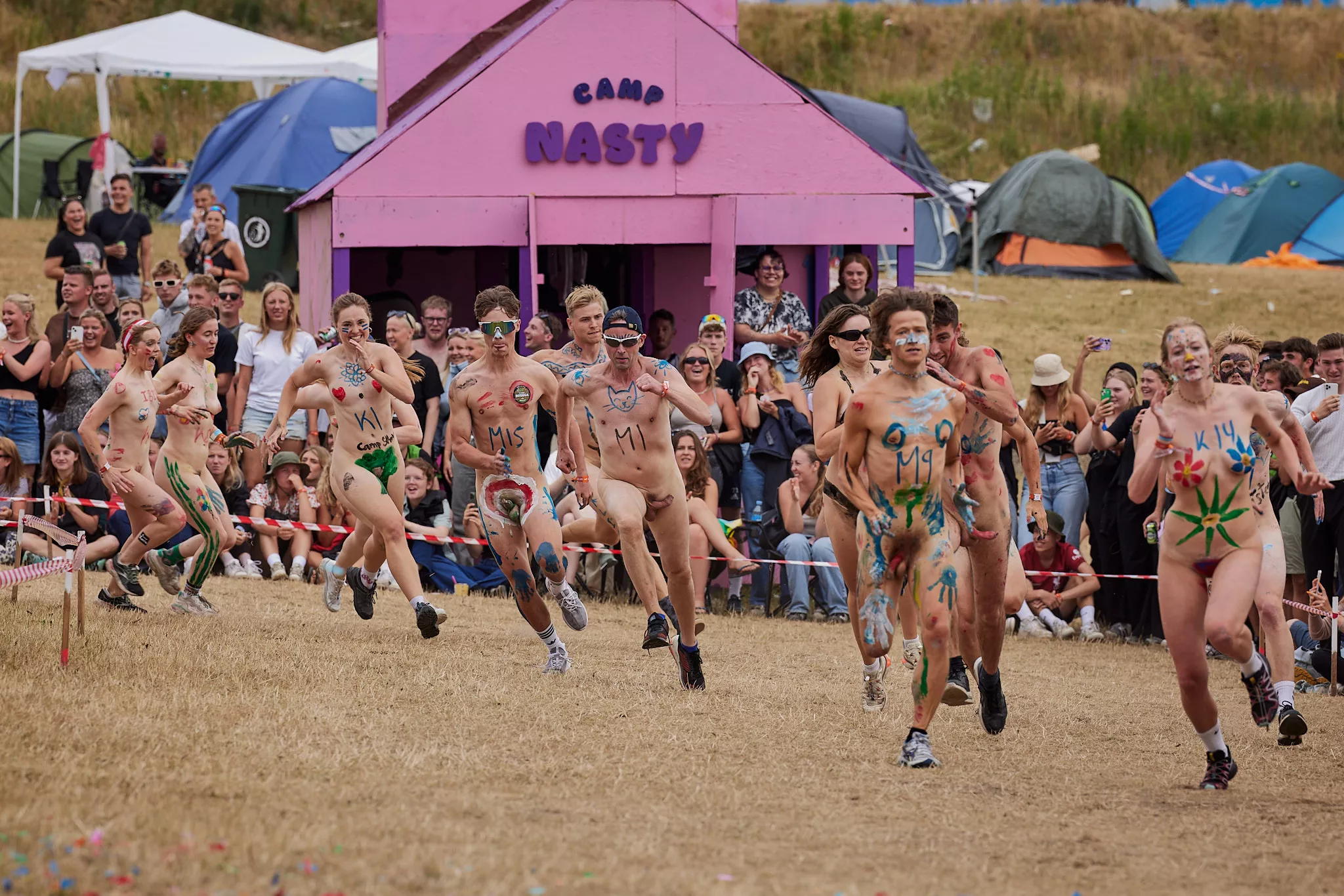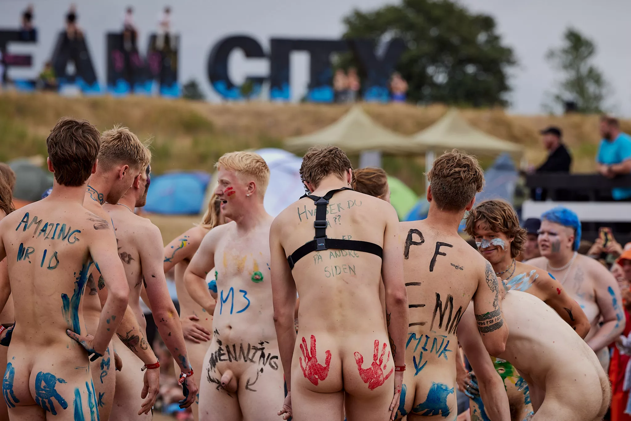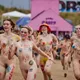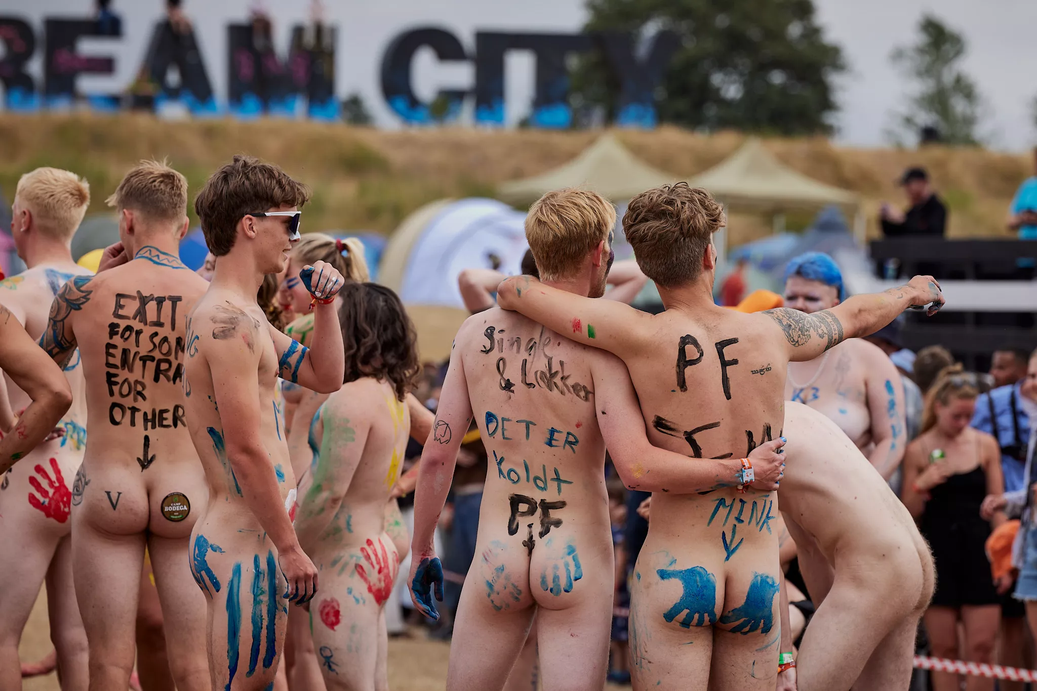 Af uvisse årsager begynder løbet et kvarter før annonceret koncertstart 14.00. Der hujes, mens de nøgne kroppe løber omkring, mange iført diskrete mængder bodypaint. ”Some things exit her, some things enter here”, står der eksempelvis på ryggen af en ung mand med en pil ned til anus.