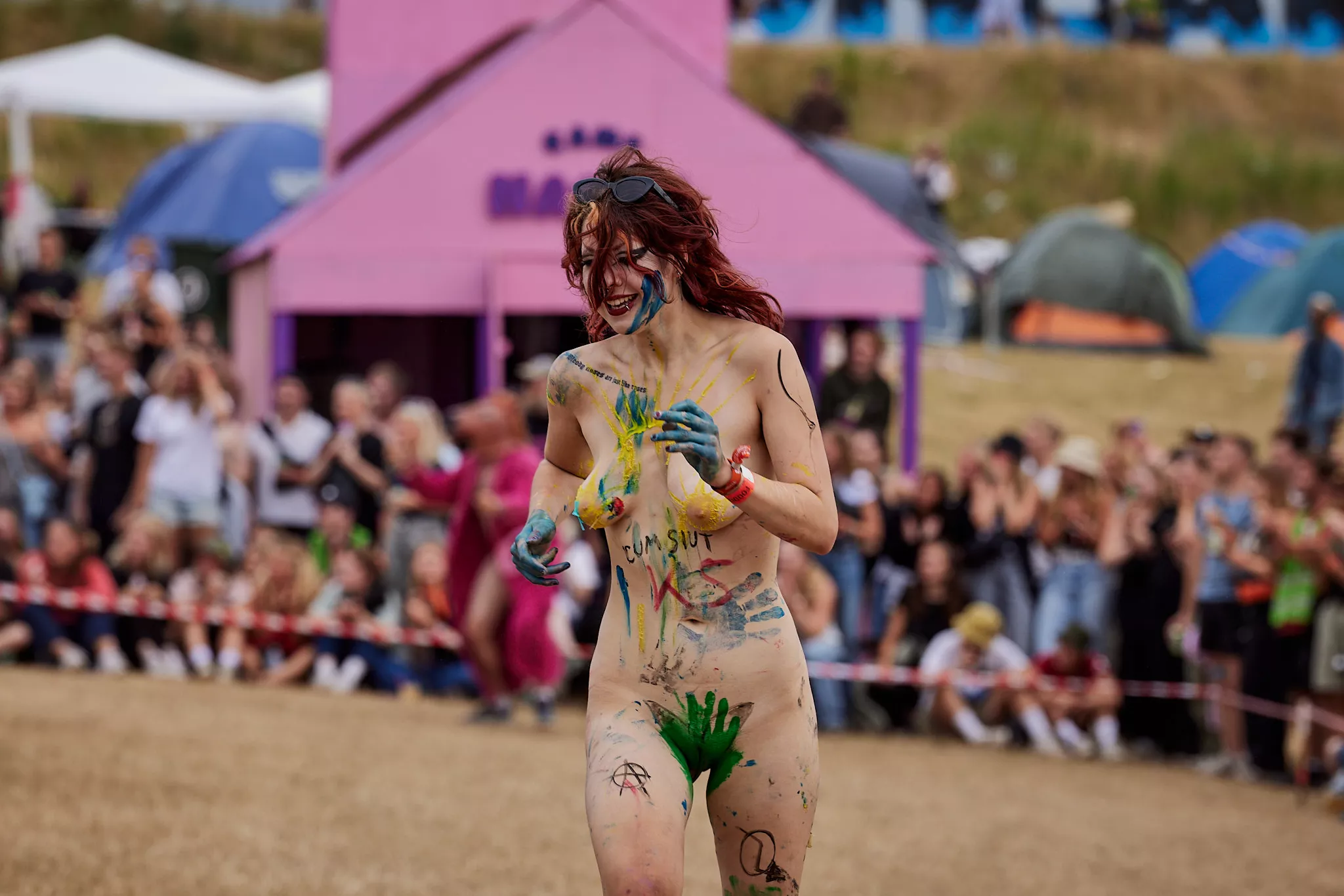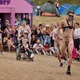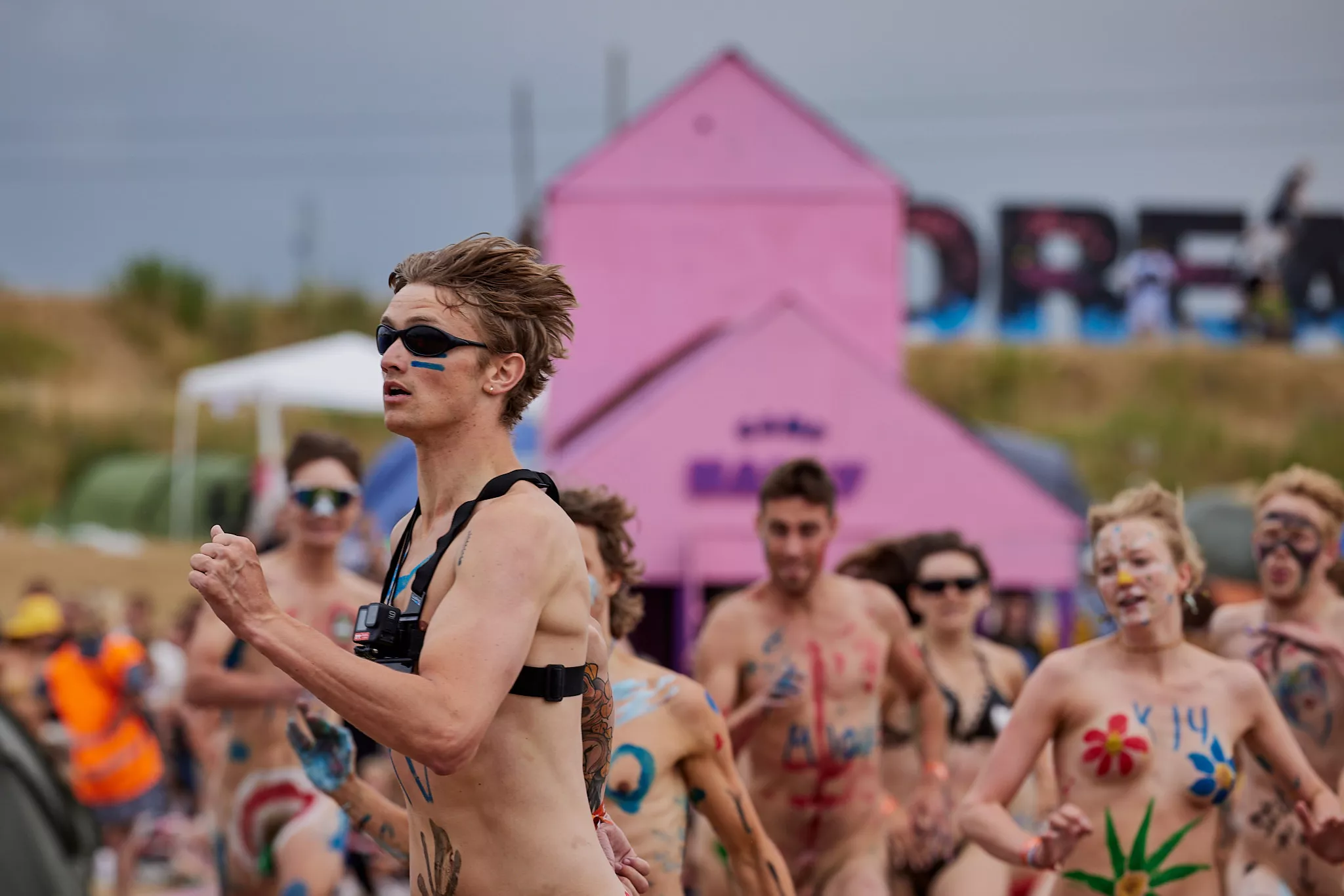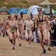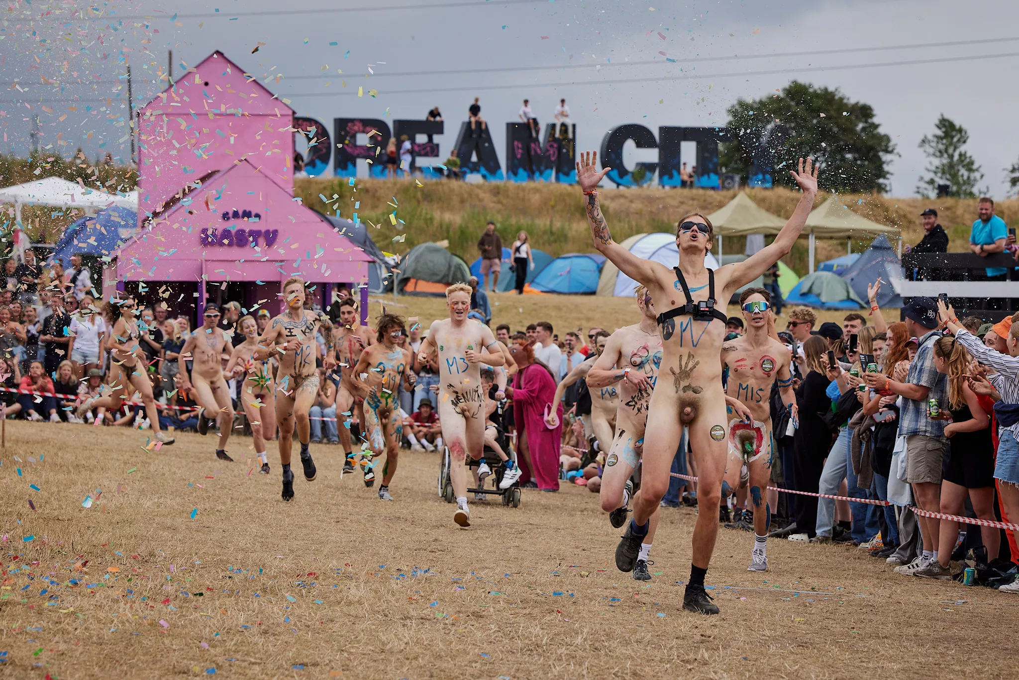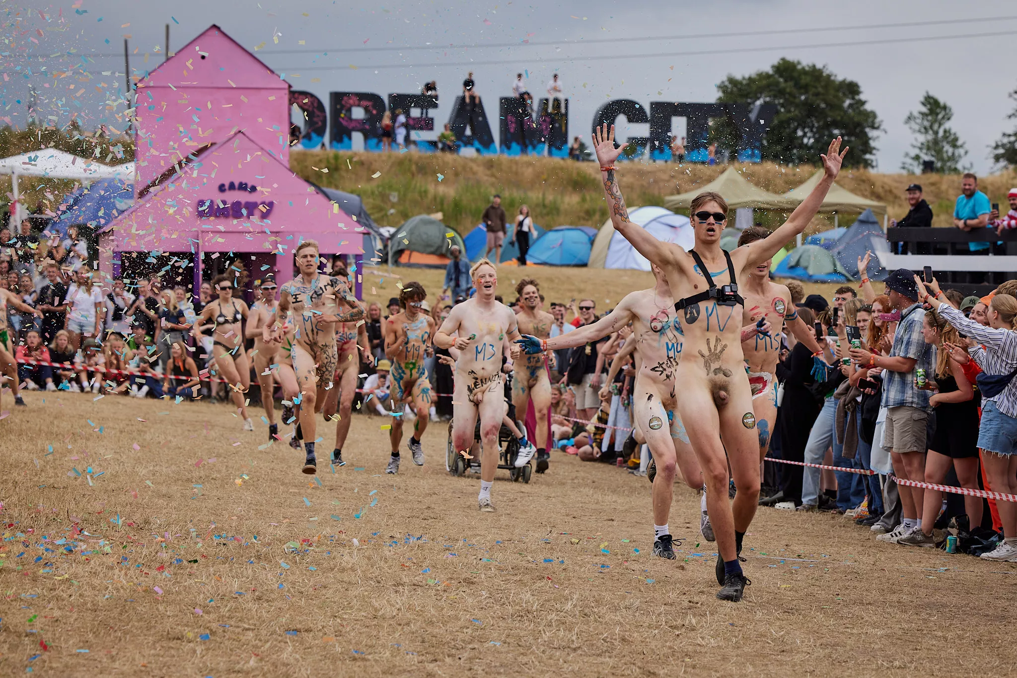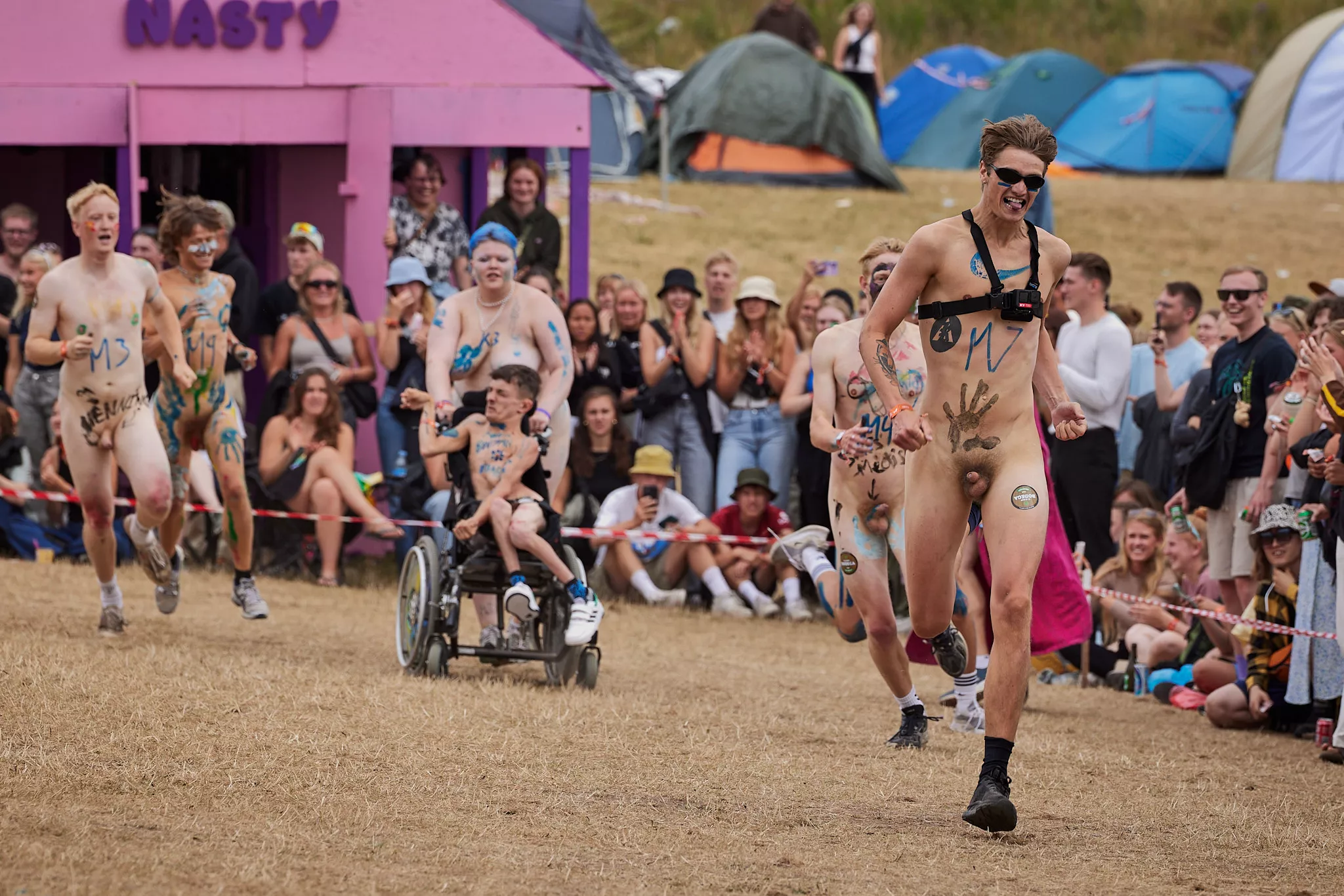 Af uvisse årsager begynder løbet et kvarter før annonceret koncertstart 14.00. Der hujes, mens de nøgne kroppe løber omkring, mange iført diskrete mængder bodypaint. ”Some things exit her, some things enter here”, står der eksempelvis på ryggen af en ung mand med en pil ned til anus.