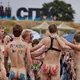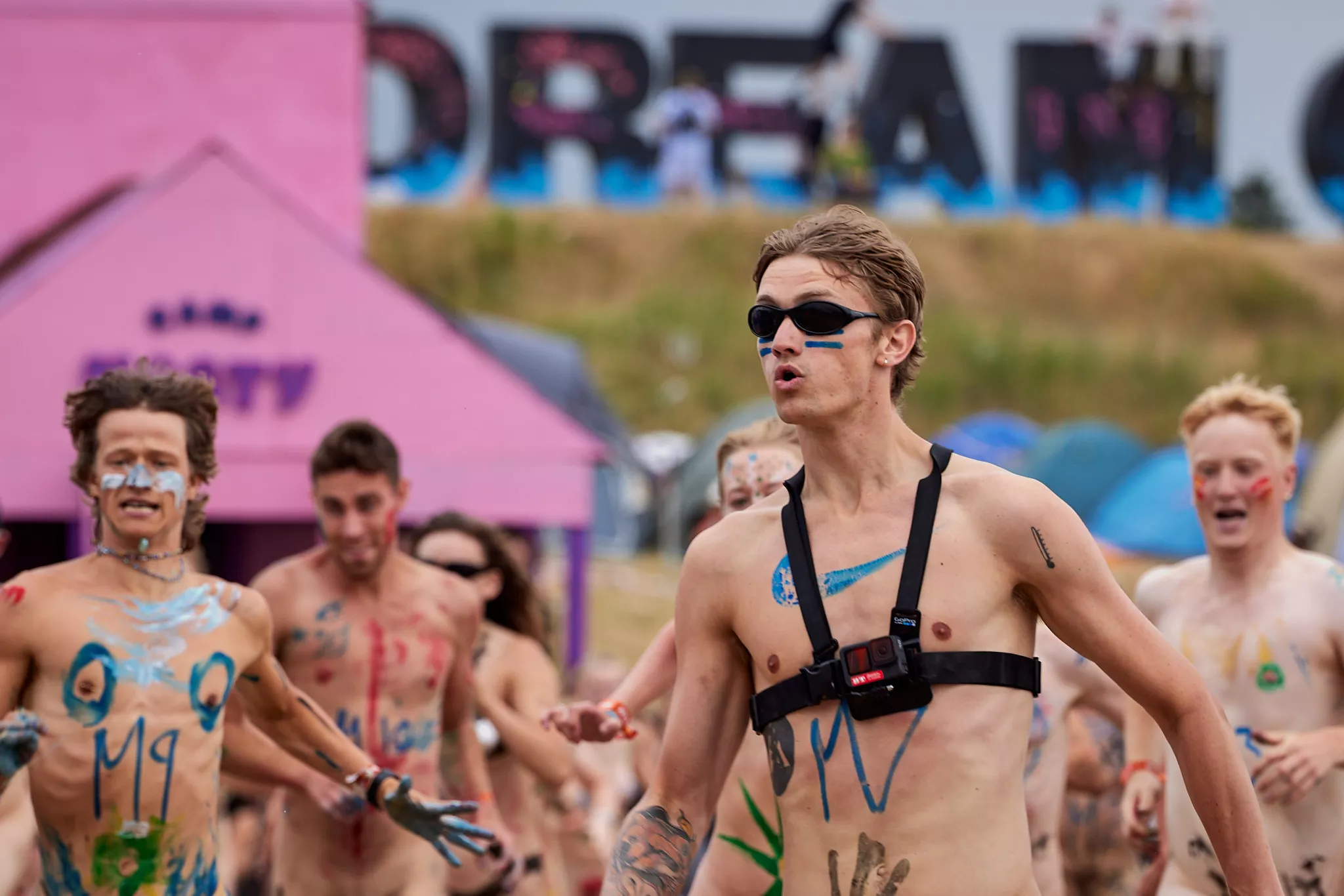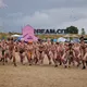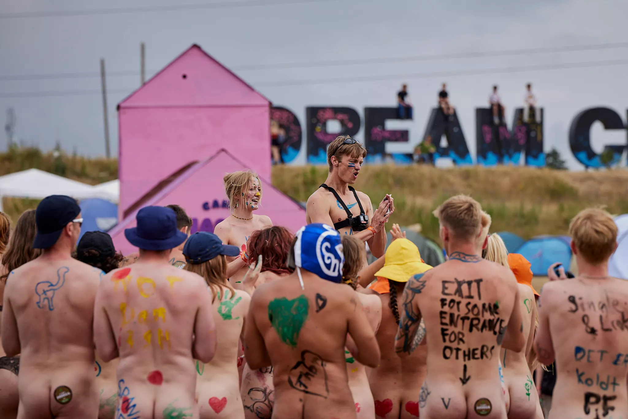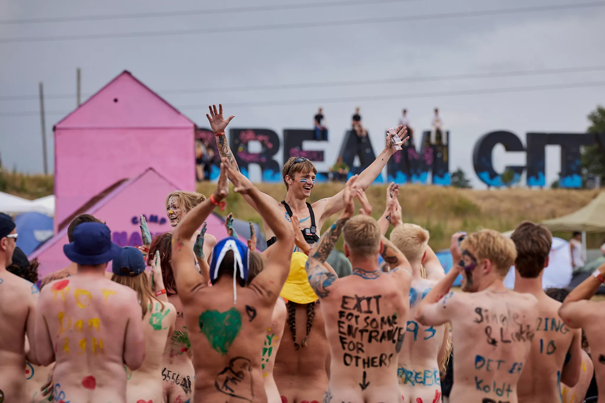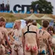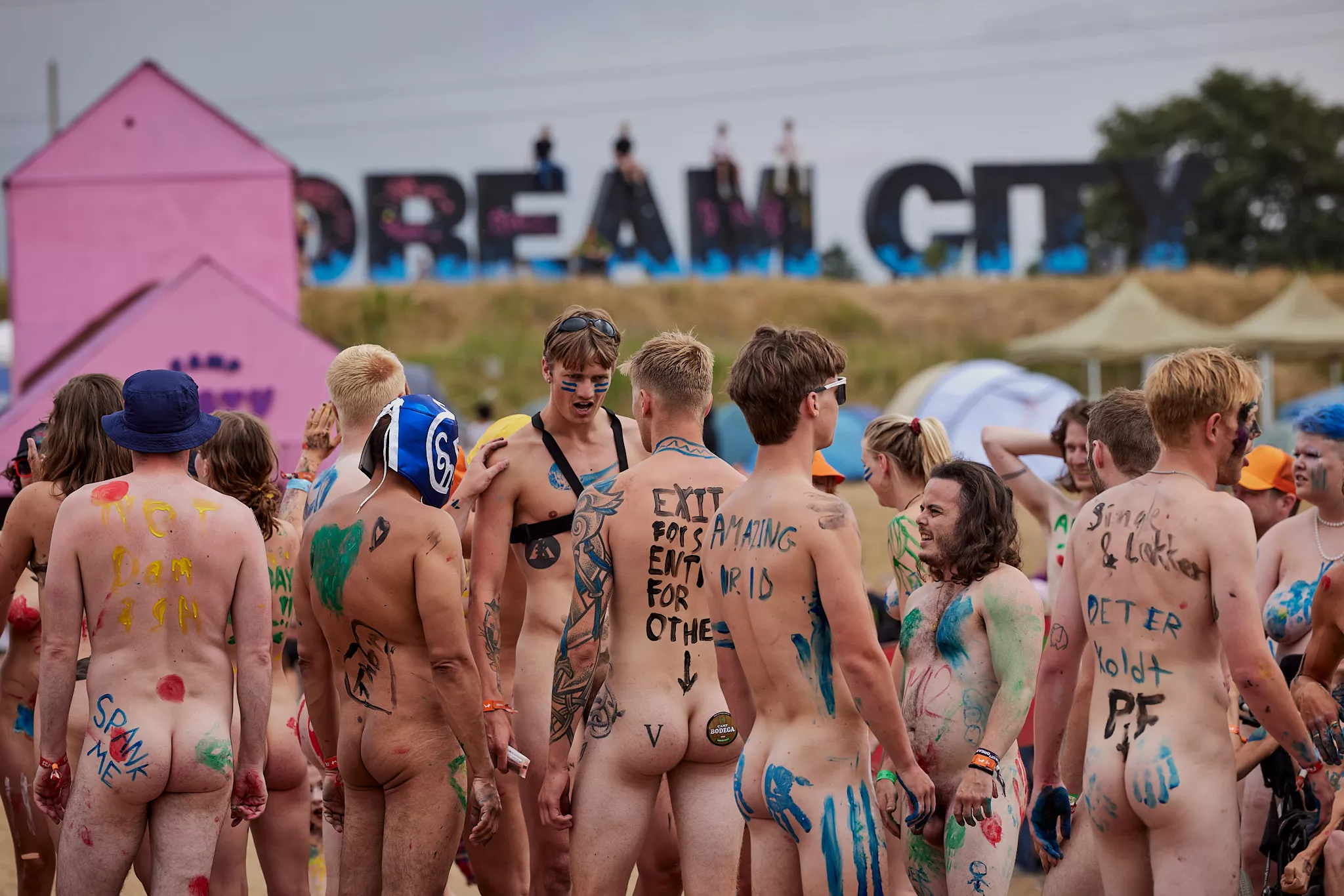Af uvisse årsager begynder løbet et kvarter før annonceret koncertstart 14.00. Der hujes, mens de nøgne kroppe løber omkring, mange iført diskrete mængder bodypaint. ”Some things exit her, some things enter here”, står der eksempelvis på ryggen af en ung mand med en pil ned til anus.