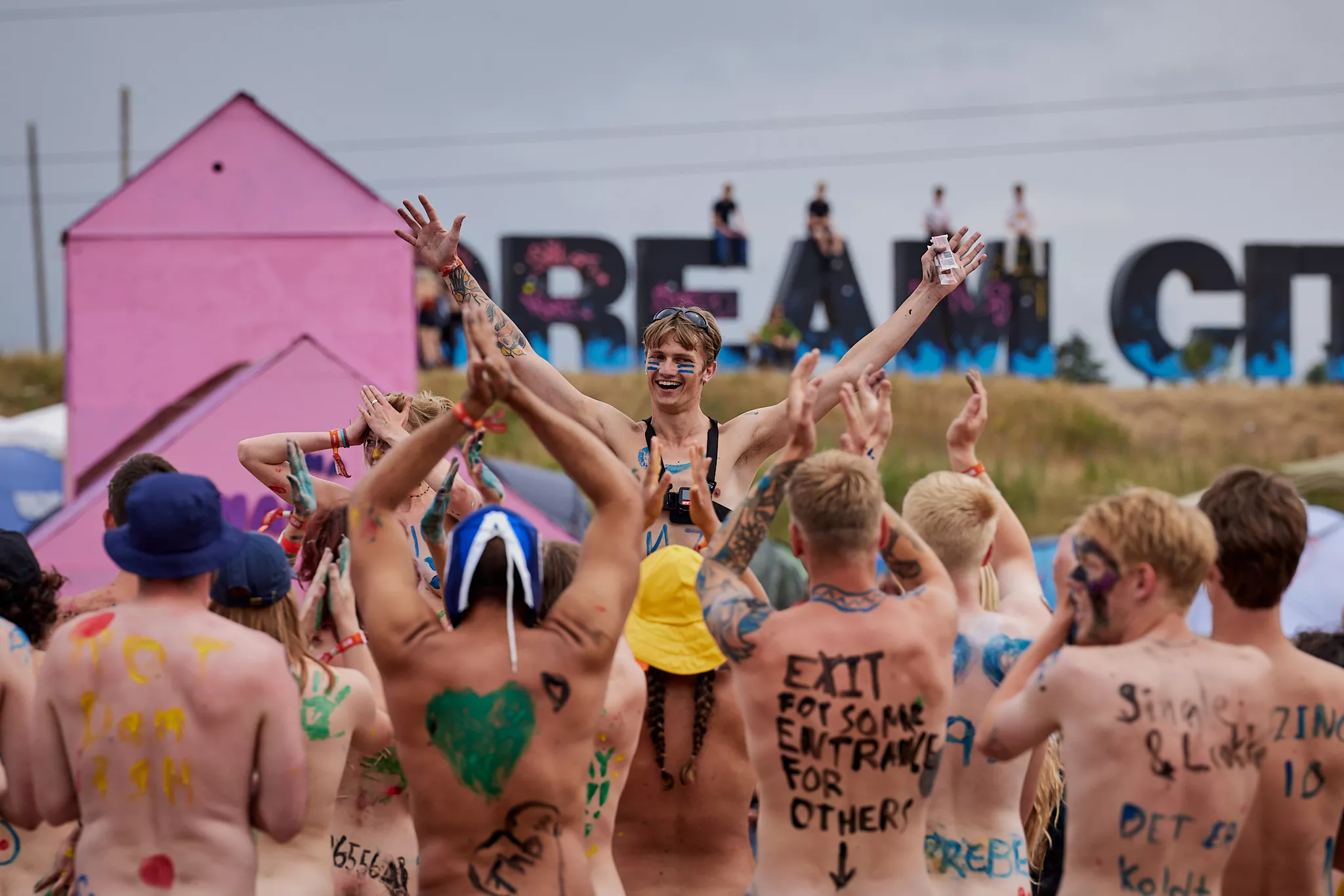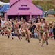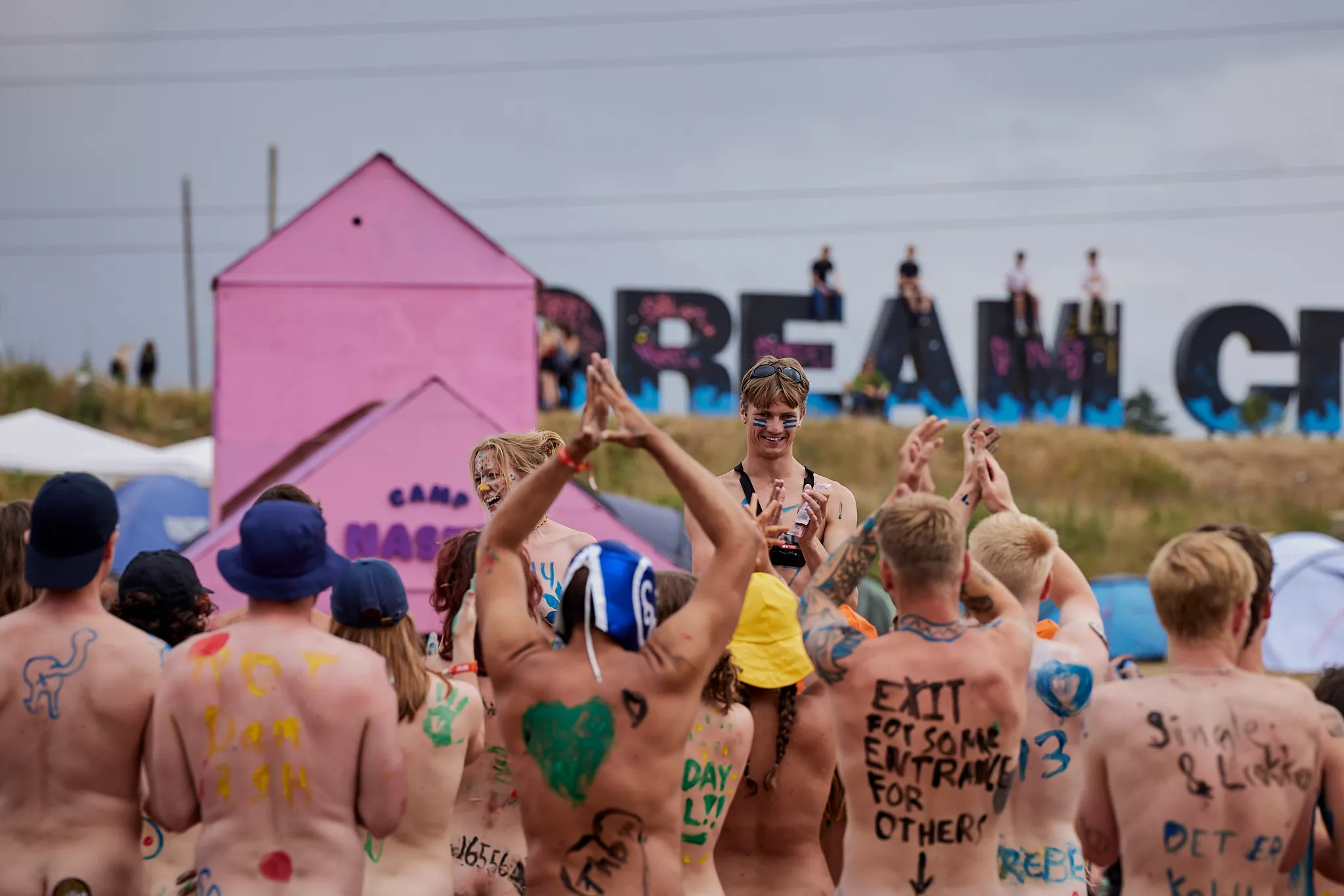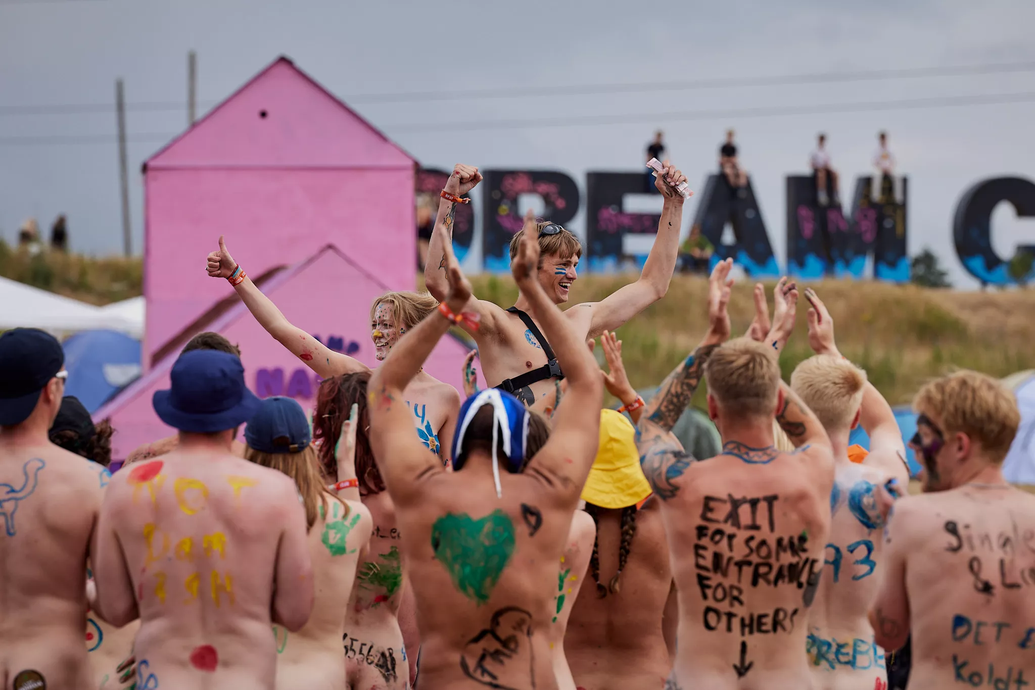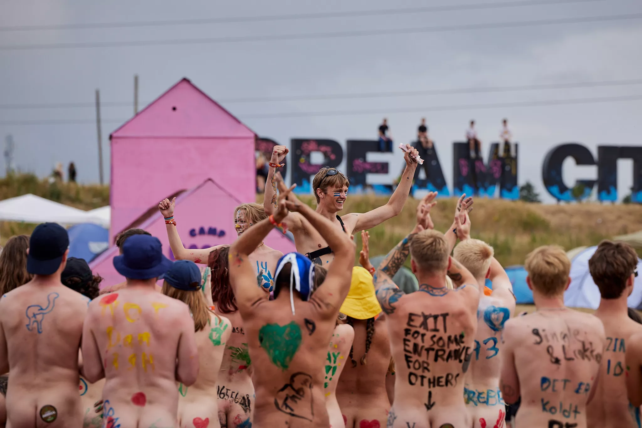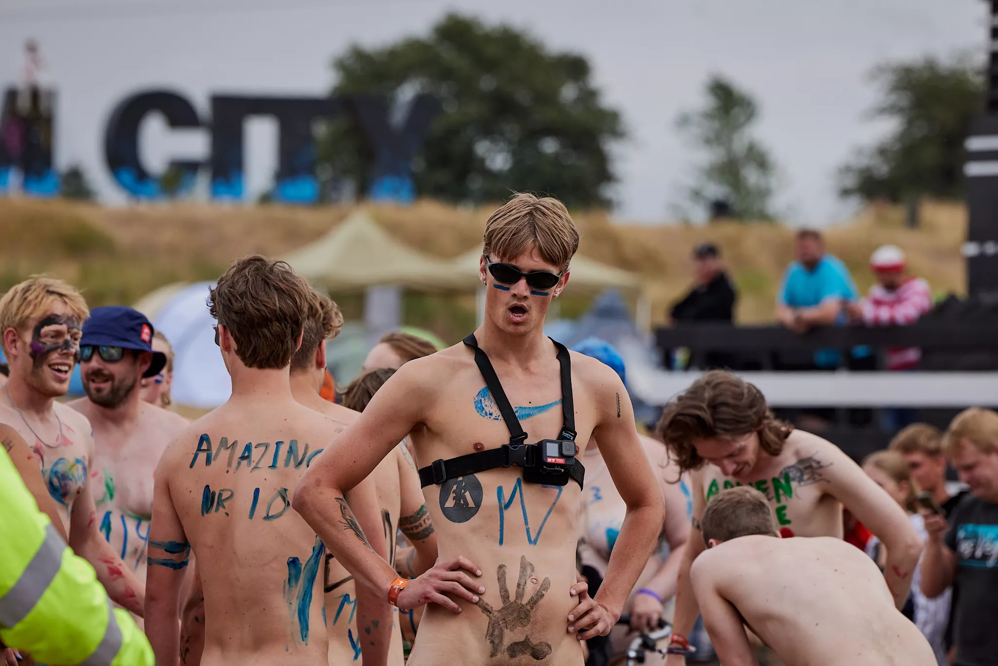 Af uvisse årsager begynder løbet et kvarter før annonceret koncertstart 14.00. Der hujes, mens de nøgne kroppe løber omkring, mange iført diskrete mængder bodypaint. ”Some things exit her, some things enter here”, står der eksempelvis på ryggen af en ung mand med en pil ned til anus.