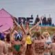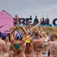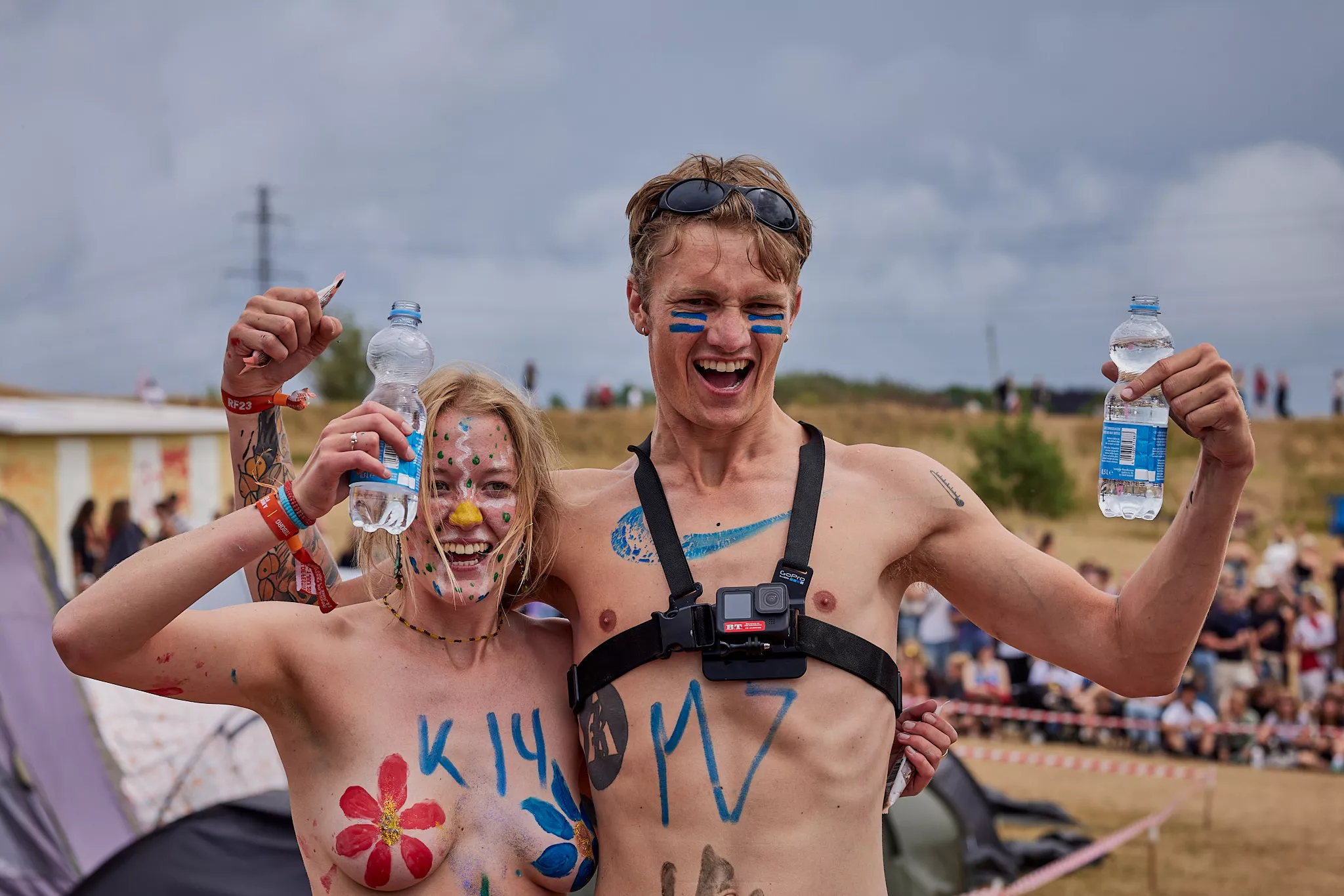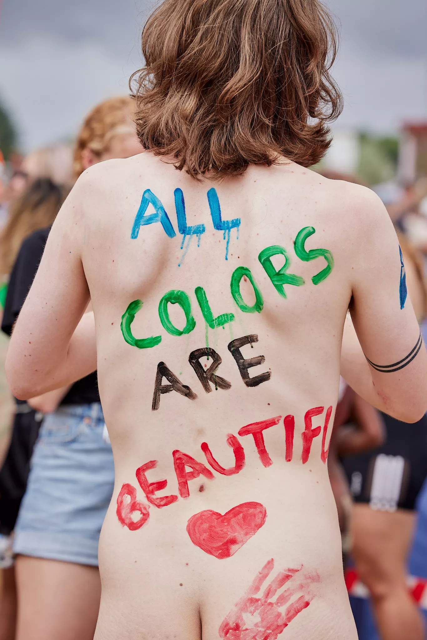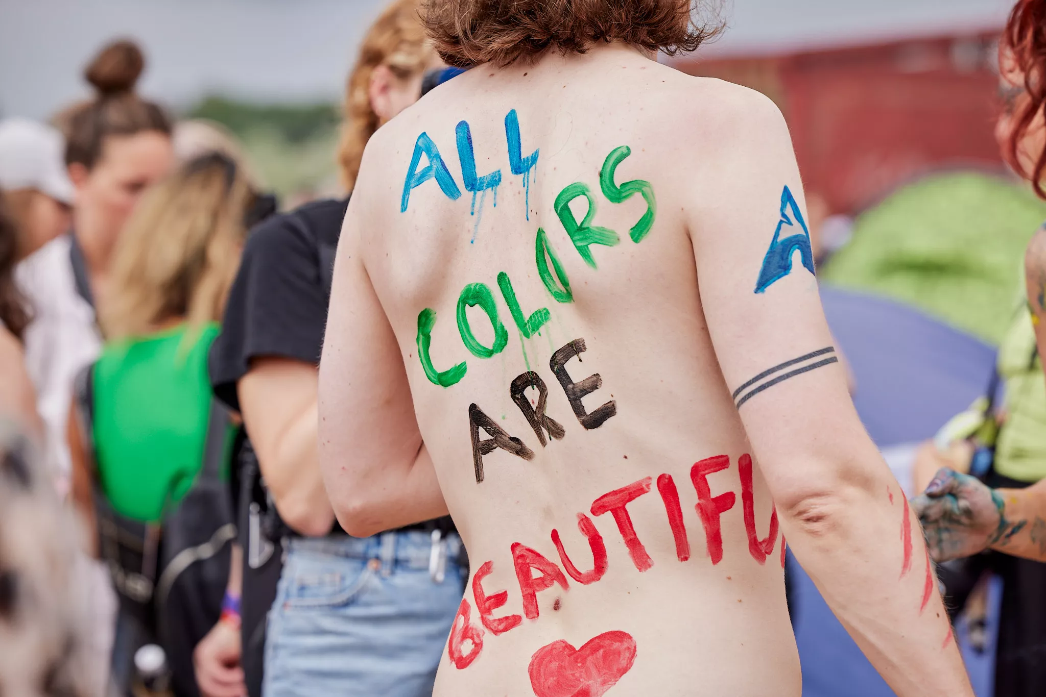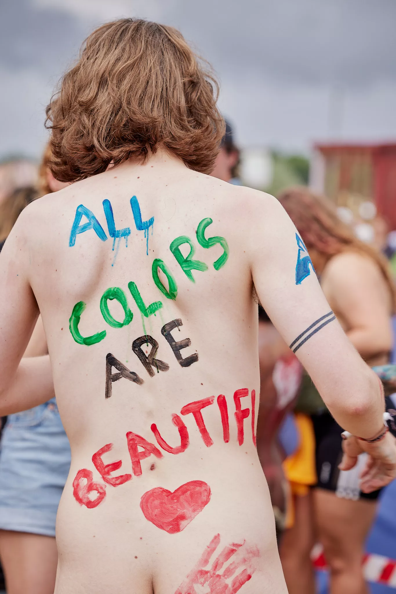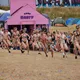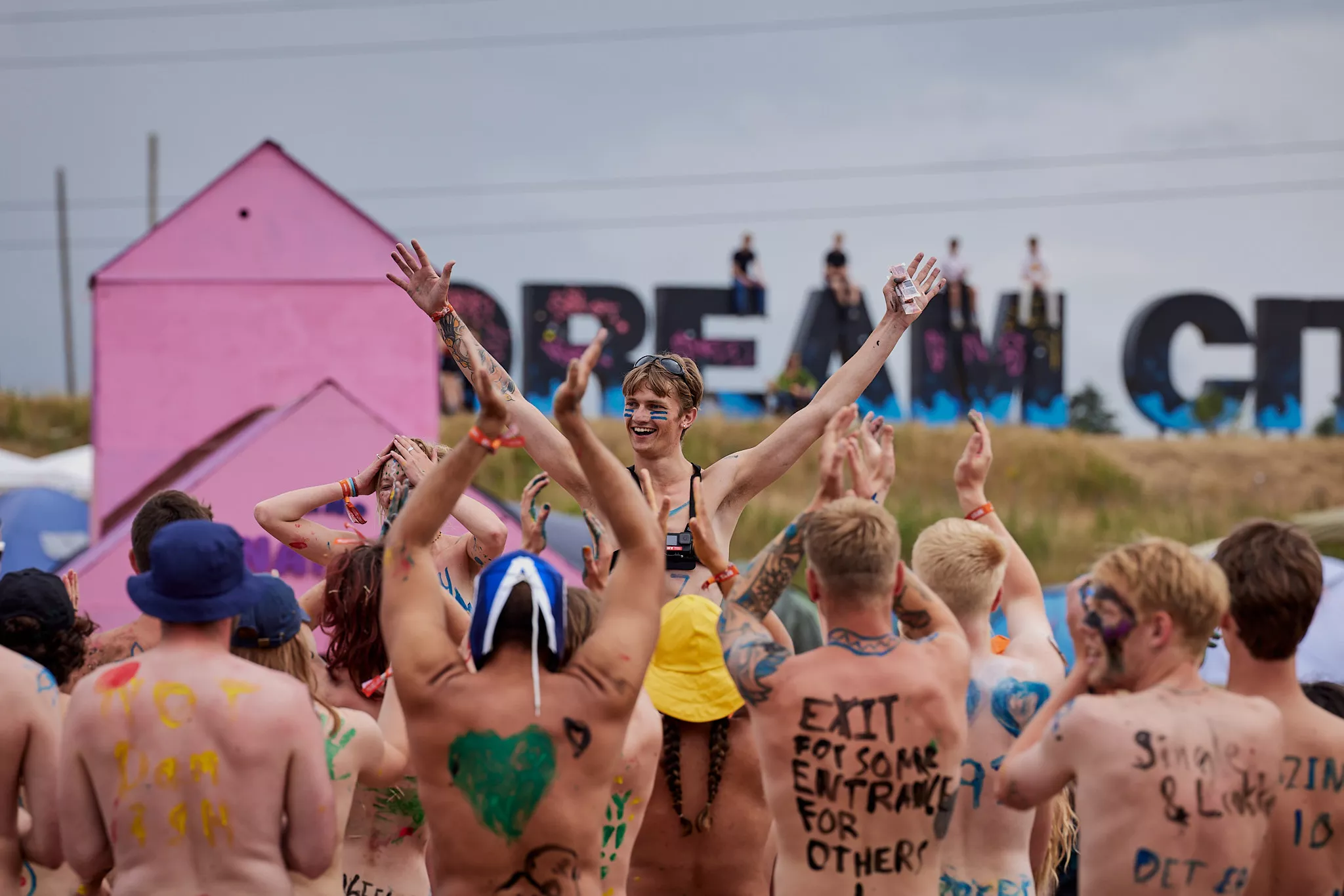 Af uvisse årsager begynder løbet et kvarter før annonceret koncertstart 14.00. Der hujes, mens de nøgne kroppe løber omkring, mange iført diskrete mængder bodypaint. ”Some things exit her, some things enter here”, står der eksempelvis på ryggen af en ung mand med en pil ned til anus.