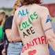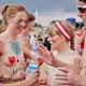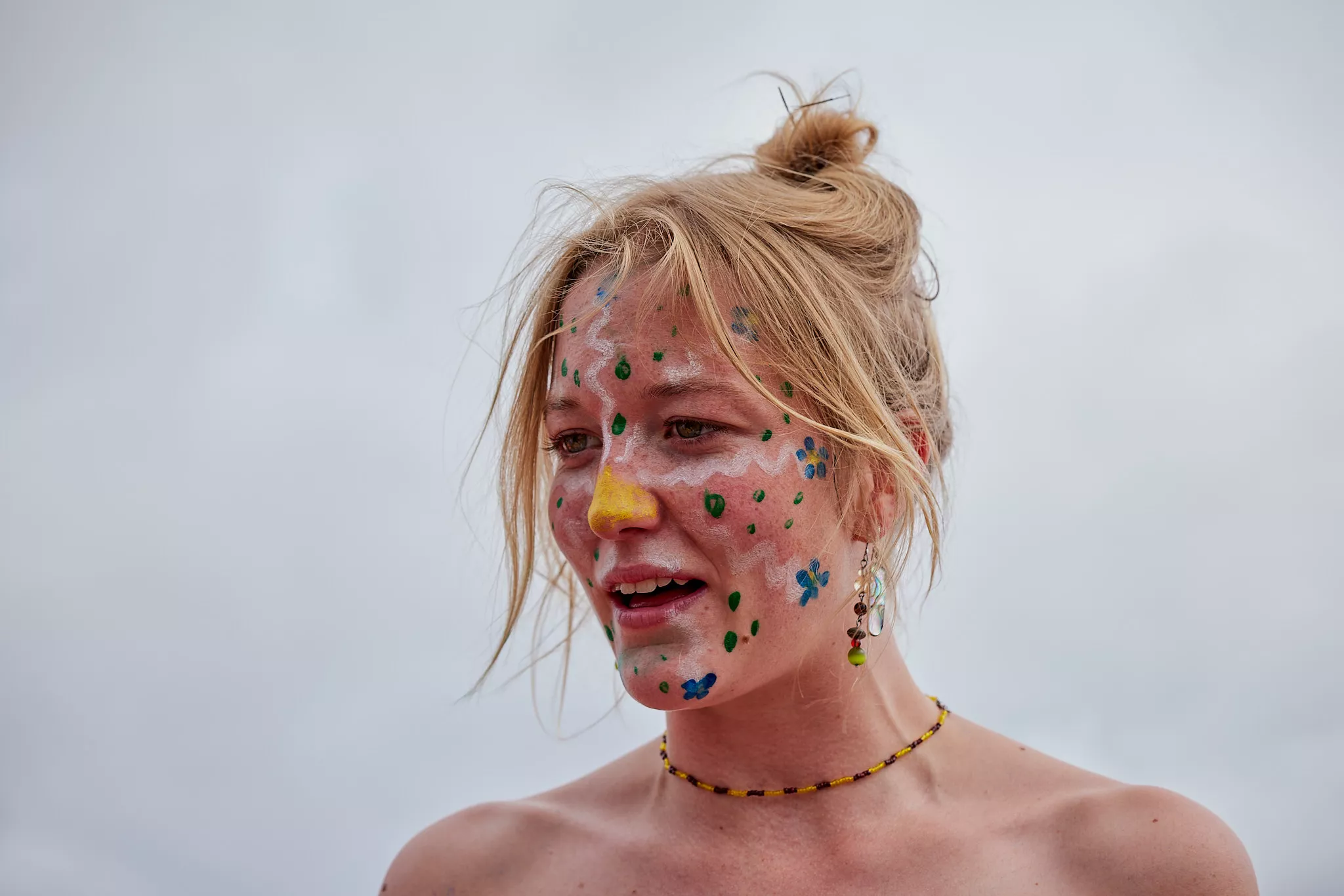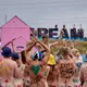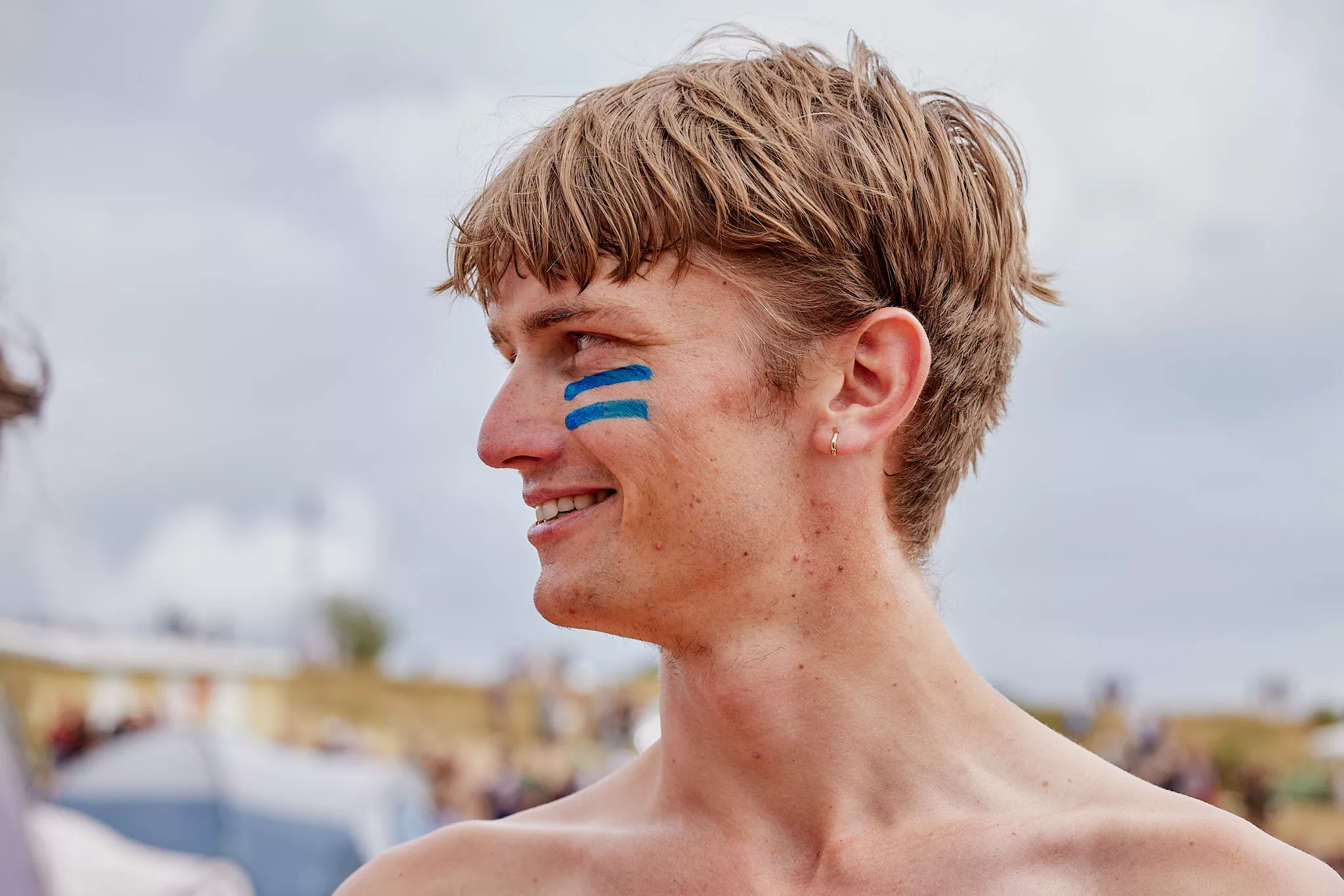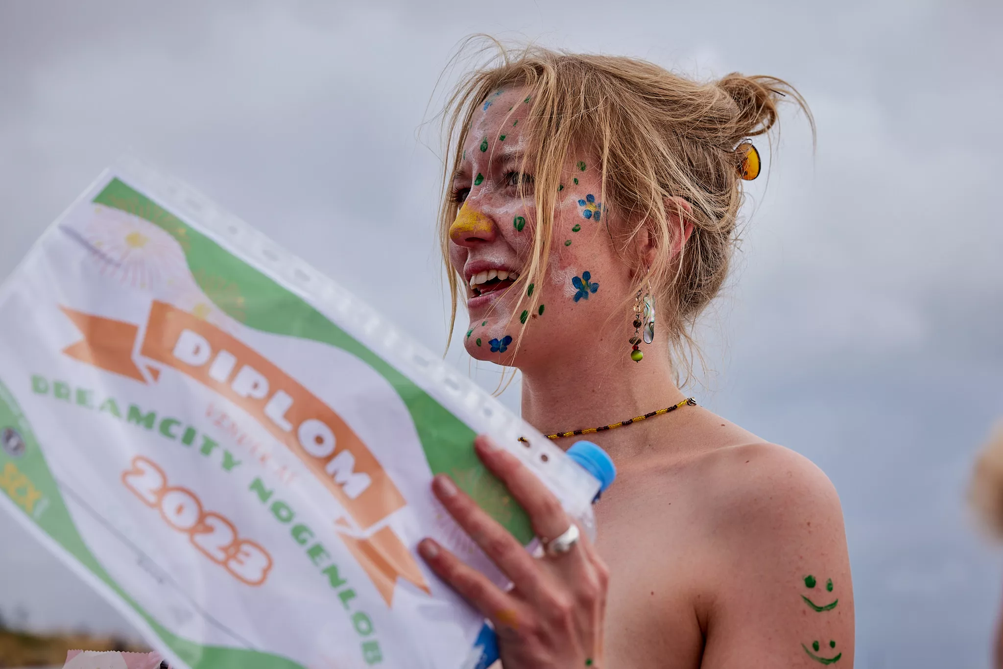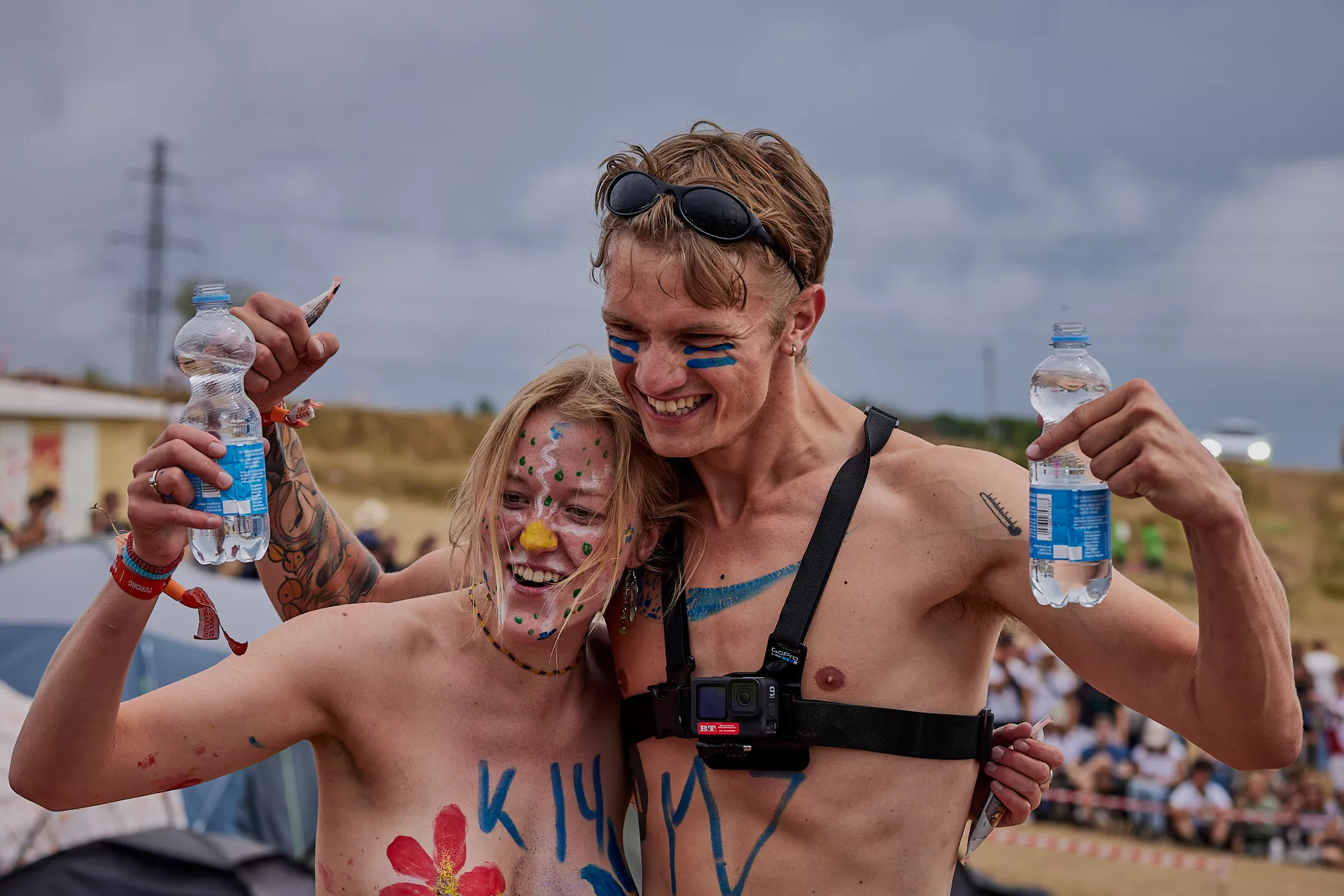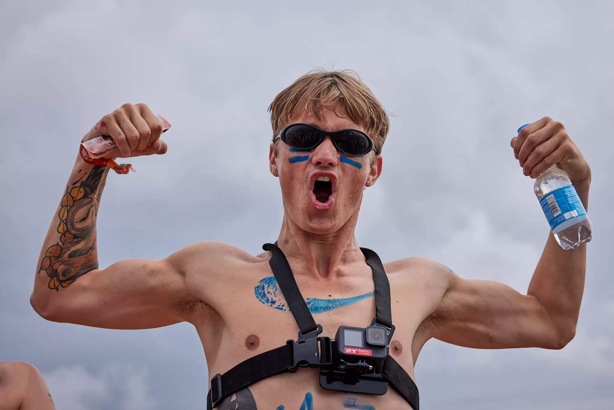 Af uvisse årsager begynder løbet et kvarter før annonceret koncertstart 14.00. Der hujes, mens de nøgne kroppe løber omkring, mange iført diskrete mængder bodypaint. ”Some things exit her, some things enter here”, står der eksempelvis på ryggen af en ung mand med en pil ned til anus.