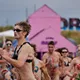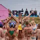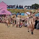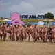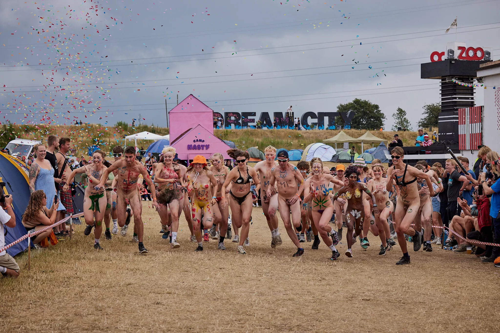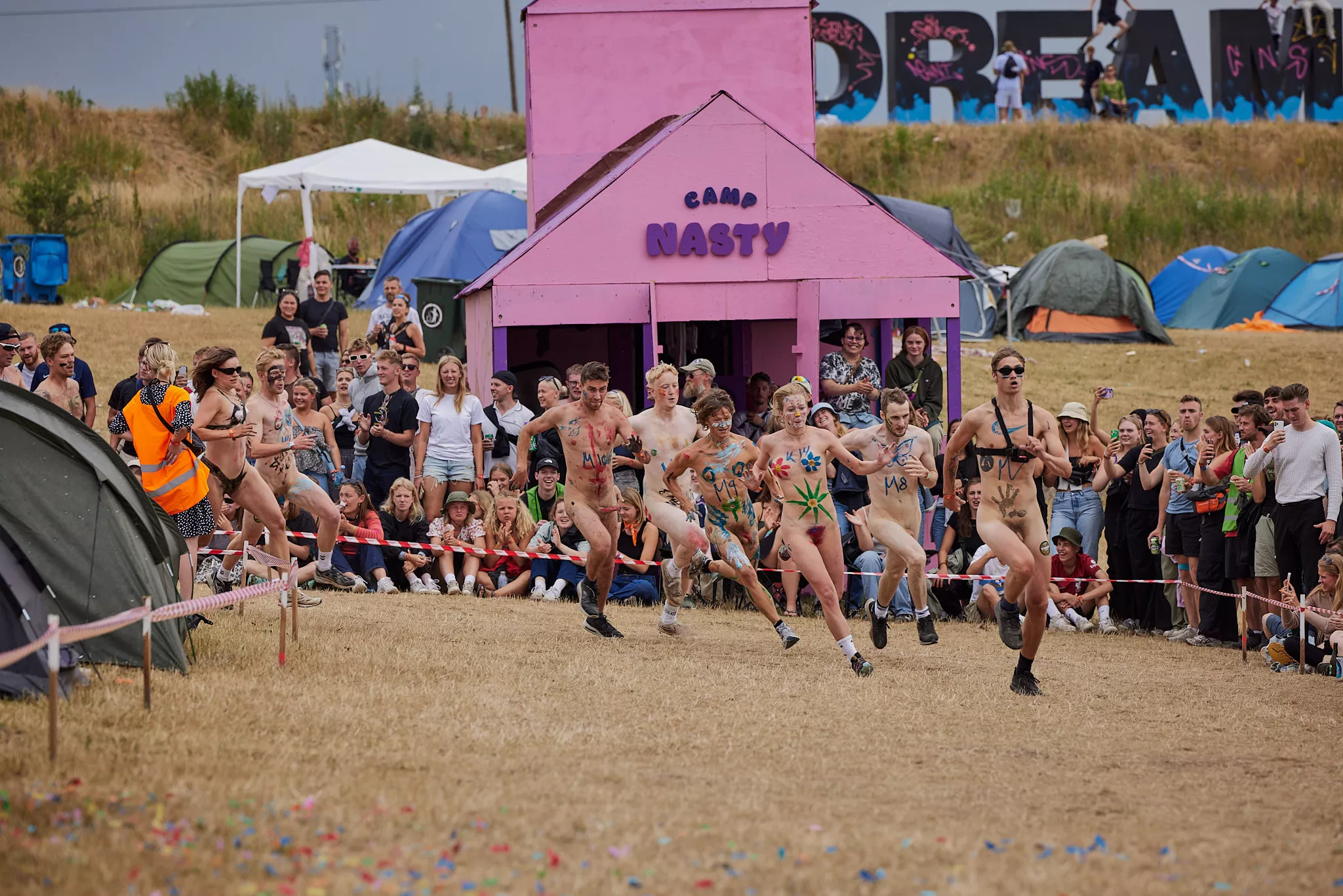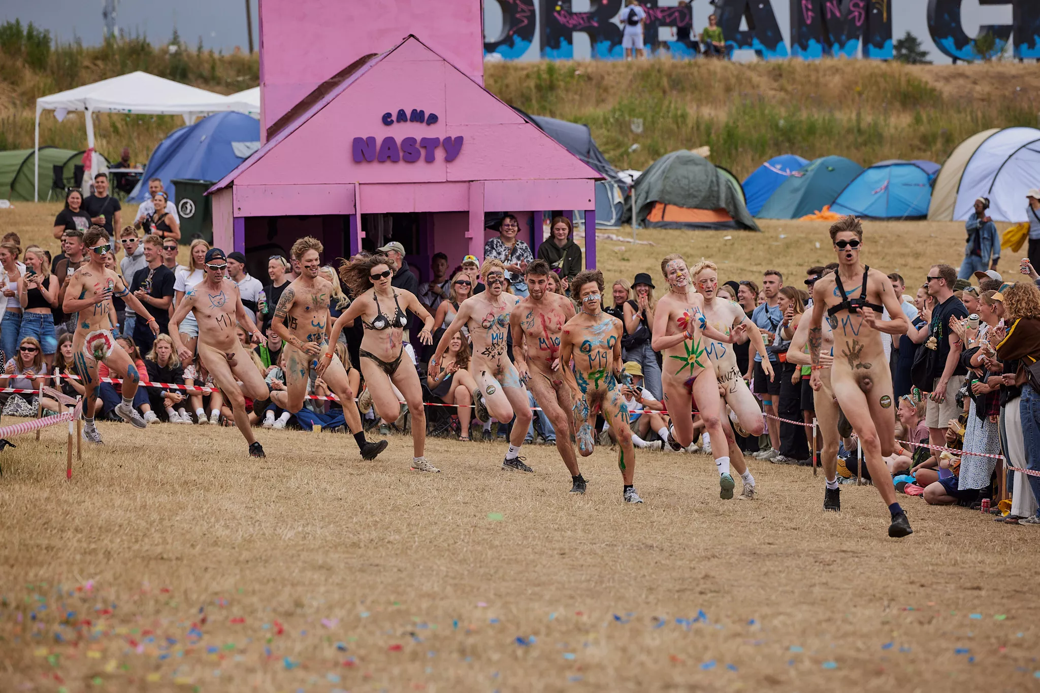 Efter et par år, hvor interessen for Roskilde Festivals traditionsrige nøgenløb har været på retur, med færre deltagere og ditto publikummer, har løbet i år tilsyneladende fået comeback. Flere hundrede tilskuere står klar, og cirka 25 løbere har meldt sig til med en nogenlunde ligelig kønsfordeling, og i øvrigt også en kørestolsbruger med hjælper. Der skal løbes to gange rundt på den cirka 100 meter lange bane placeret rundt om nogle telte i festivalens brugerstyrede område Dream City.