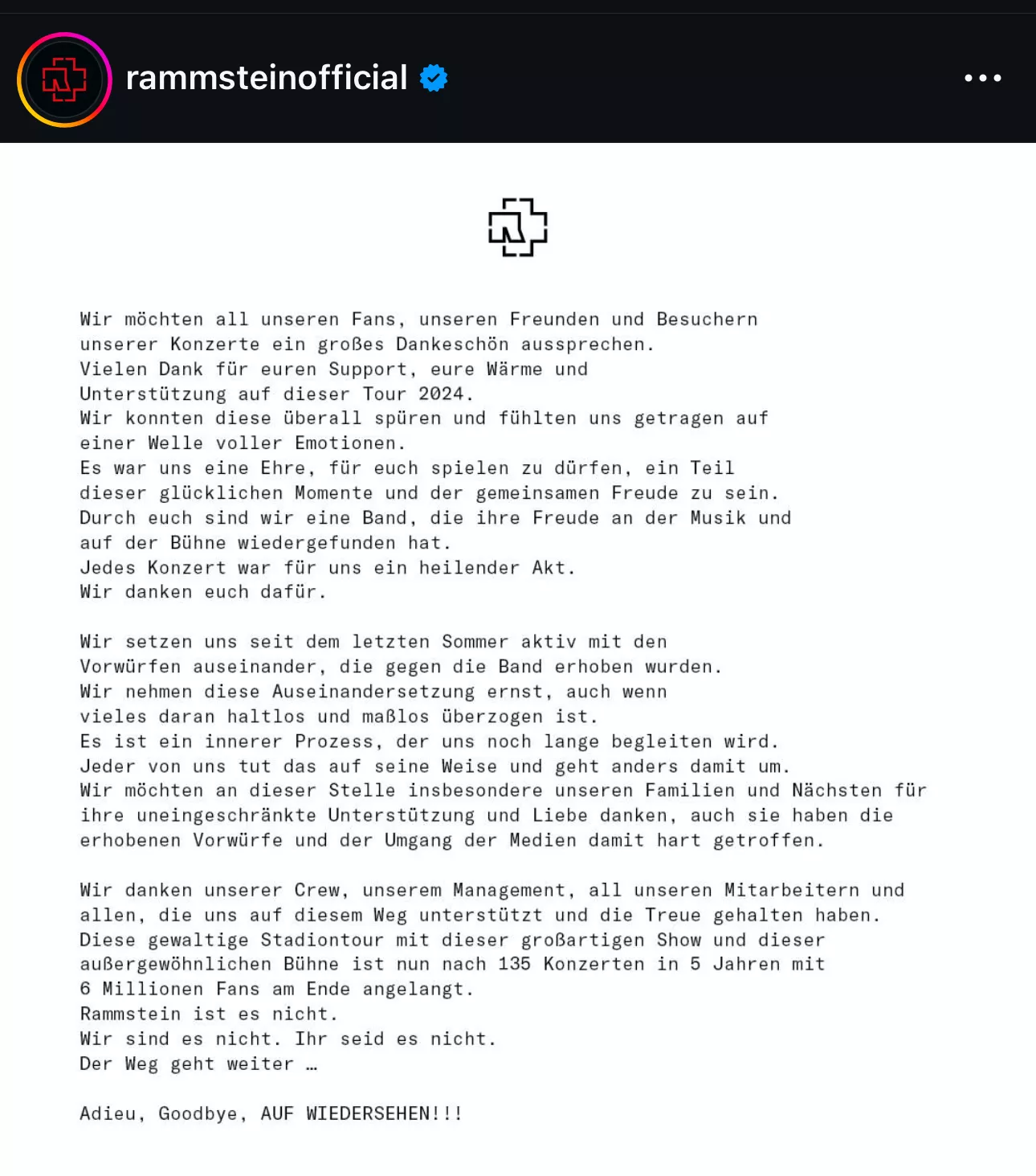 Bandet skriver nedenstående på sin egen hjemmeside og de sociale medier efter fem års turné med 135 koncerter og samlet 6.000.000 fans (oversat fra tysk, originalteksten følger nederst):